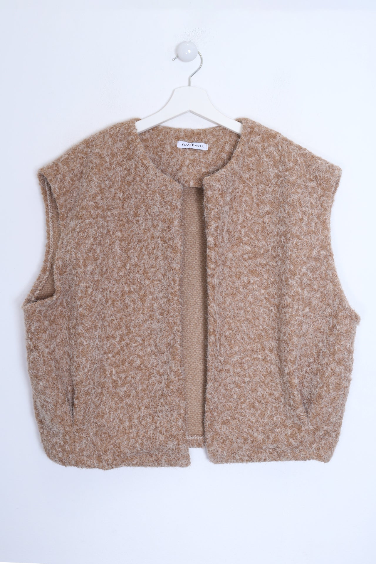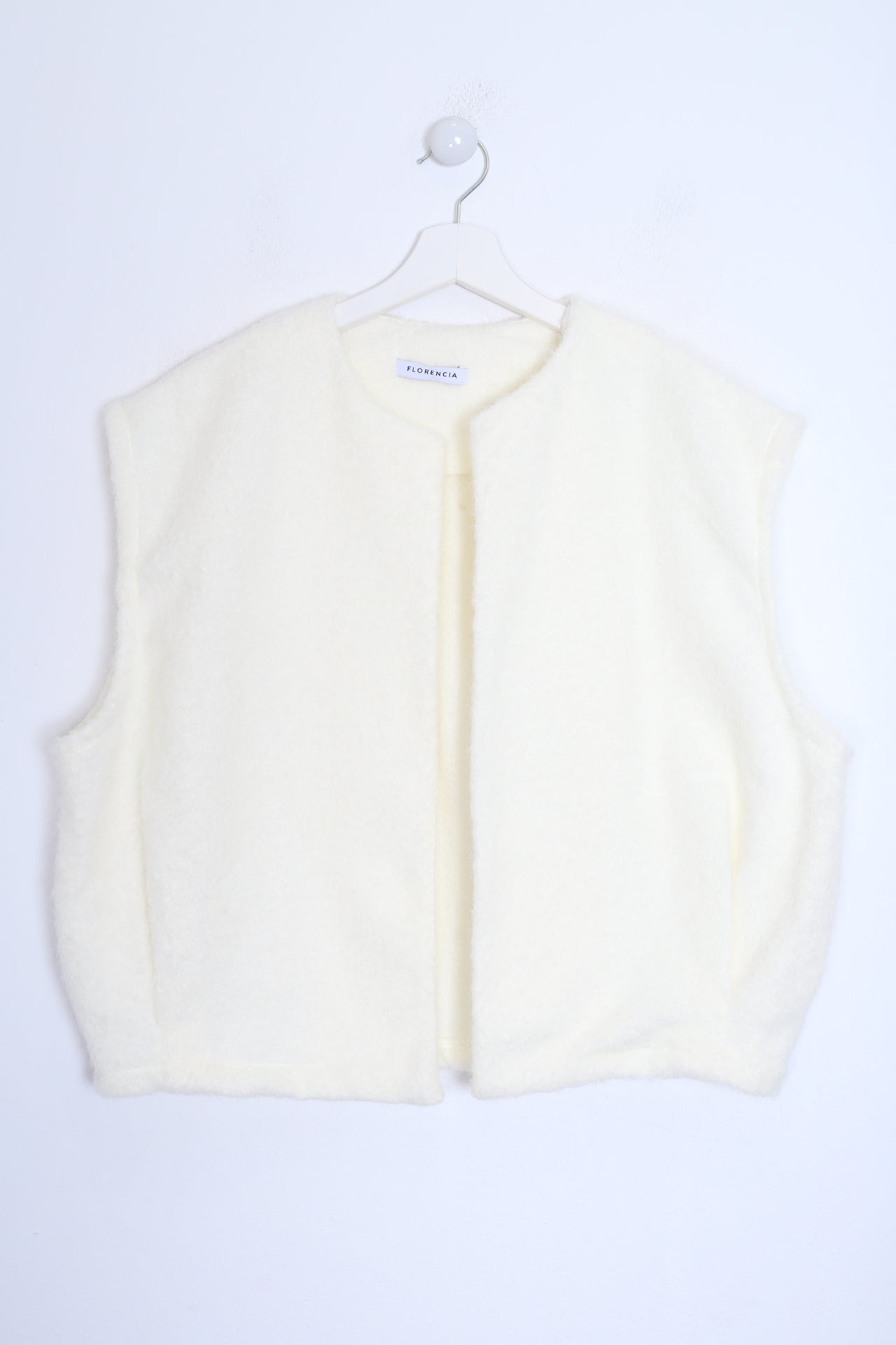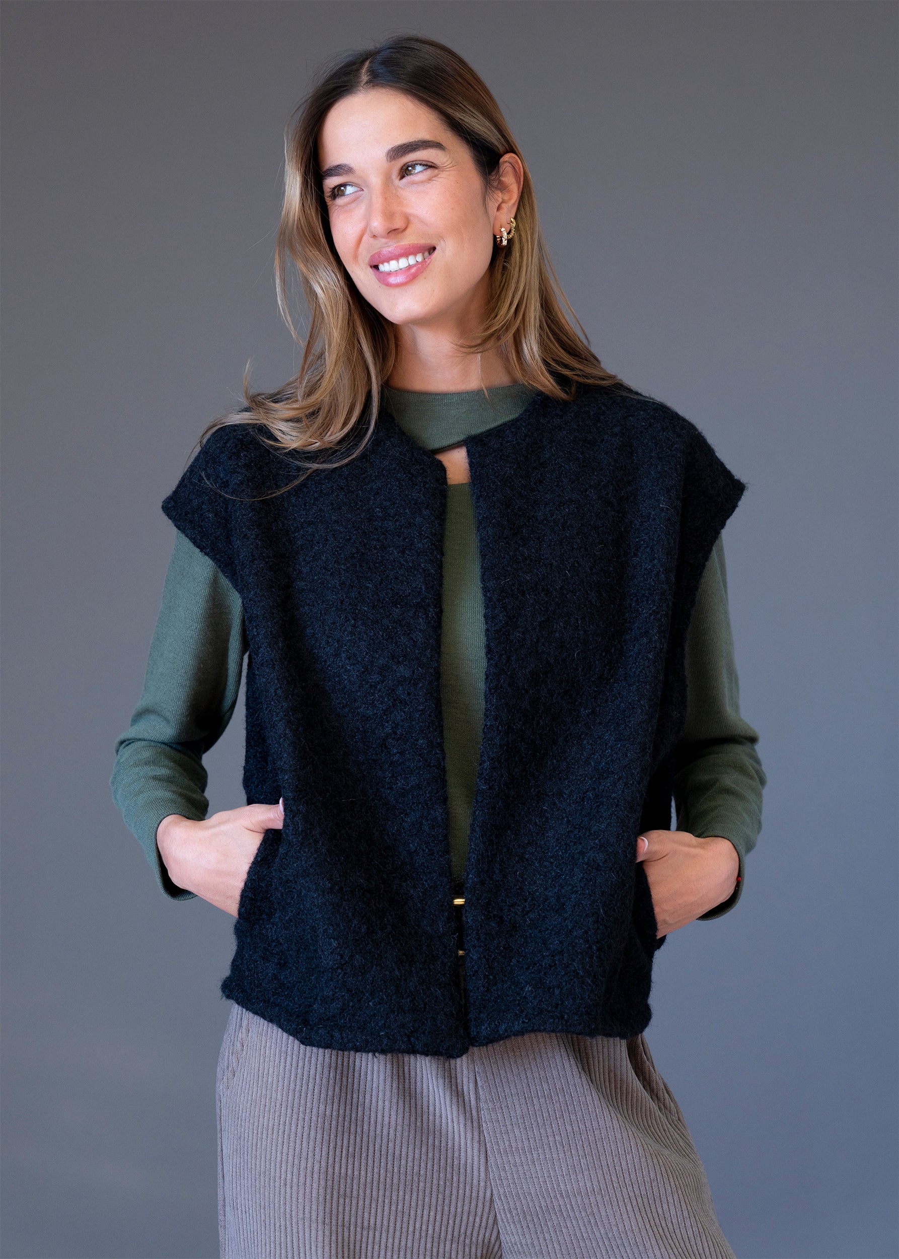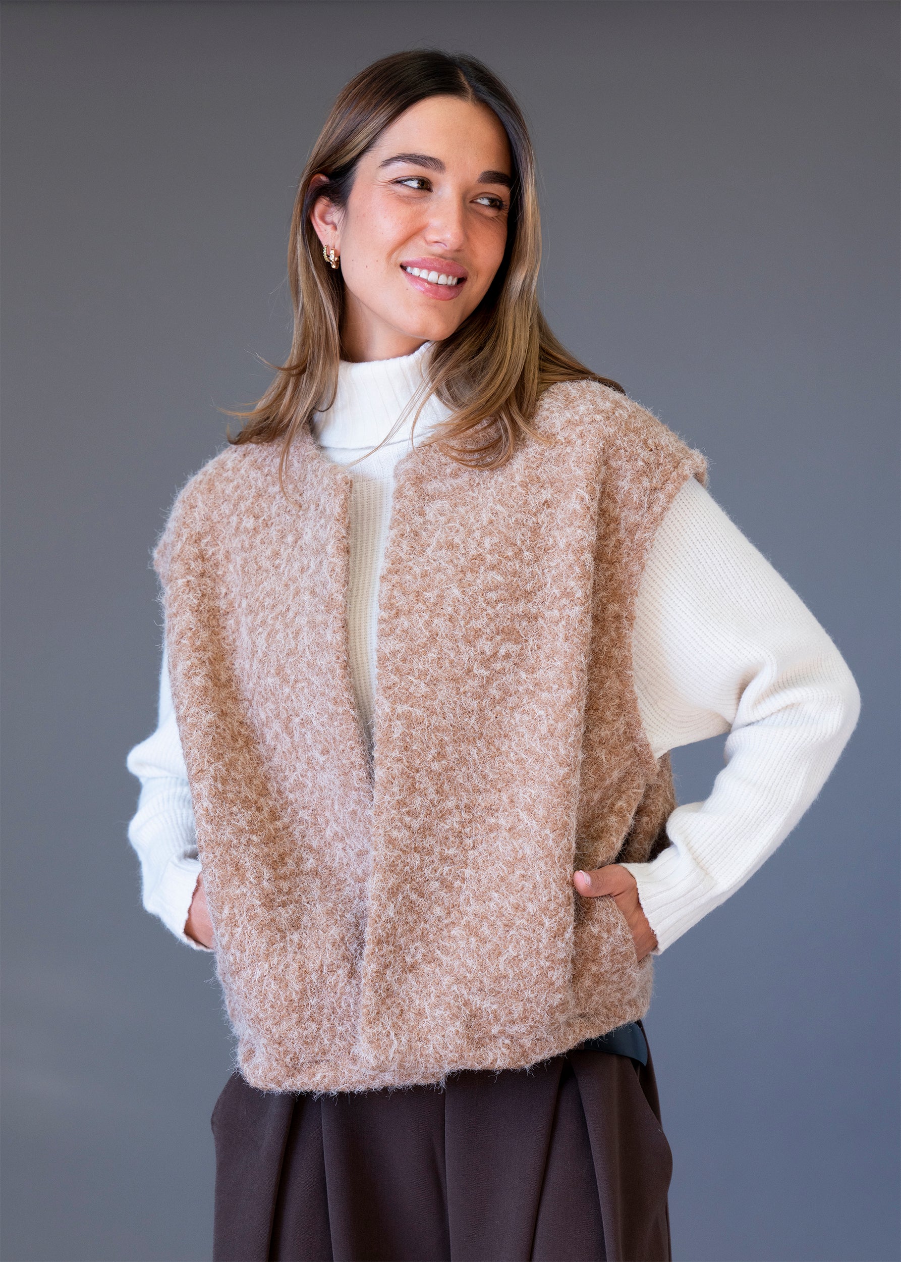 Chaleco de cuello redondo y corte amplio. Detalle de pliegues en laterales. Bolsillos laterales.