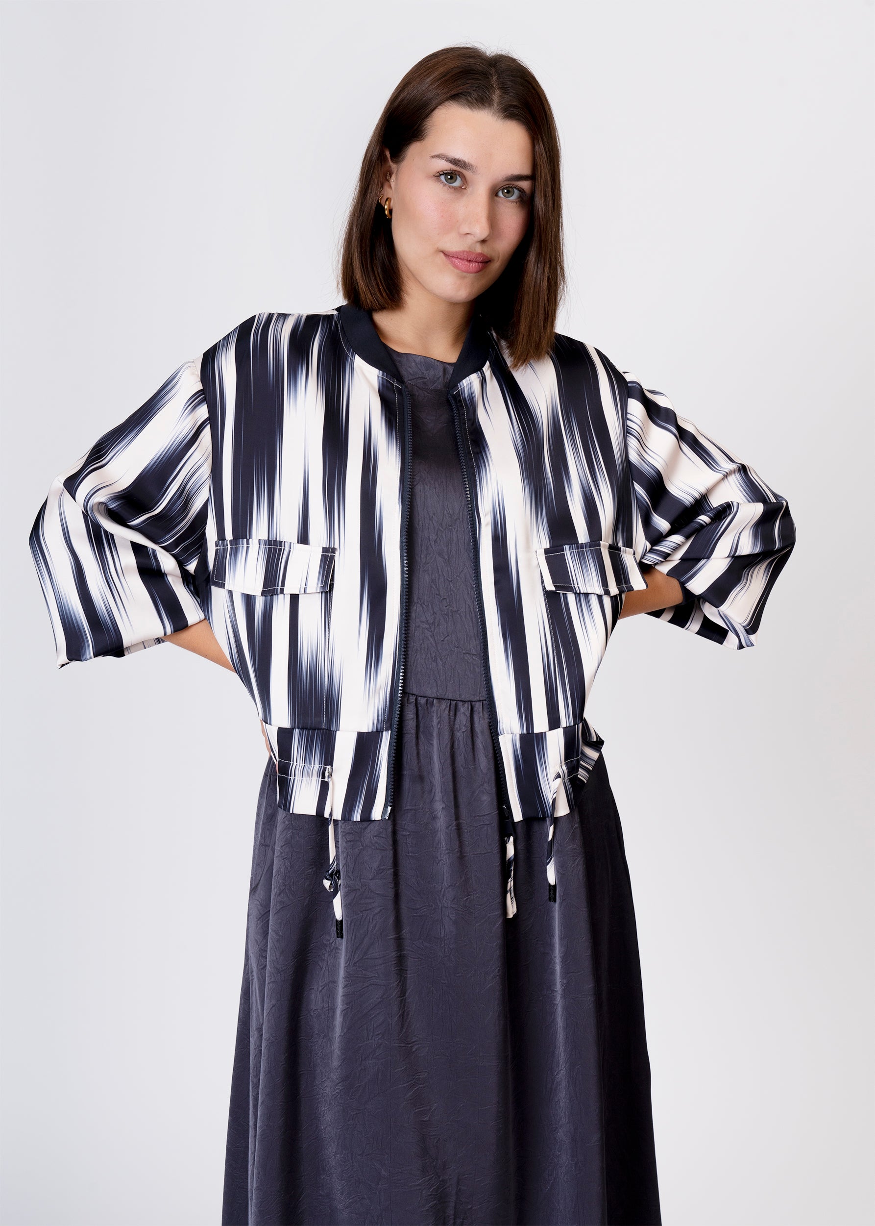 Chaqueta tipo bomber con escote redondo y manga larga acabada en elástico. Cierre frontal con cremallera y bajo elástico con cordón ajustable a tono. Bolsillos frontales de plastrón con solapa. Estampado de pinceladas.