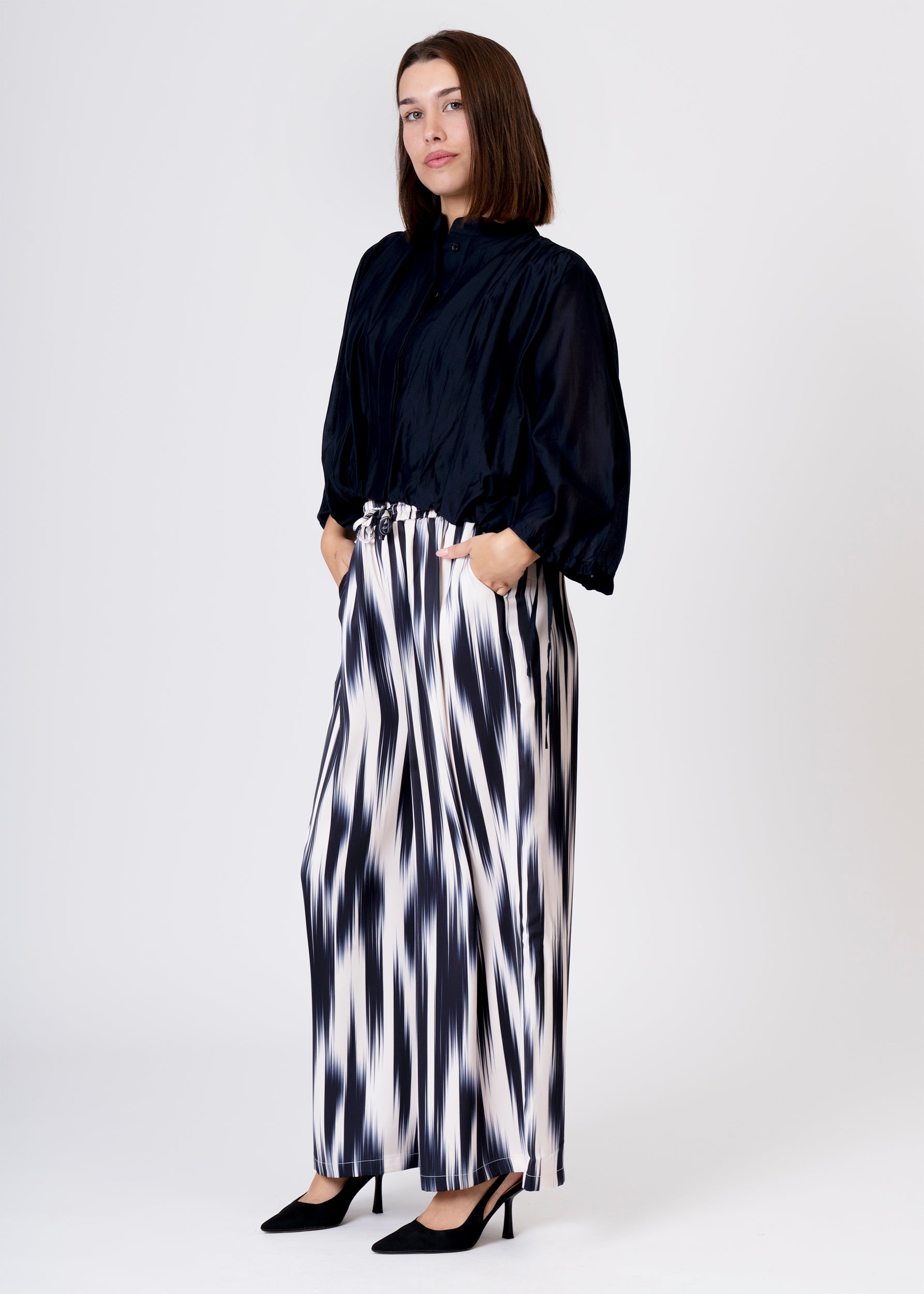 Blusa con cuello redondo y manga tres cuartos. Puños acabados en cordón ajustable. Cierre frontal con botones. Bajos con detalle abullonado.