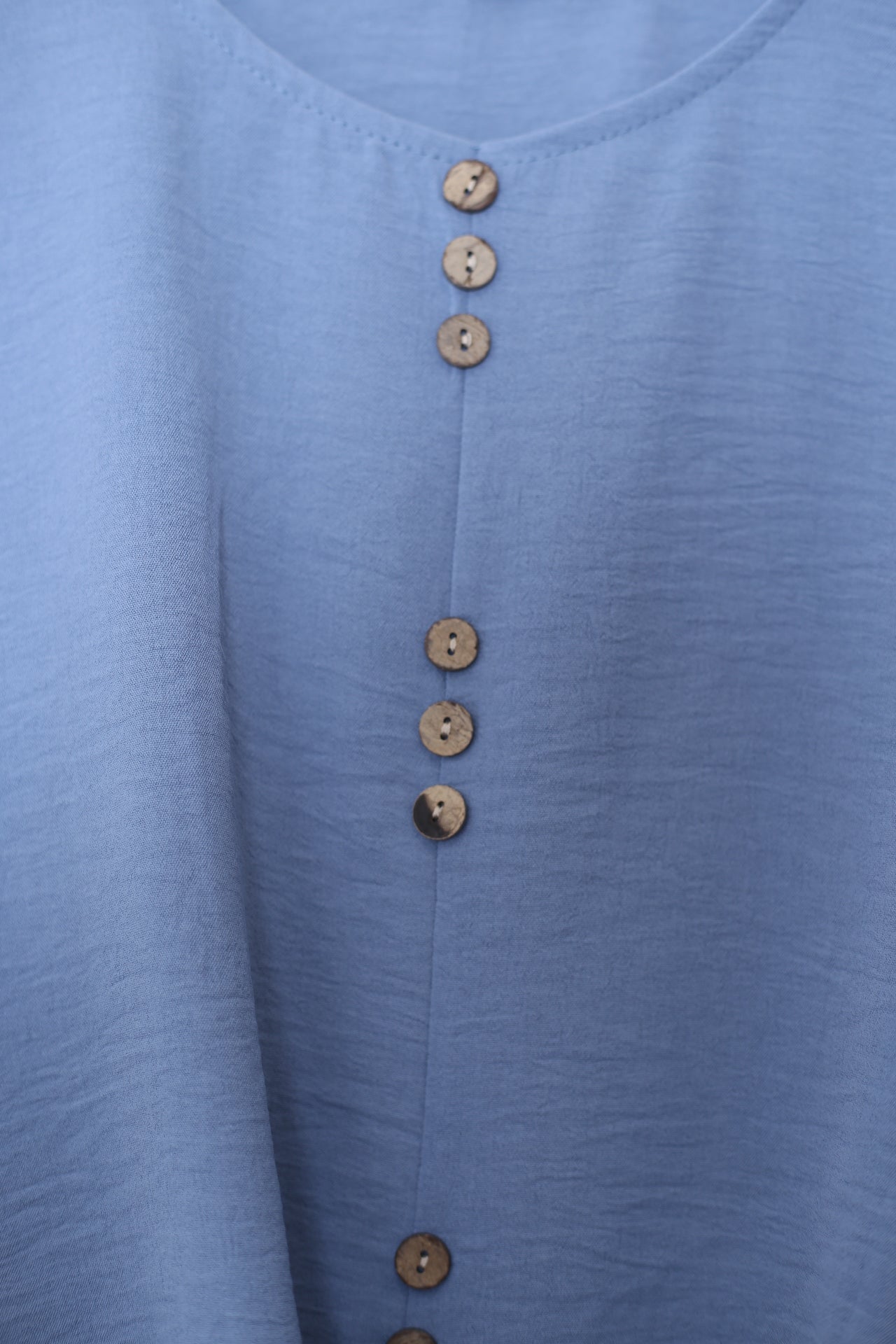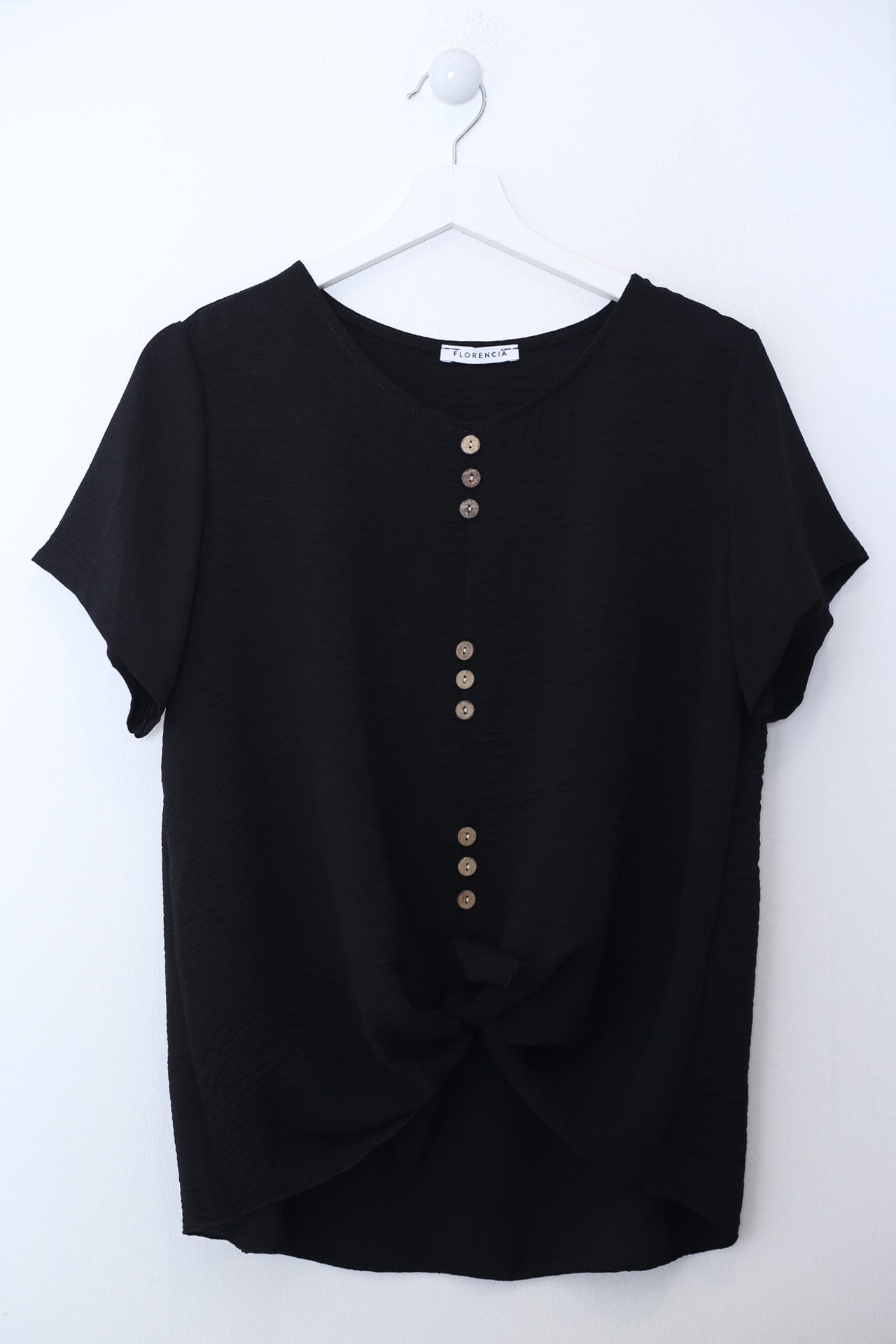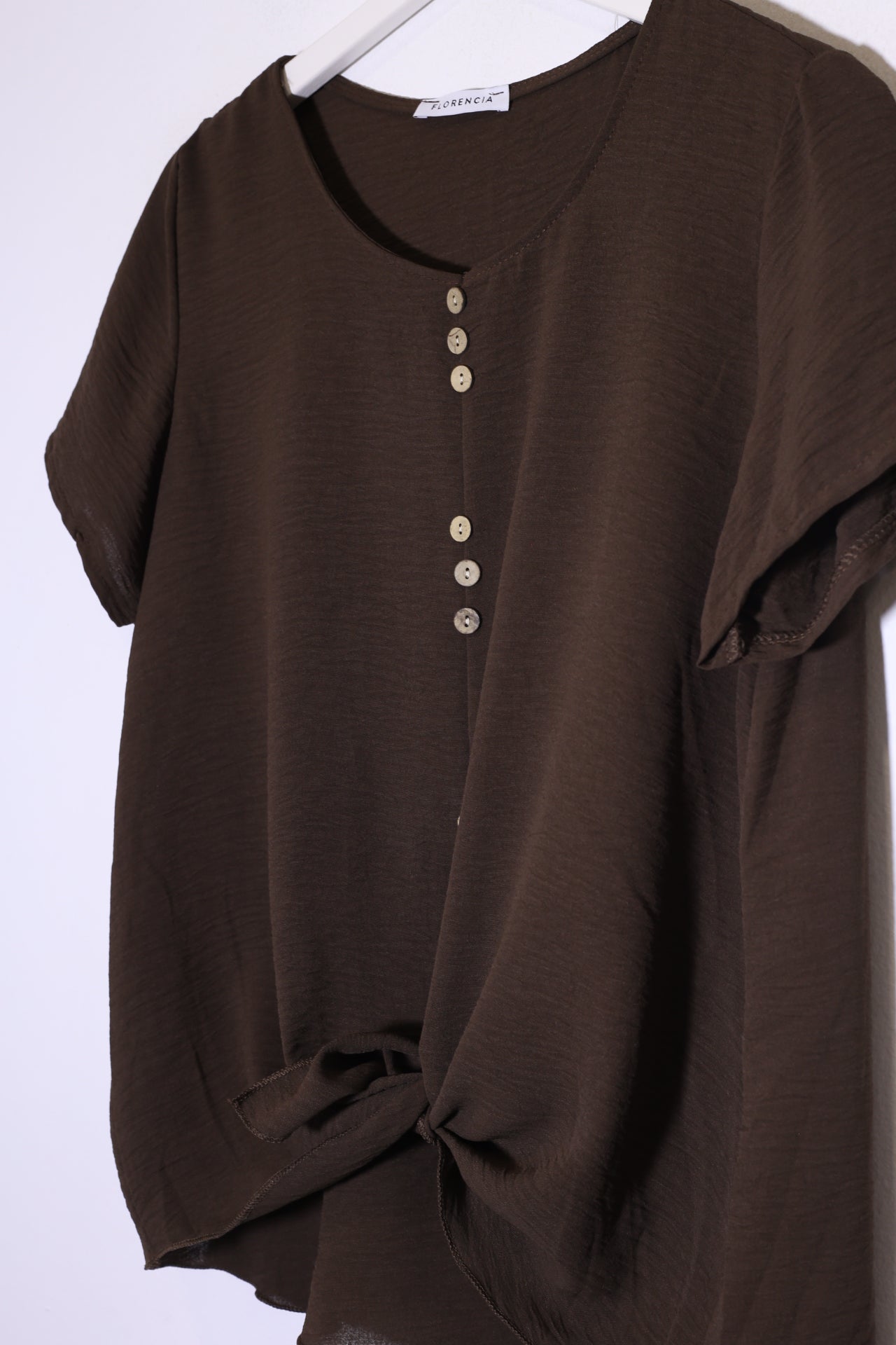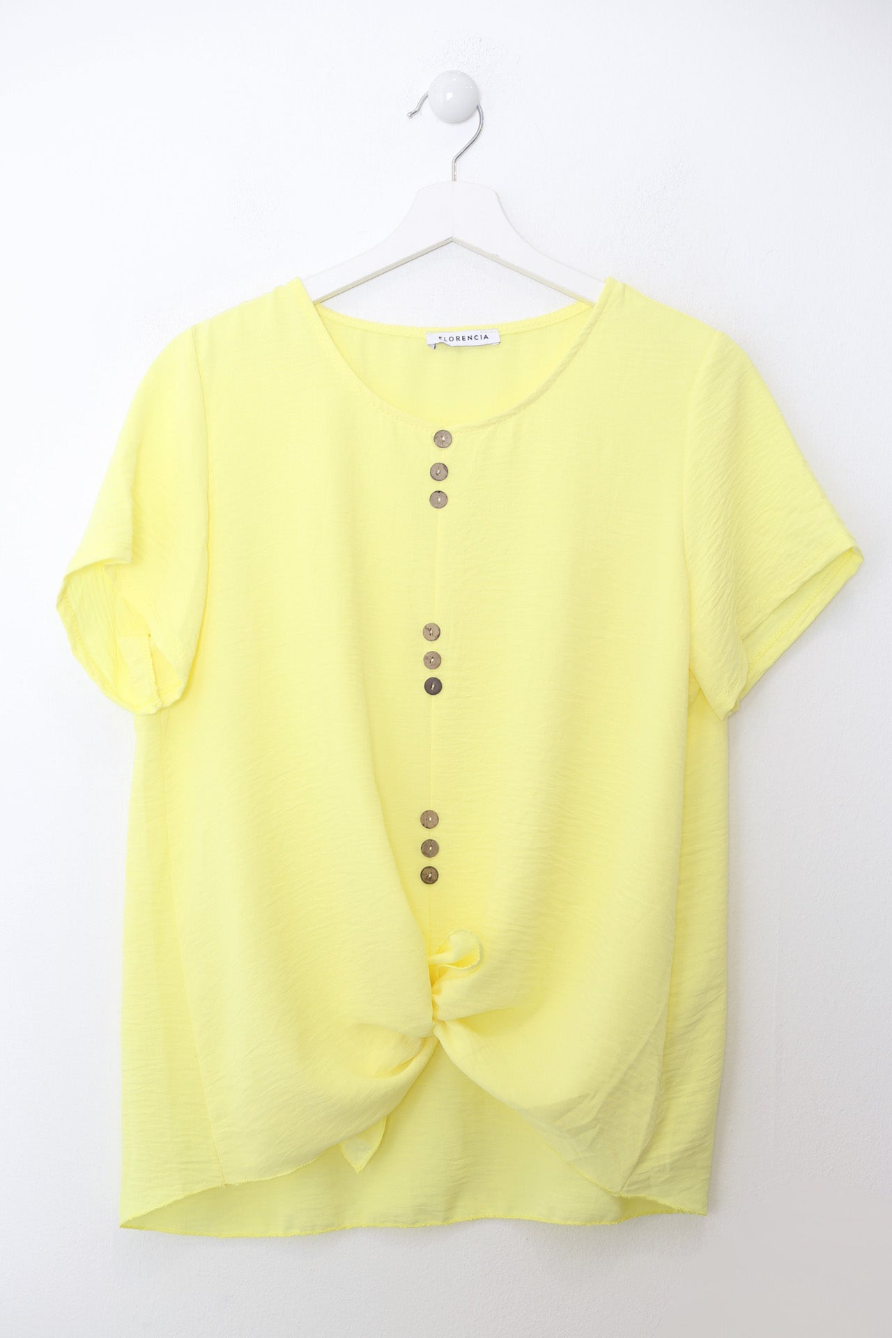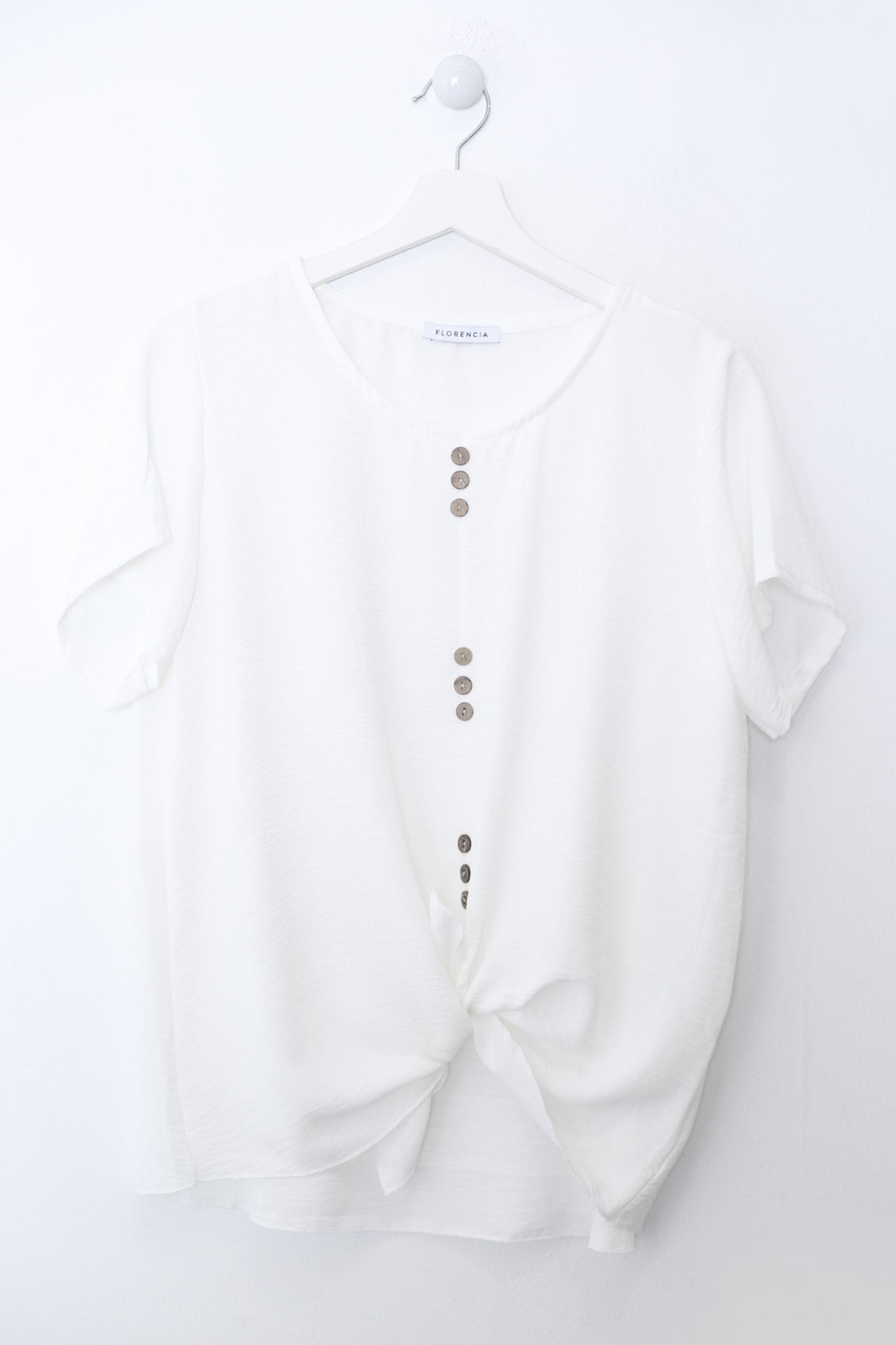 Blusa con escote redondo y manga corta. Detalle de botones decorativos en frontal y abertura en el bajo. Corte holgado y tejido elástico.
