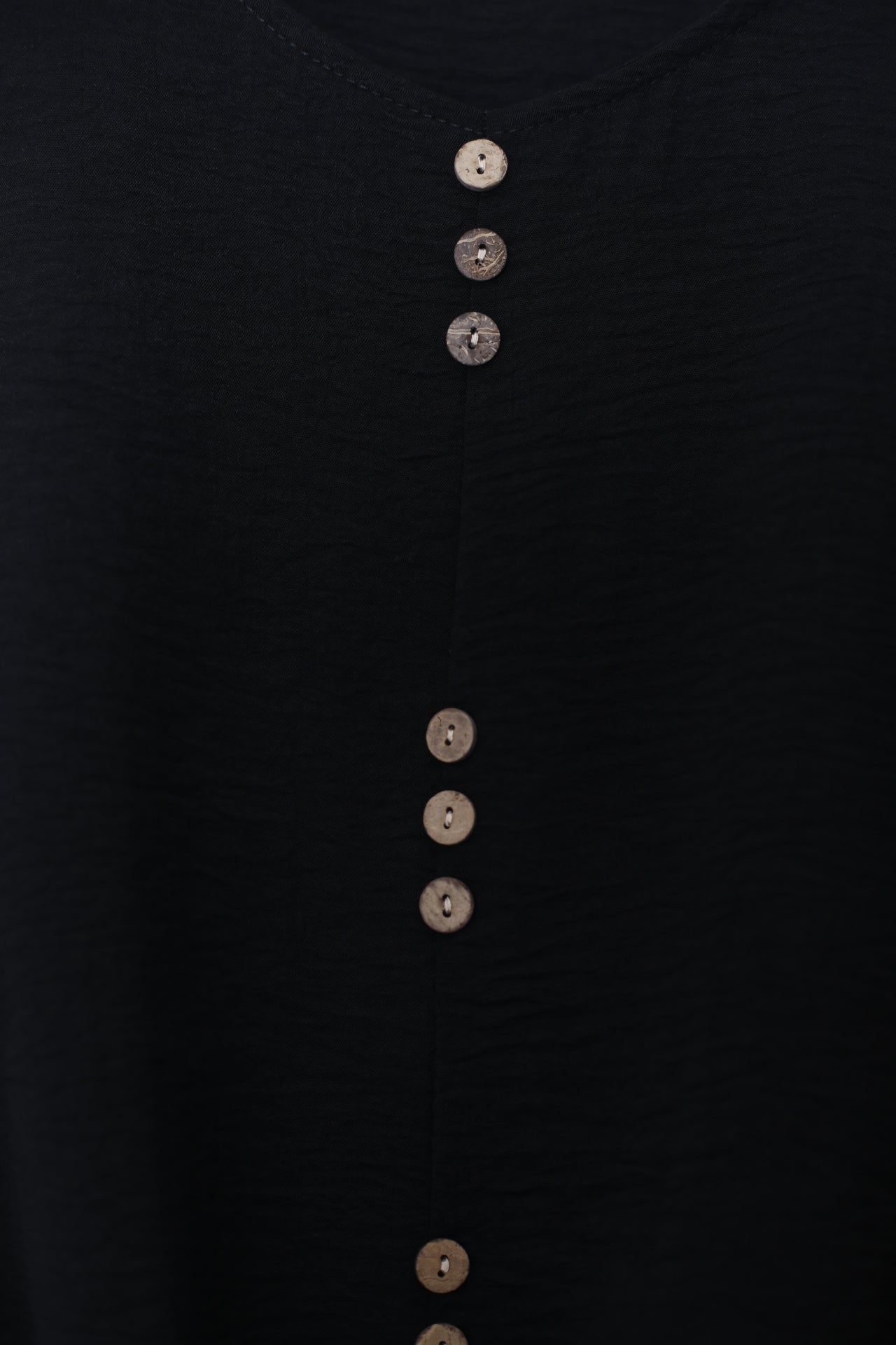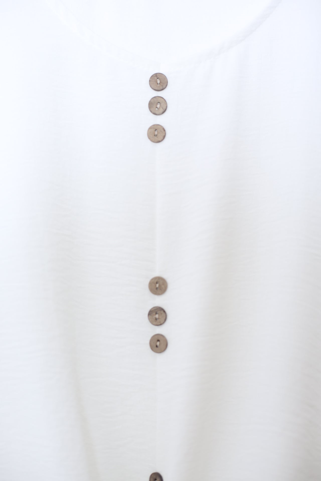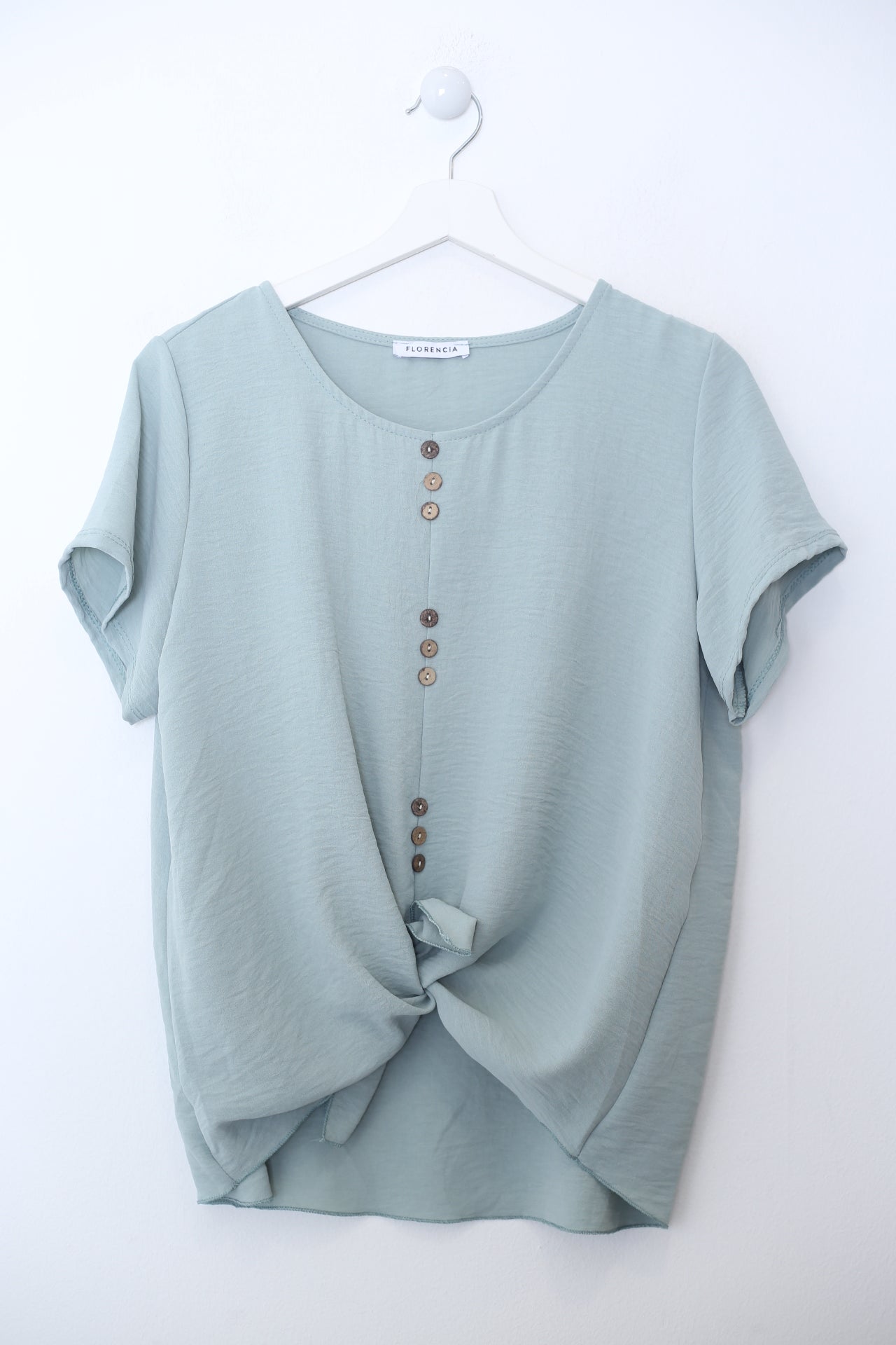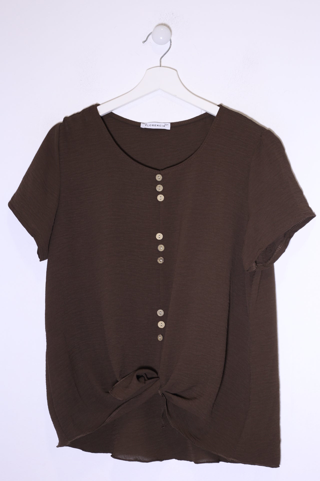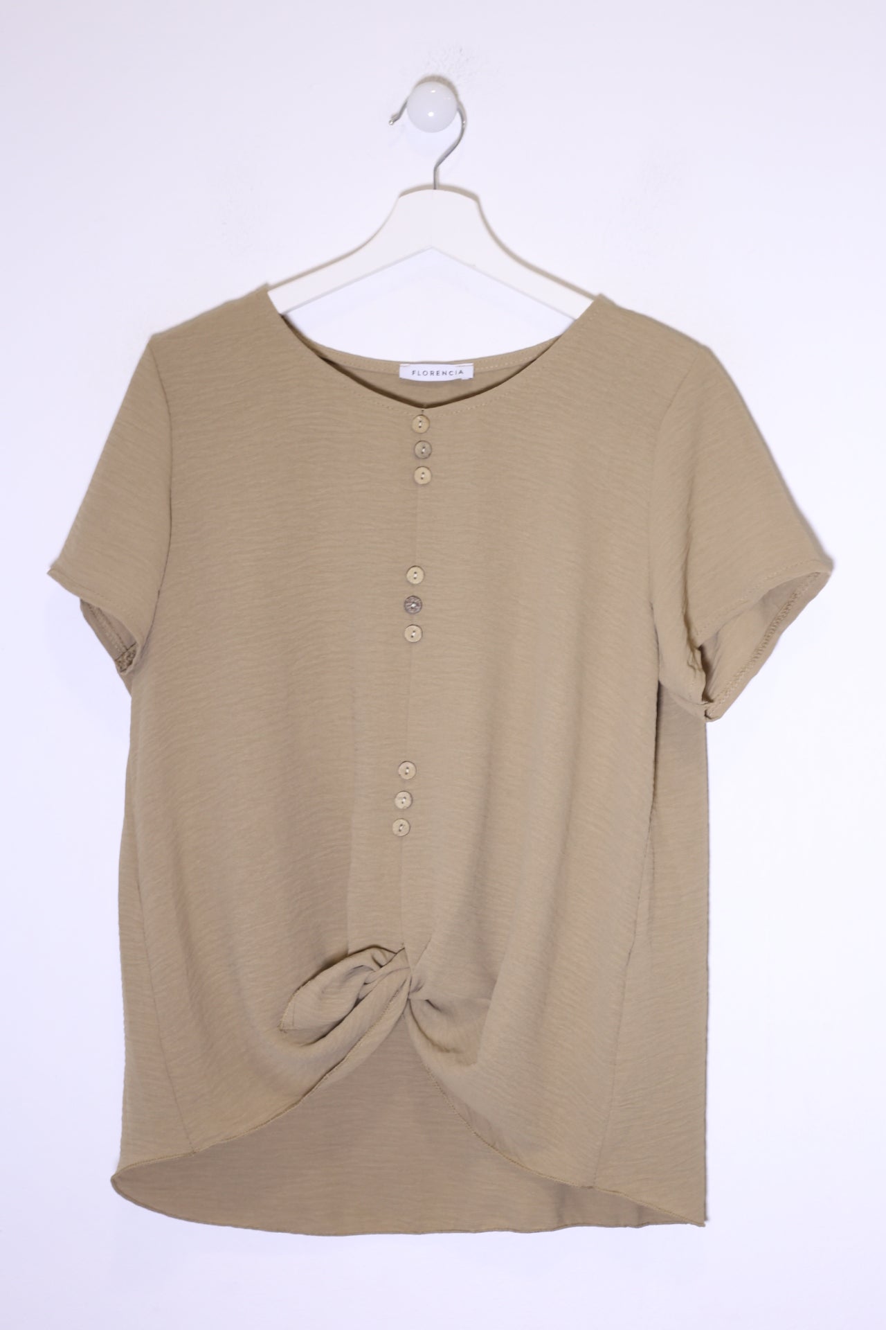 Blusa con escote redondo y manga corta. Detalle de botones decorativos en frontal y abertura en el bajo. Corte holgado y tejido elástico.