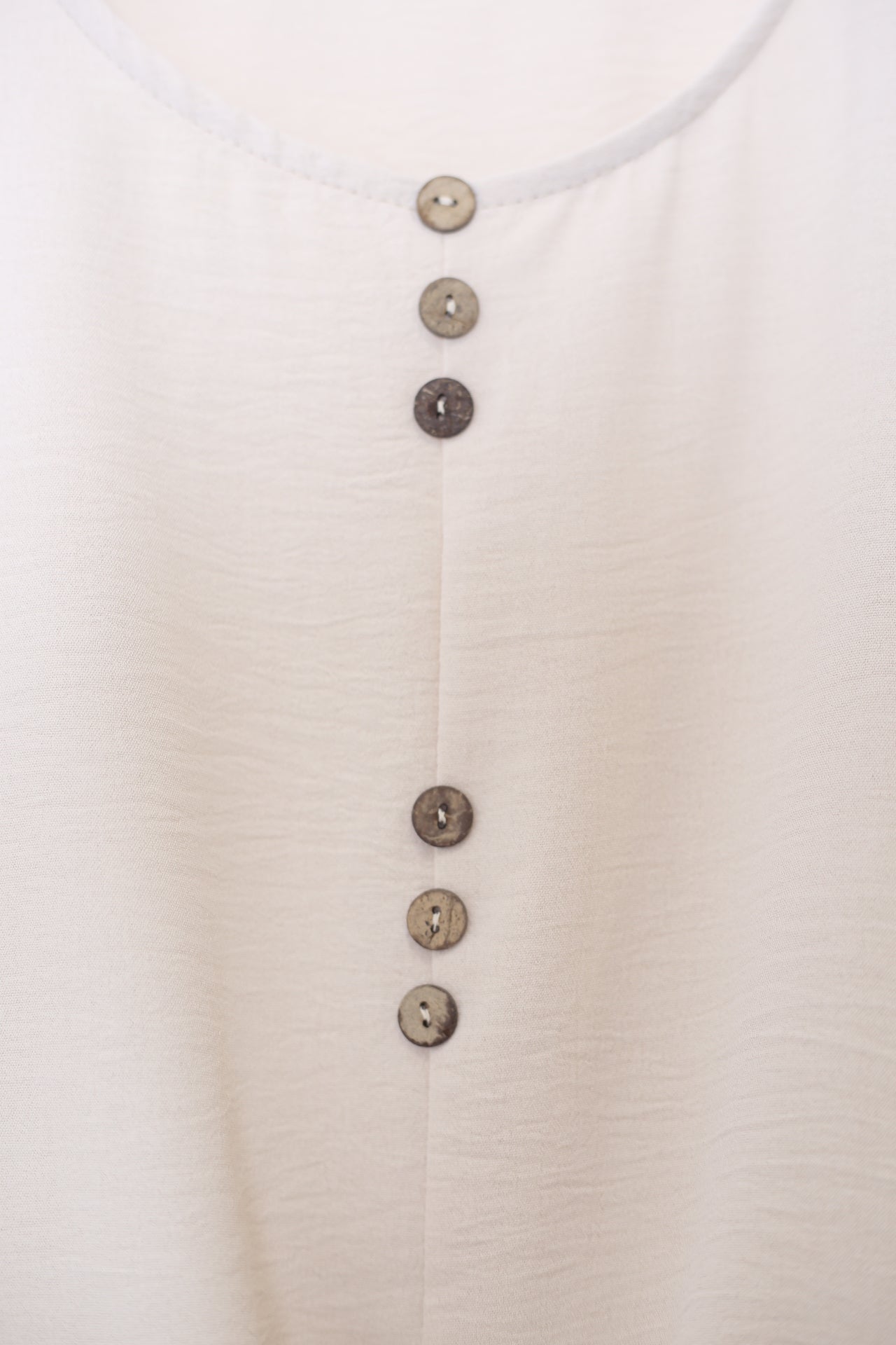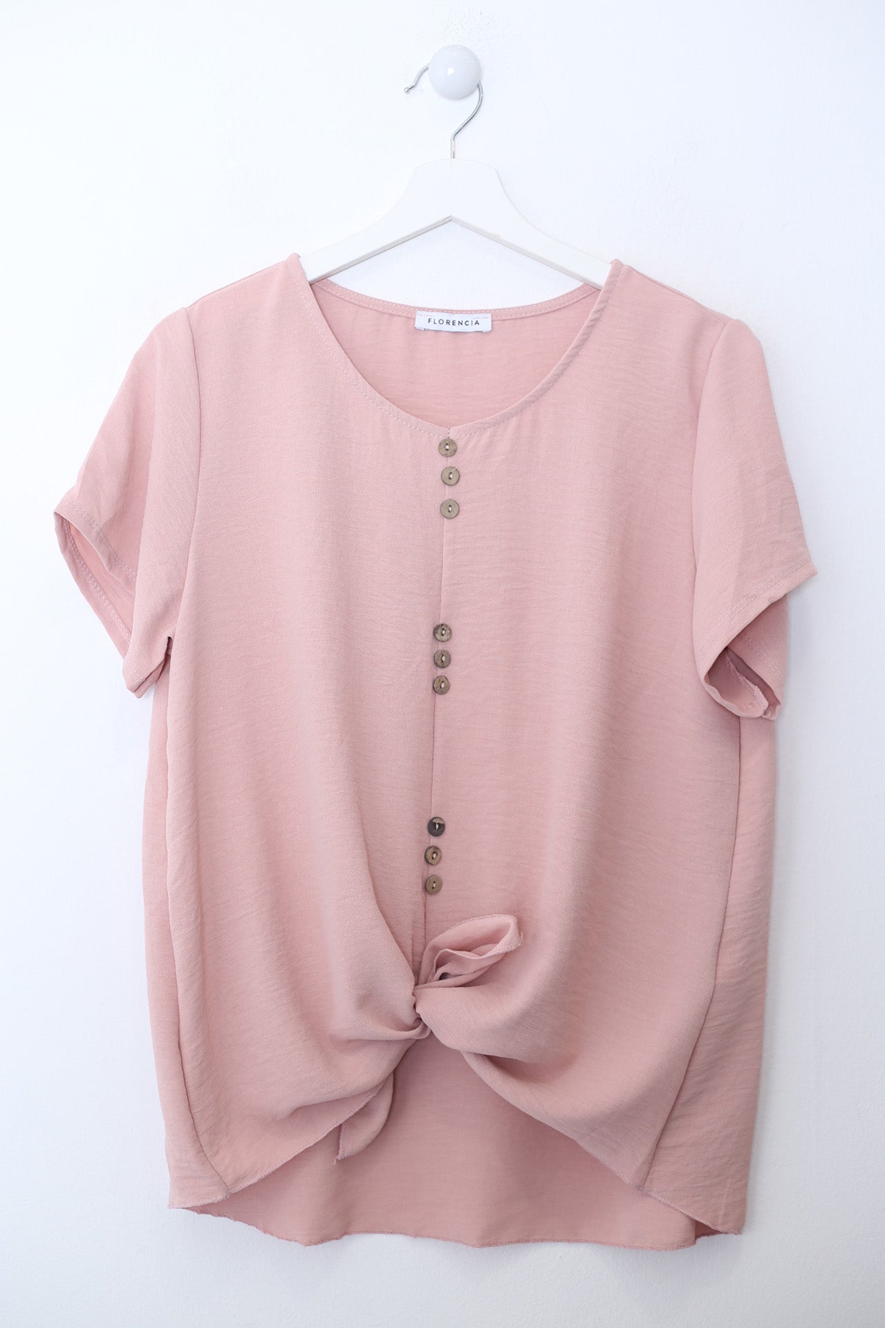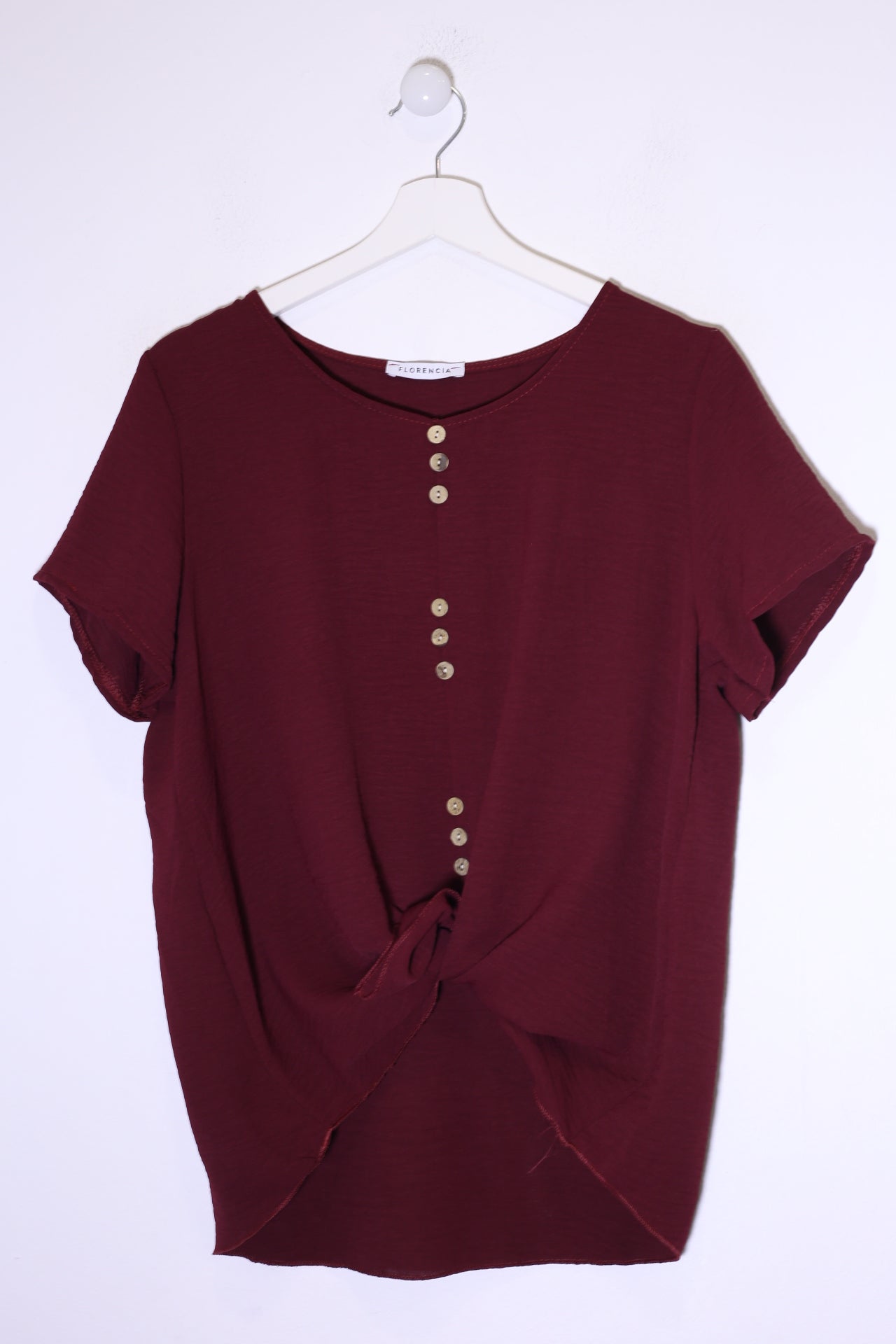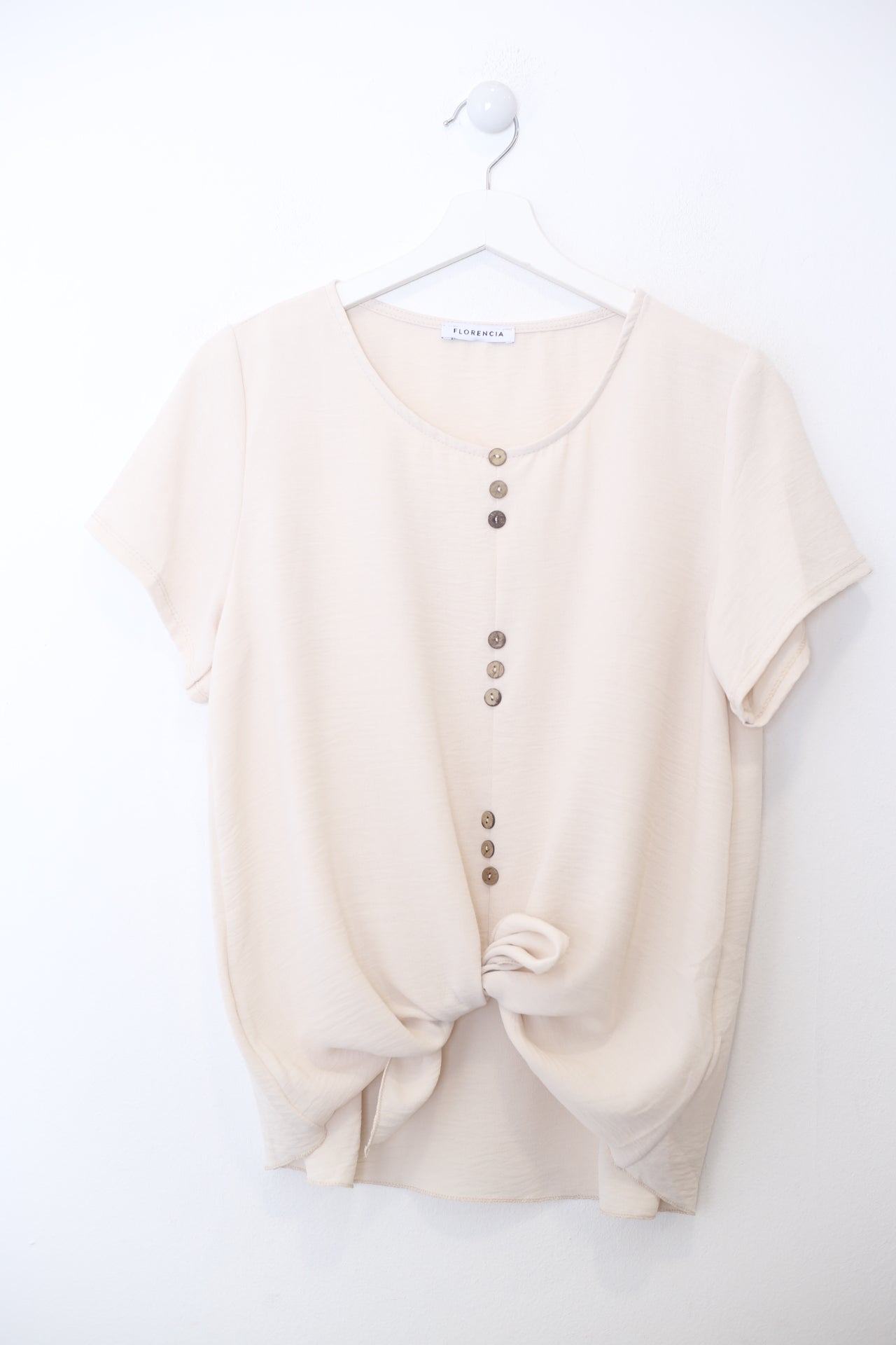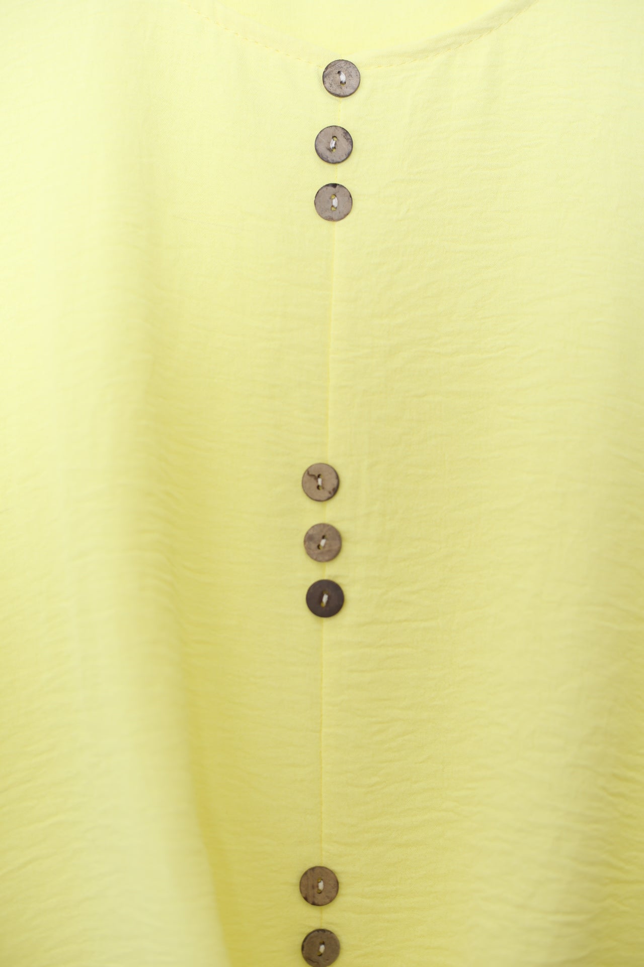 Blusa con escote redondo y manga corta. Detalle de botones decorativos en frontal y abertura en el bajo. Corte holgado y tejido elástico.