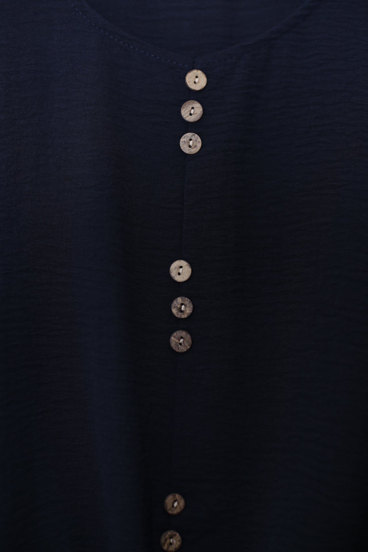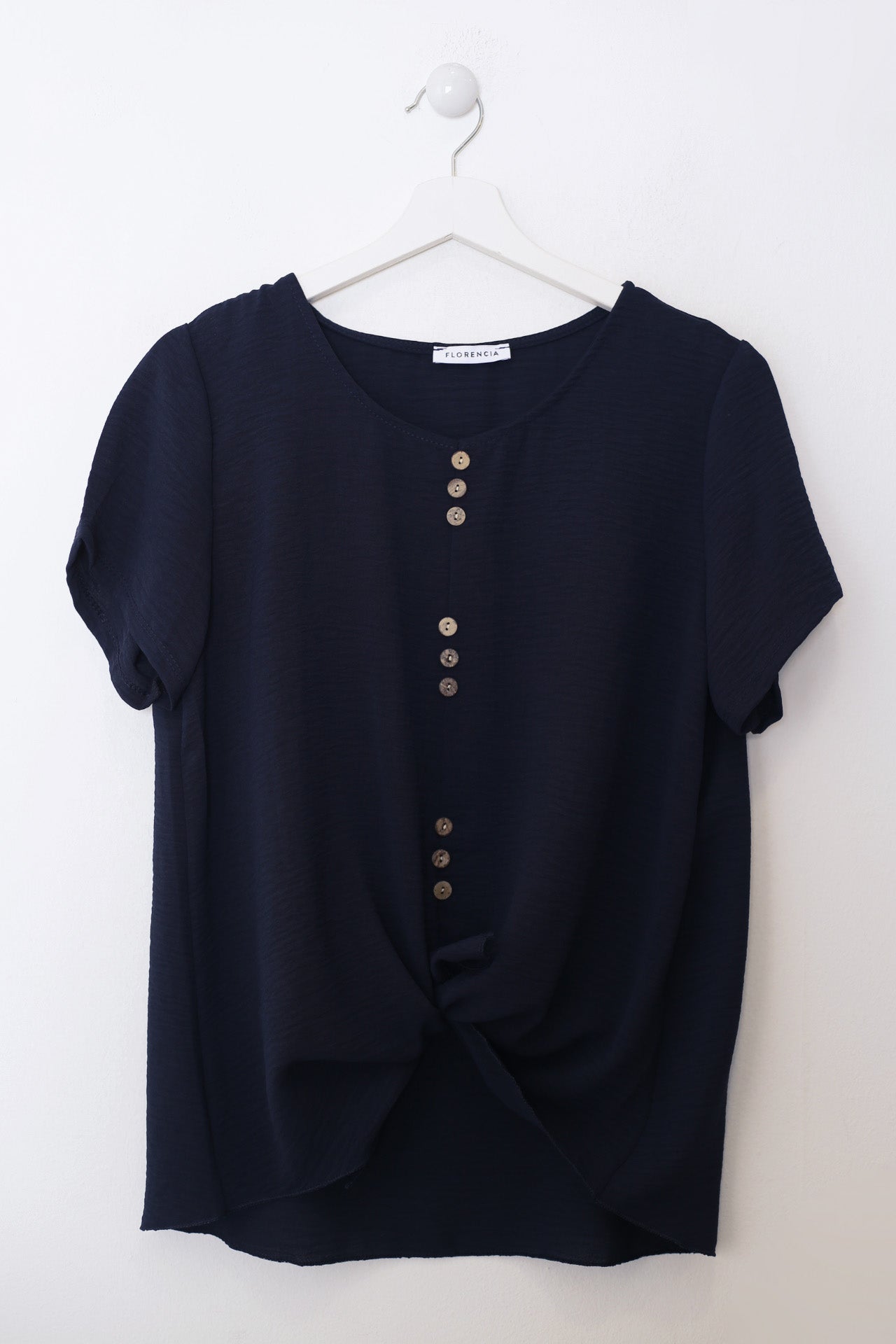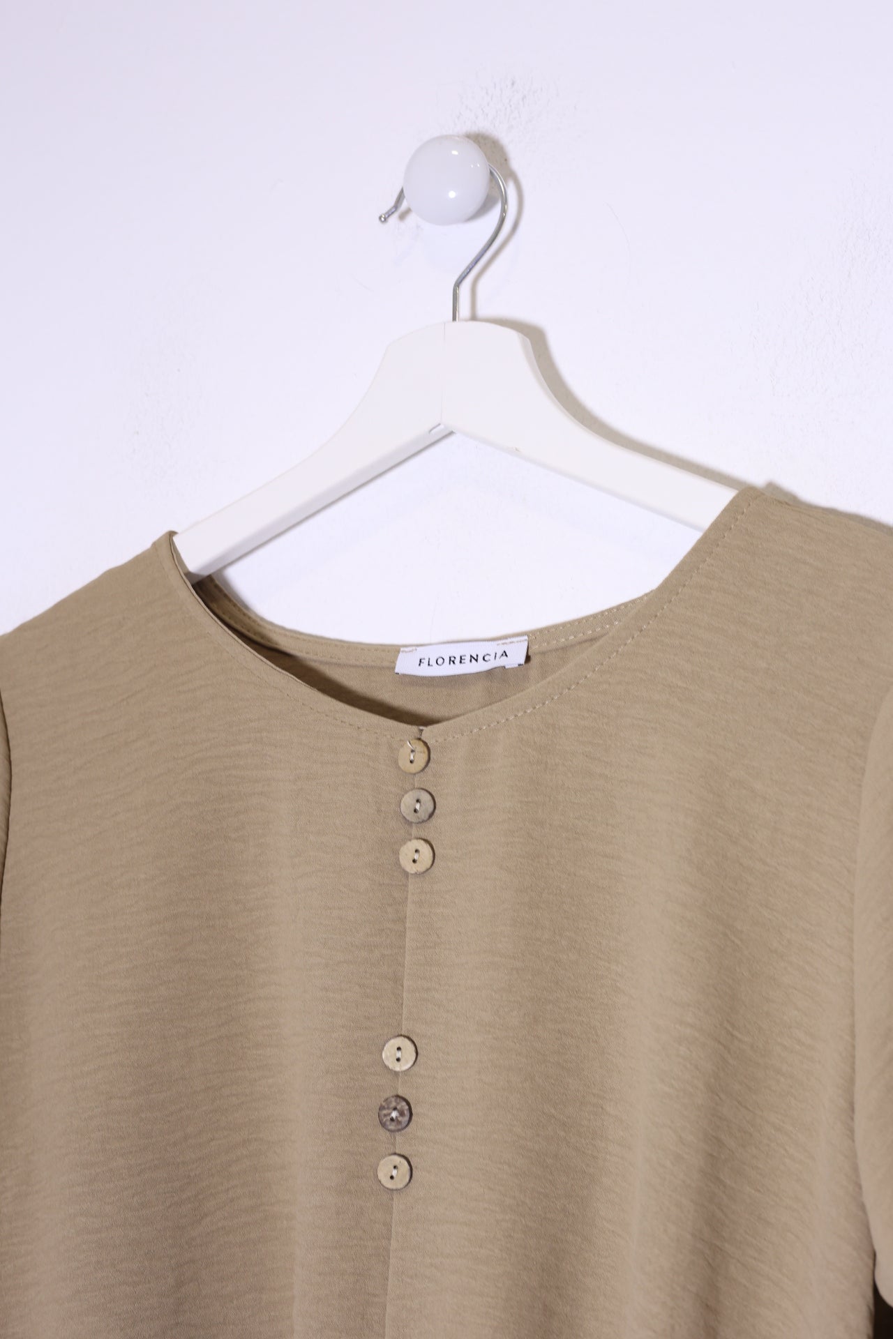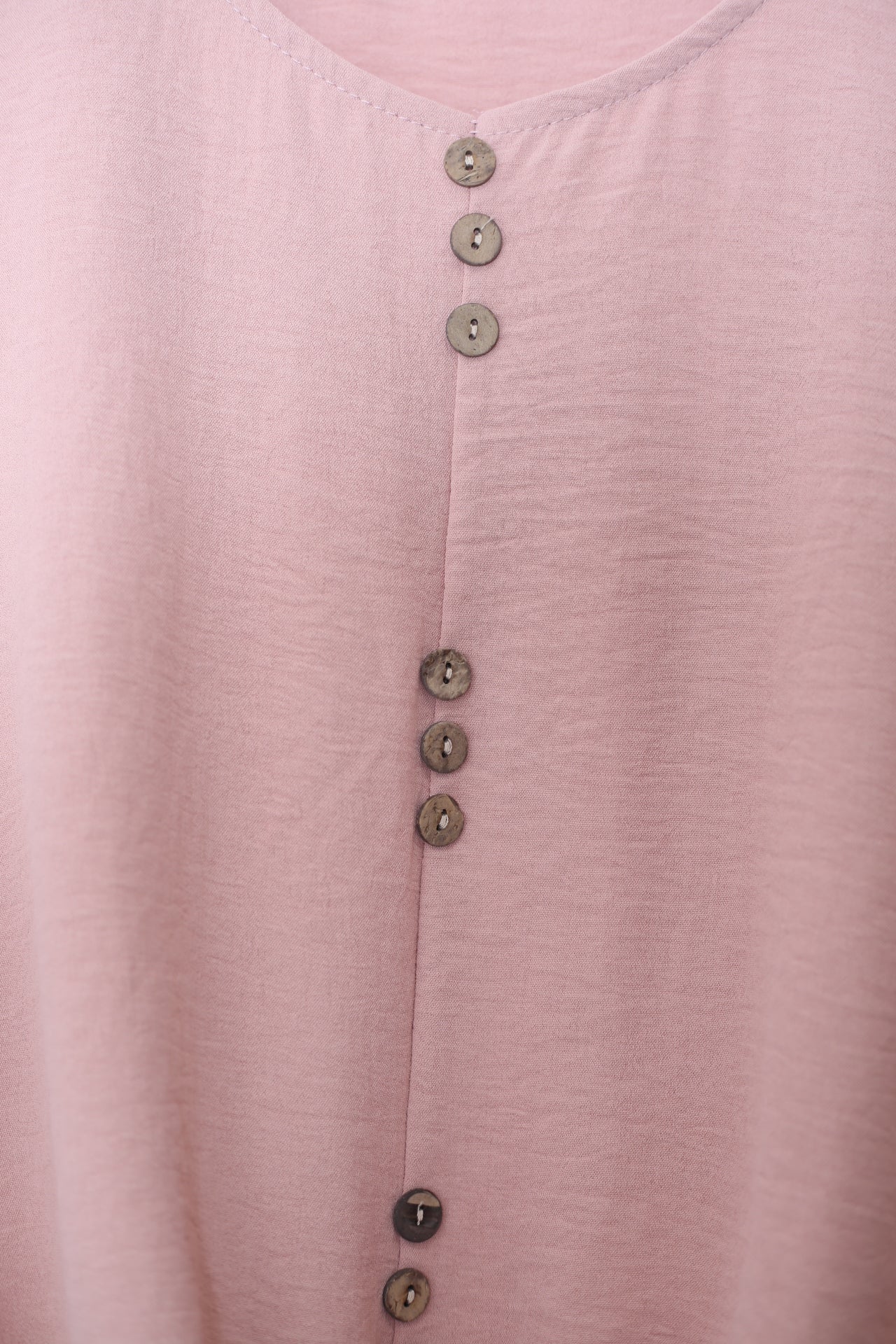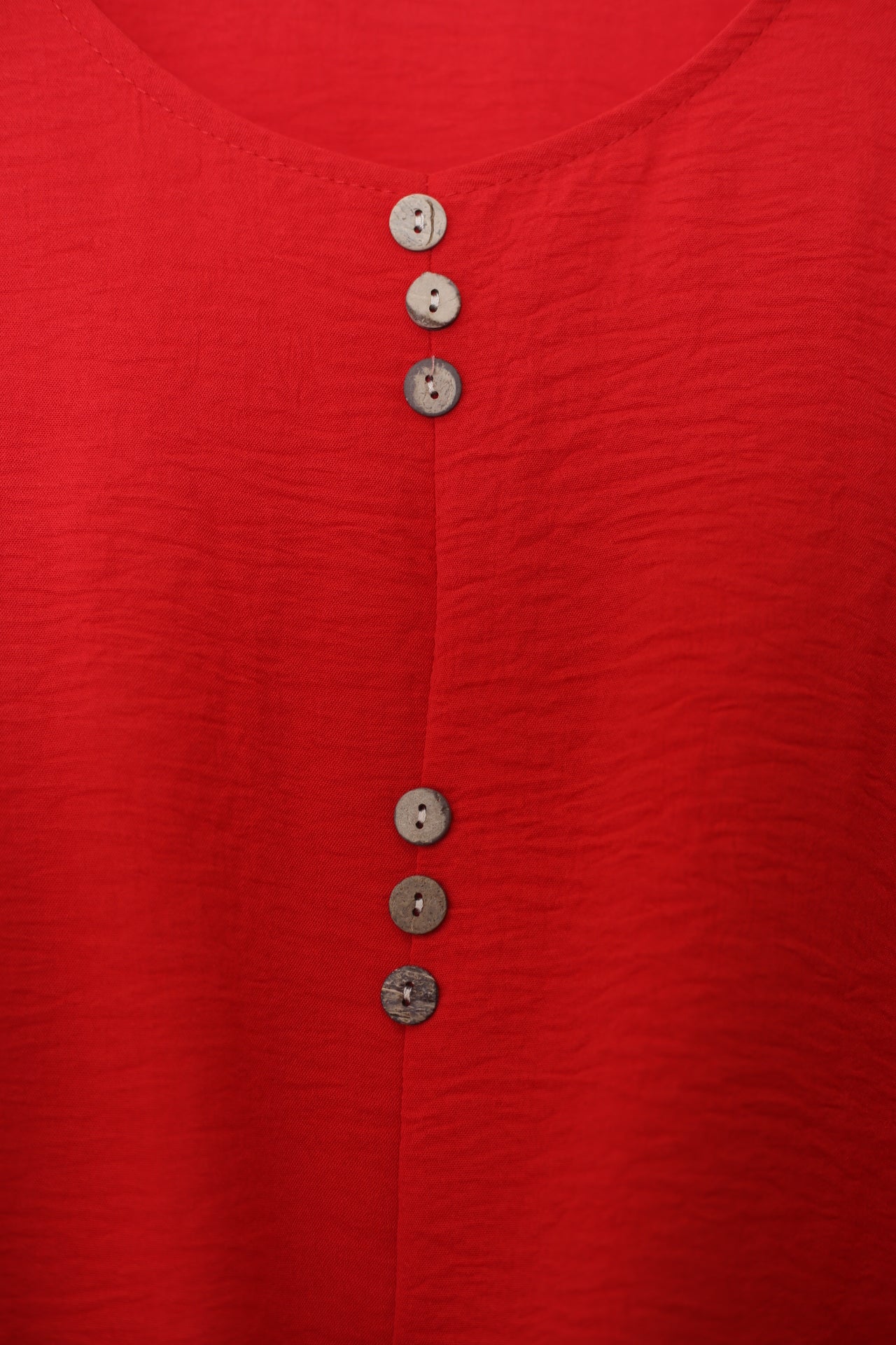 Blusa con escote redondo y manga corta. Detalle de botones decorativos en frontal y abertura en el bajo. Corte holgado y tejido elástico.