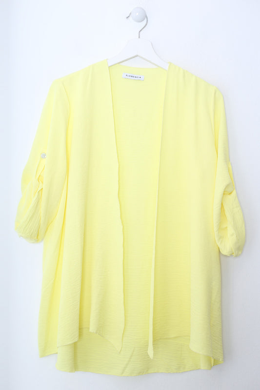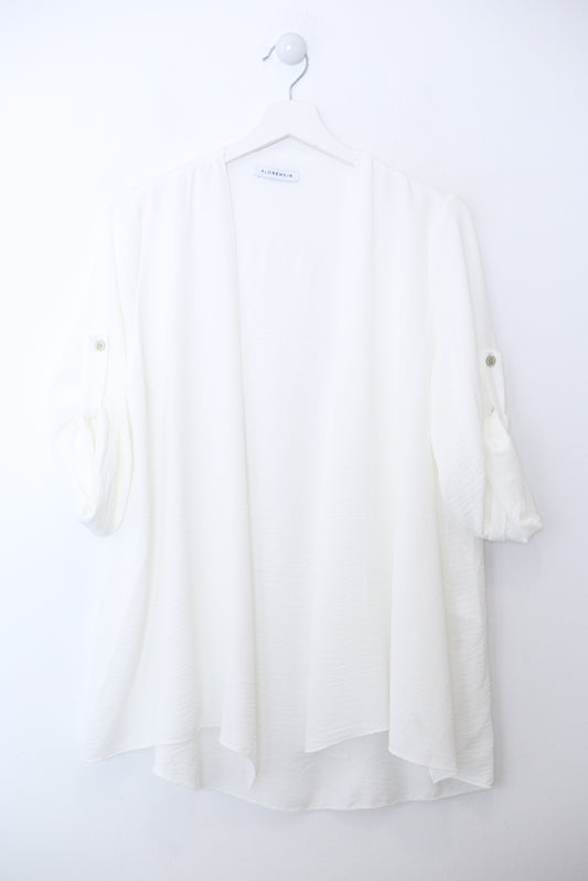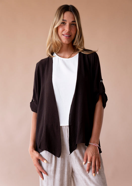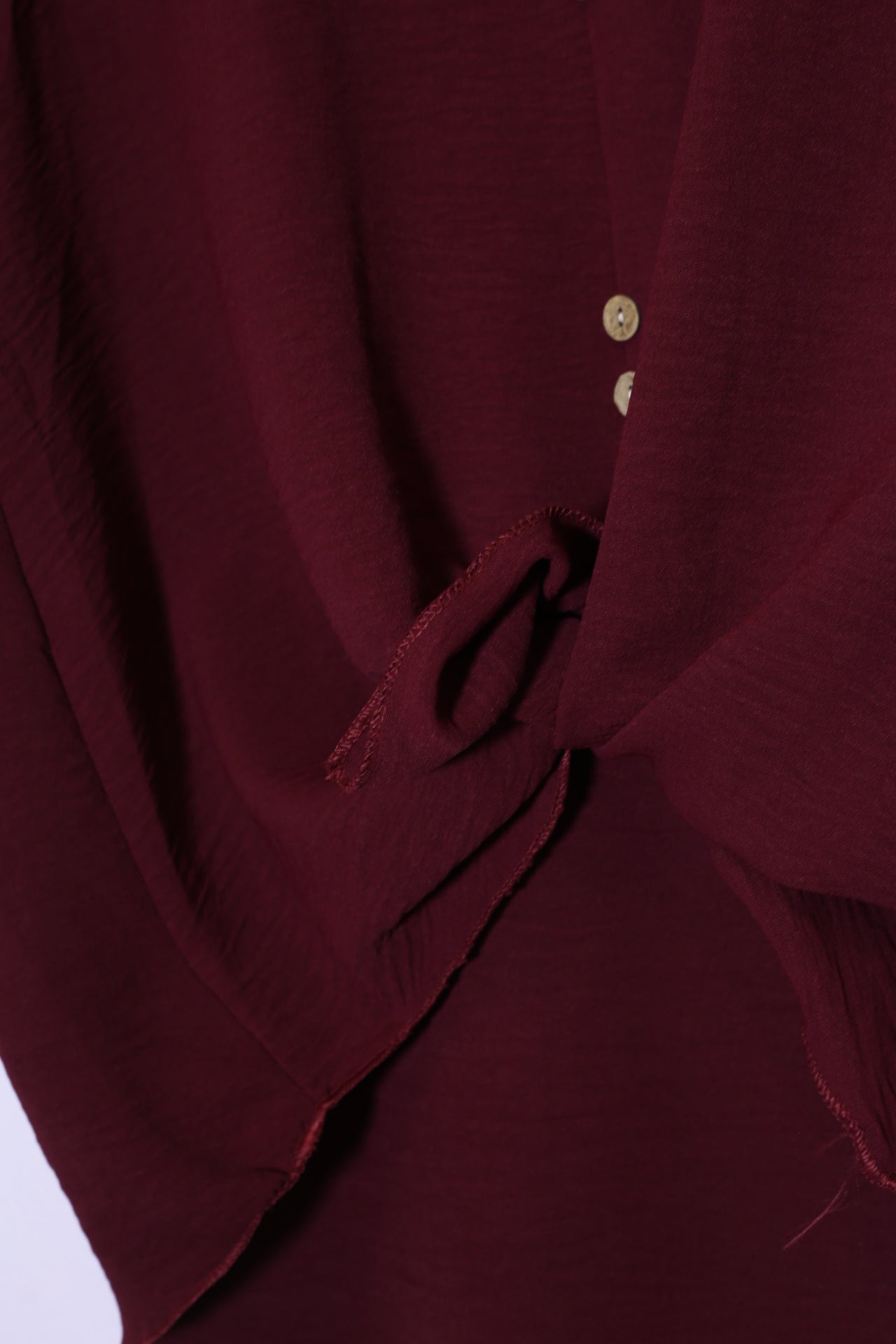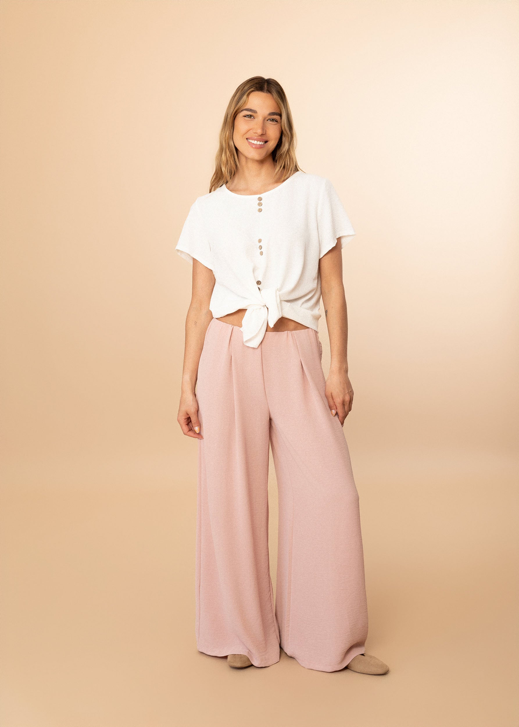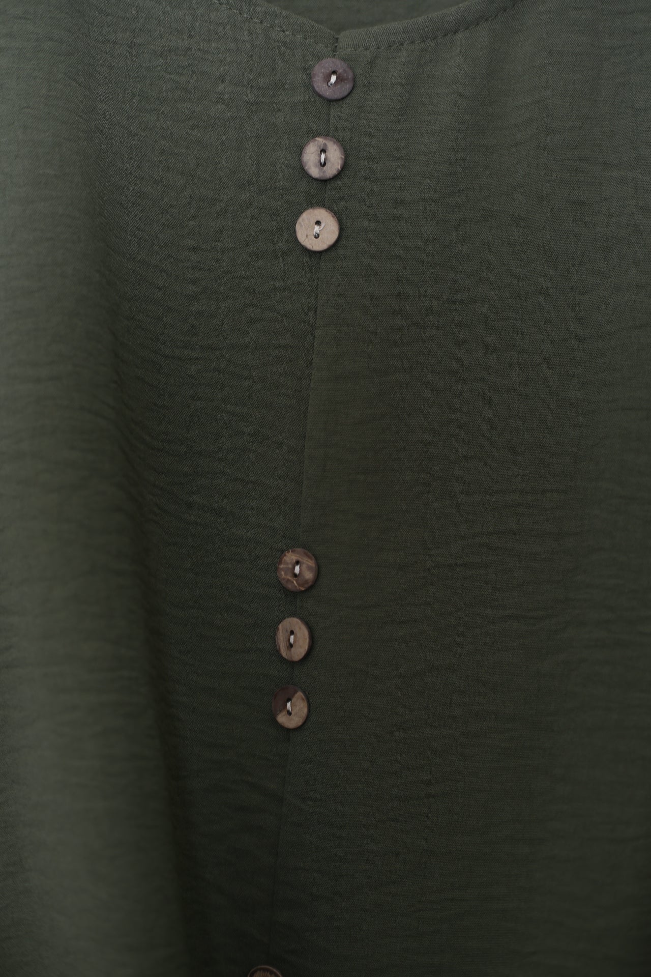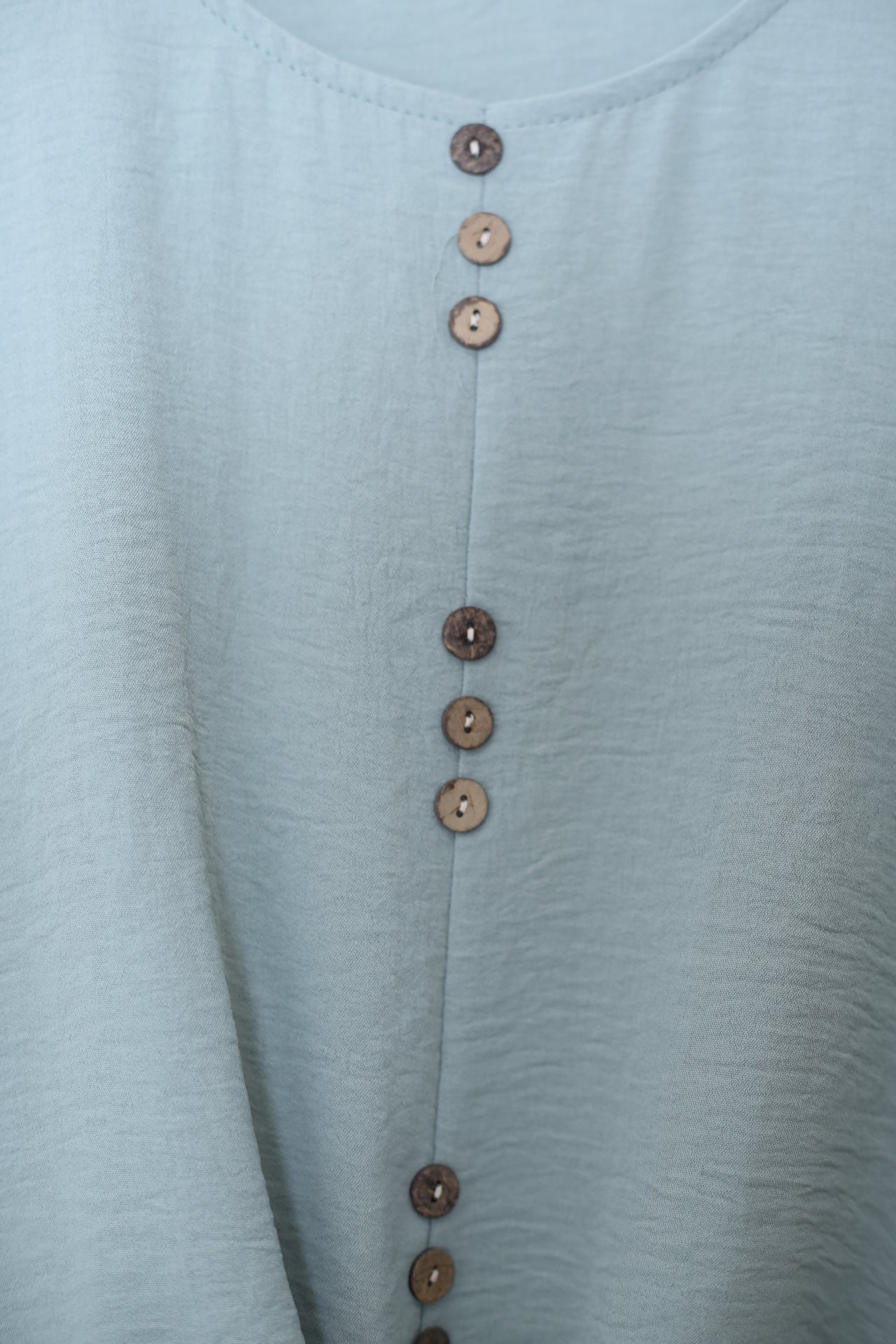 Blusa con escote redondo y manga corta. Detalle de botones decorativos en frontal y abertura en el bajo. Corte holgado y tejido elástico.