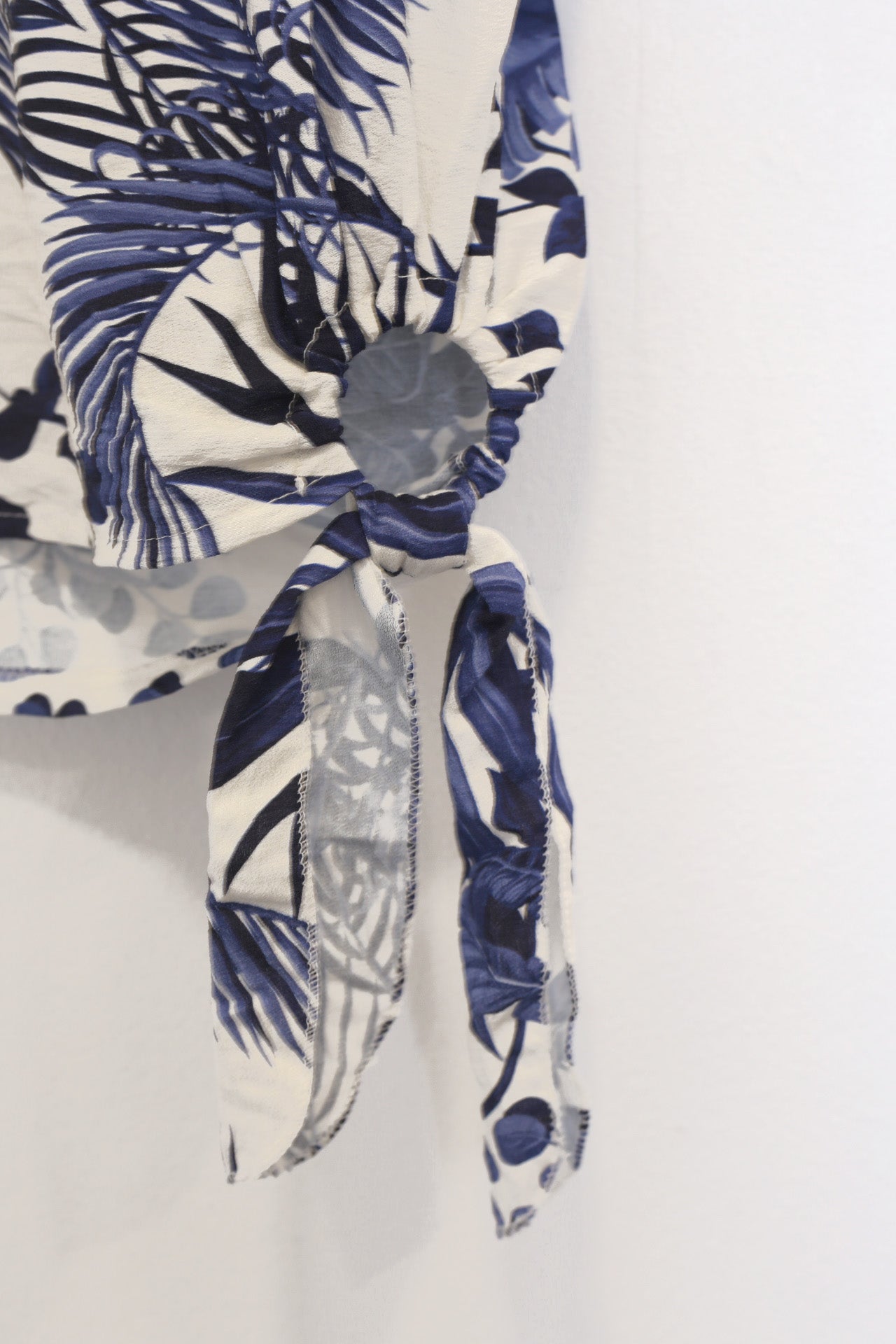Blusa de cuello redondo y manga corta. Detalle de anilla y nudo en lateral. Estampado floral. Corte amplio.