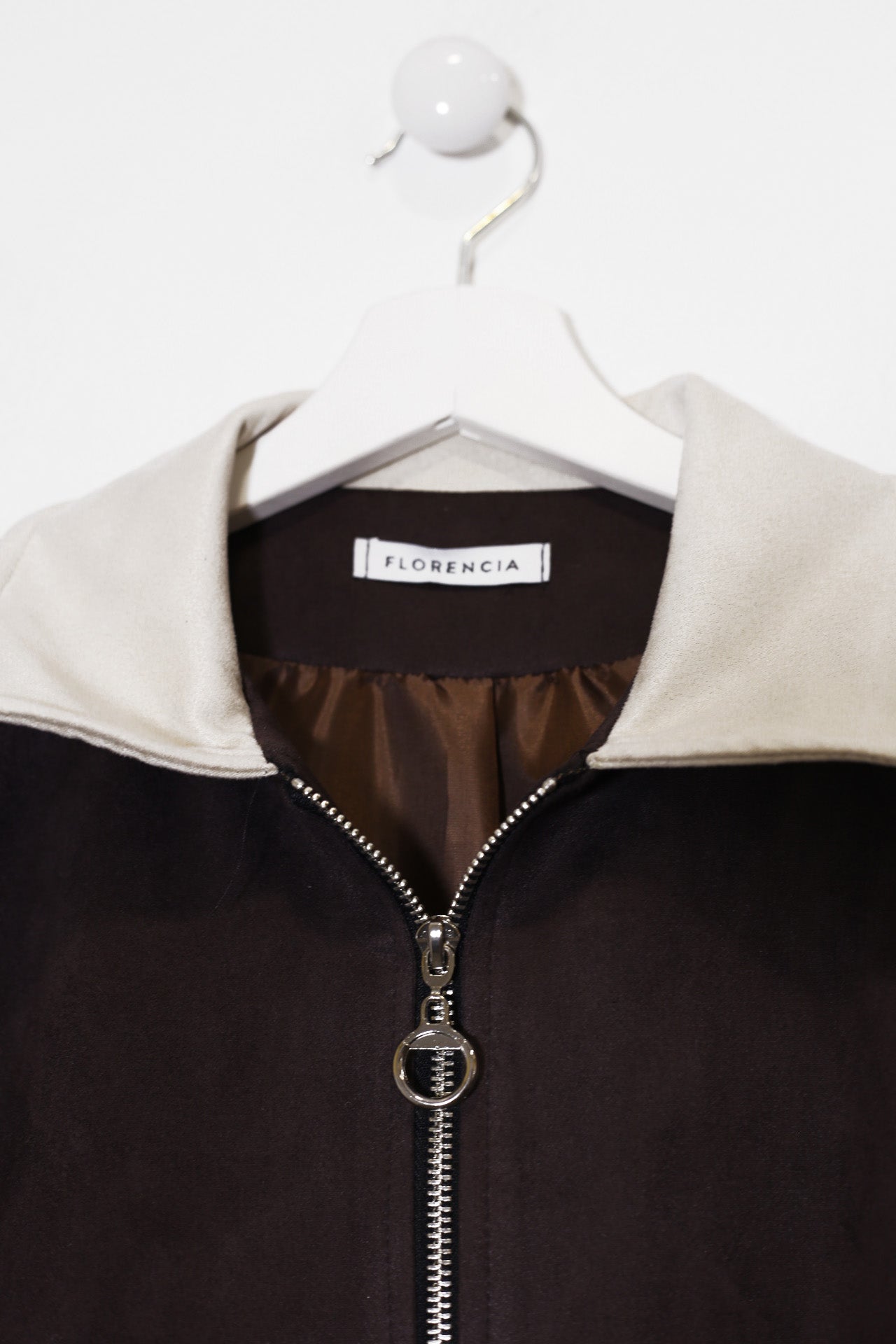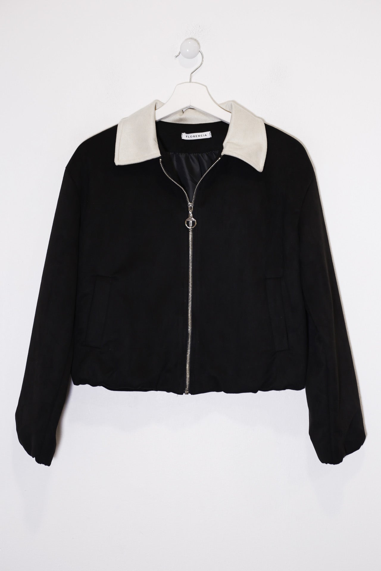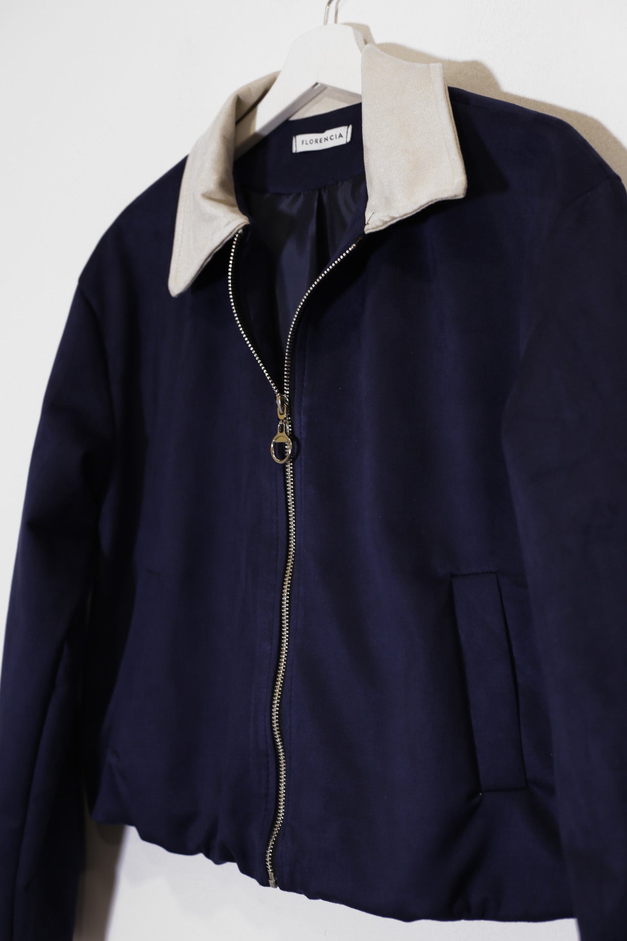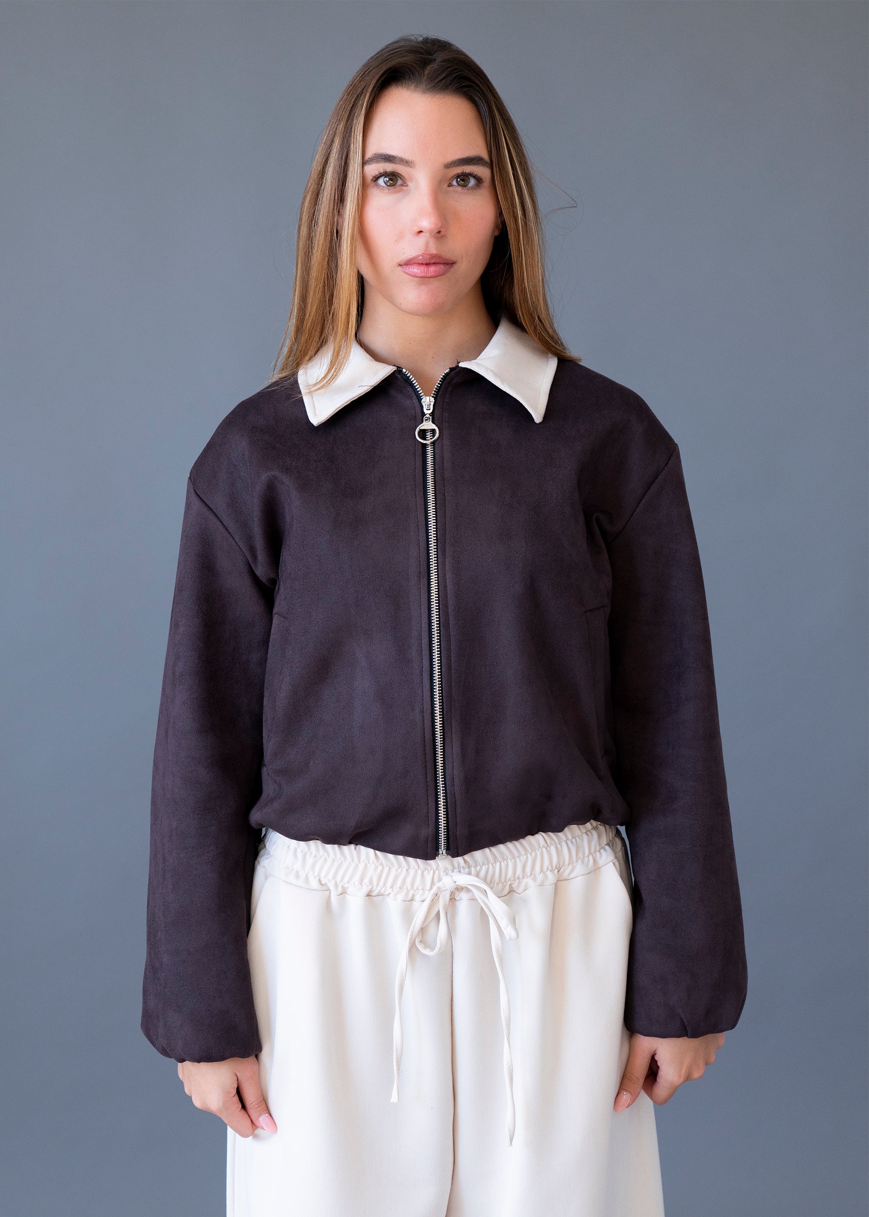 Cazadora con cuello solapa a contraste y manga larga. Cierre frontal con cremallera. Bolsillos frontales. Bajo con detalle elástico. Forro interior.