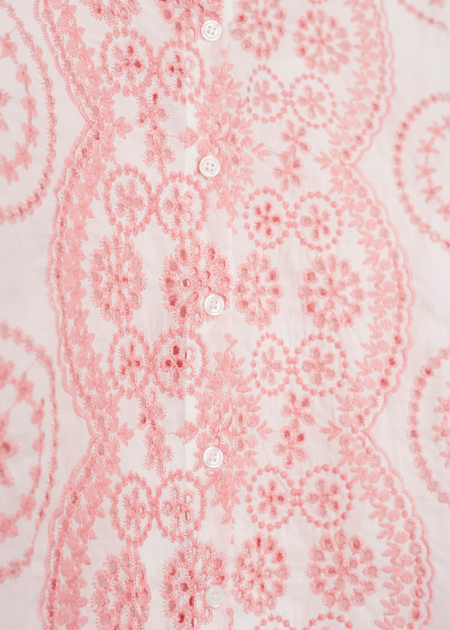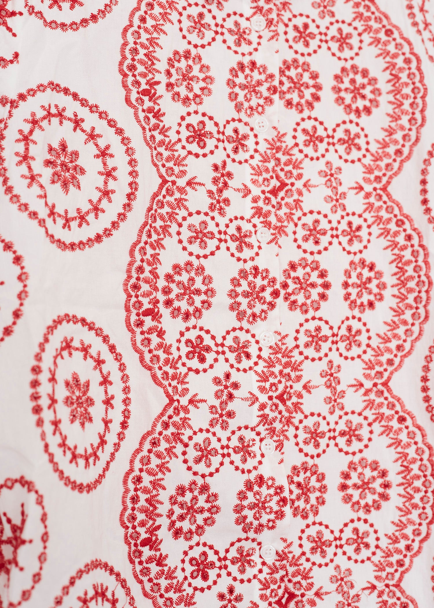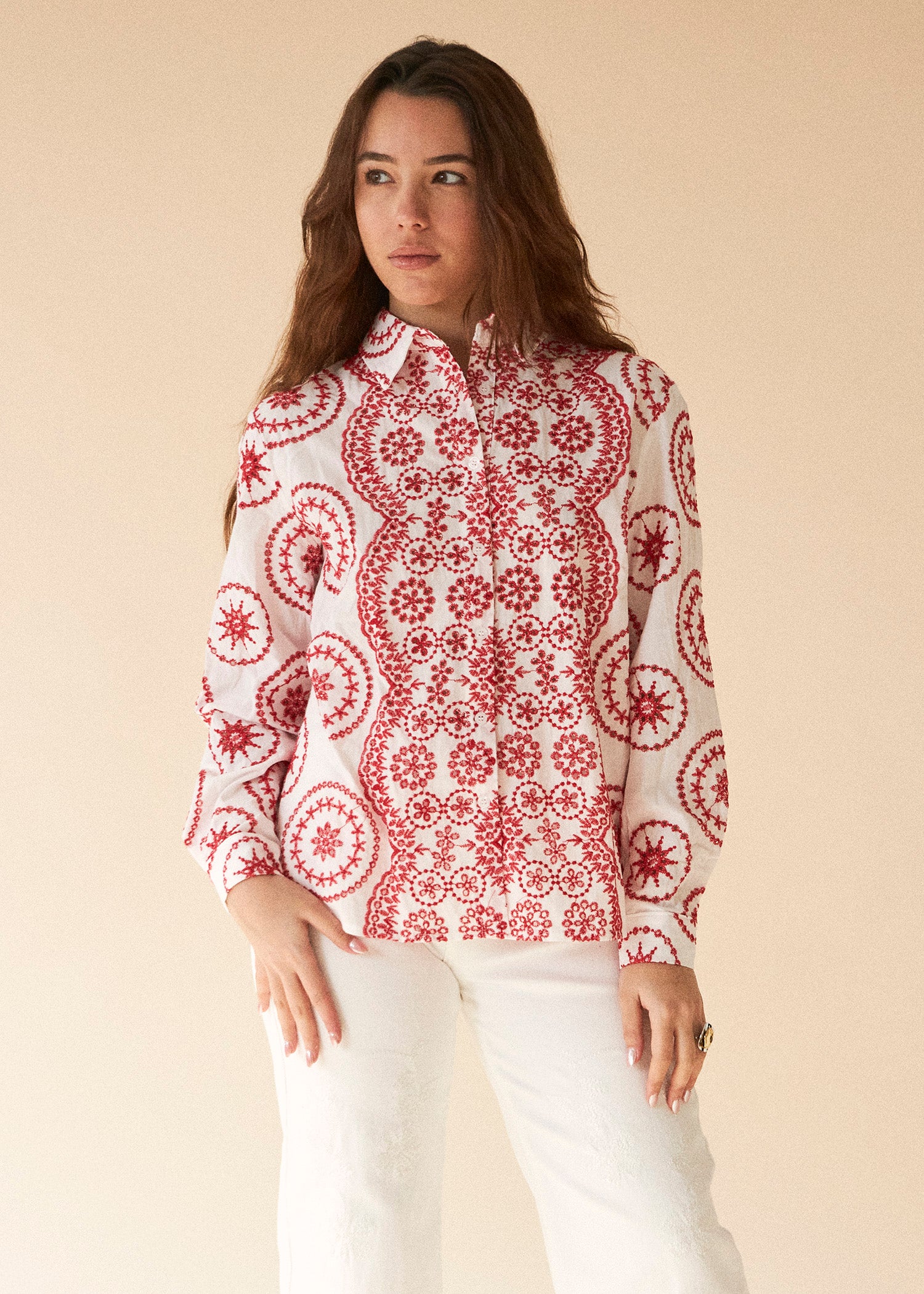 Camisa con cuello solapa y manga larga acabada en puño con botones. Cierre frontal abotonado. Corte recto. Bajos asimétricos. Detalle de bordados perforados a contraste.