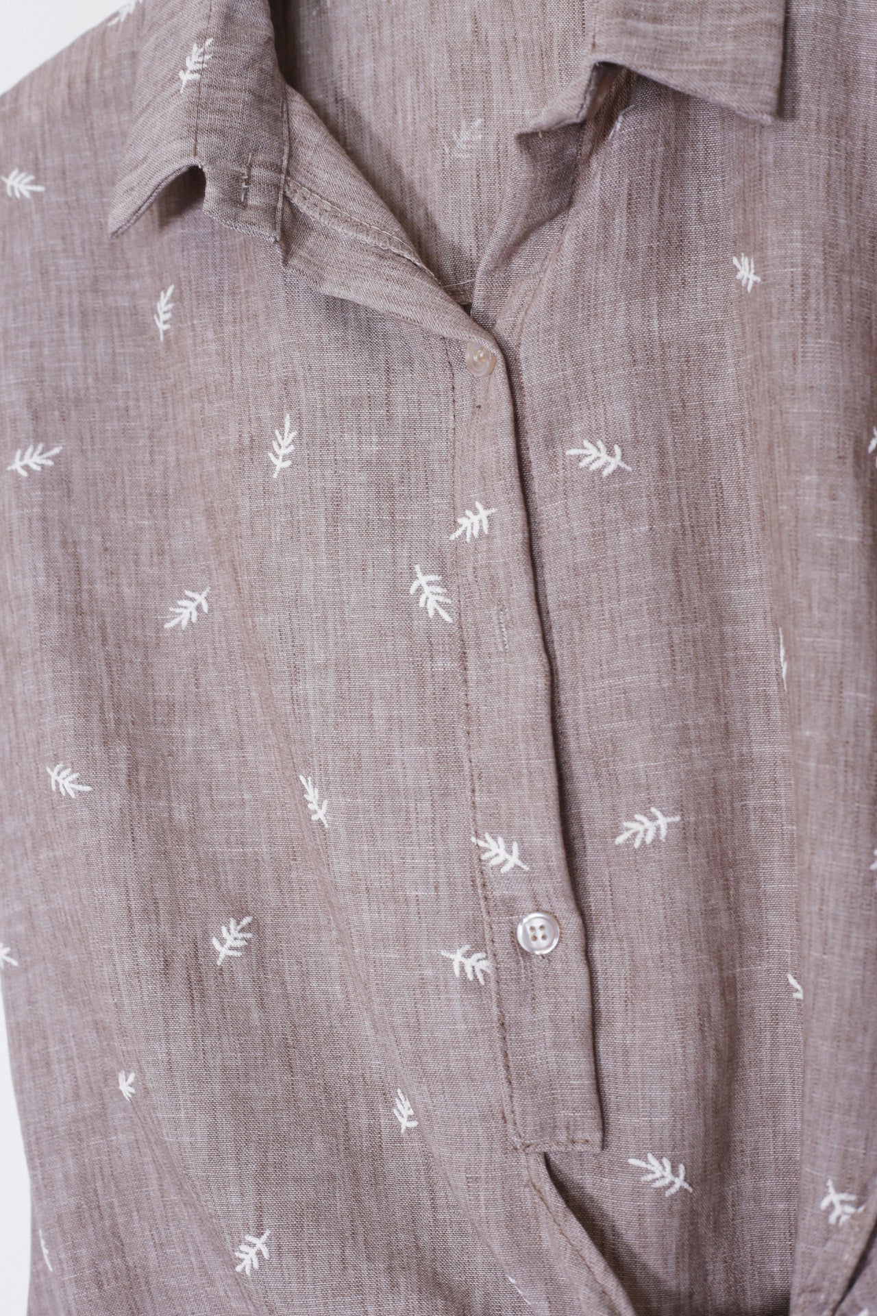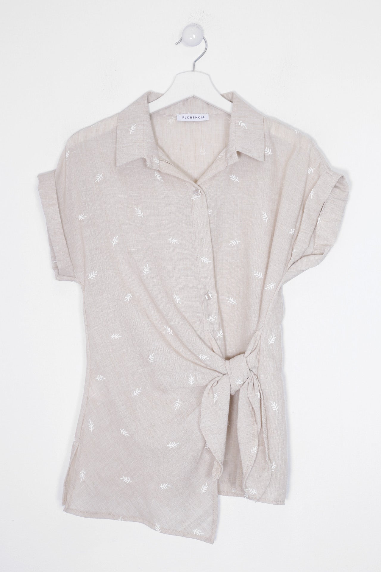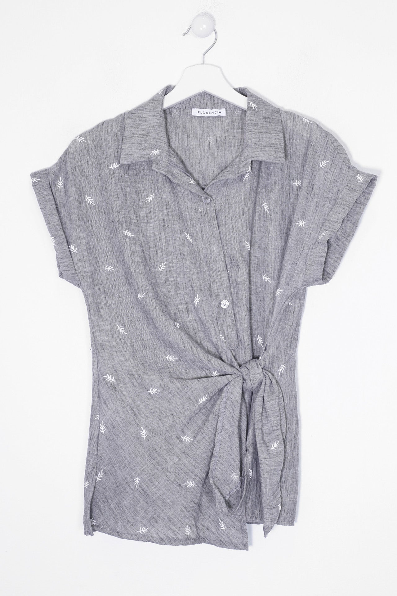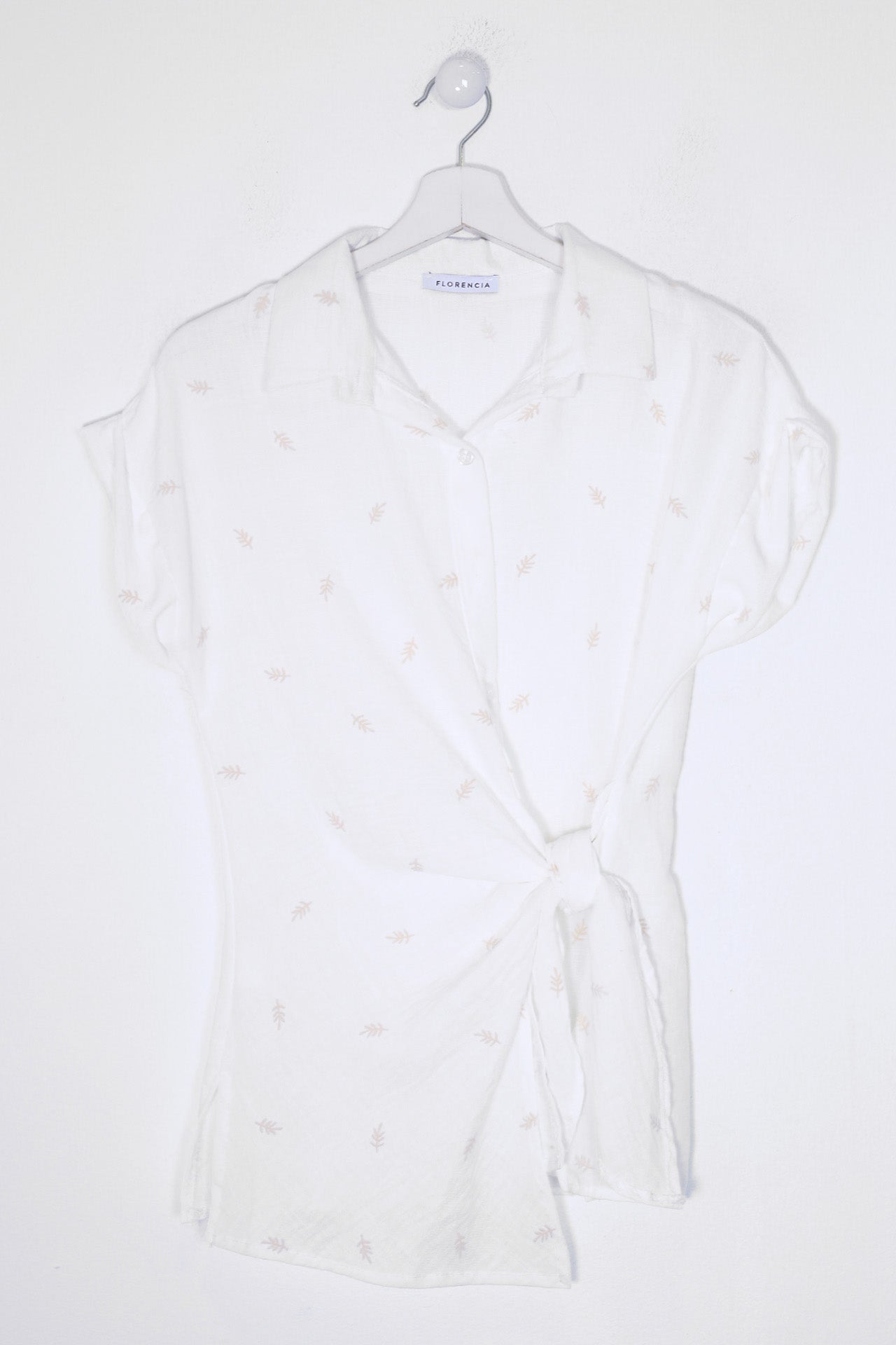 Camisa de cuello solapa y manga corta acabada en vuelta. Cierre frontal con botones hasta el pecho. Bajo con detalle de nudo en frontal. Aberturas laterales en bajo. Detalle de bordados de espigas a contraste.