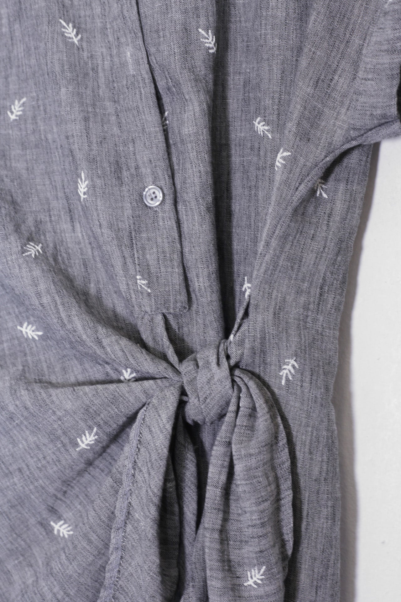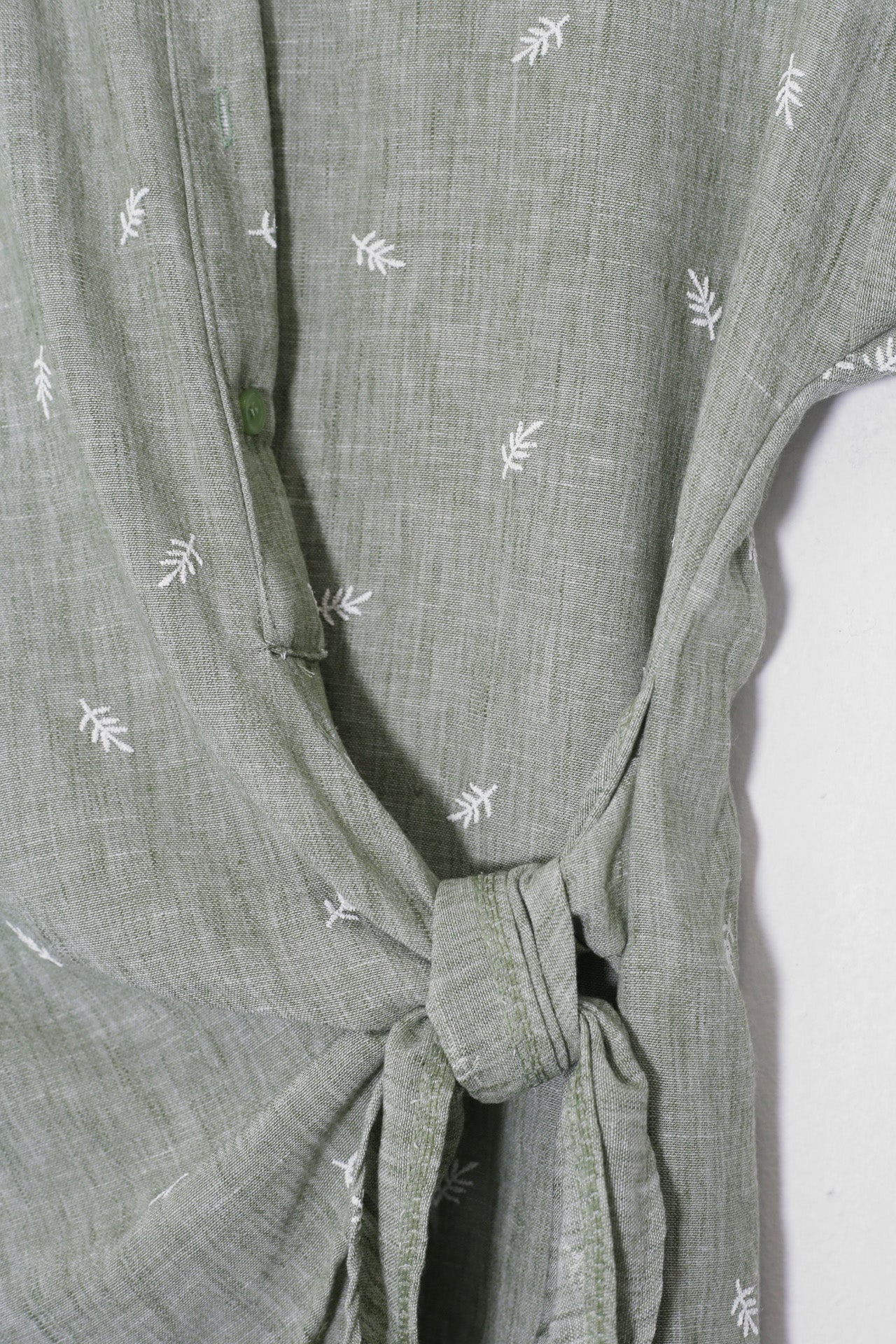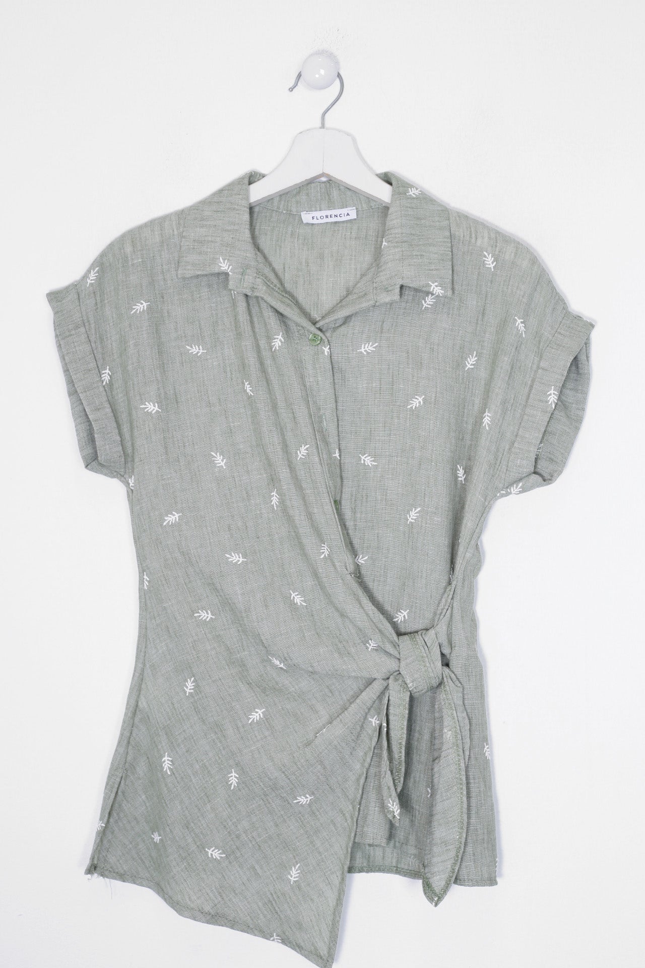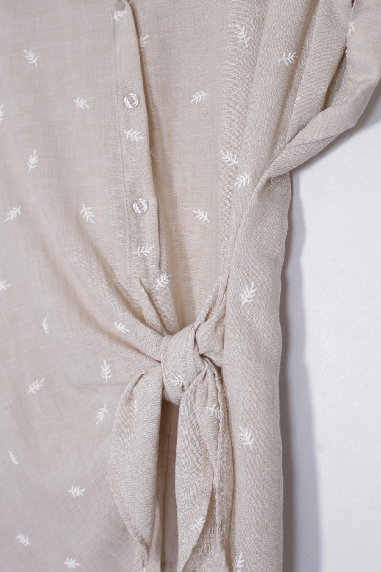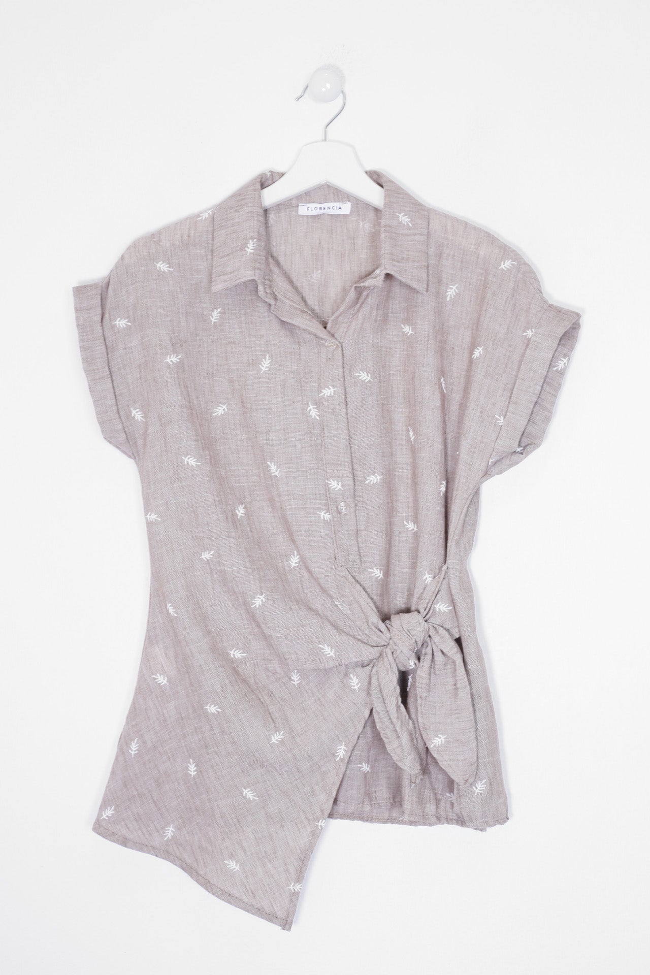 Camisa de cuello solapa y manga corta acabada en vuelta. Cierre frontal con botones hasta el pecho. Bajo con detalle de nudo en frontal. Aberturas laterales en bajo. Detalle de bordados de espigas a contraste.