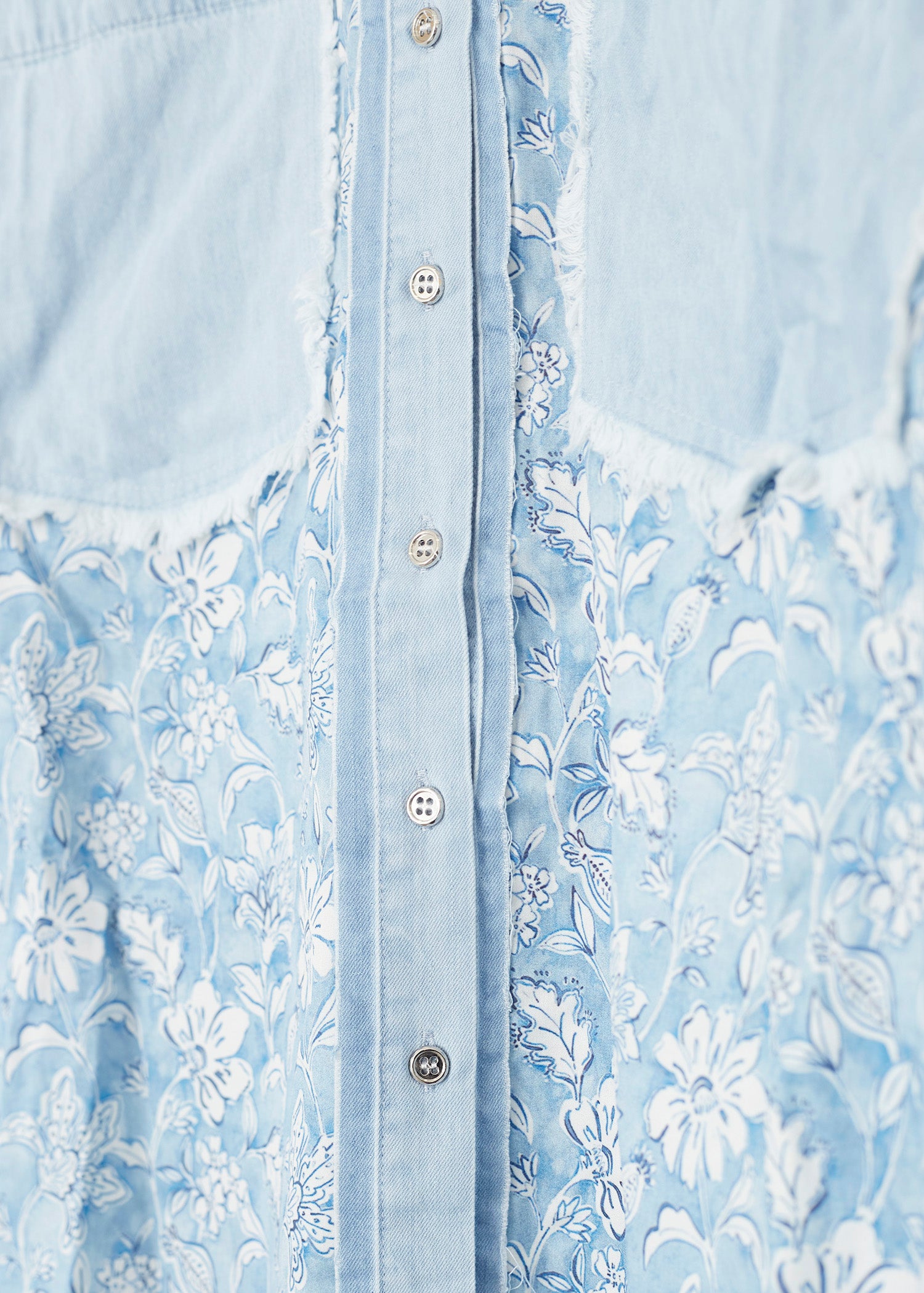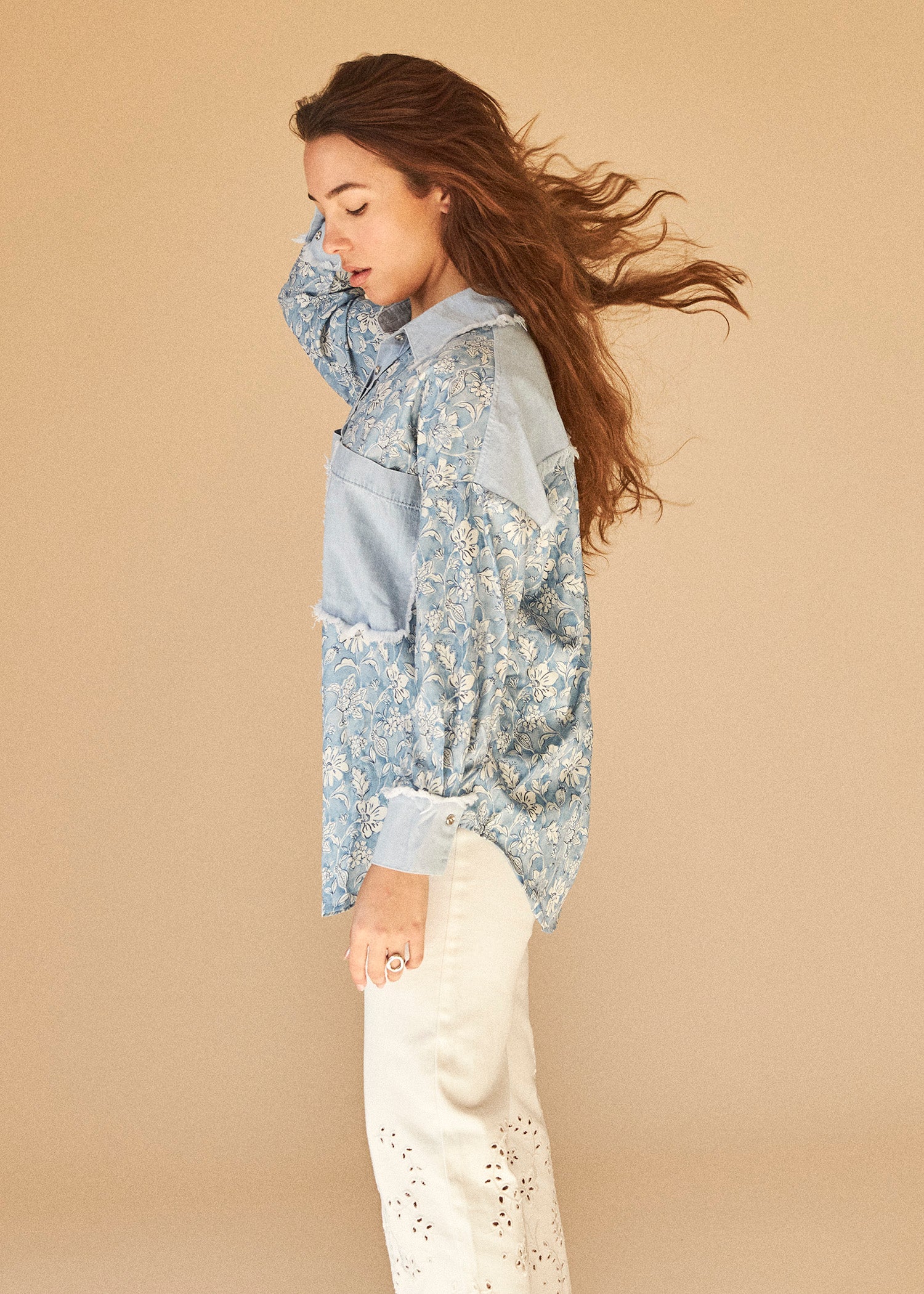 Camisa de cuello solapa y manga larga acabada en puño con botones. Cierre frontal en denim con botones metalizados. Cuello, bolsillos de plastrón delanteros, puños y detalle de espalda en denim con detalles desflecados. Cuerpo y mangas con estampado floral. Bajos asimétricos.