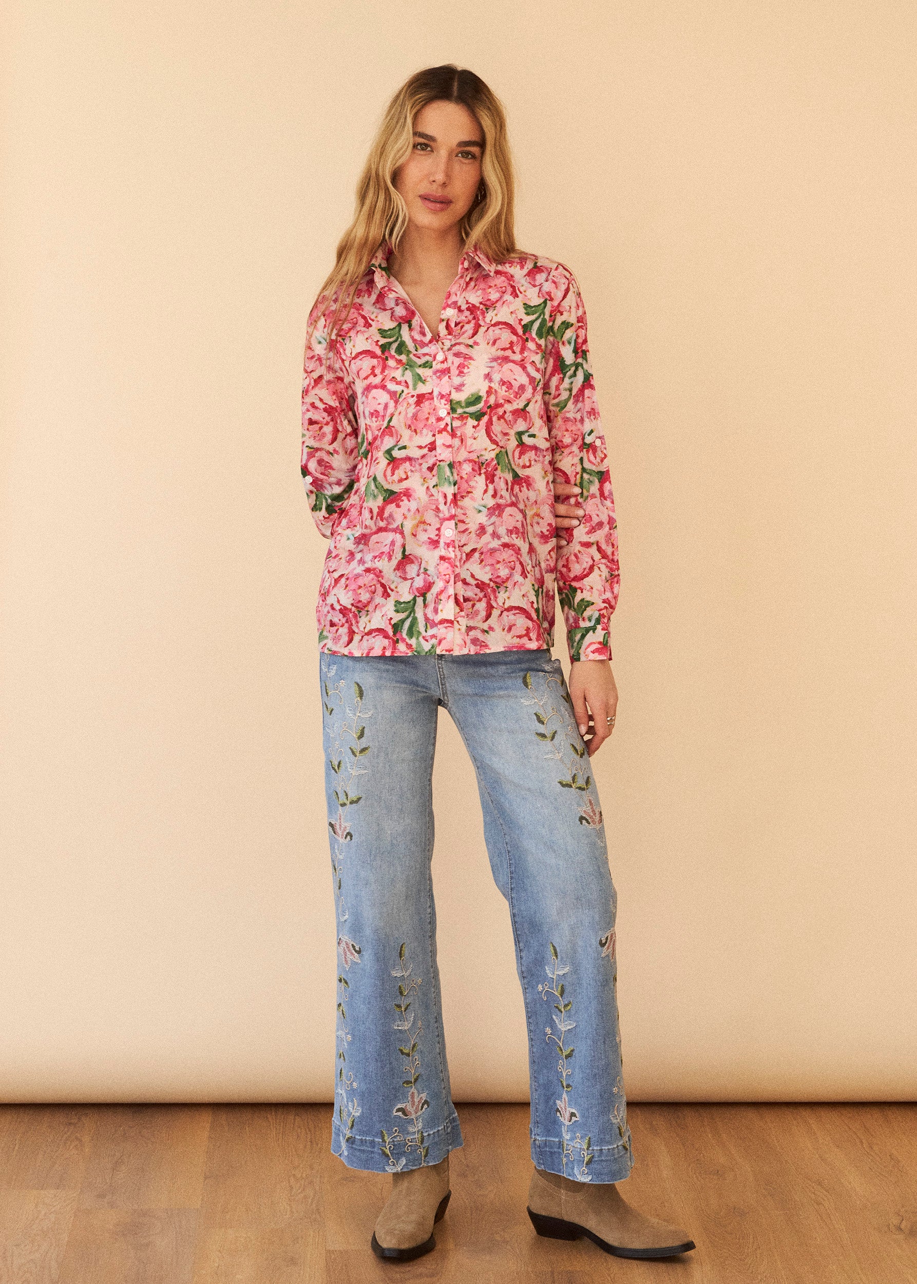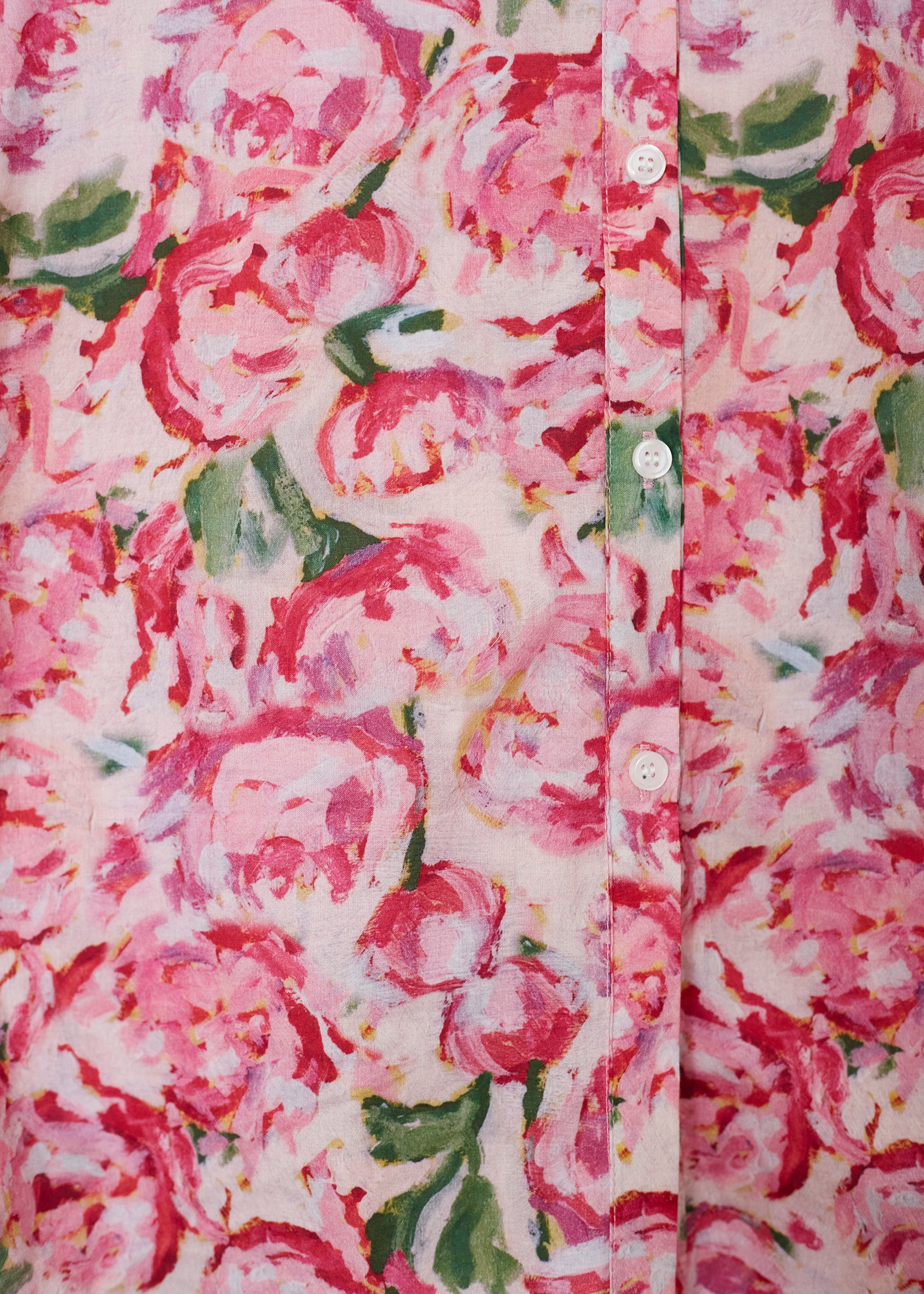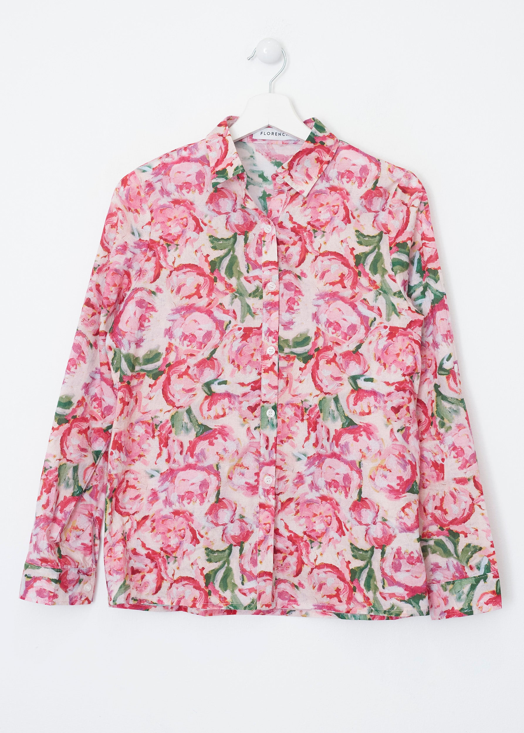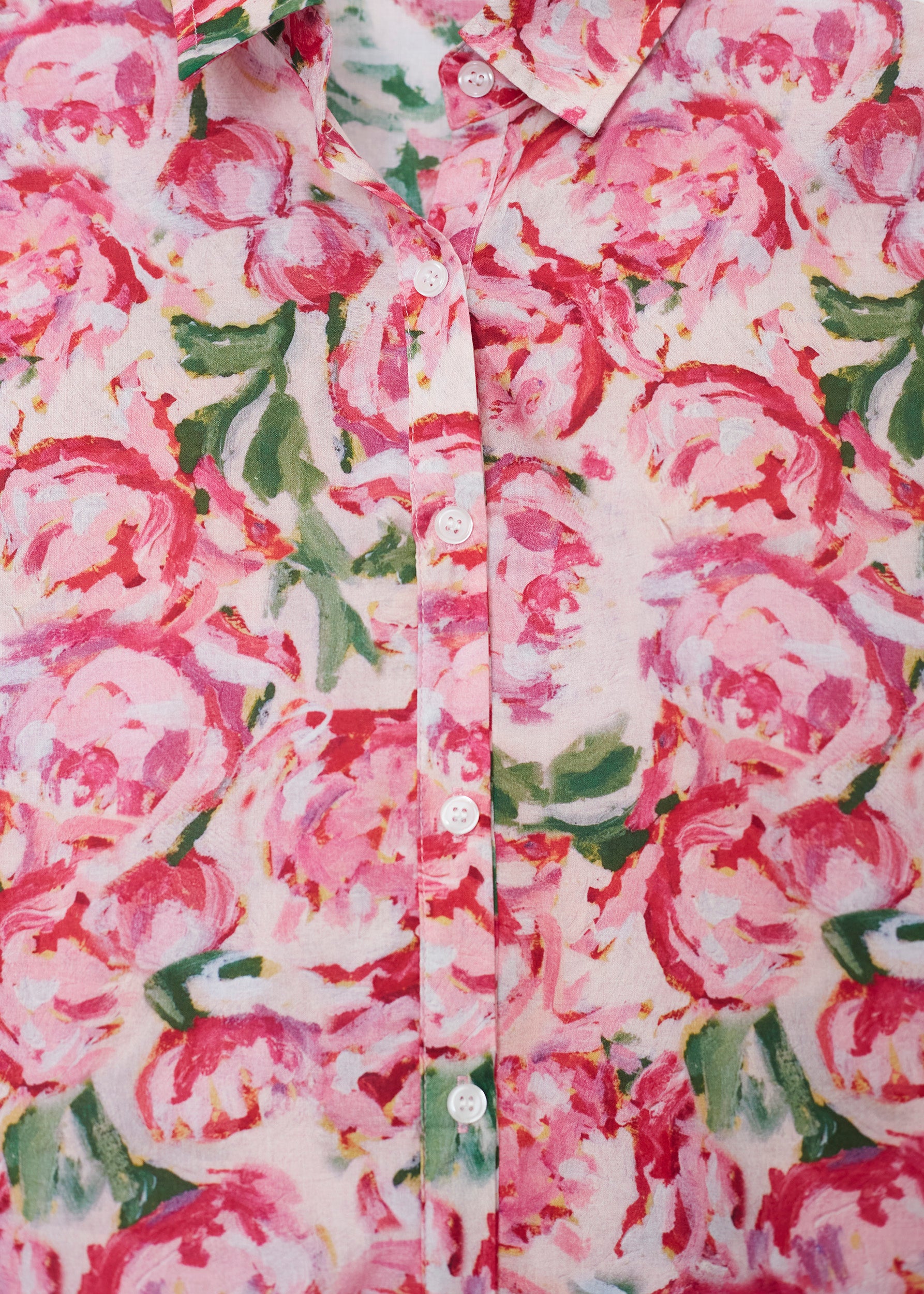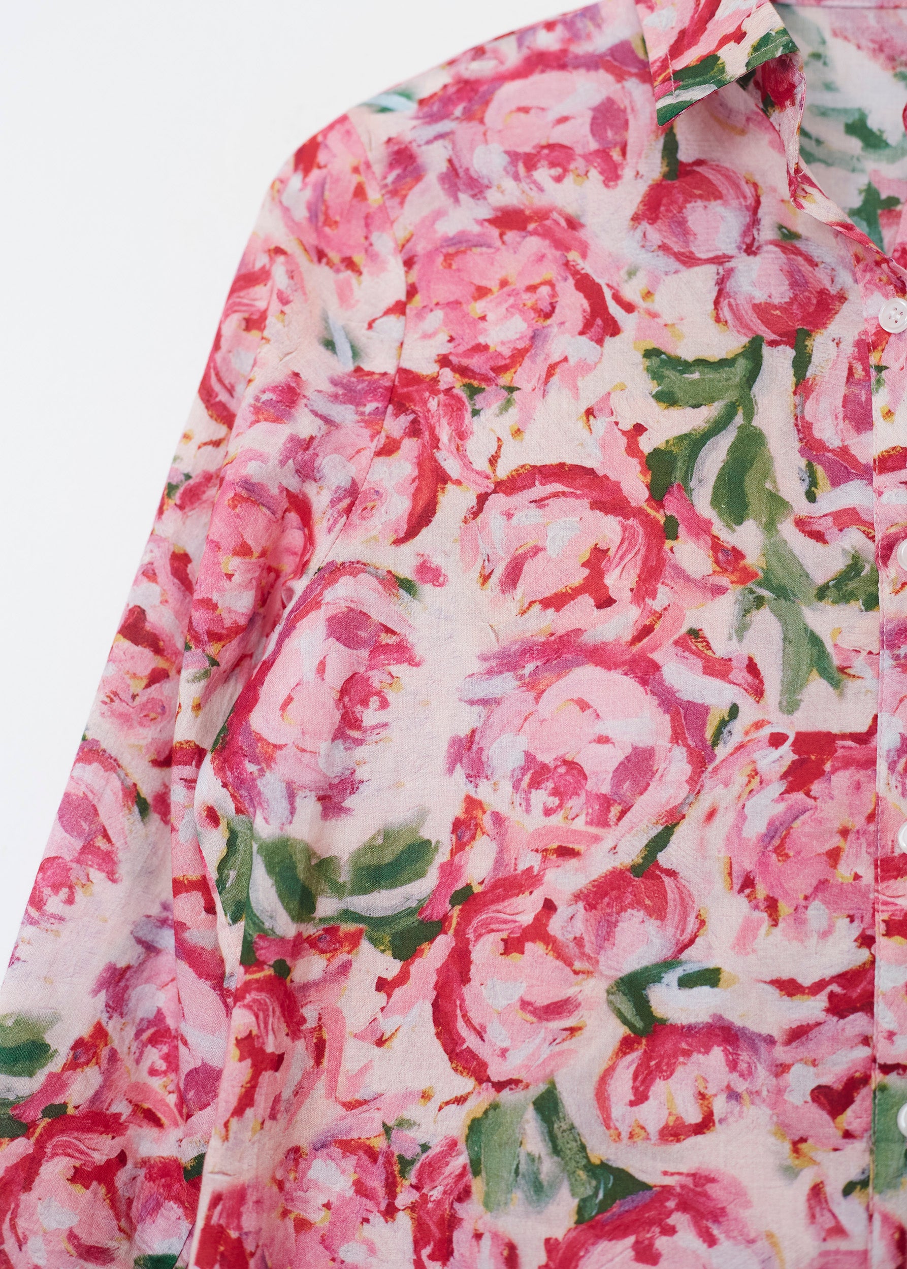 Camisa con cuello solapa y manga larga con detalle de vuelta con trabilla. Cierre frontal abotonado. Bajos asimétricos. Estampado floral.