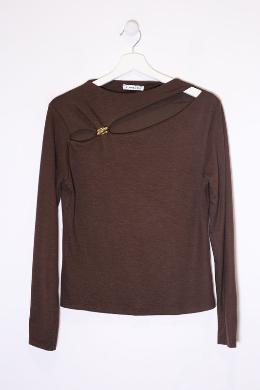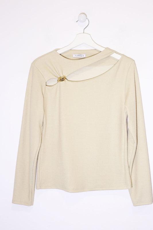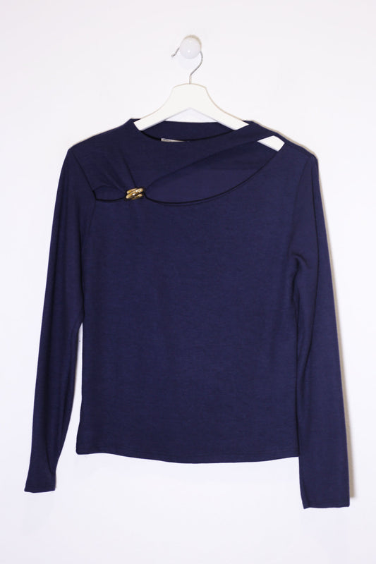 Camisa de punto con cuello solapa y manga larga acabada en puños abotonados. Cierre frontal abotonado. Corte recto. Bajo asimétrico.