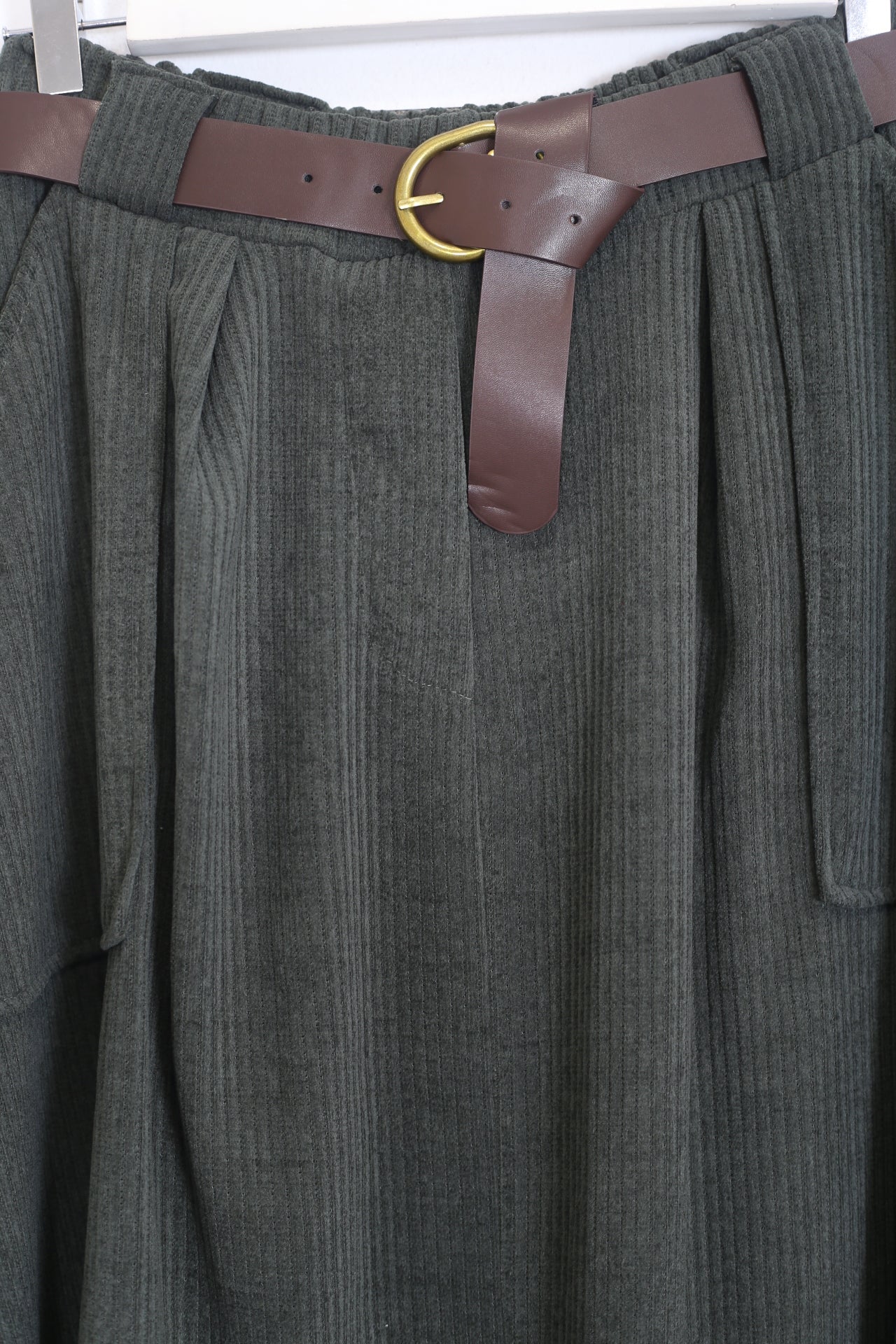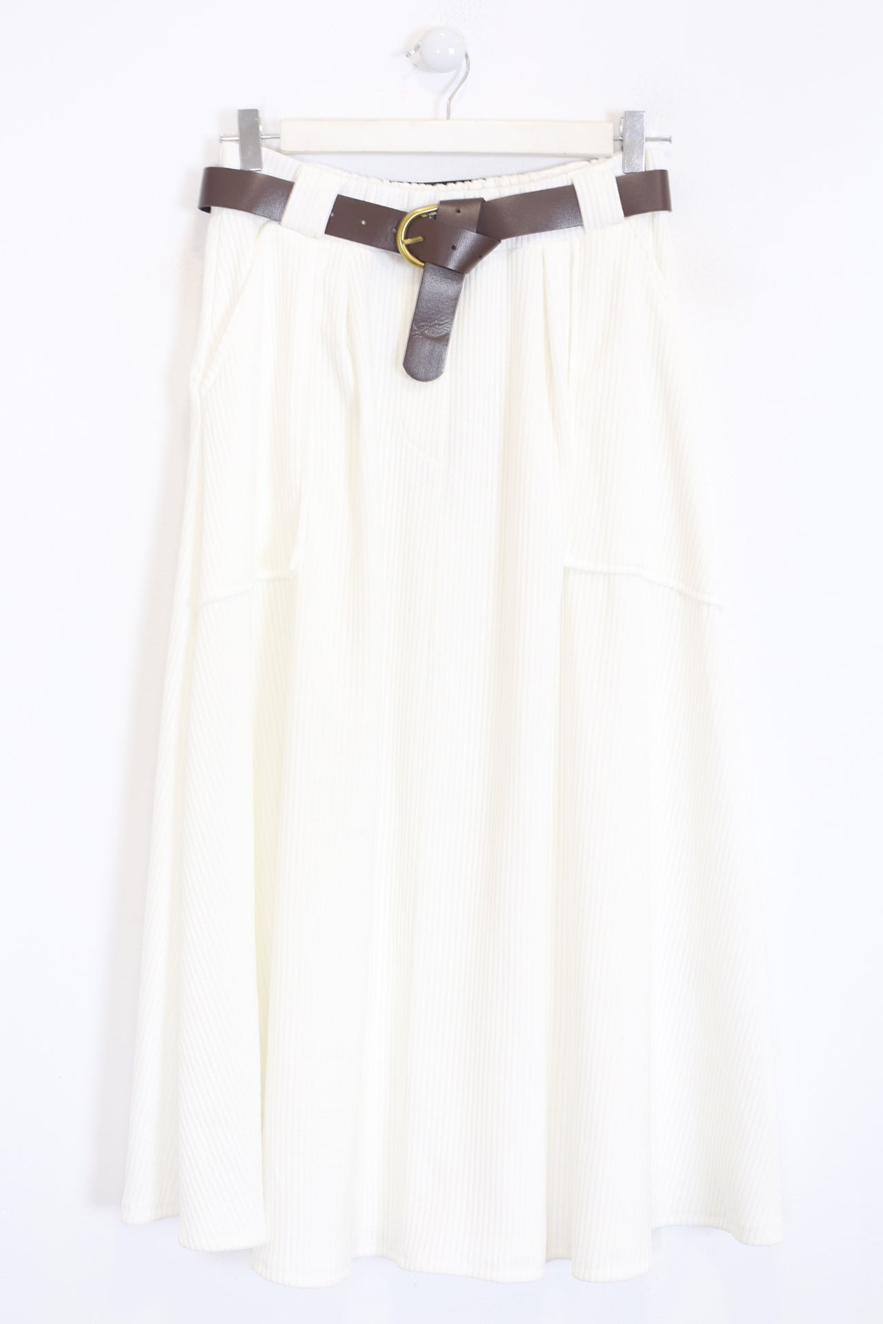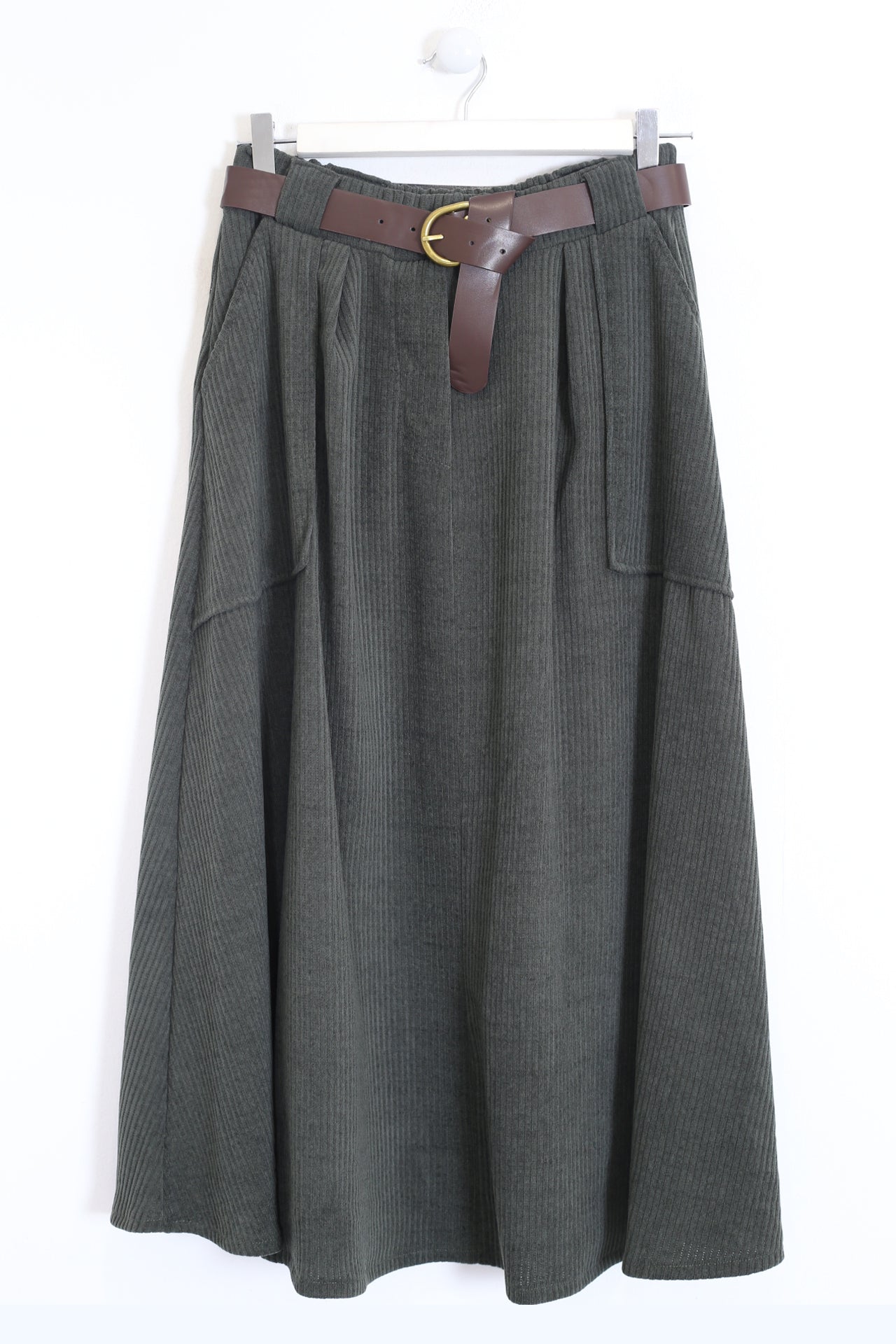 Falda larga de pana. Cintura elástica con detalle de trabillas y cinturón. Bolsillos frontales de plastrón.