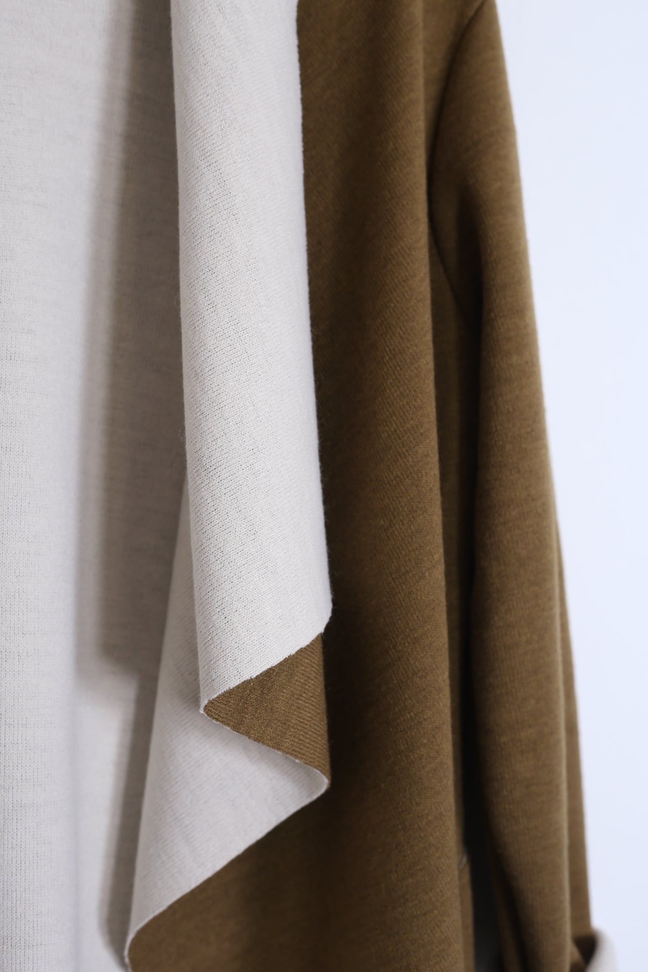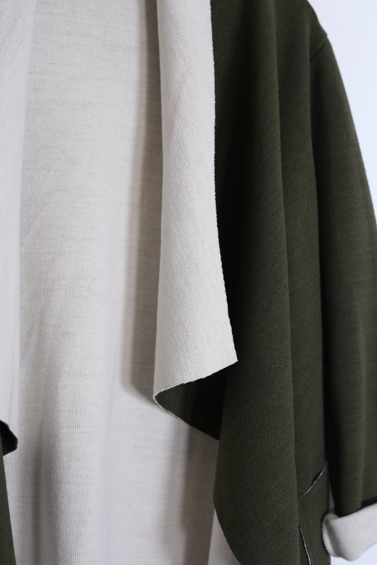 Chaqueta asimétrica de punto. Escote recto con vuelta. Tejido de punto bitono. Bajos asimétricos.