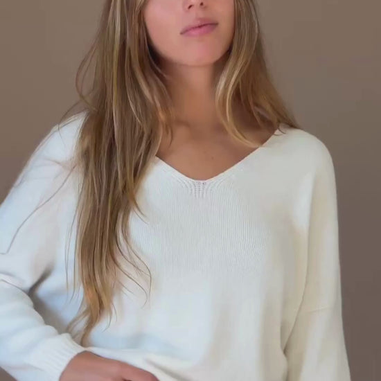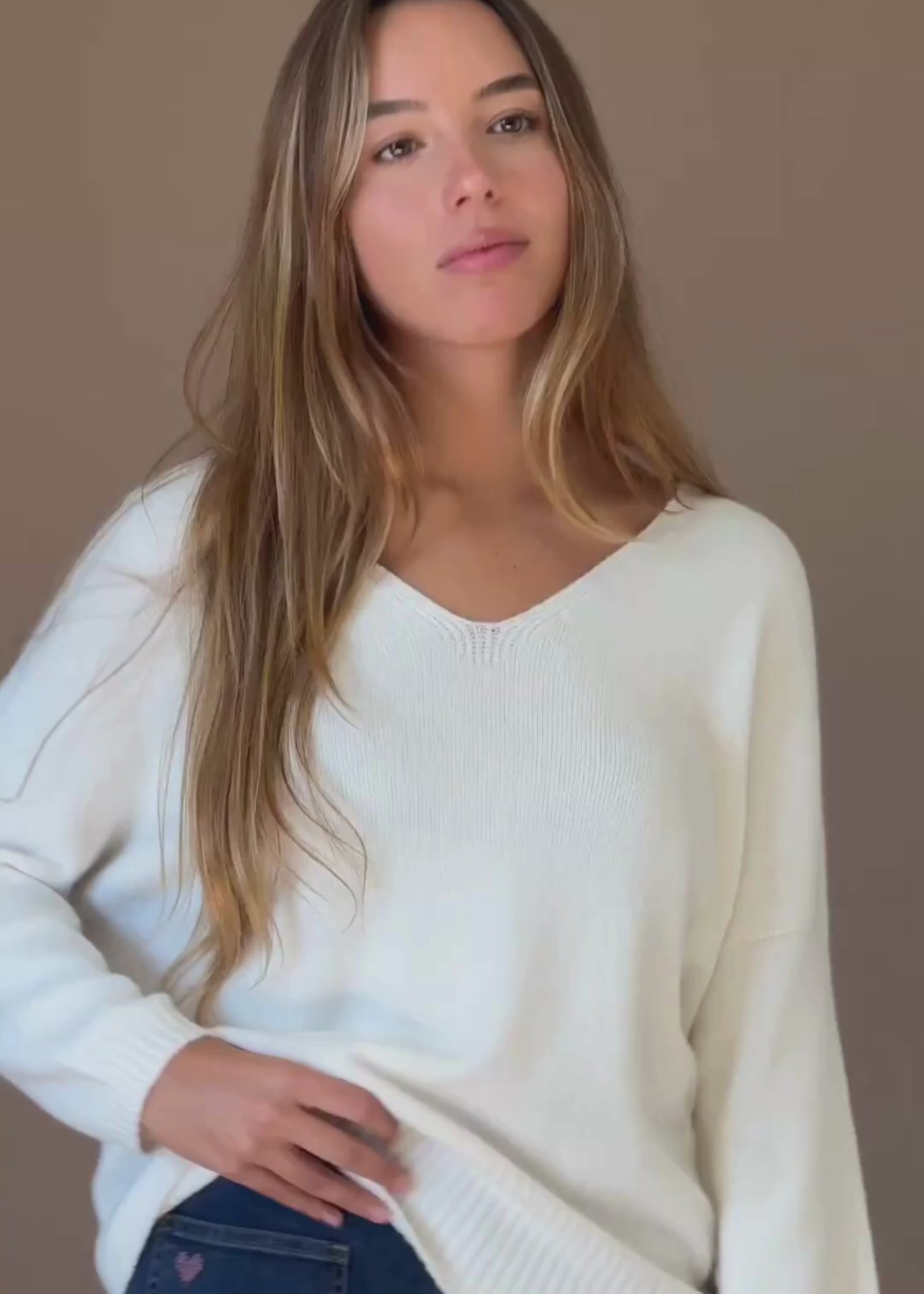 Jersey sin costuras con cuello punta y manga larga. Puños y bajos acabados en rib. Corte amplio.