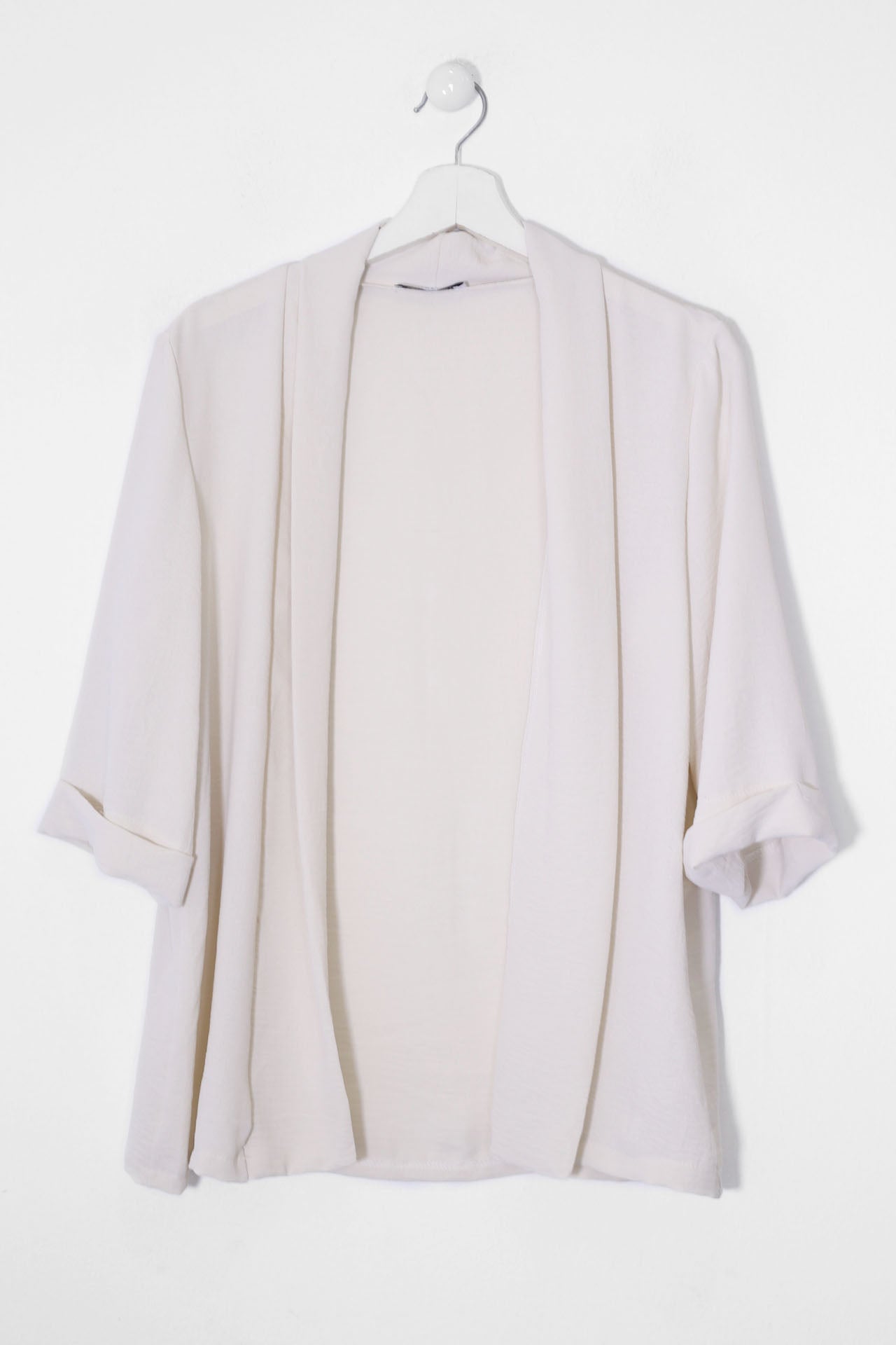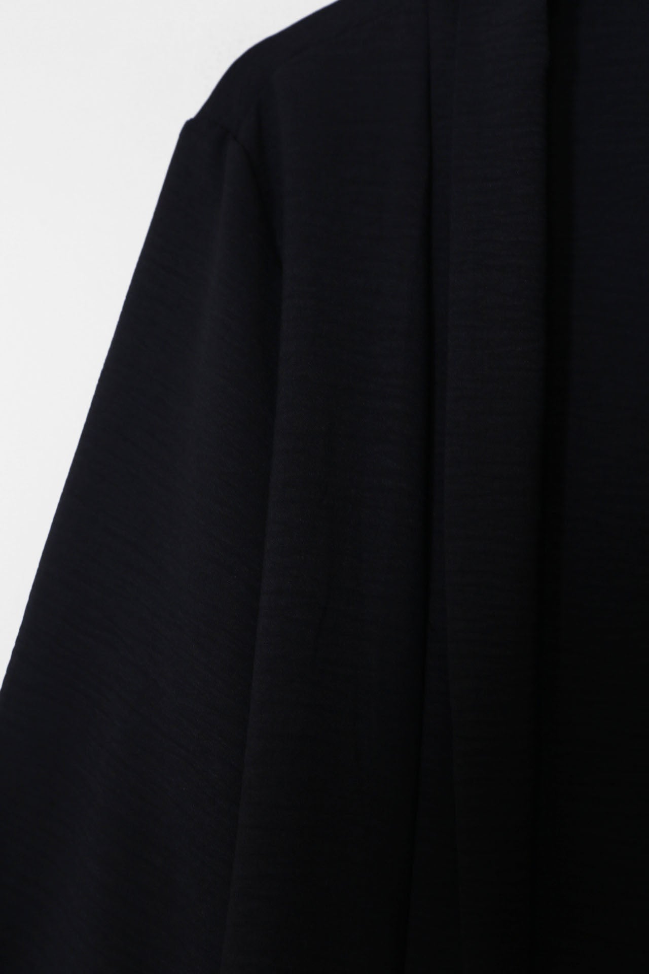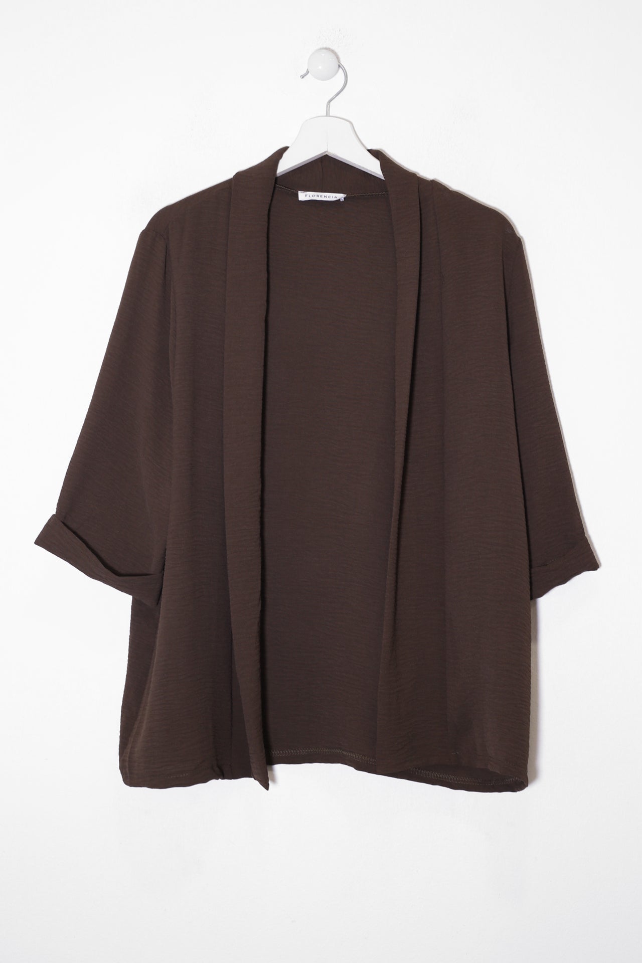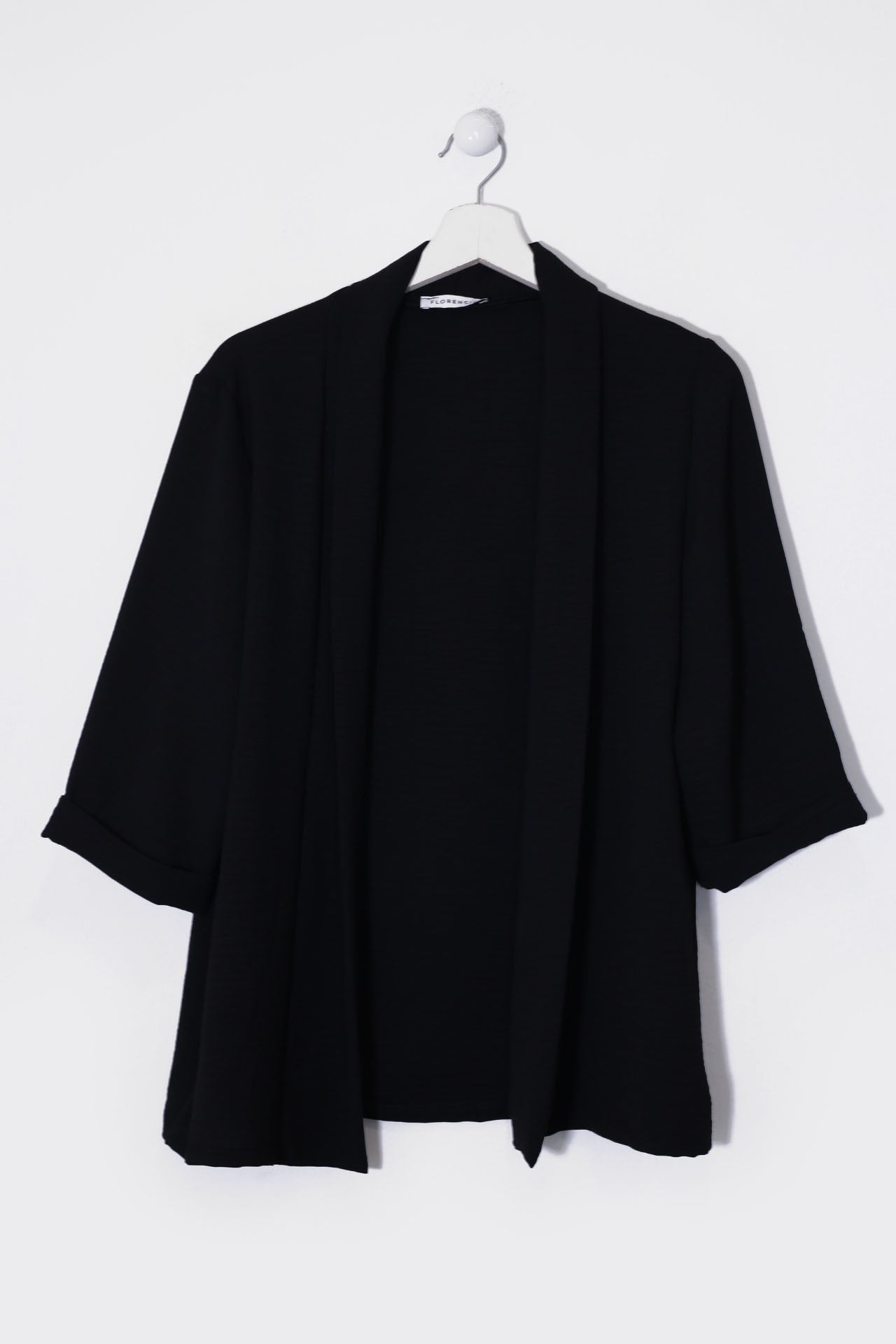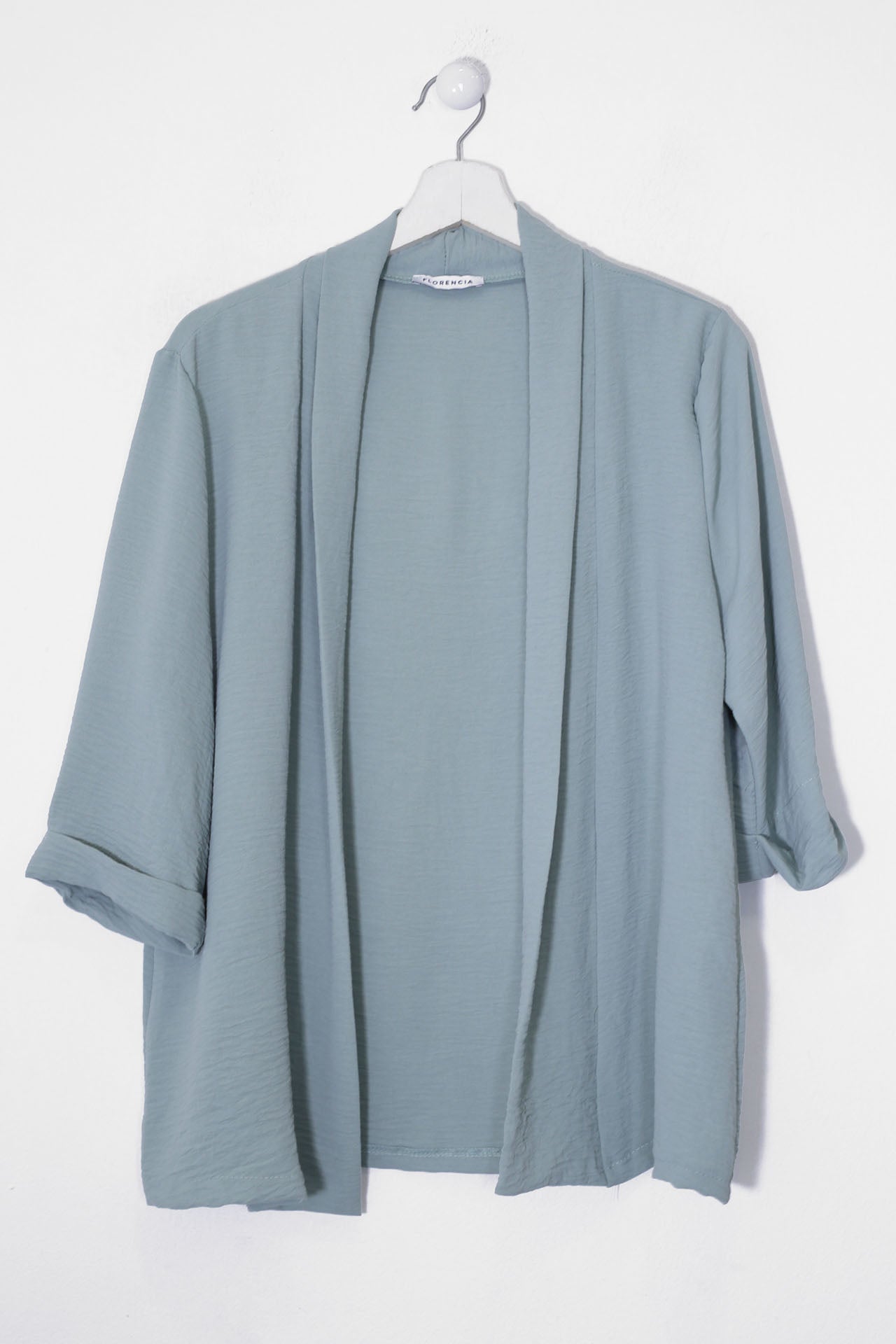 Kimono fluido de escote recto. Manga tres cuartos con puño acabado en vuelta. Tejido ligeramente elástico y texturado.