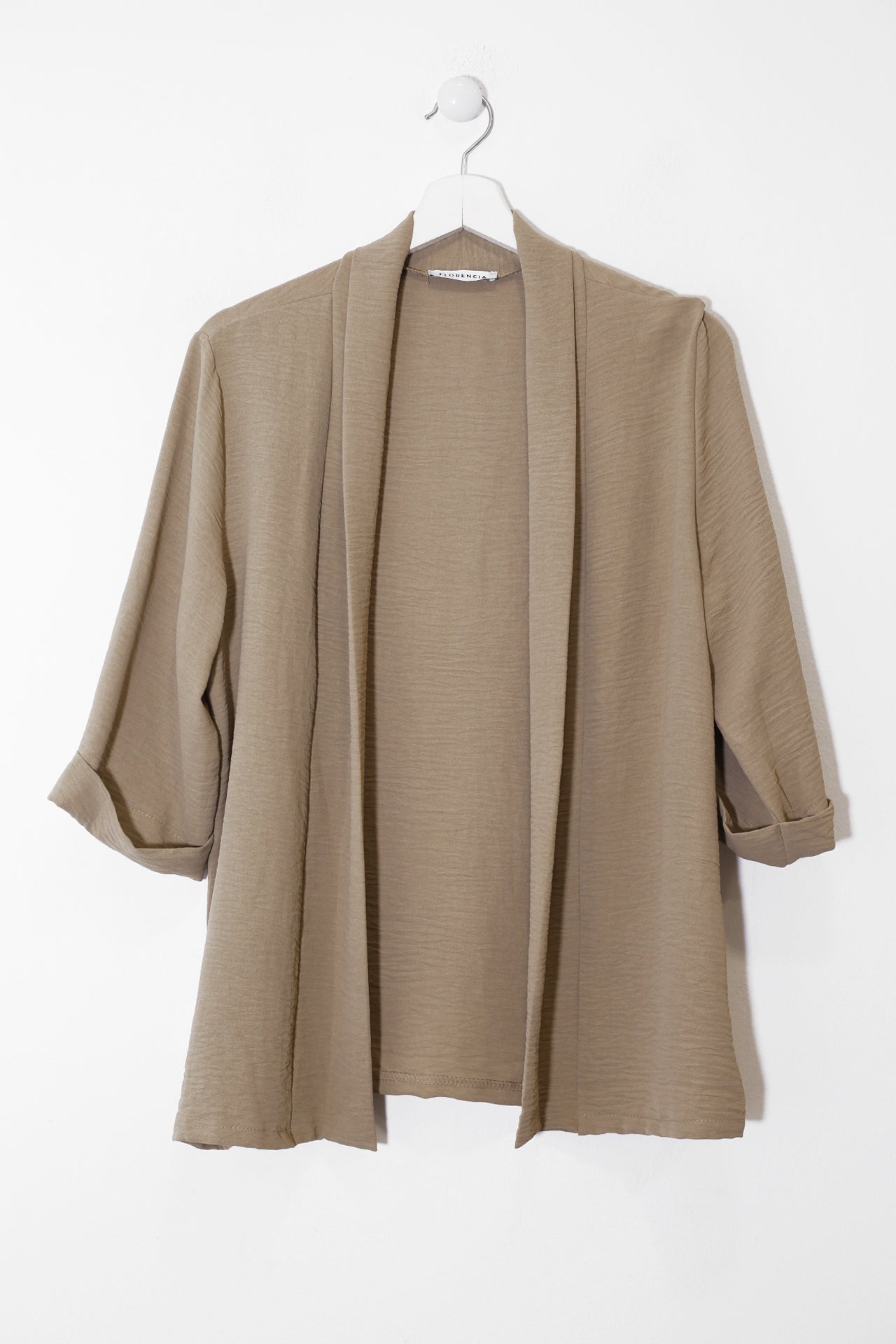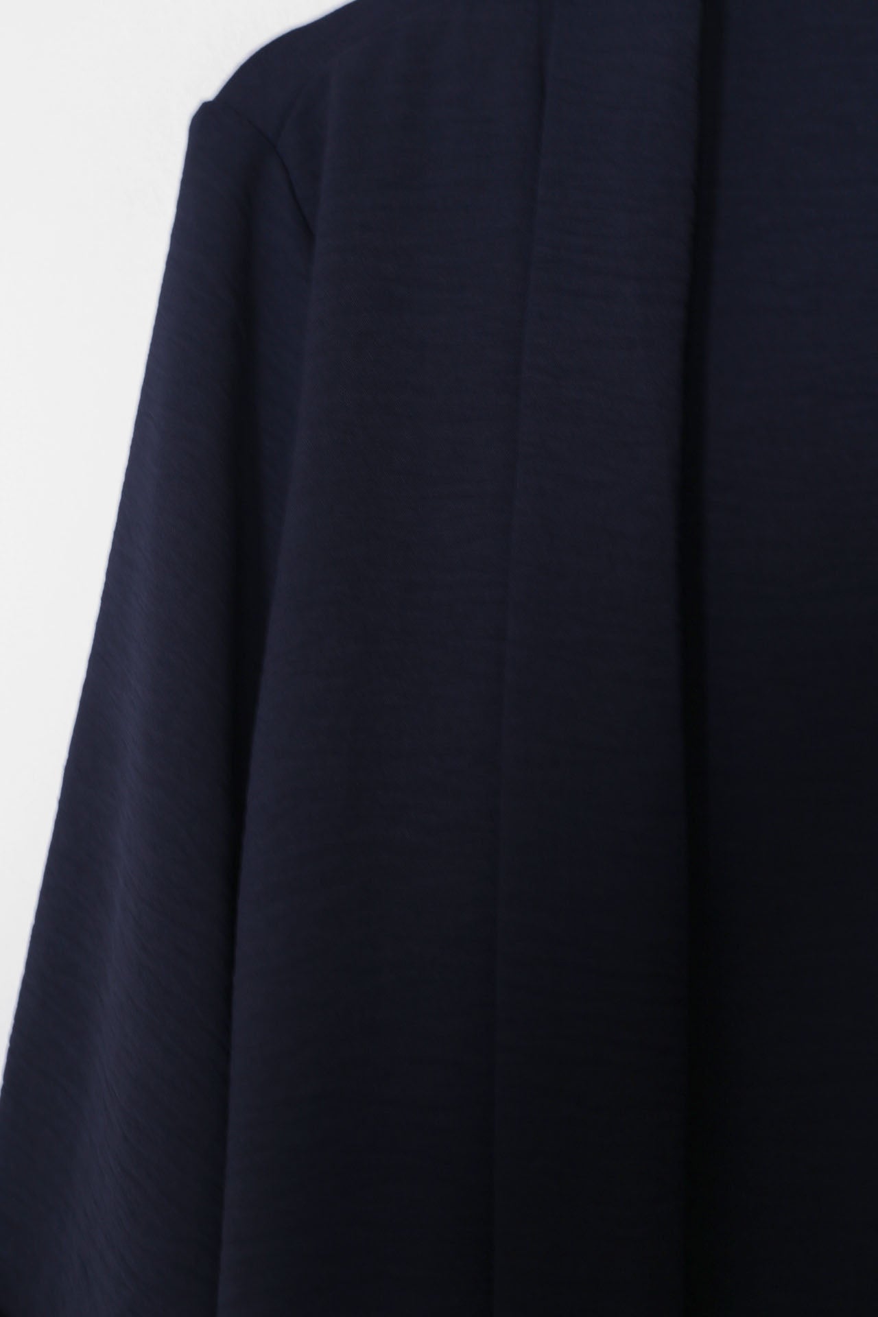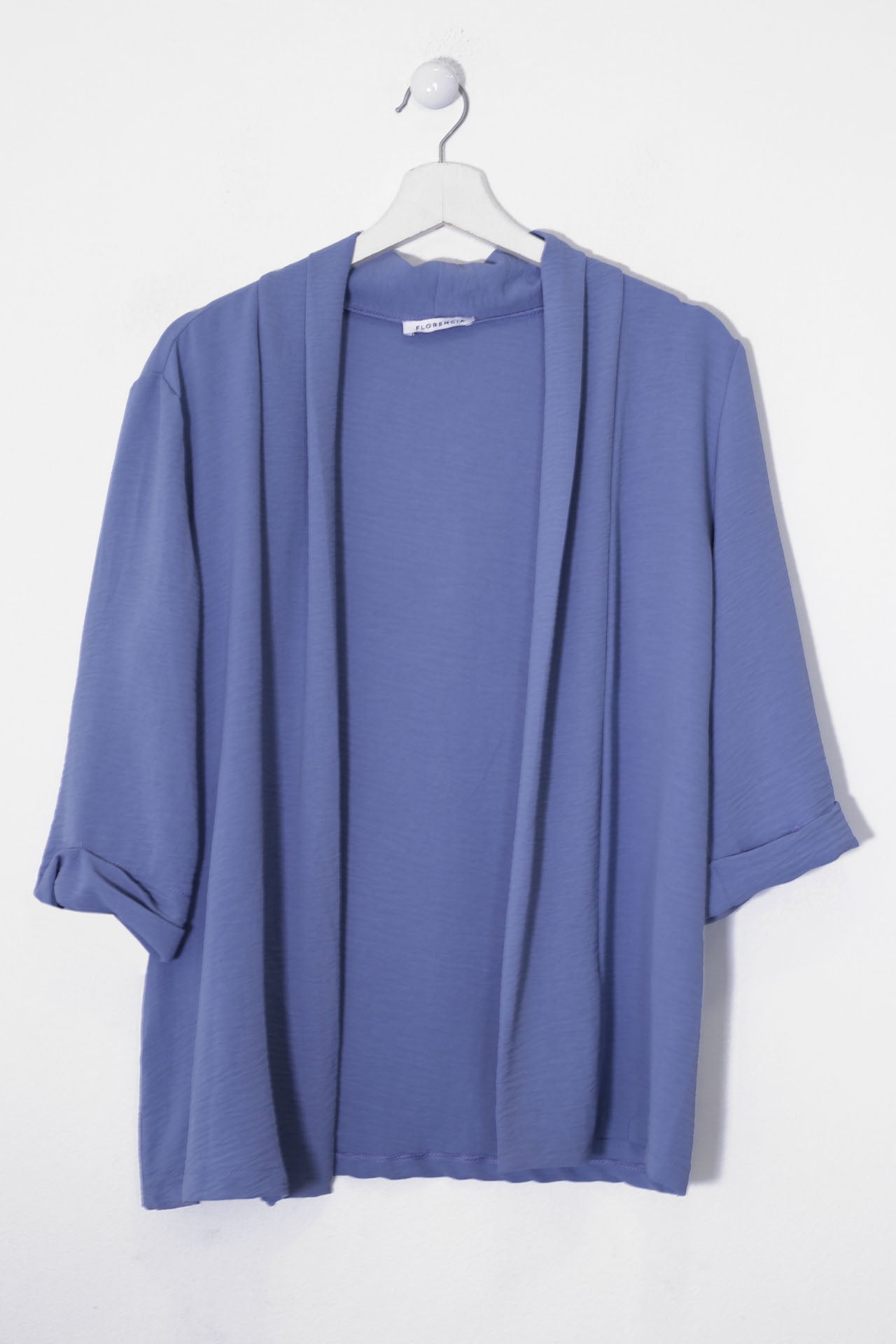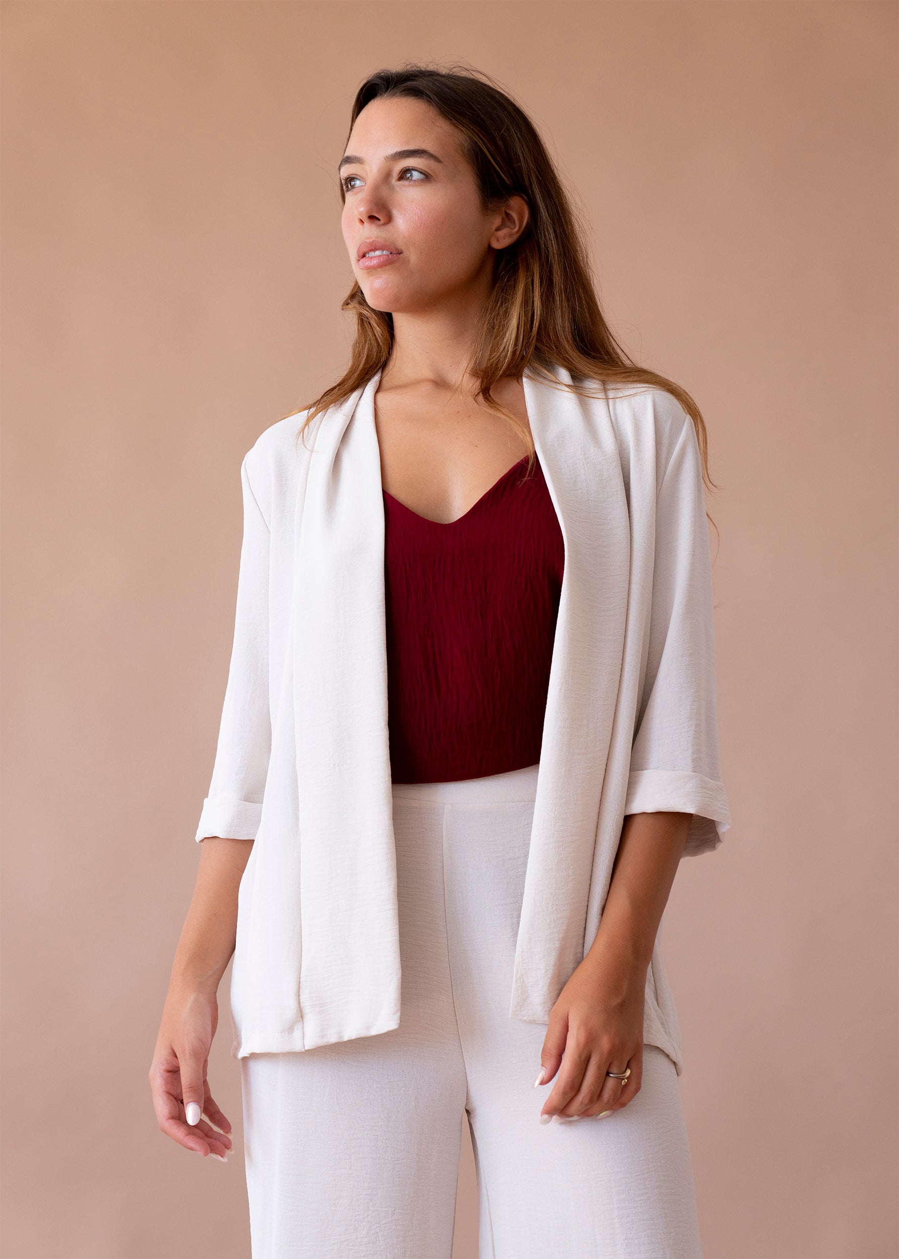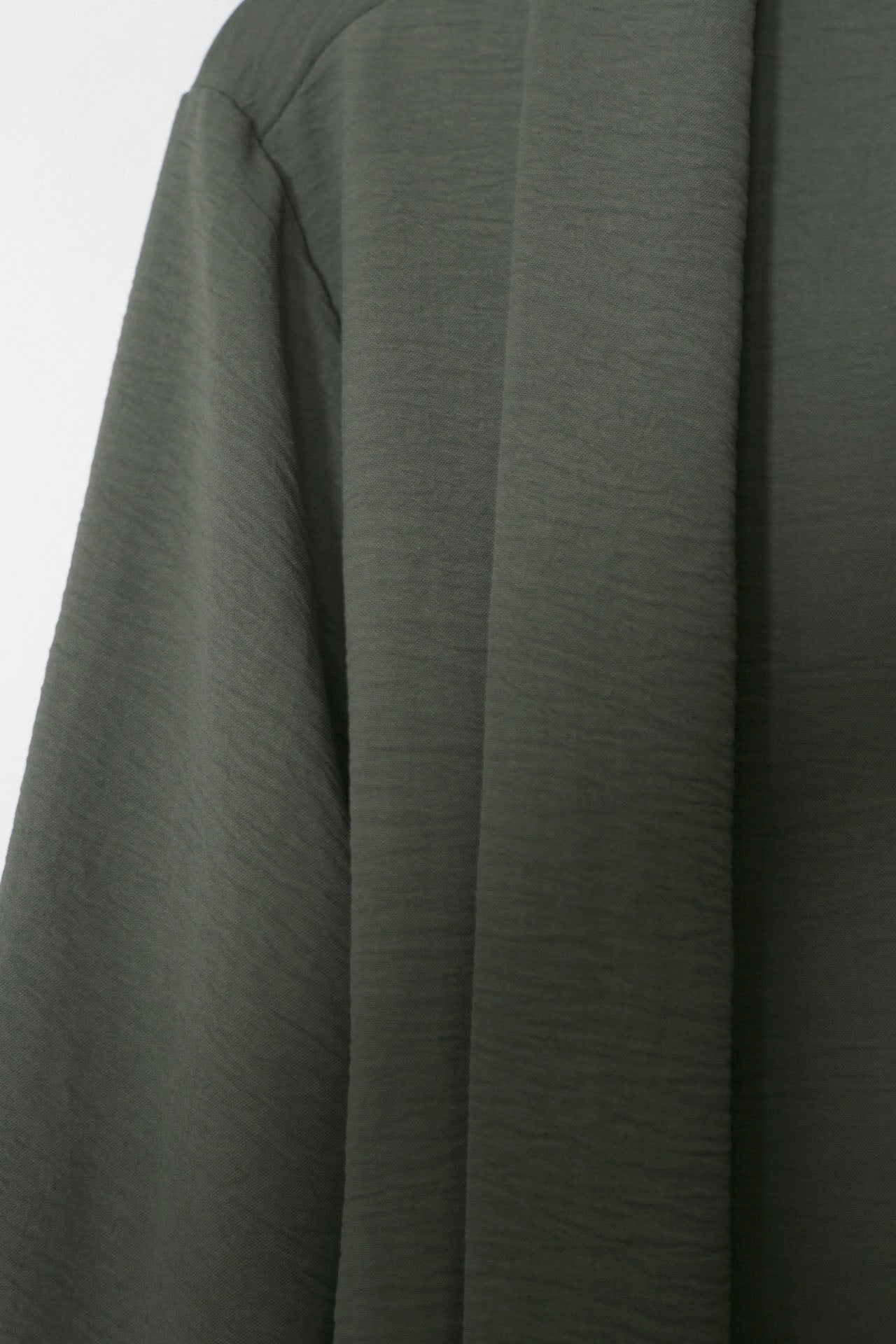 Kimono fluido de escote recto. Manga tres cuartos con puño acabado en vuelta. Tejido ligeramente elástico y texturado.