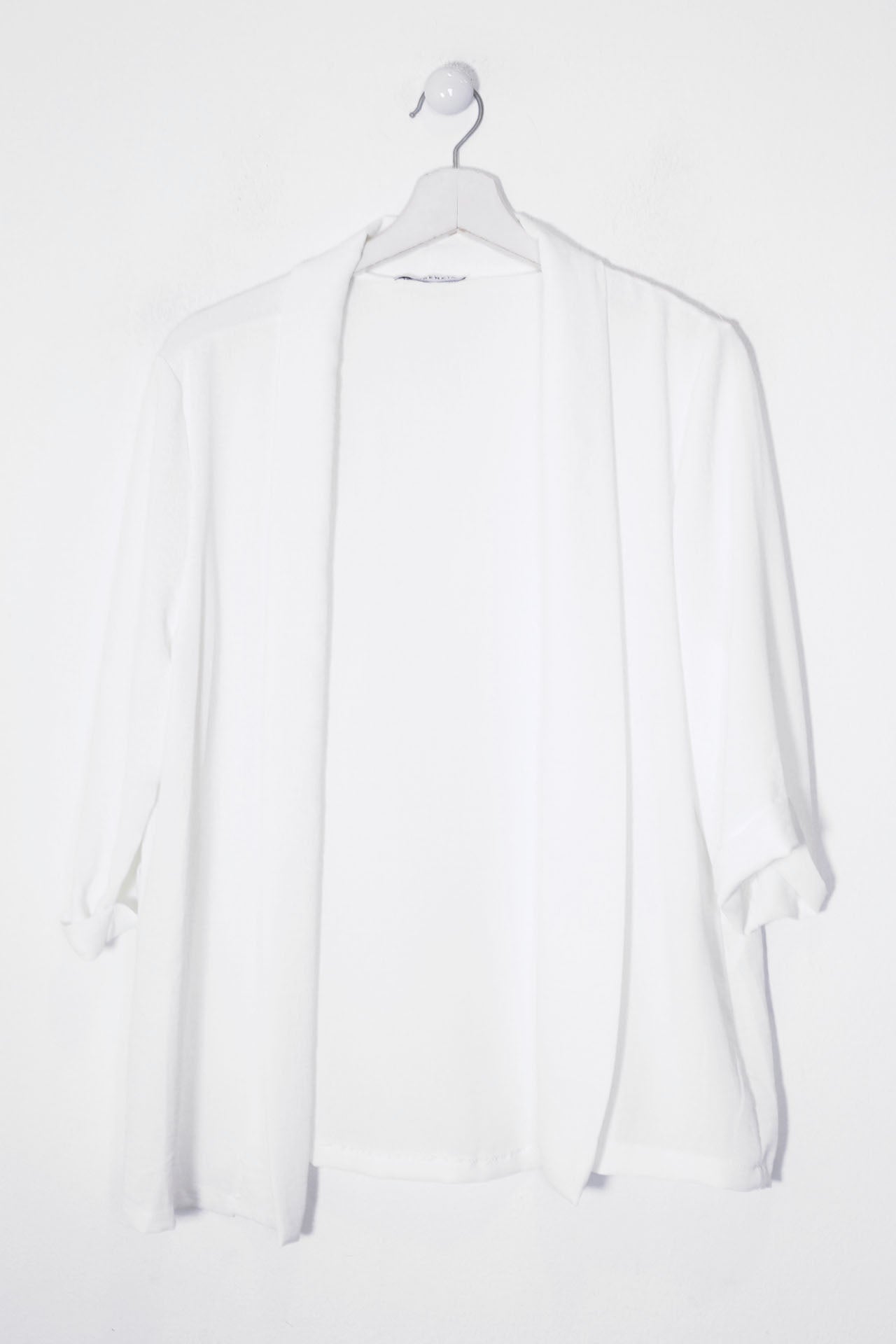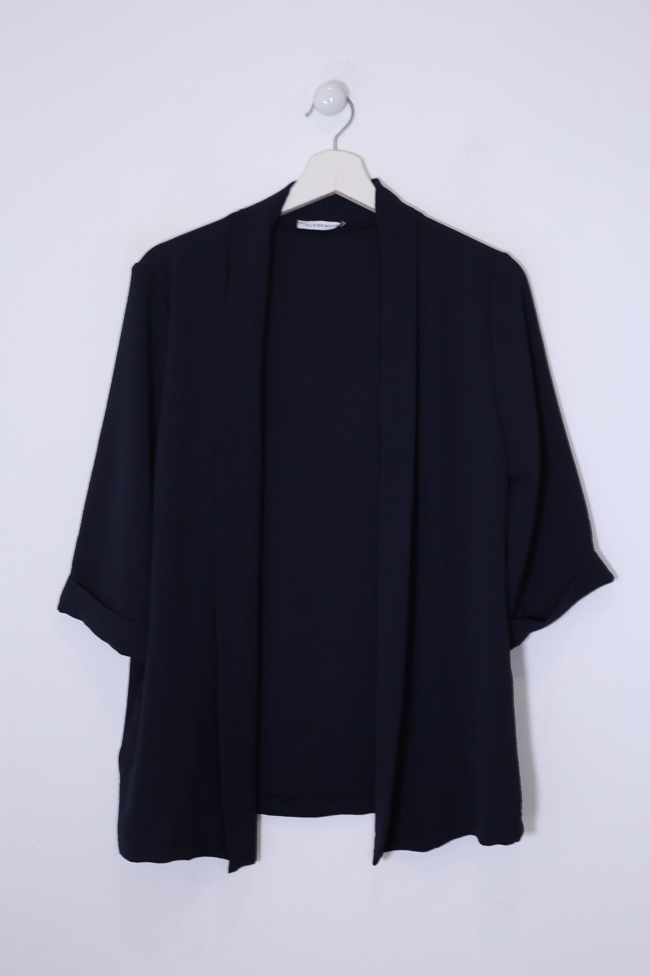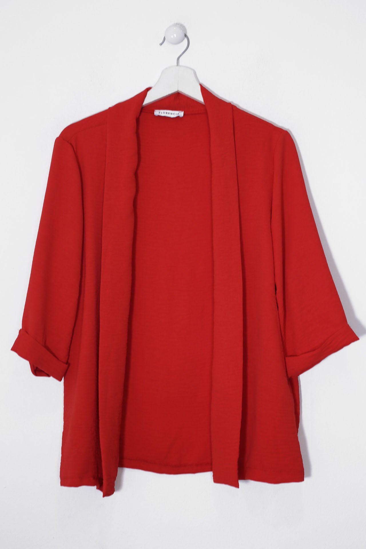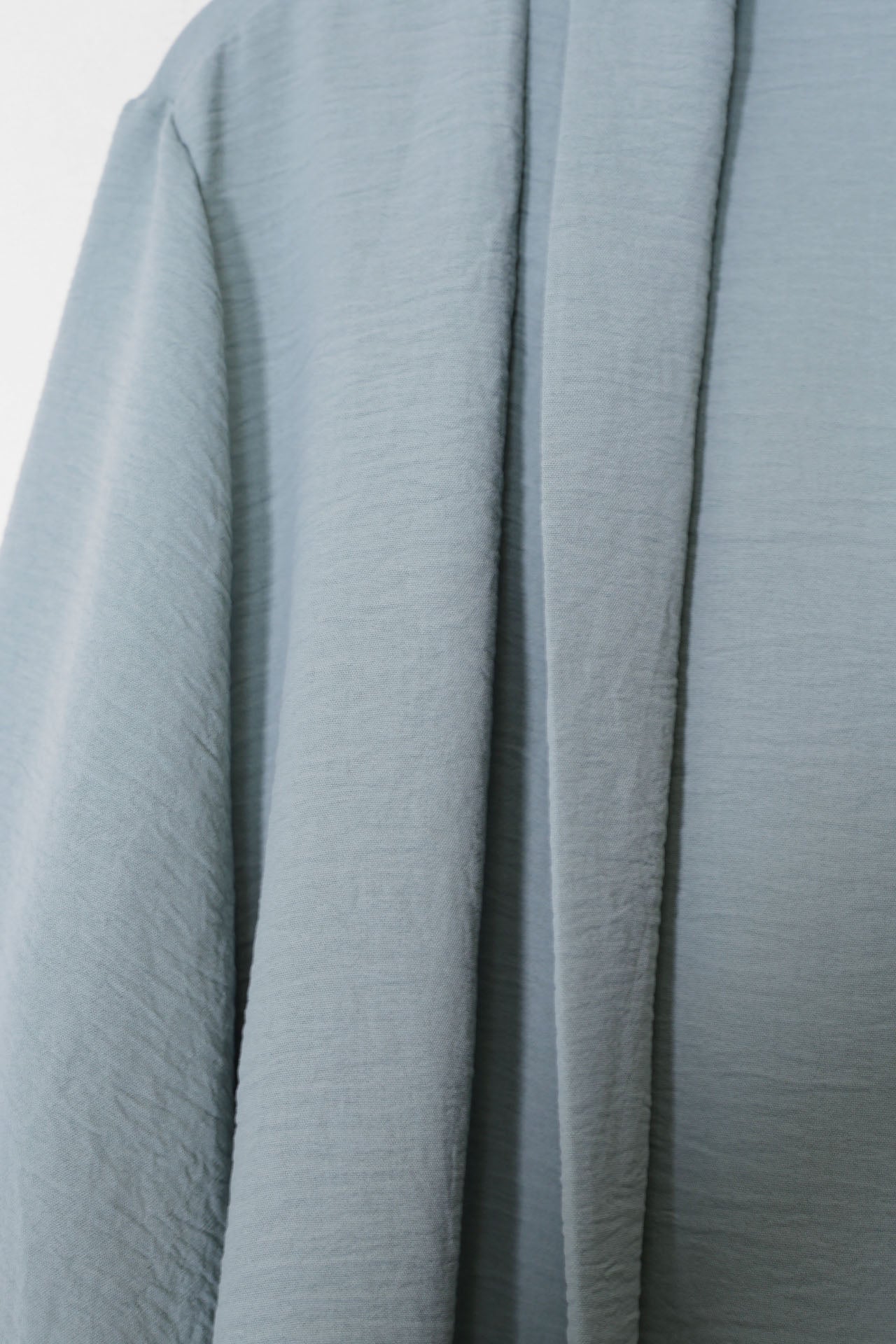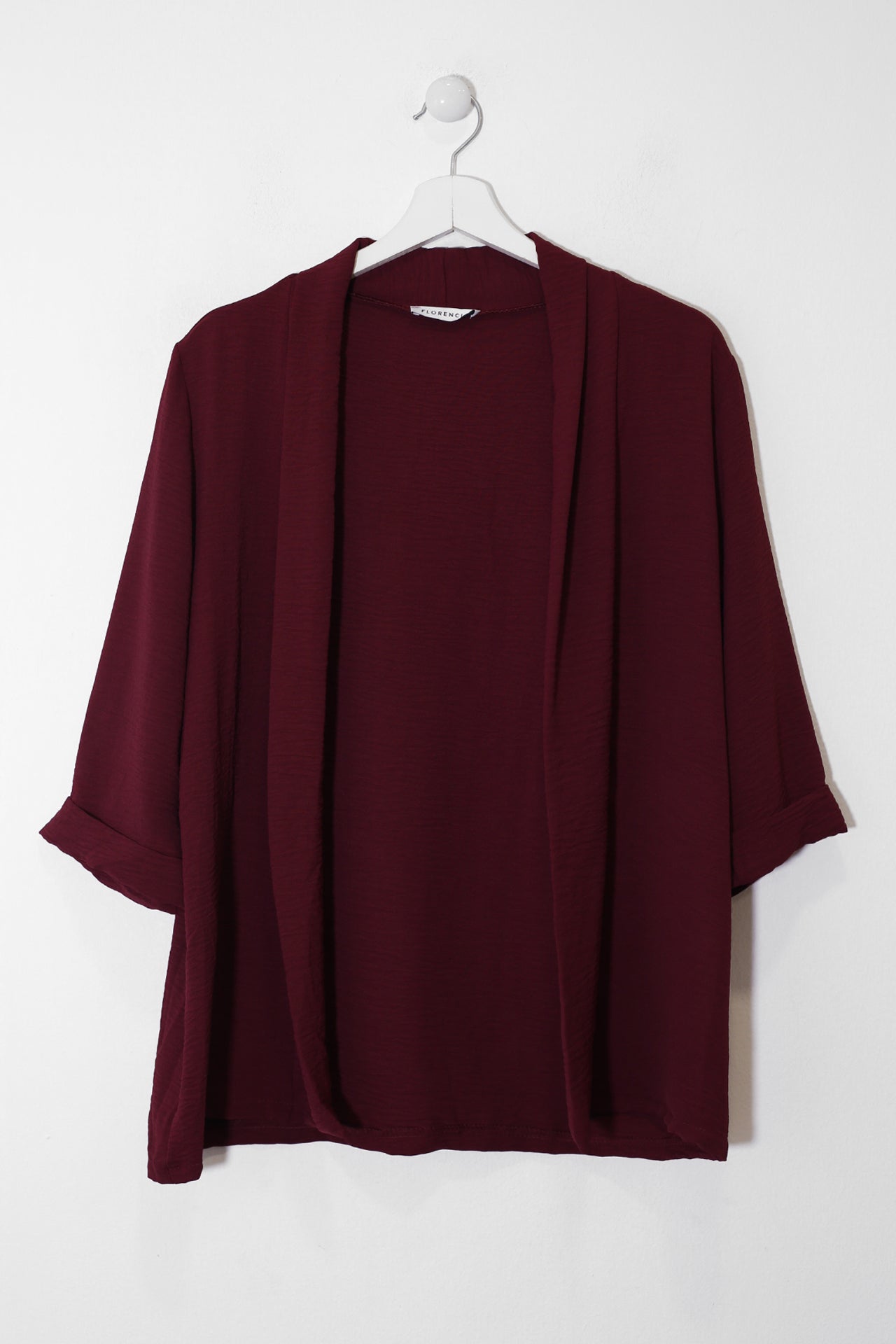 Kimono fluido de escote recto. Manga tres cuartos con puño acabado en vuelta. Tejido ligeramente elástico y texturado.