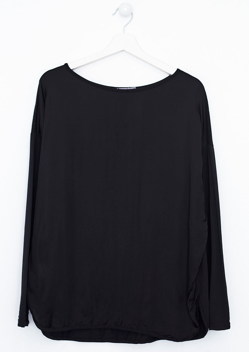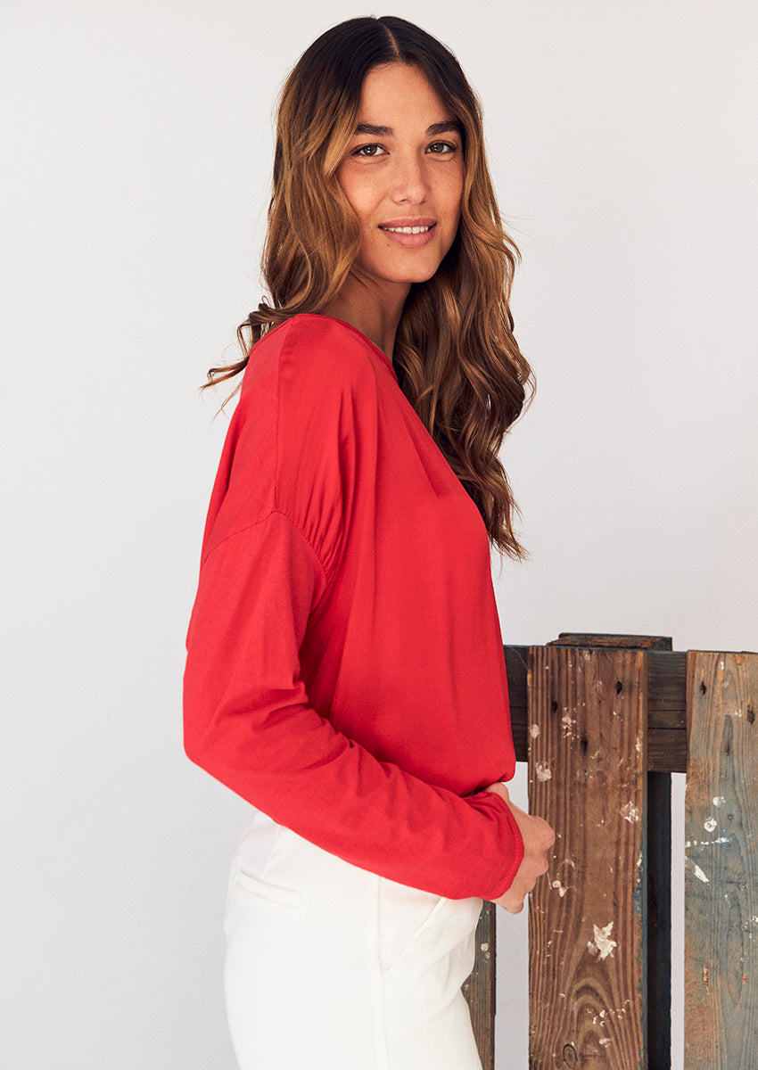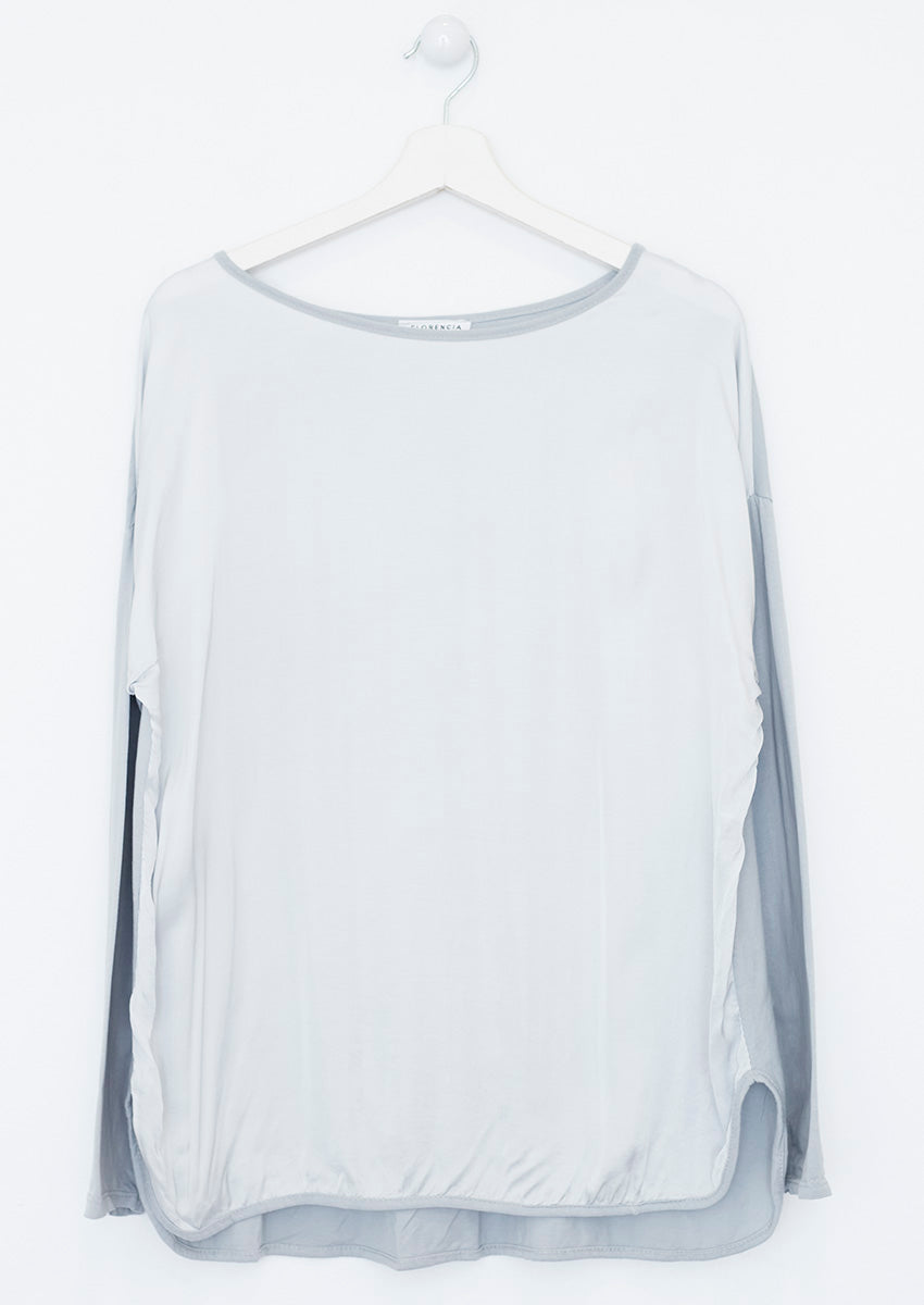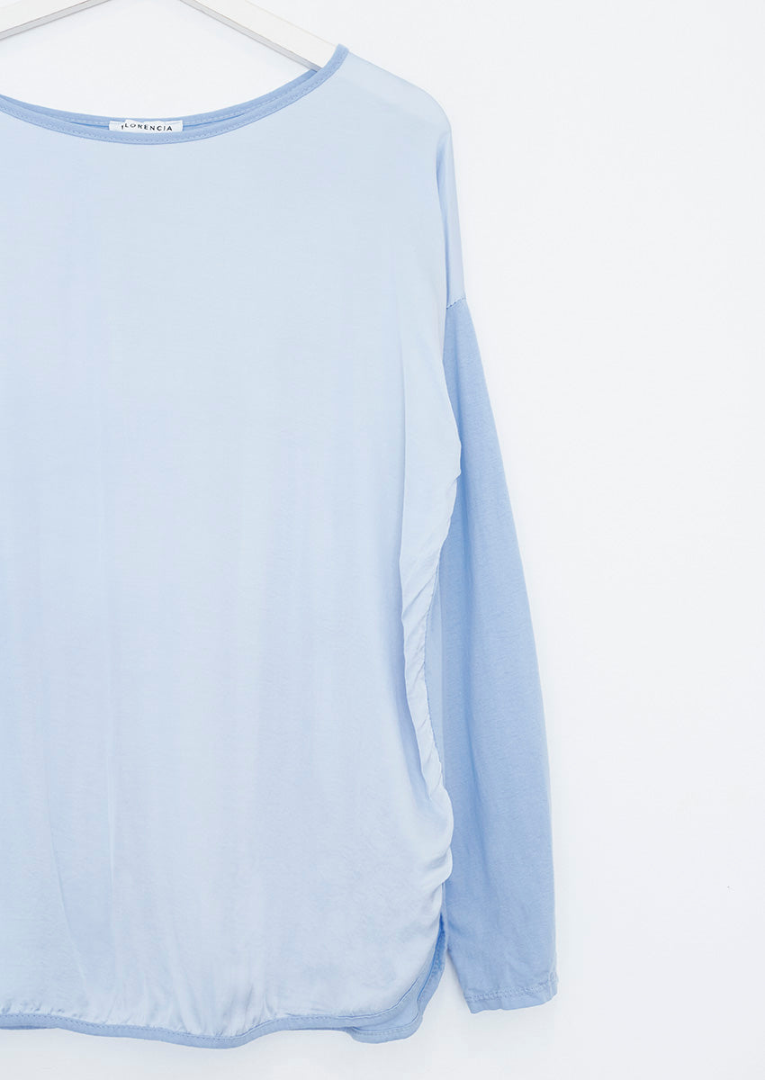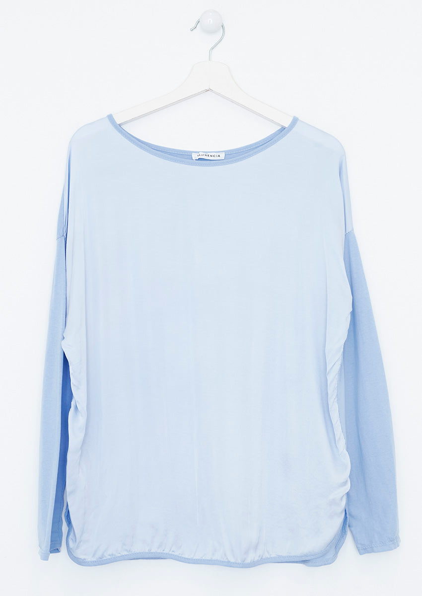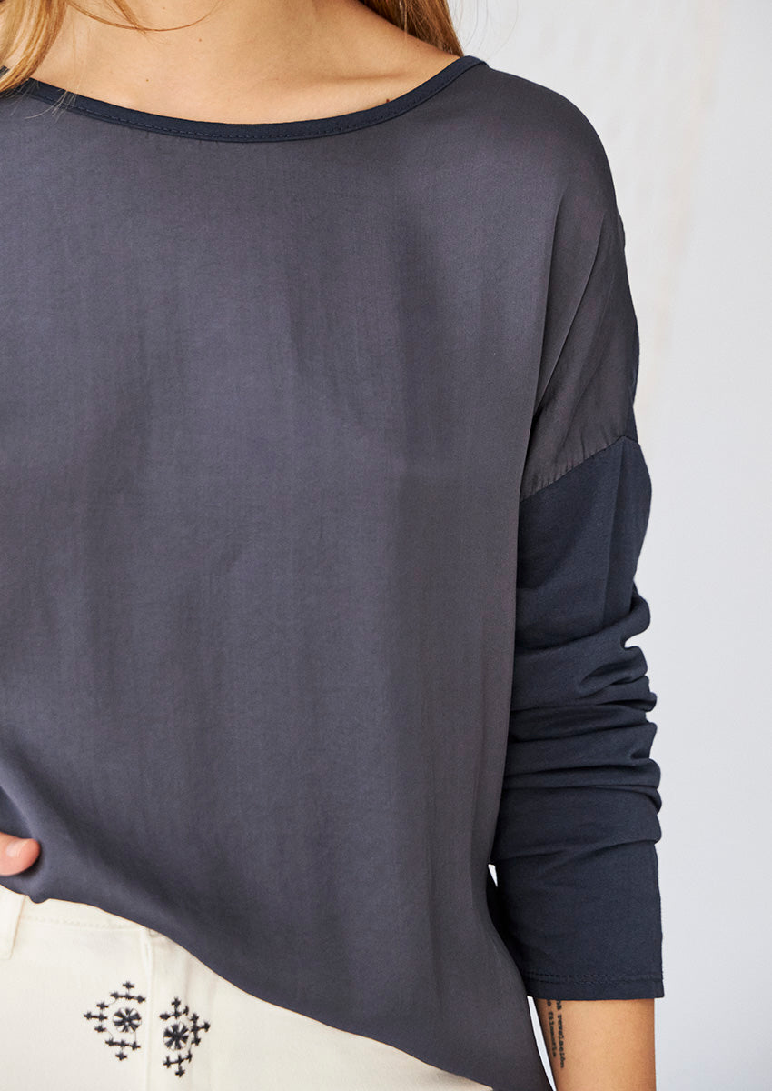 Samarreta de punt de cotó amb coll rodó i màniga llarga. Baixos asimètrics. Part frontal setinada i part posterior i mànigues llises.