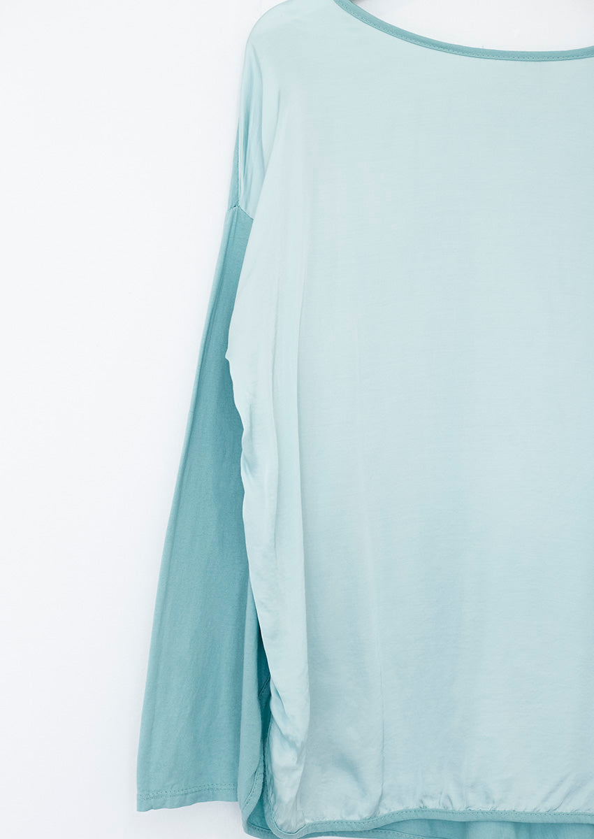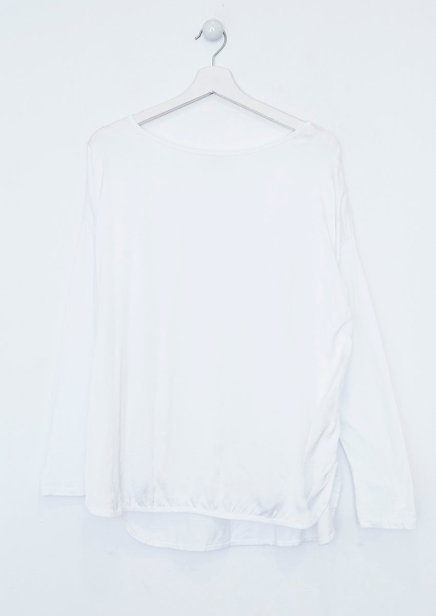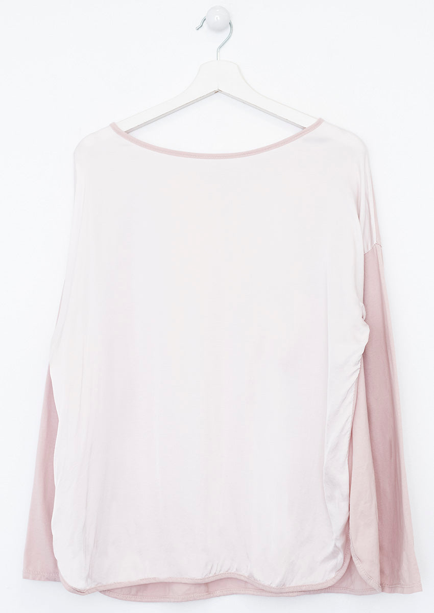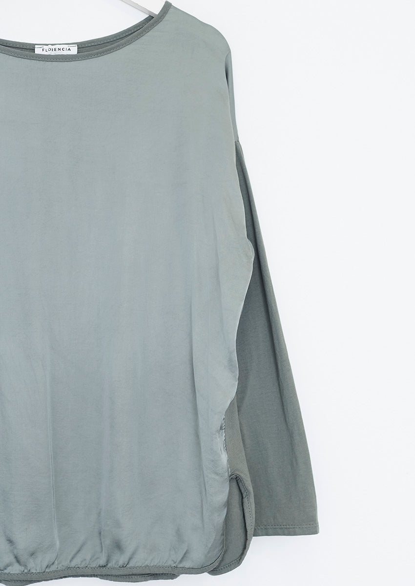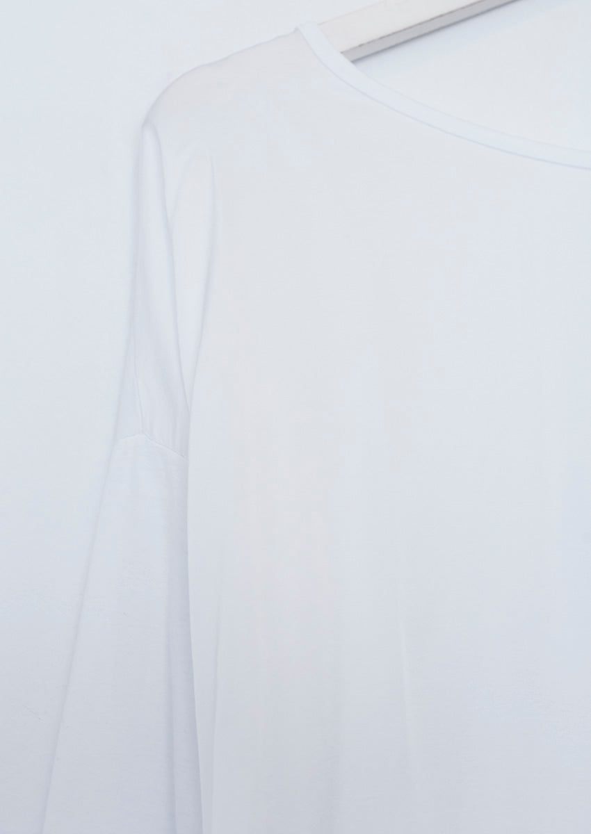 Samarreta de punt de cotó amb coll rodó i màniga llarga. Baixos asimètrics. Part frontal setinada i part posterior i mànigues llises.