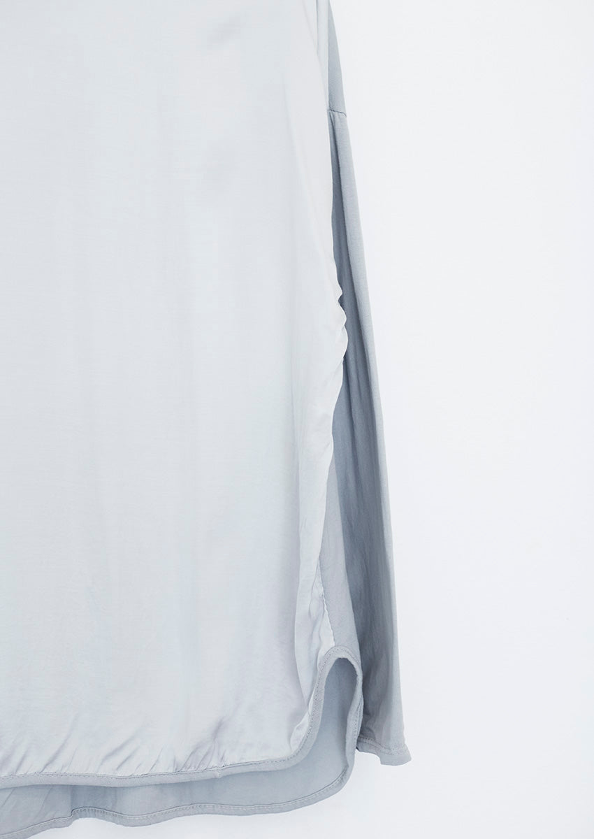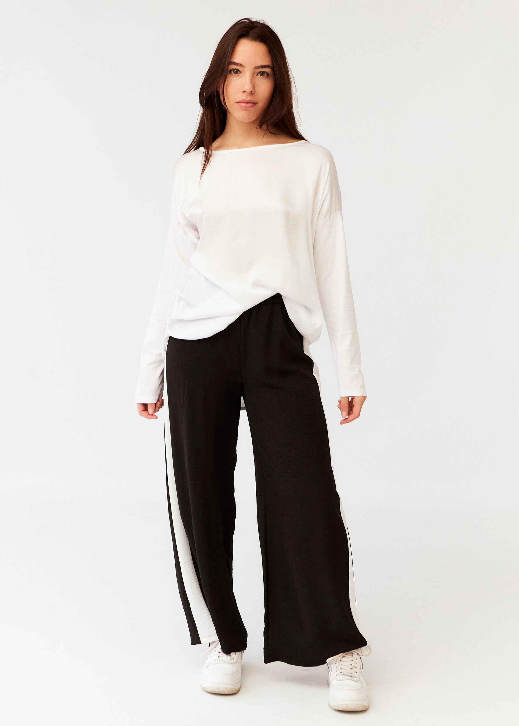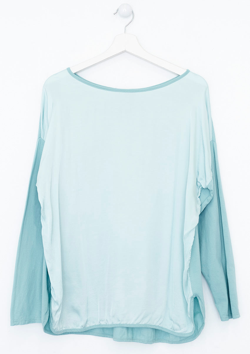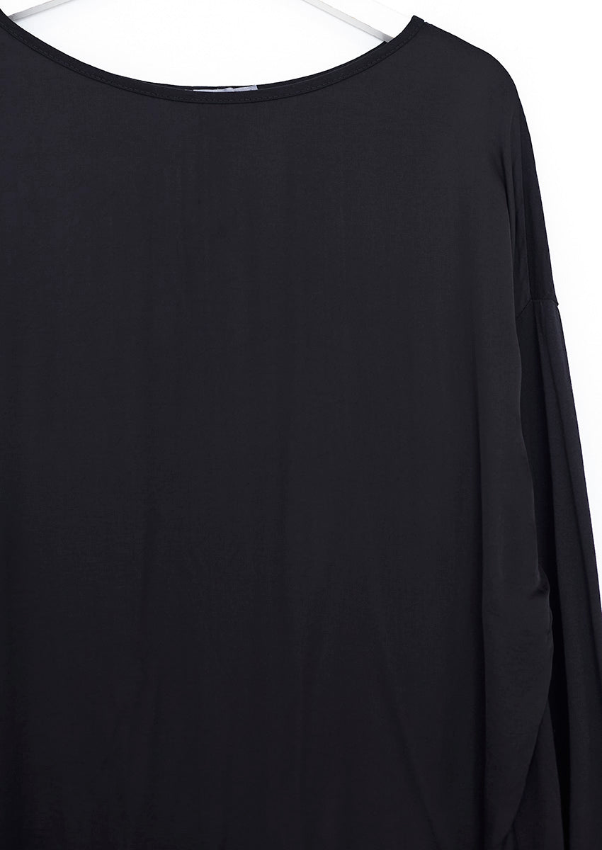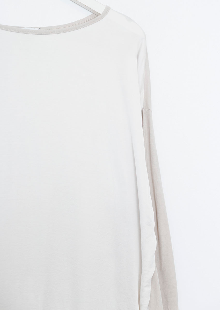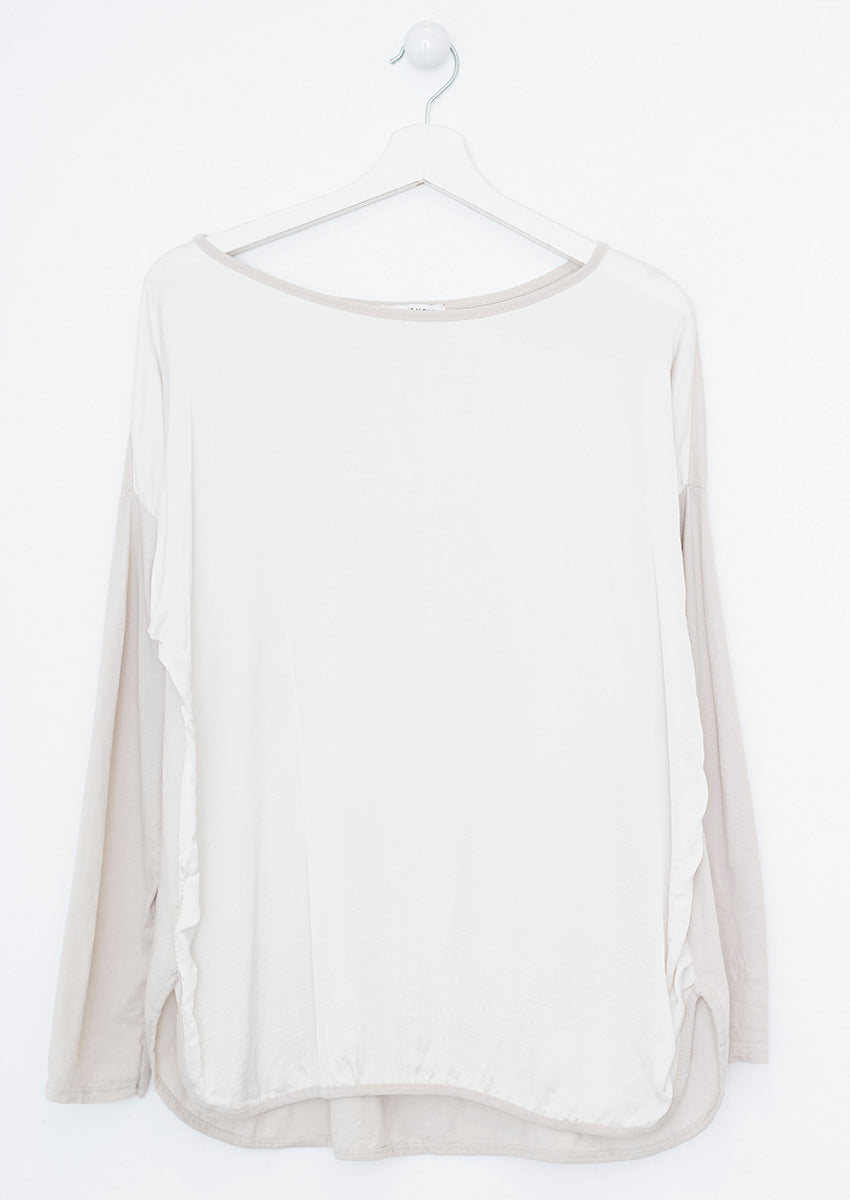 Samarreta de punt de cotó amb coll rodó i màniga llarga. Baixos asimètrics. Part frontal setinada i part posterior i mànigues llises.