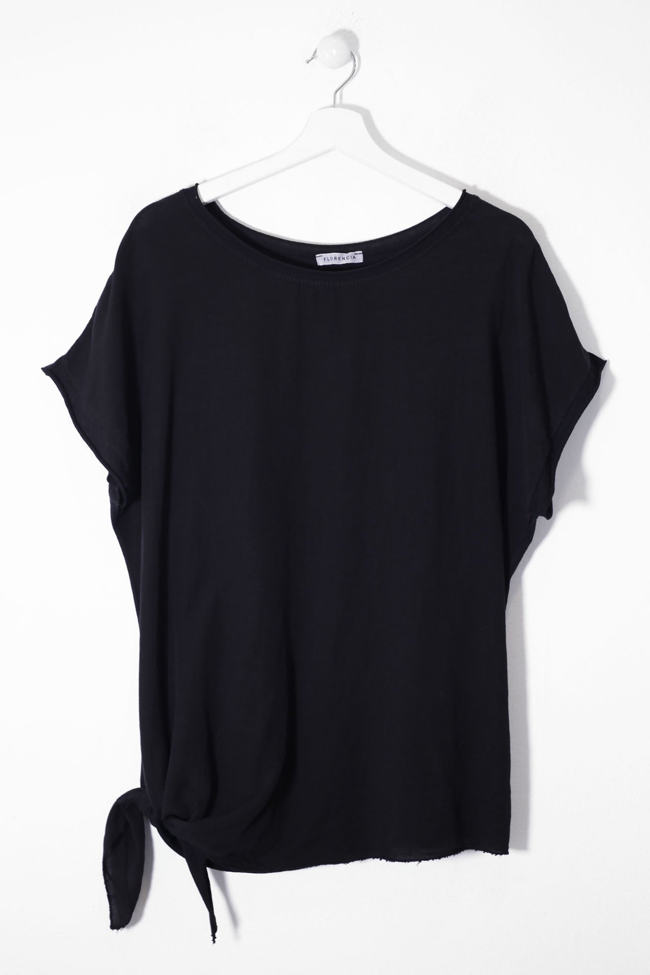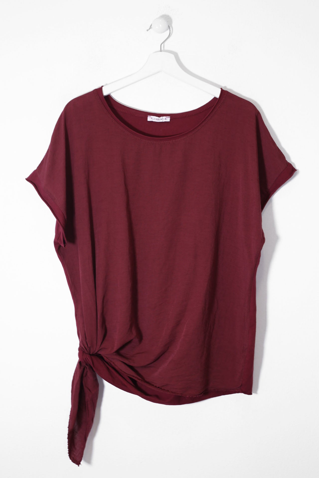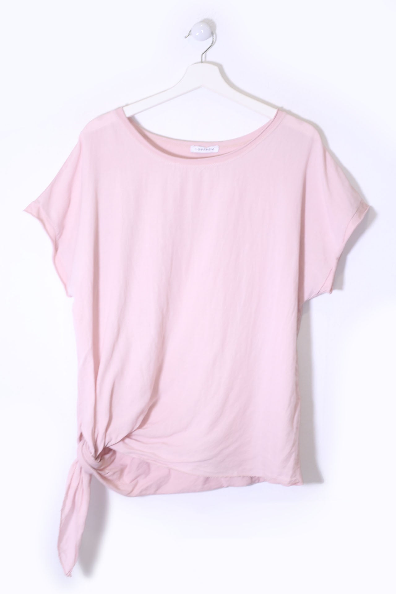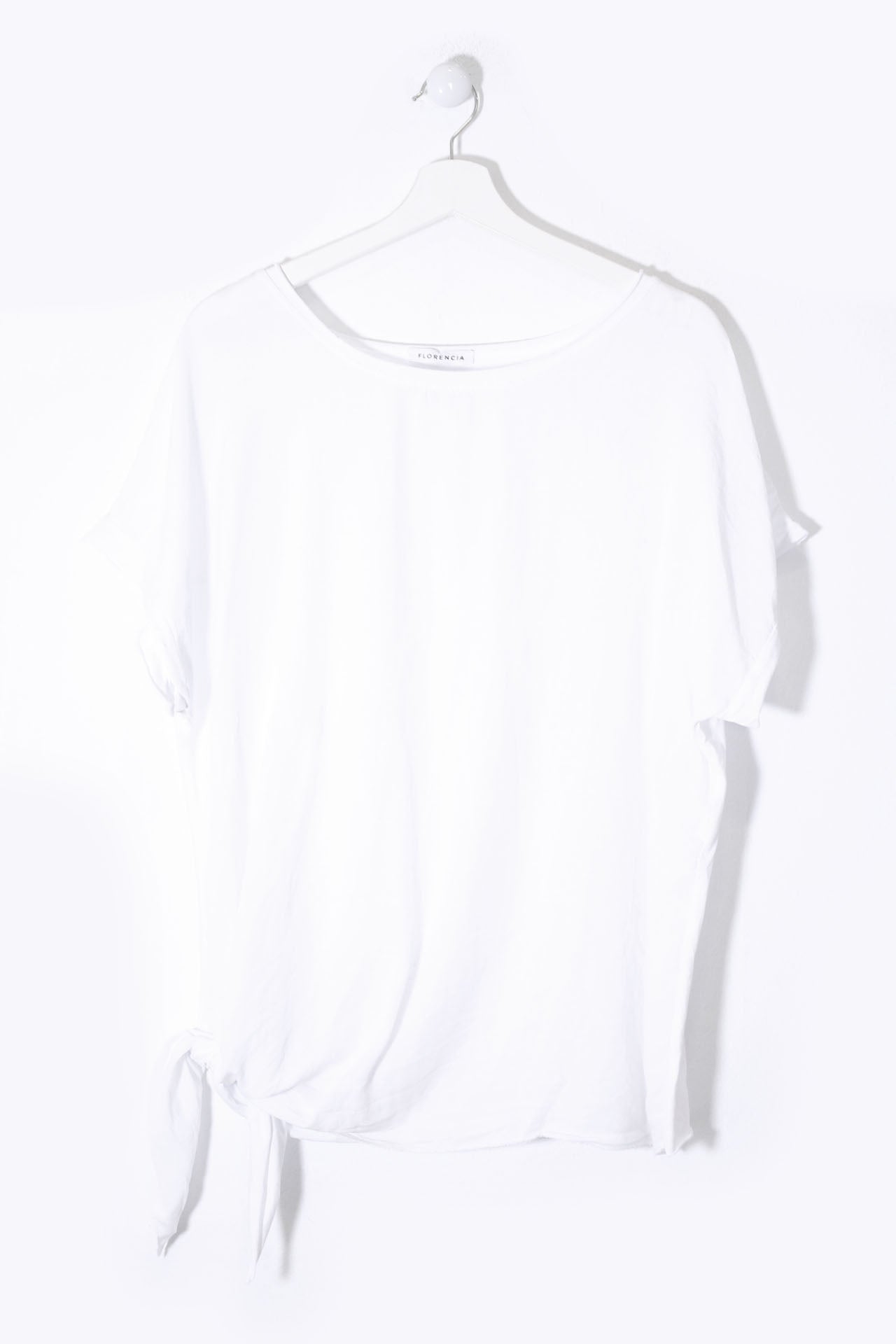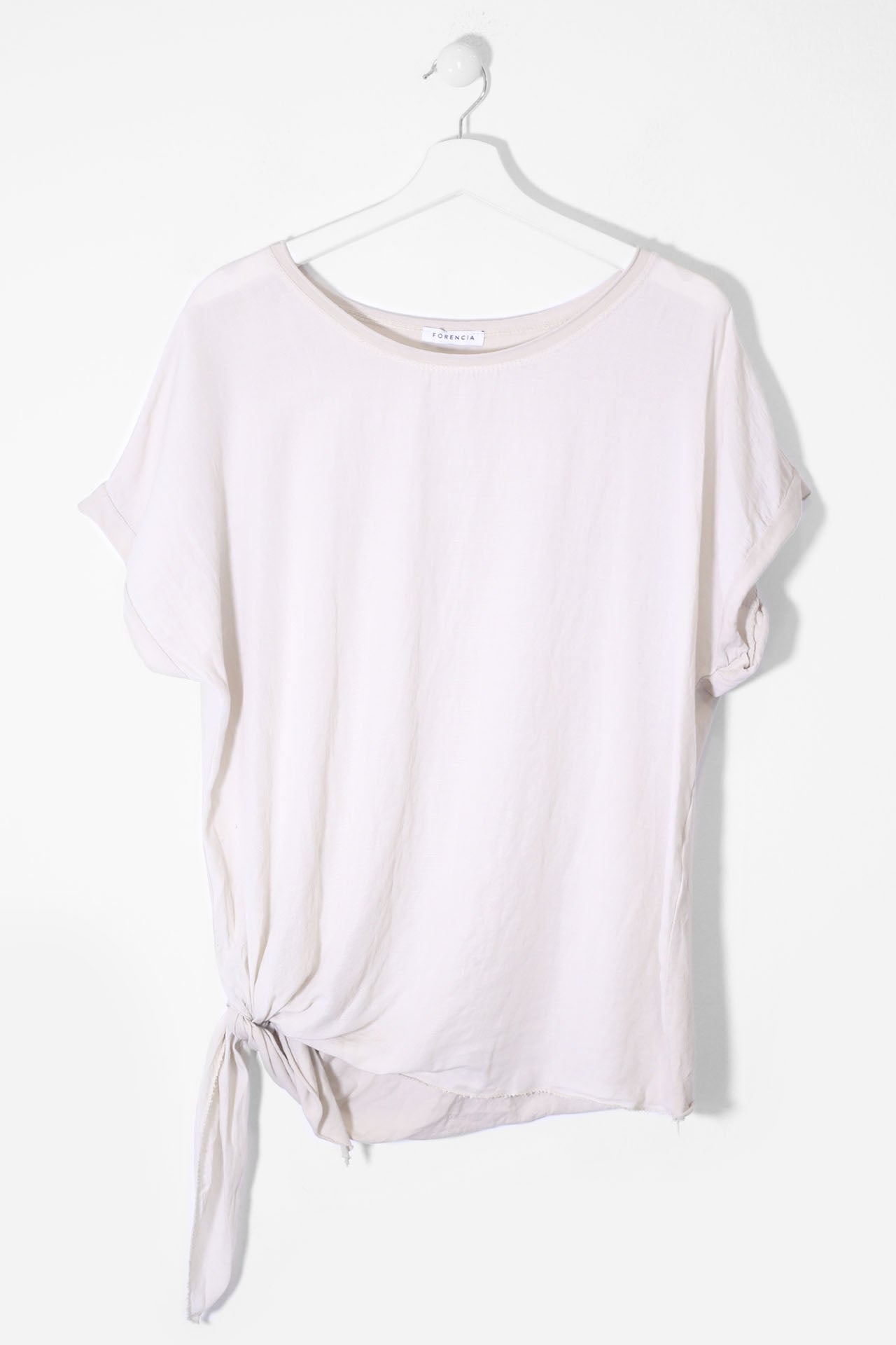 Camiseta de cuello redondo y manga corta. Parte frontal texturada y parte trasera en algodón. Detalle de nudo en bajo frontal. Corte amplio.