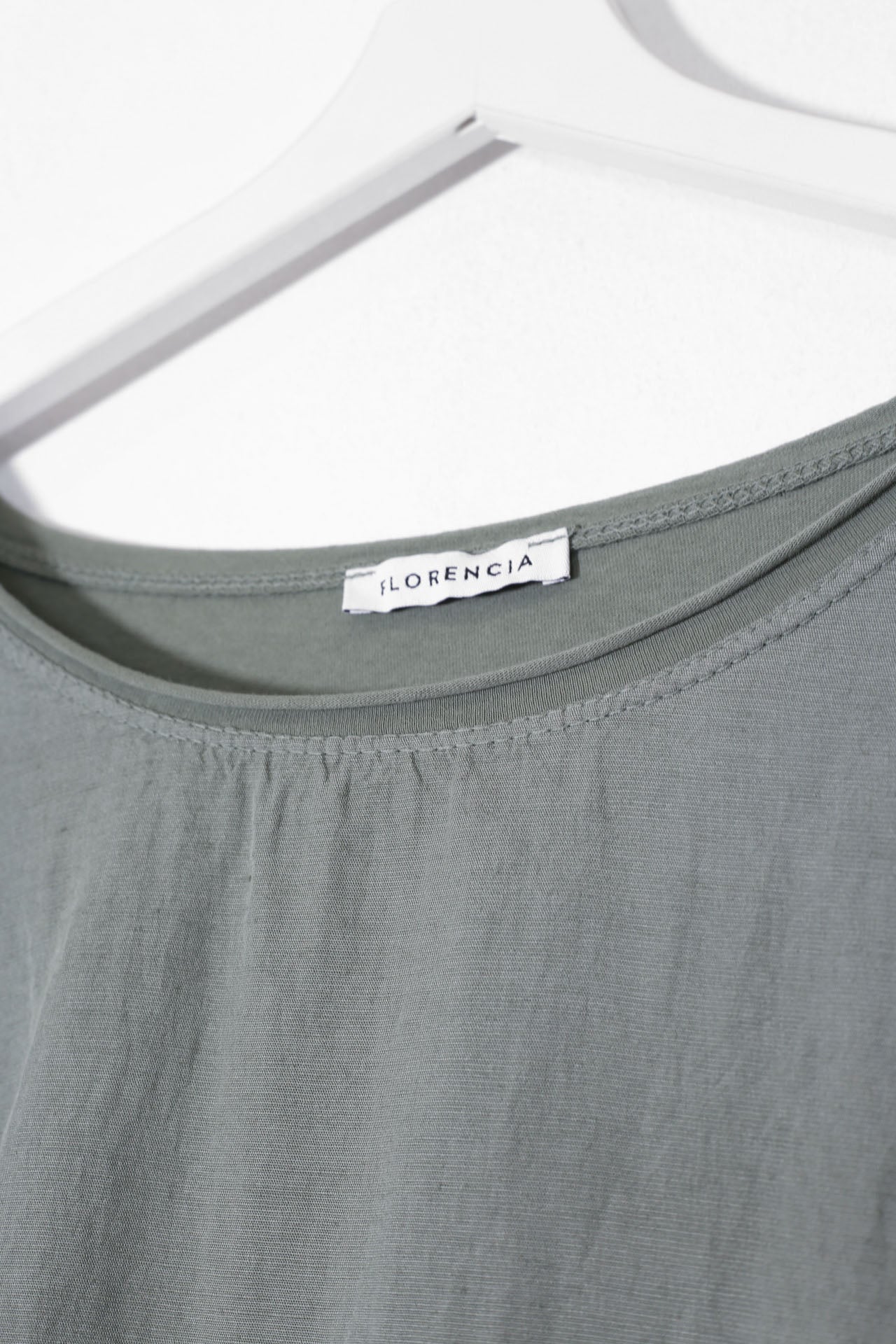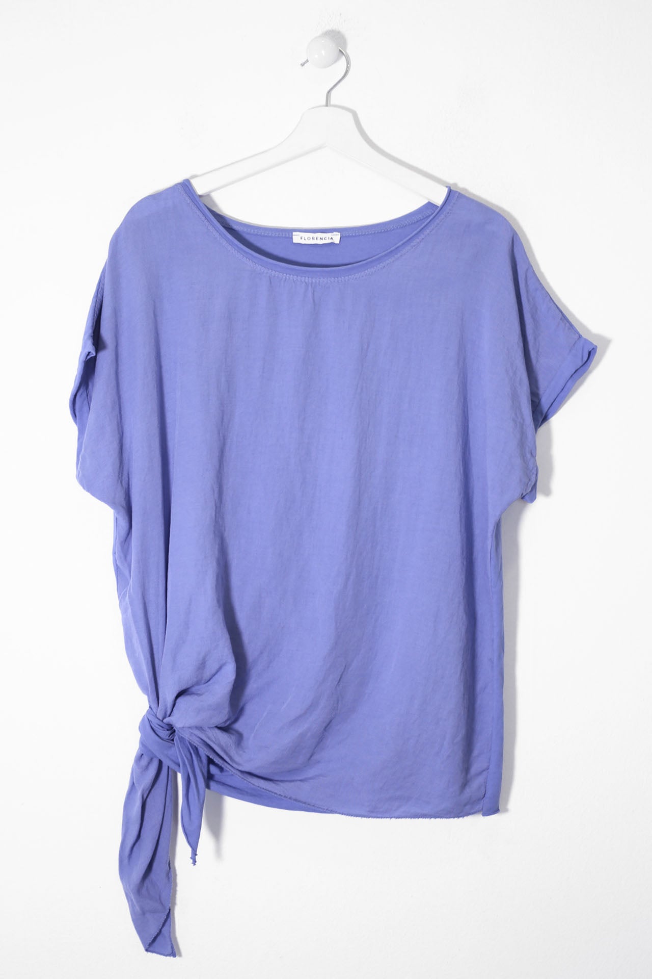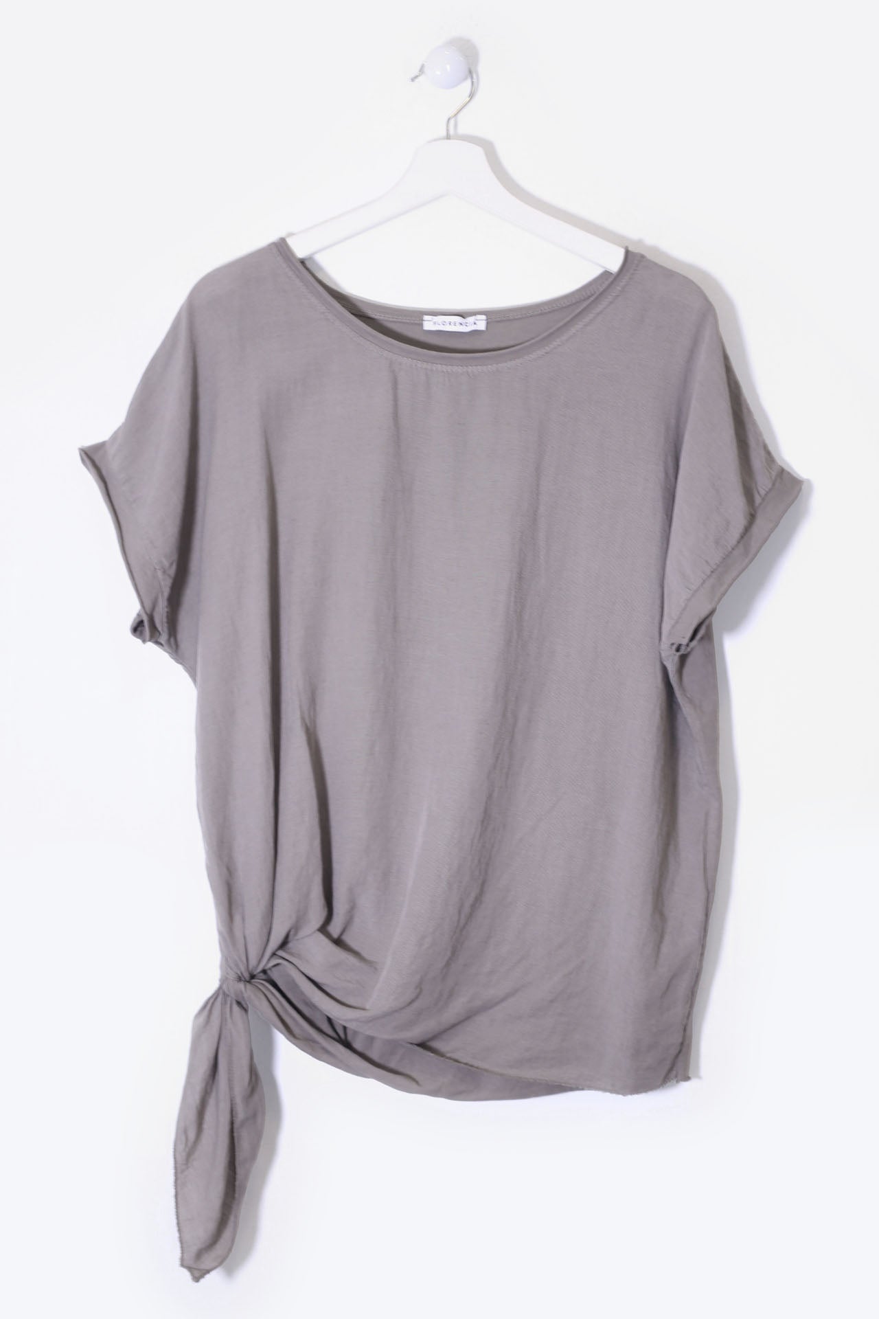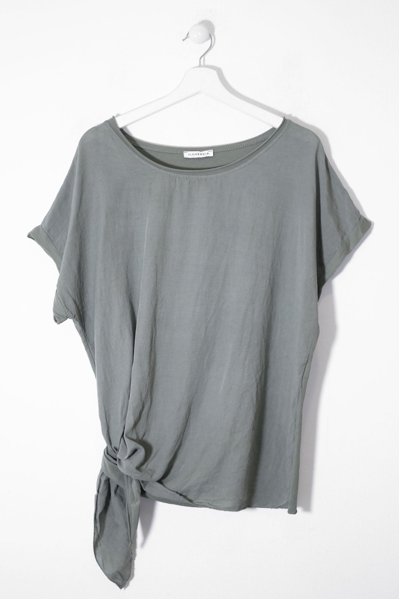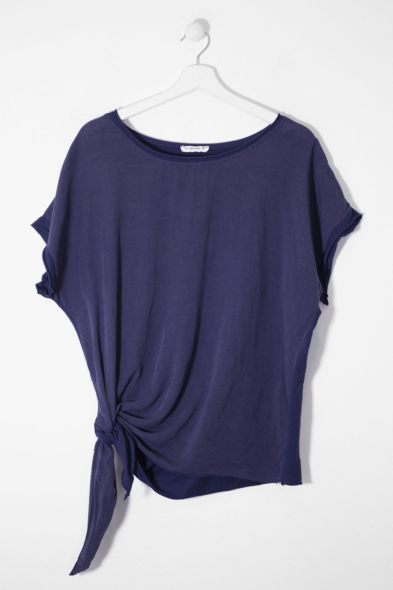 Camiseta de cuello redondo y manga corta. Parte frontal texturada y parte trasera en algodón. Detalle de nudo en bajo frontal. Corte amplio.