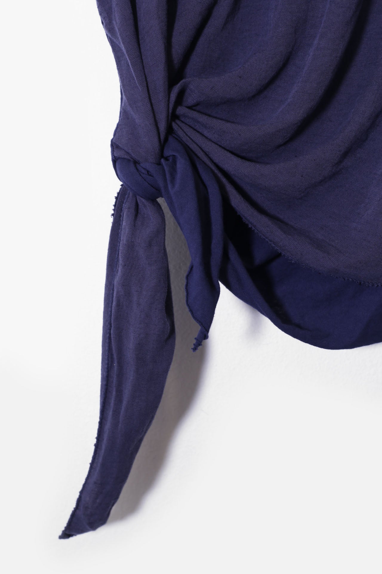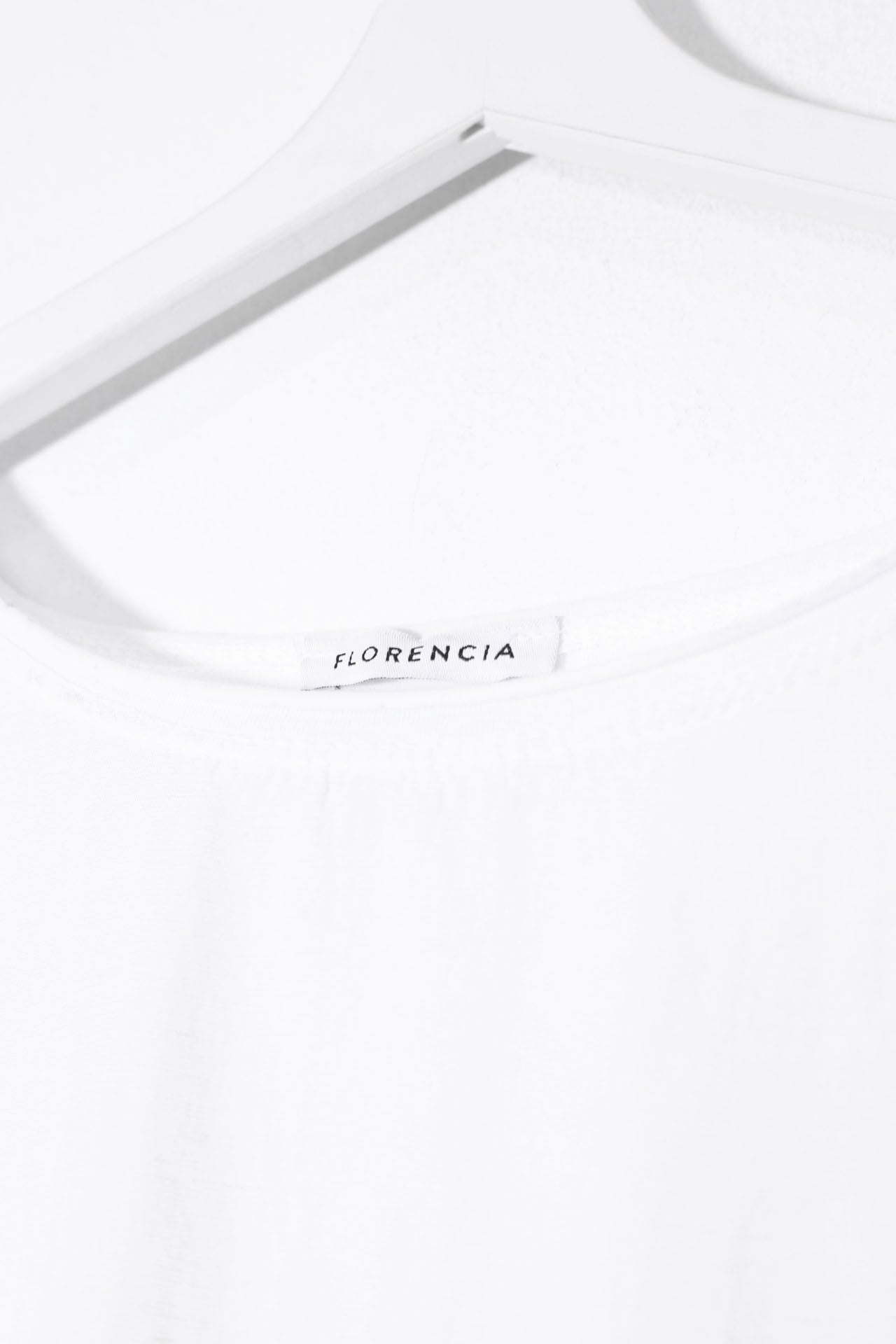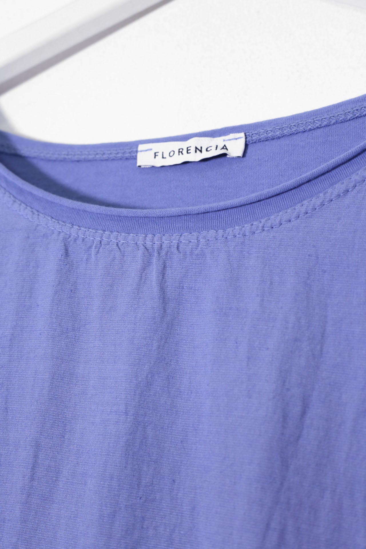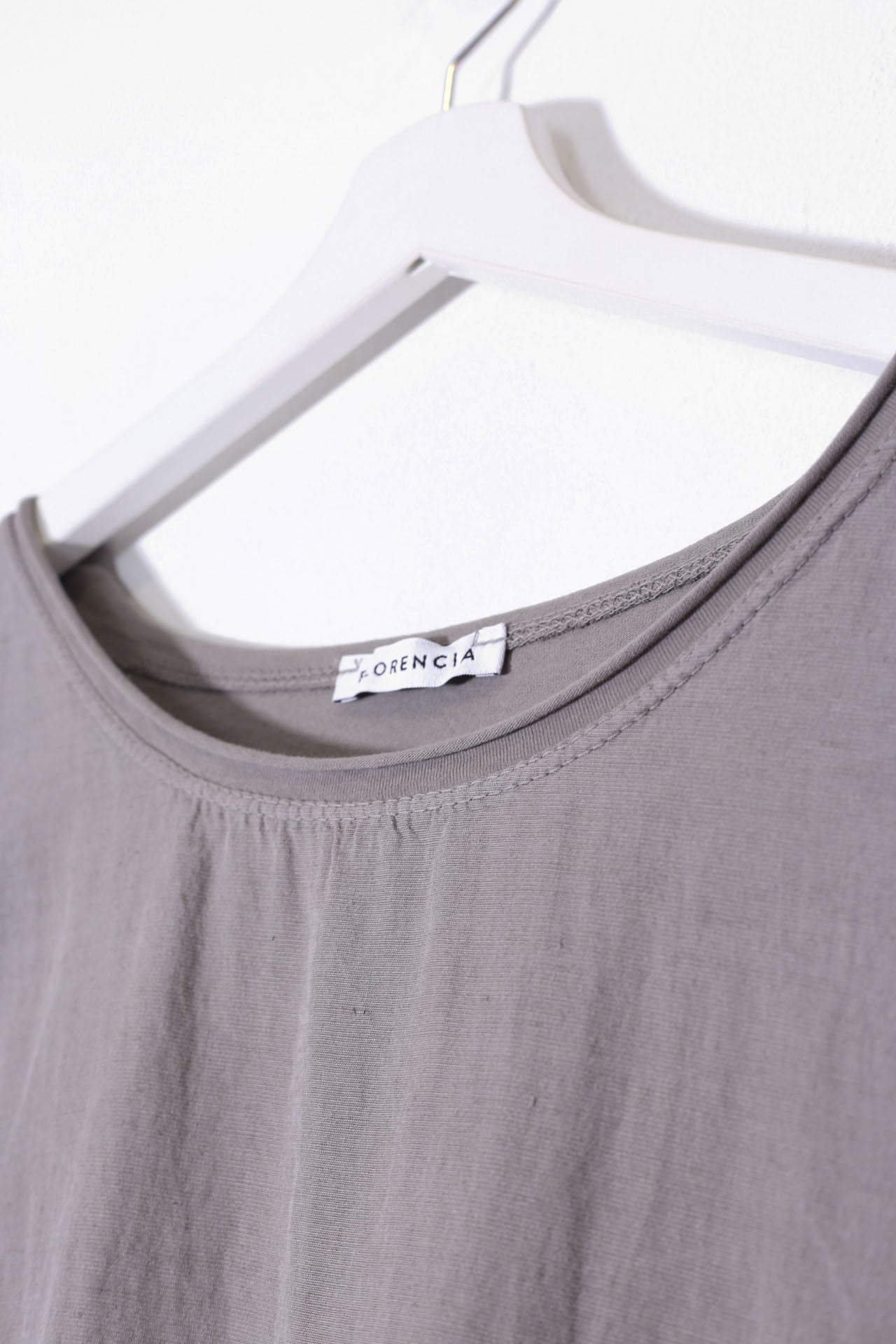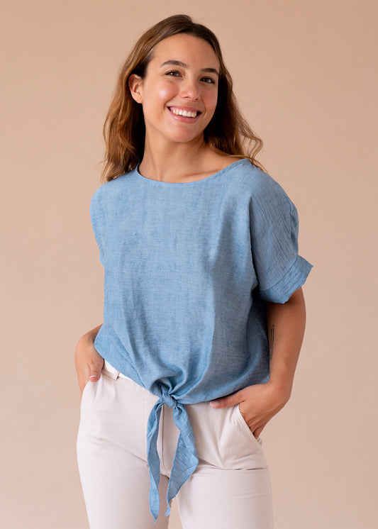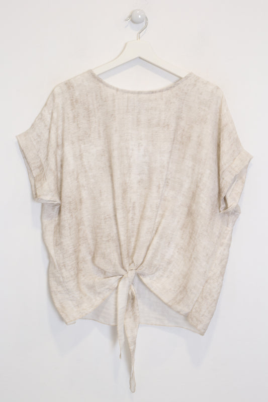 Camiseta de cuello redondo y manga corta. Parte frontal texturada y parte trasera en algodón. Detalle de nudo en bajo frontal. Corte amplio.