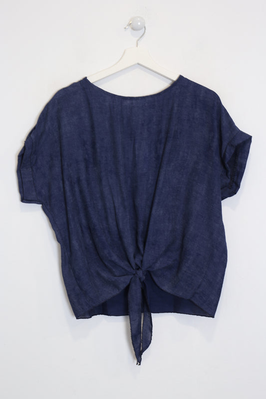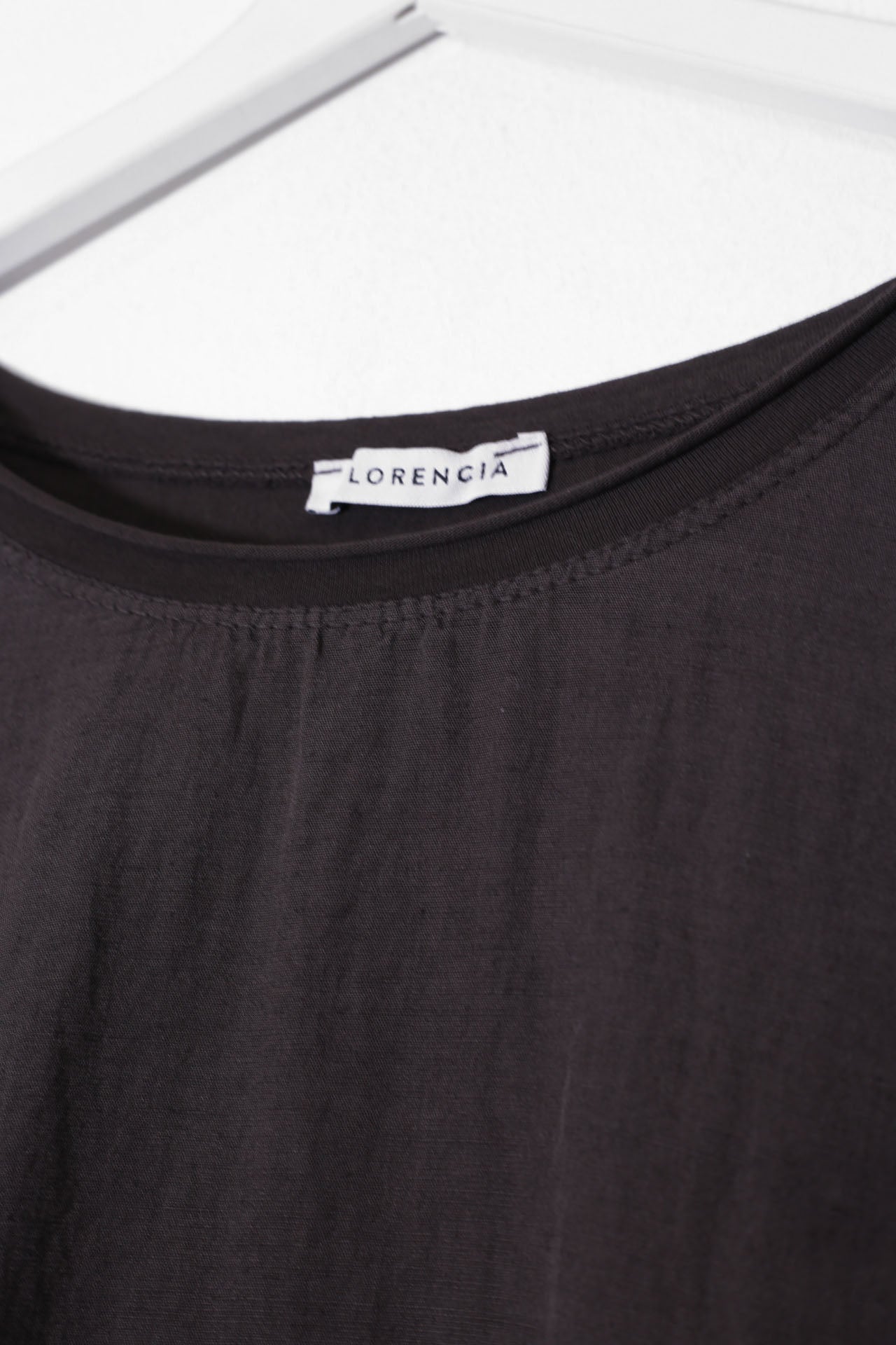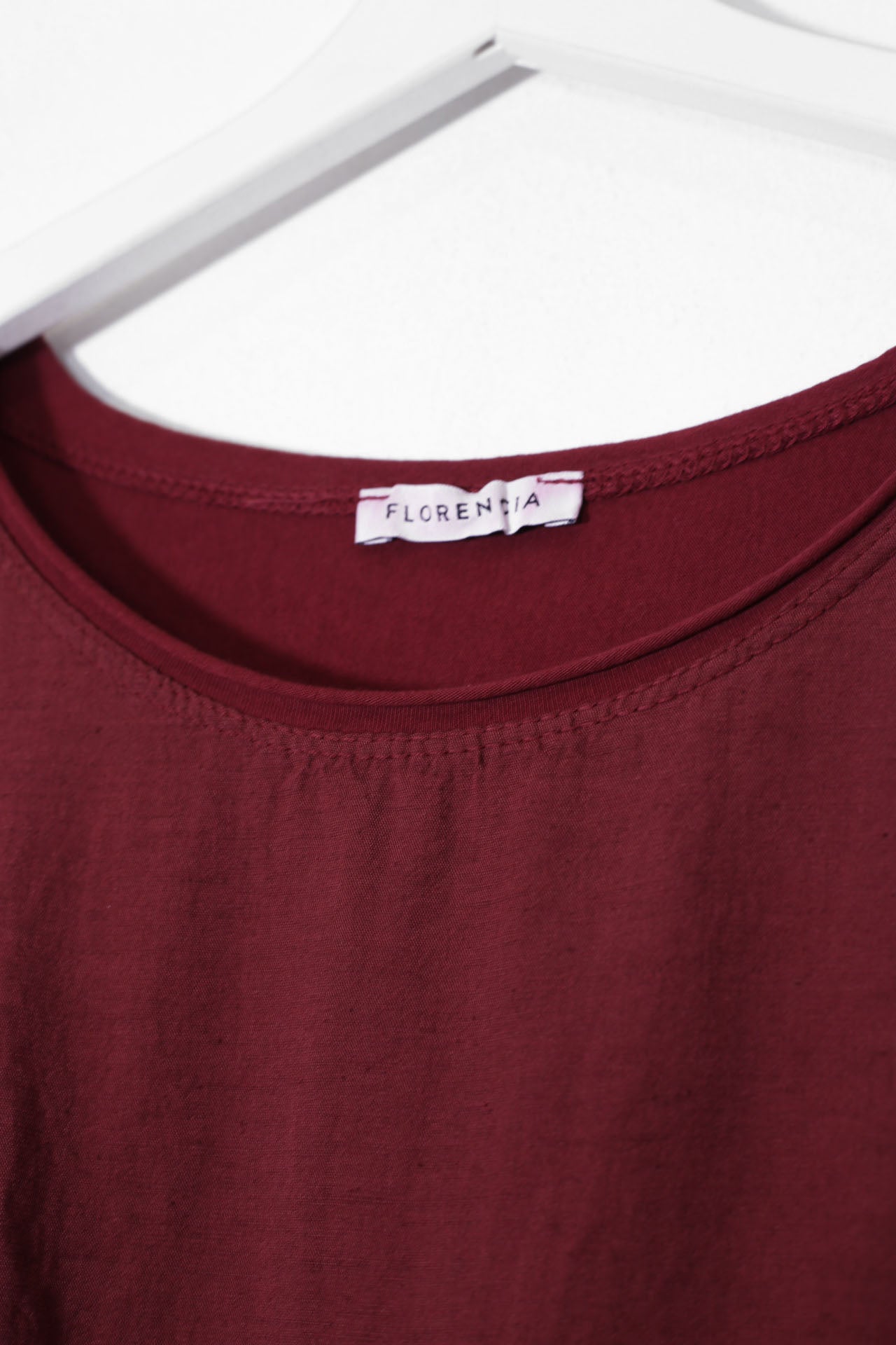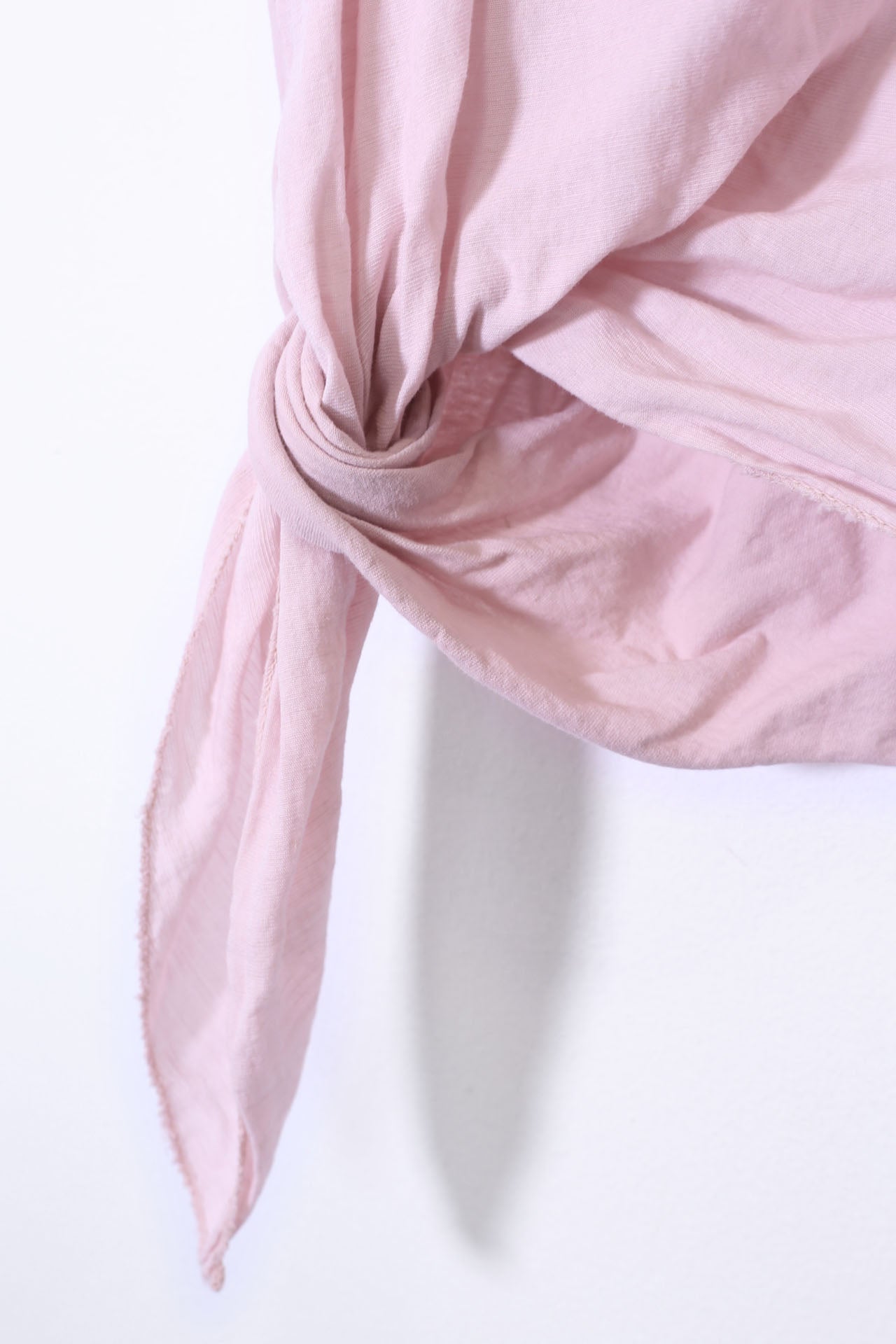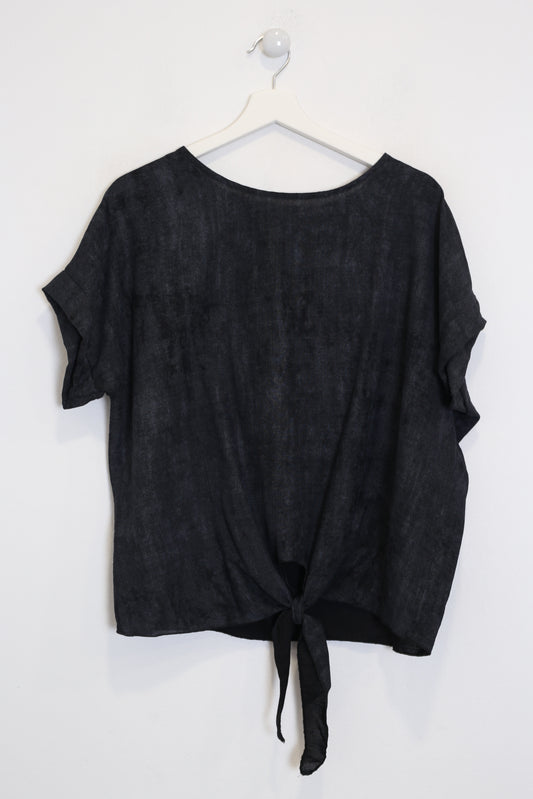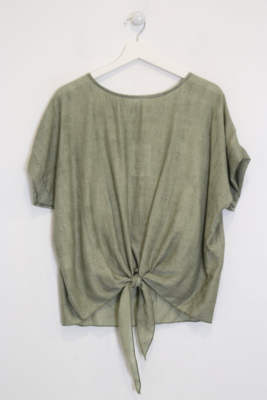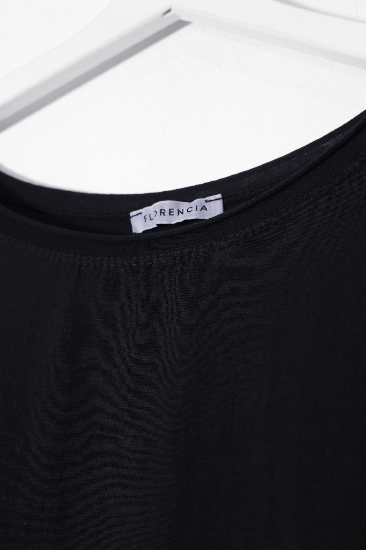 Camiseta de cuello redondo y manga corta. Parte frontal texturada y parte trasera en algodón. Detalle de nudo en bajo frontal. Corte amplio.