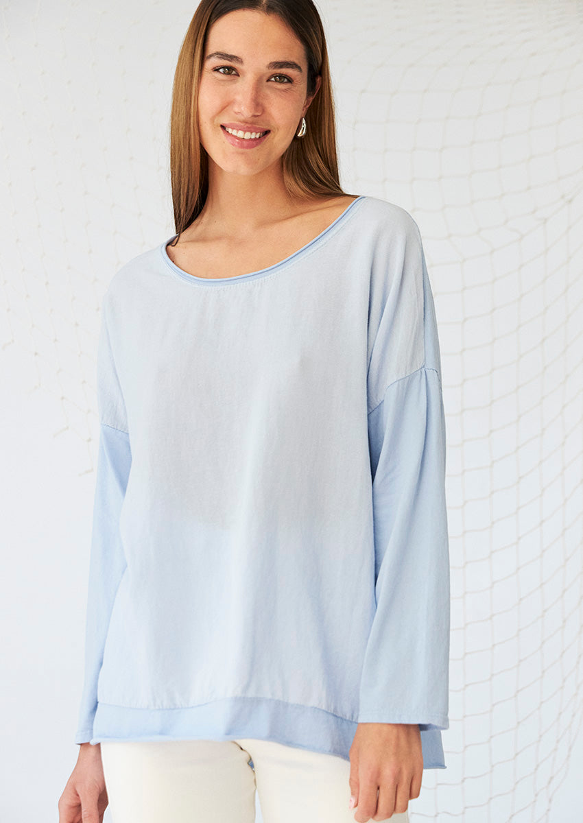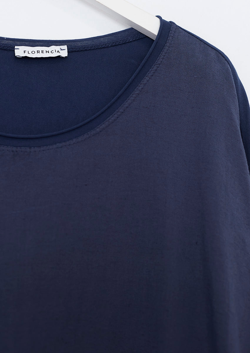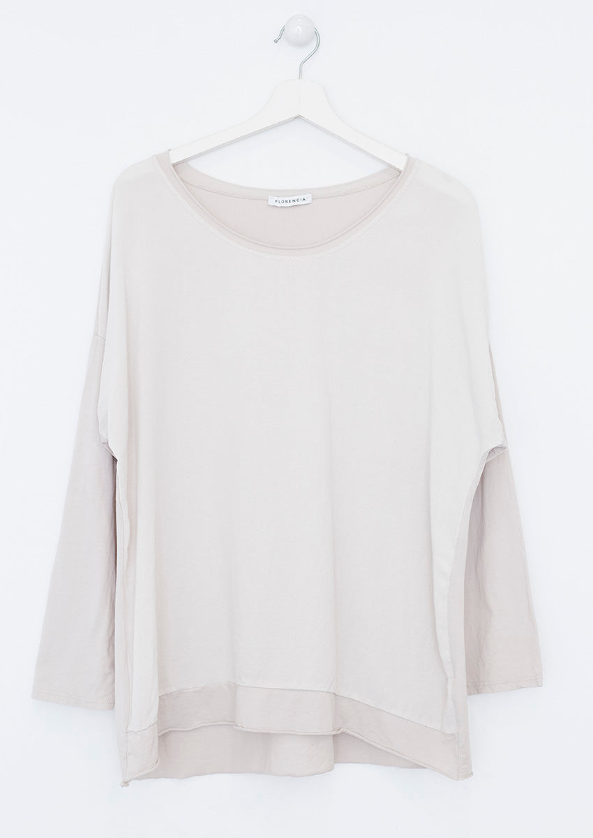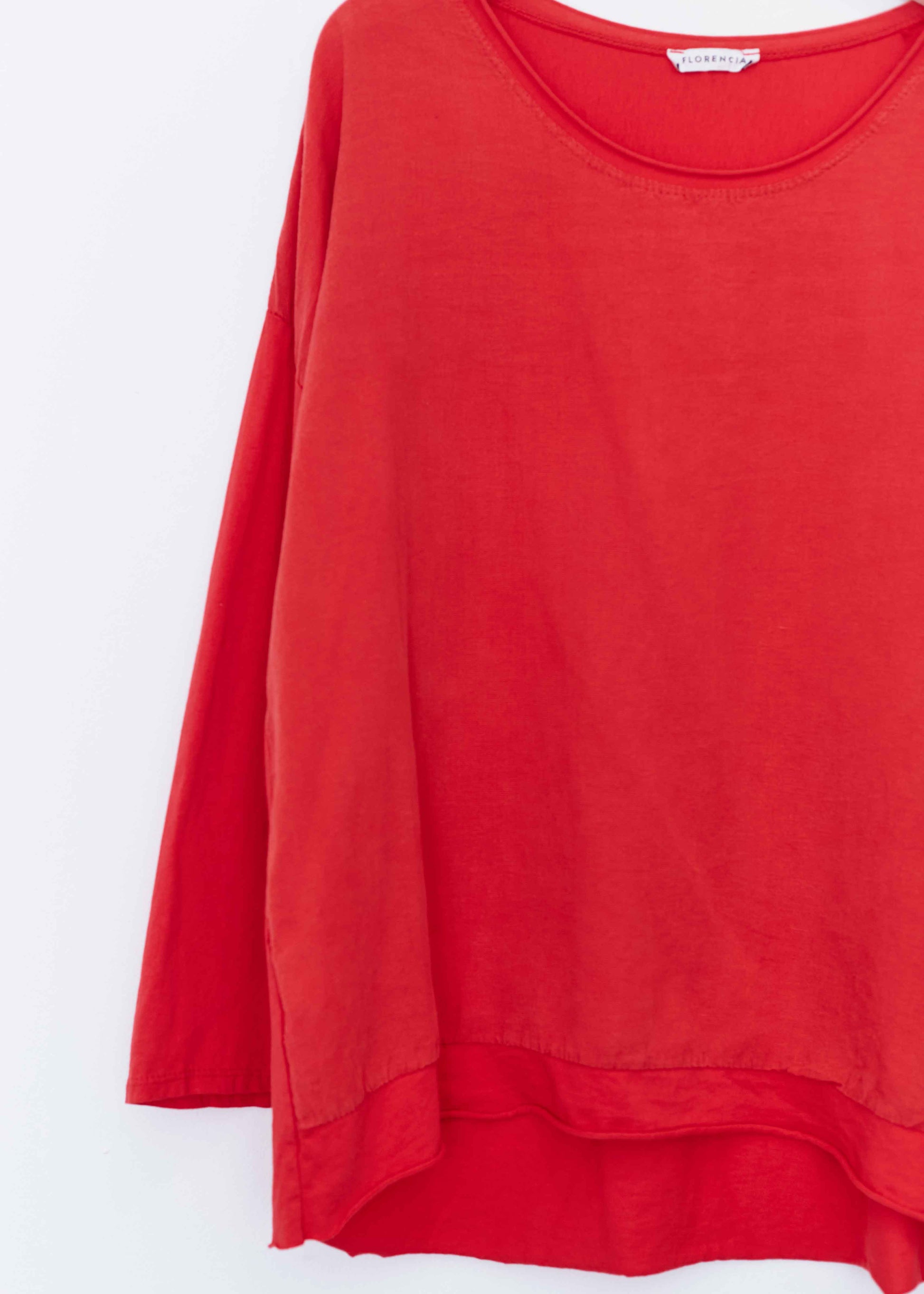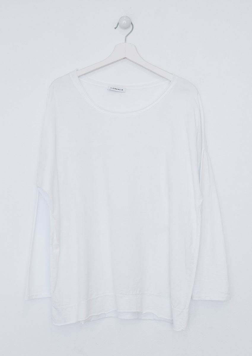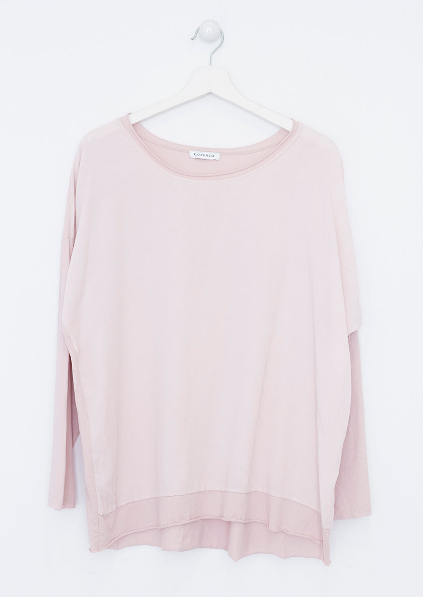 Samarreta de punt de cotó amb coll rodó i màniga llarga. Baixos asimètrics. Part frontal lleugerament texturada i part posterior i mànigues llises.