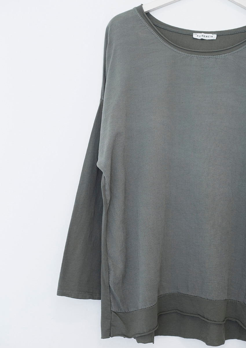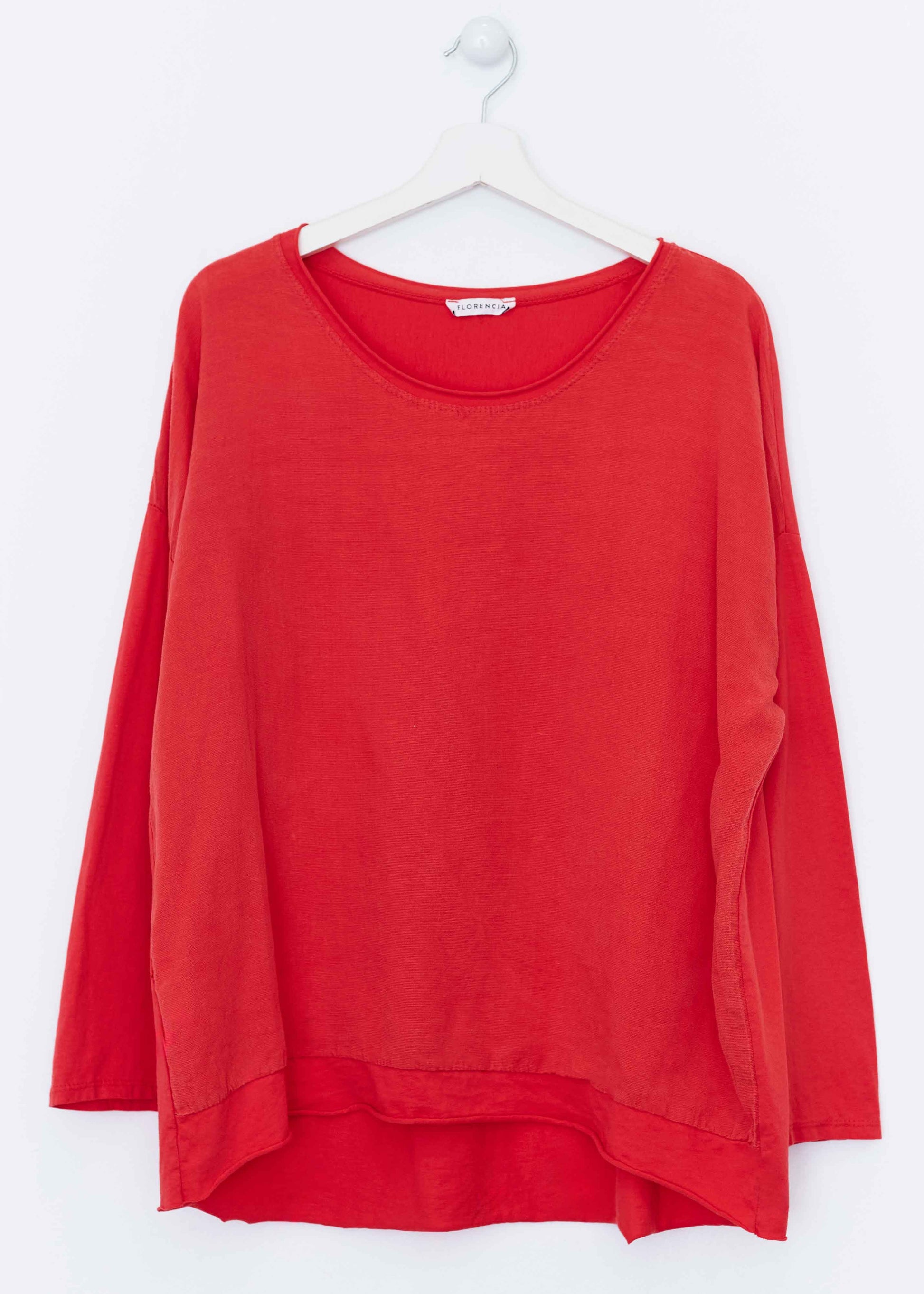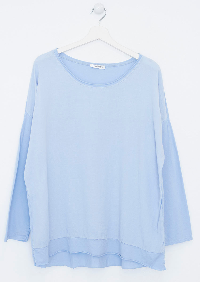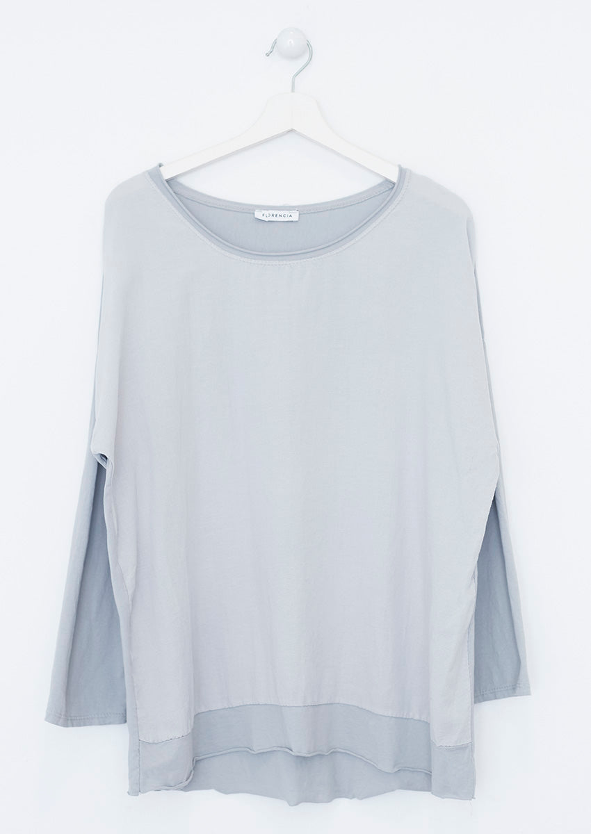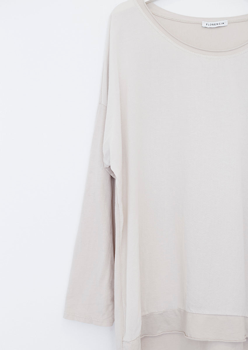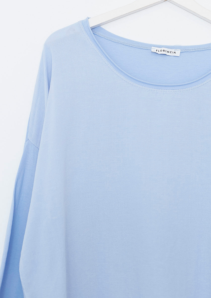 Samarreta de punt de cotó amb coll rodó i màniga llarga. Baixos asimètrics. Part frontal lleugerament texturada i part posterior i mànigues llises.