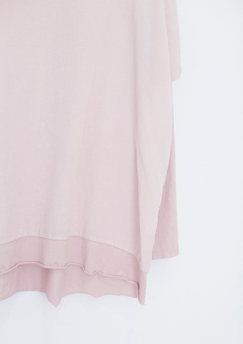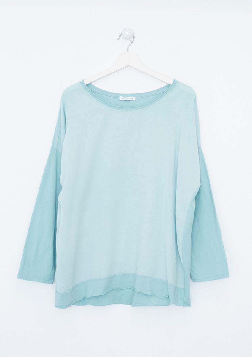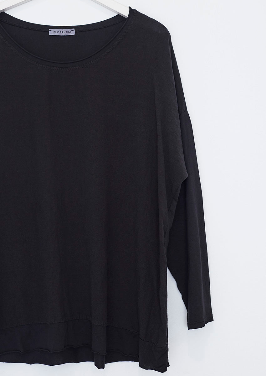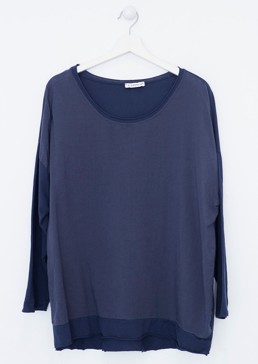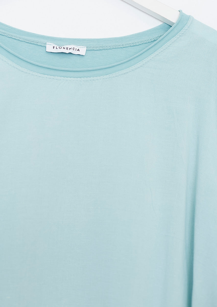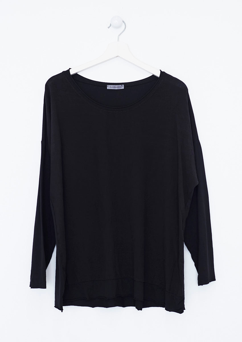 Samarreta de punt de cotó amb coll rodó i màniga llarga. Baixos asimètrics. Part frontal lleugerament texturada i part posterior i mànigues llises.