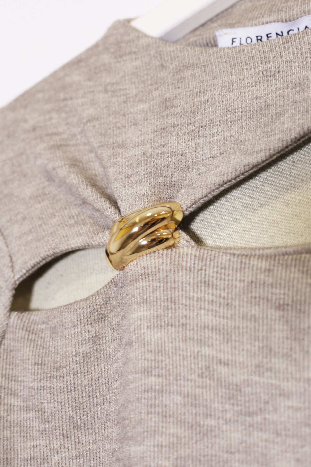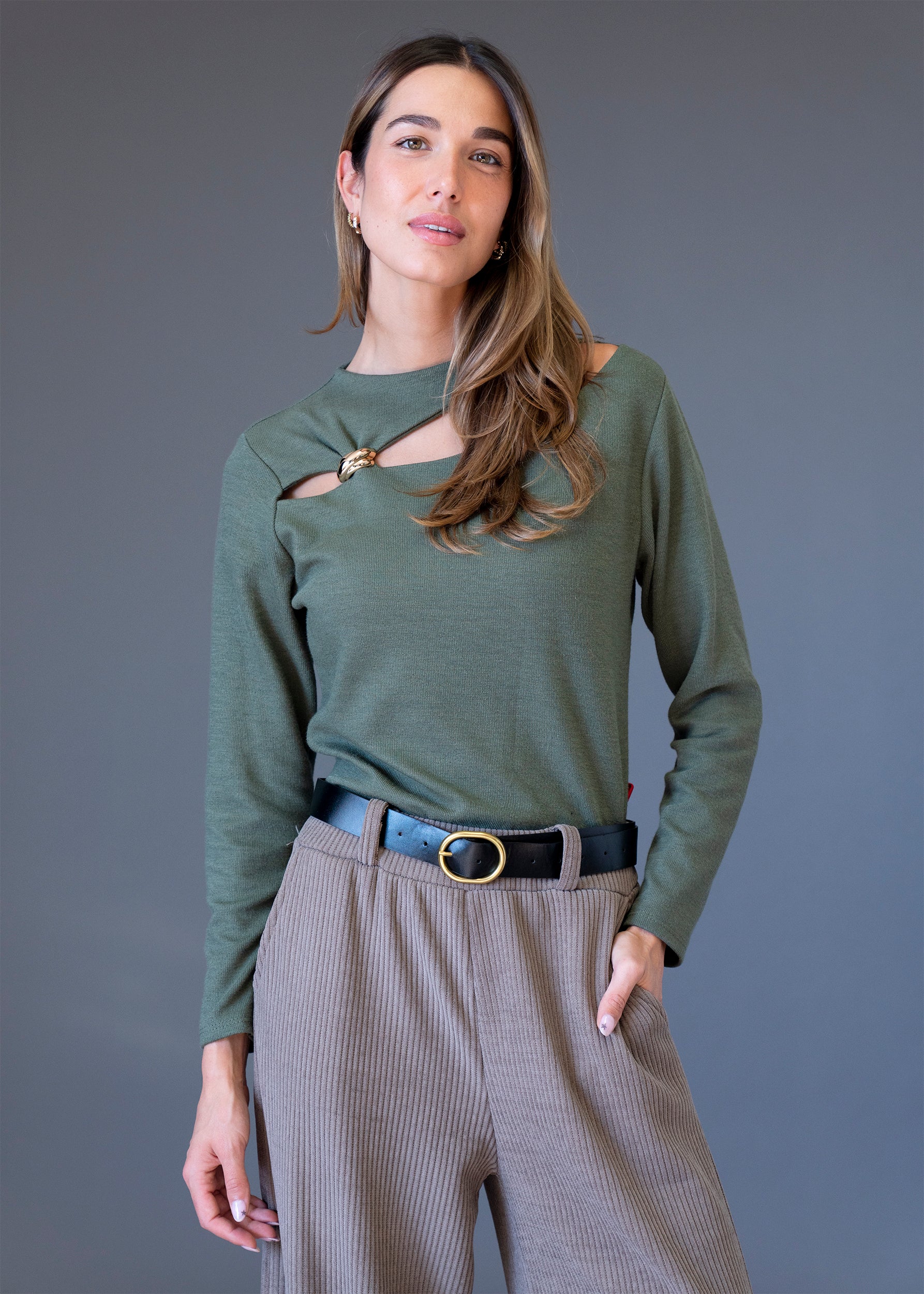 Camiseta de punto con cuello redondo y manga larga. Detalle de abertura en el escote con joya dorada. Tejido elástico. Corte recto.