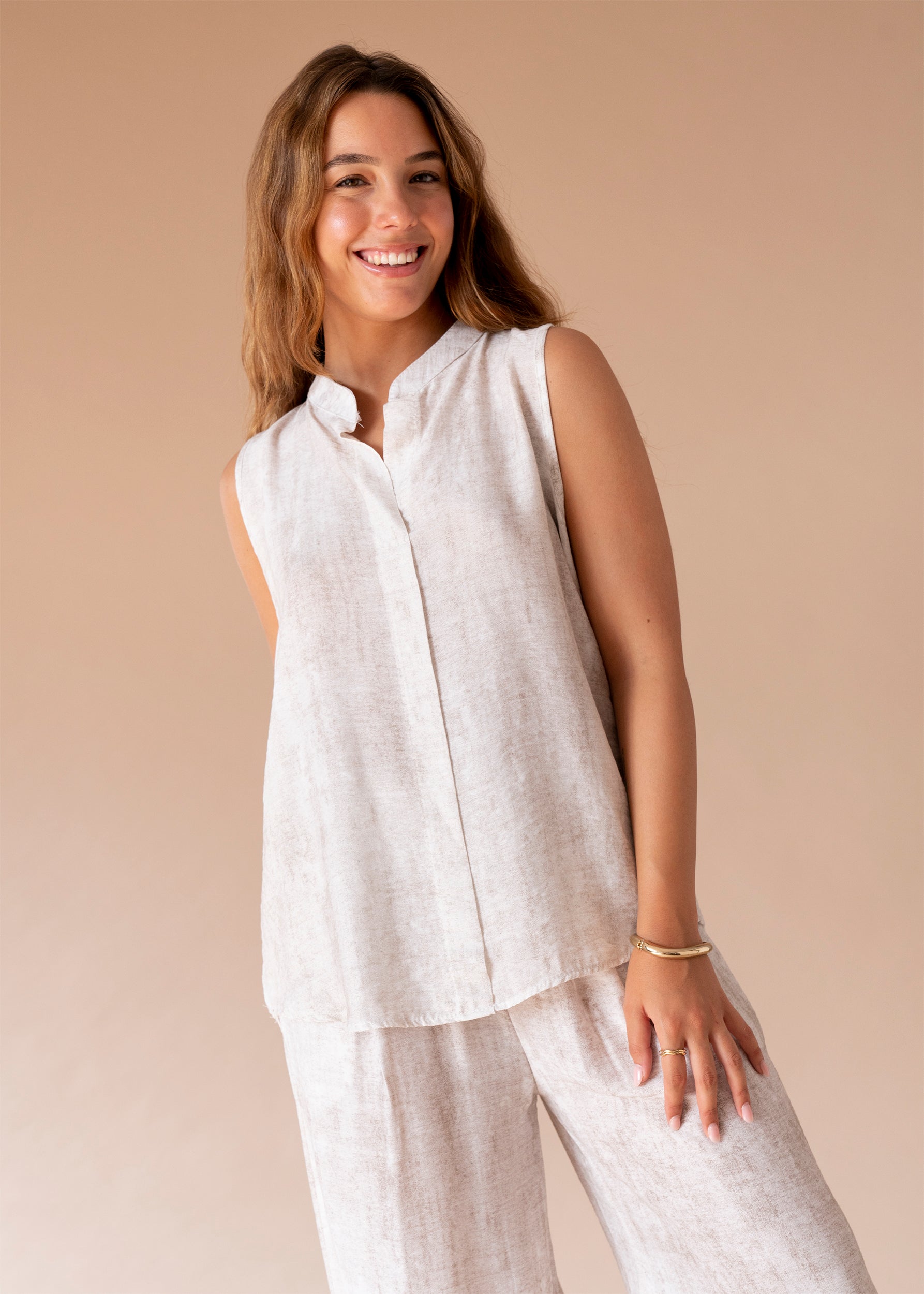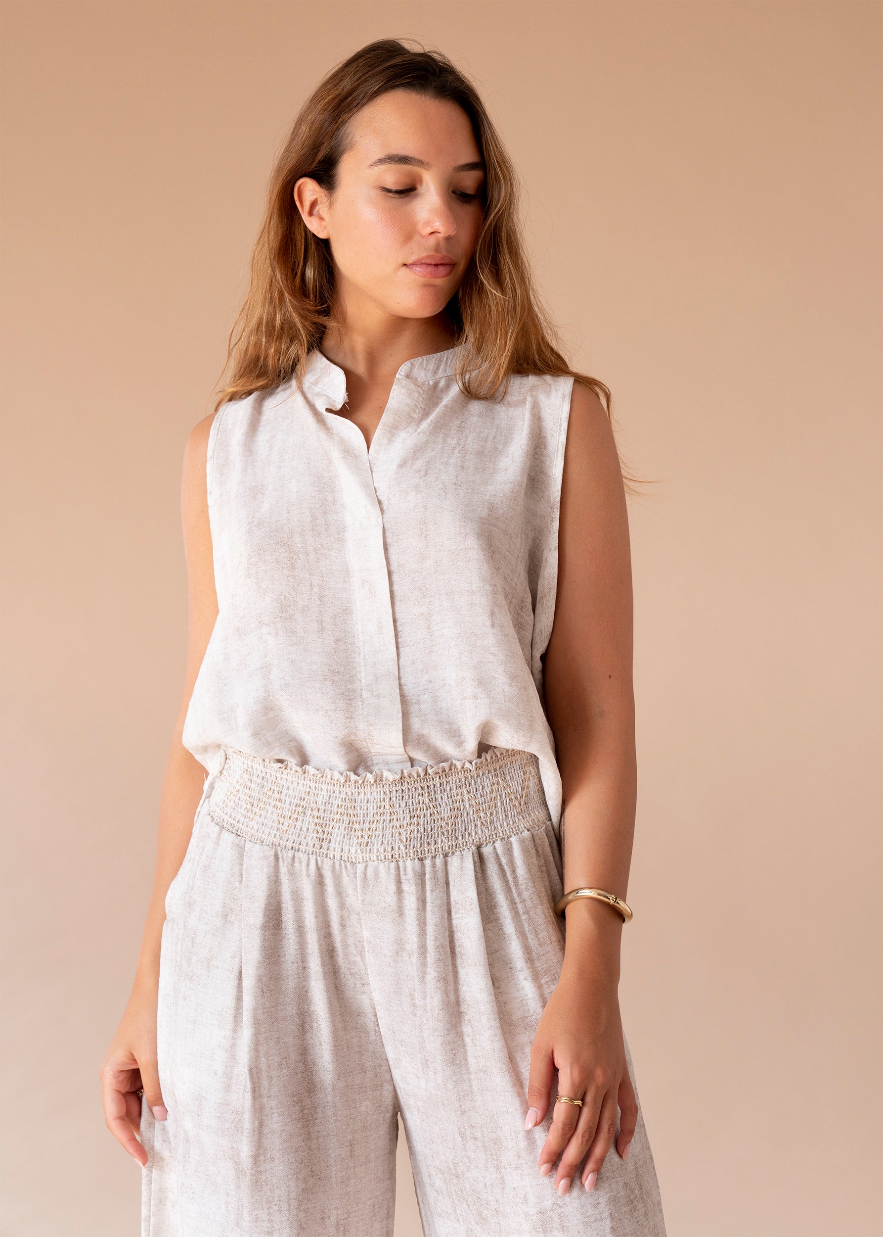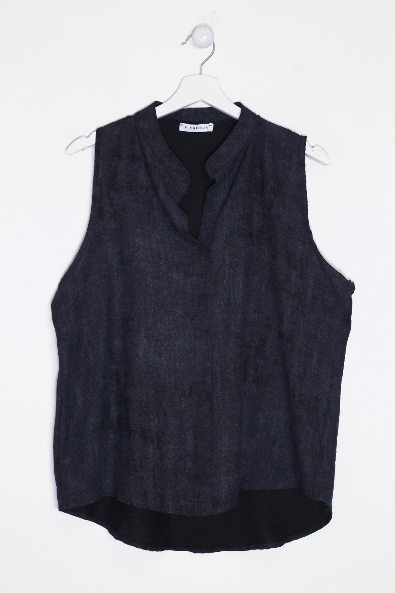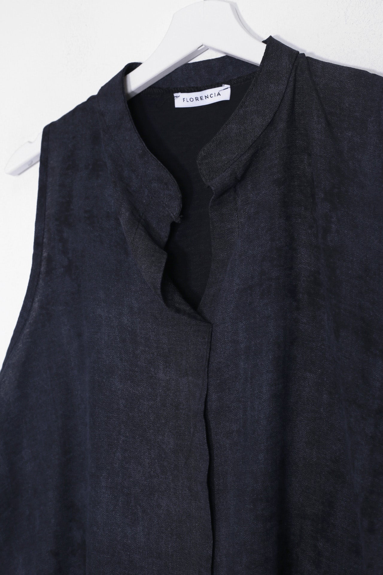 Top sin mangas con cuello mao y escote en punta. Cierre frontal con botones ocultos. Bajo asimétrico.