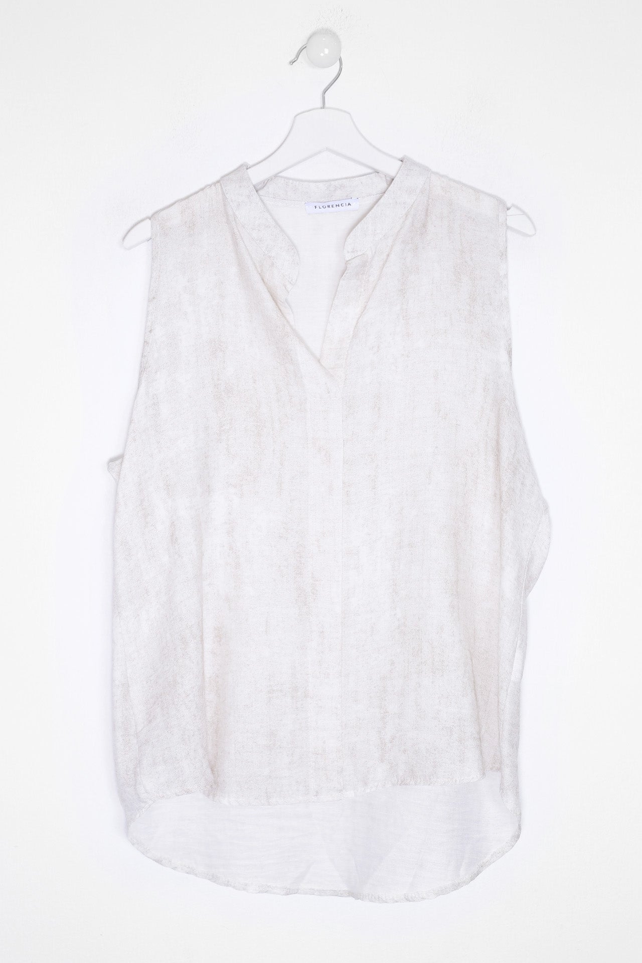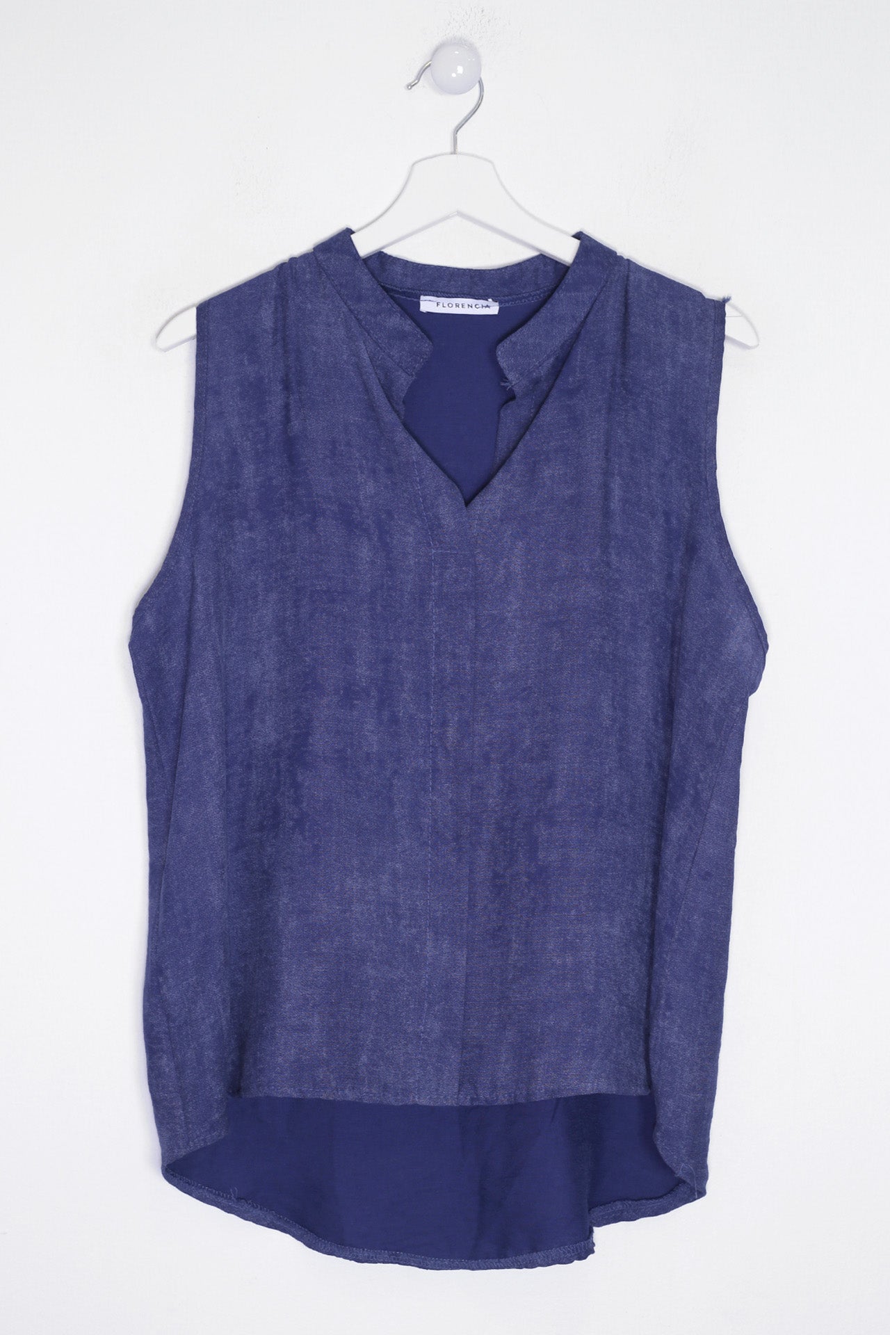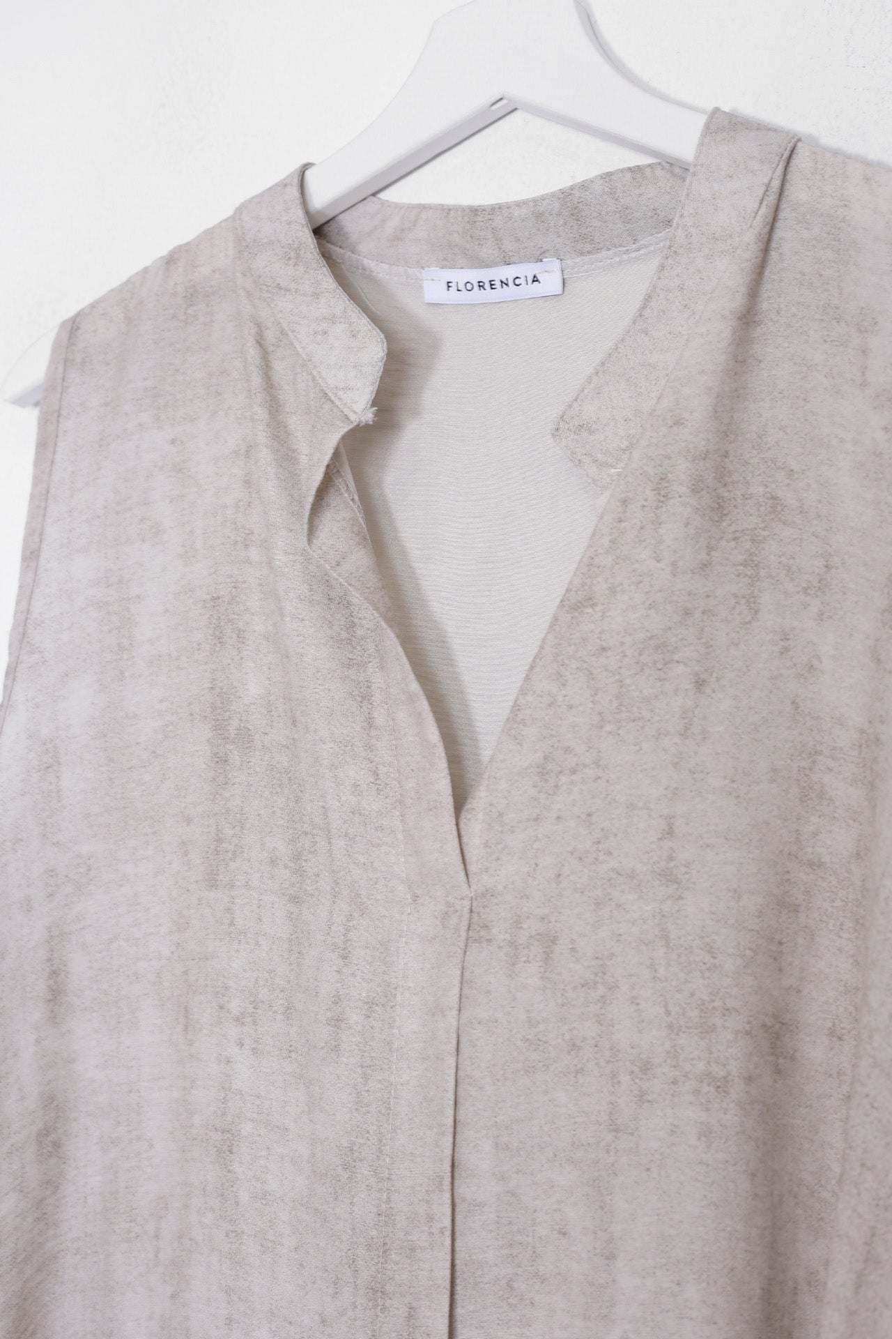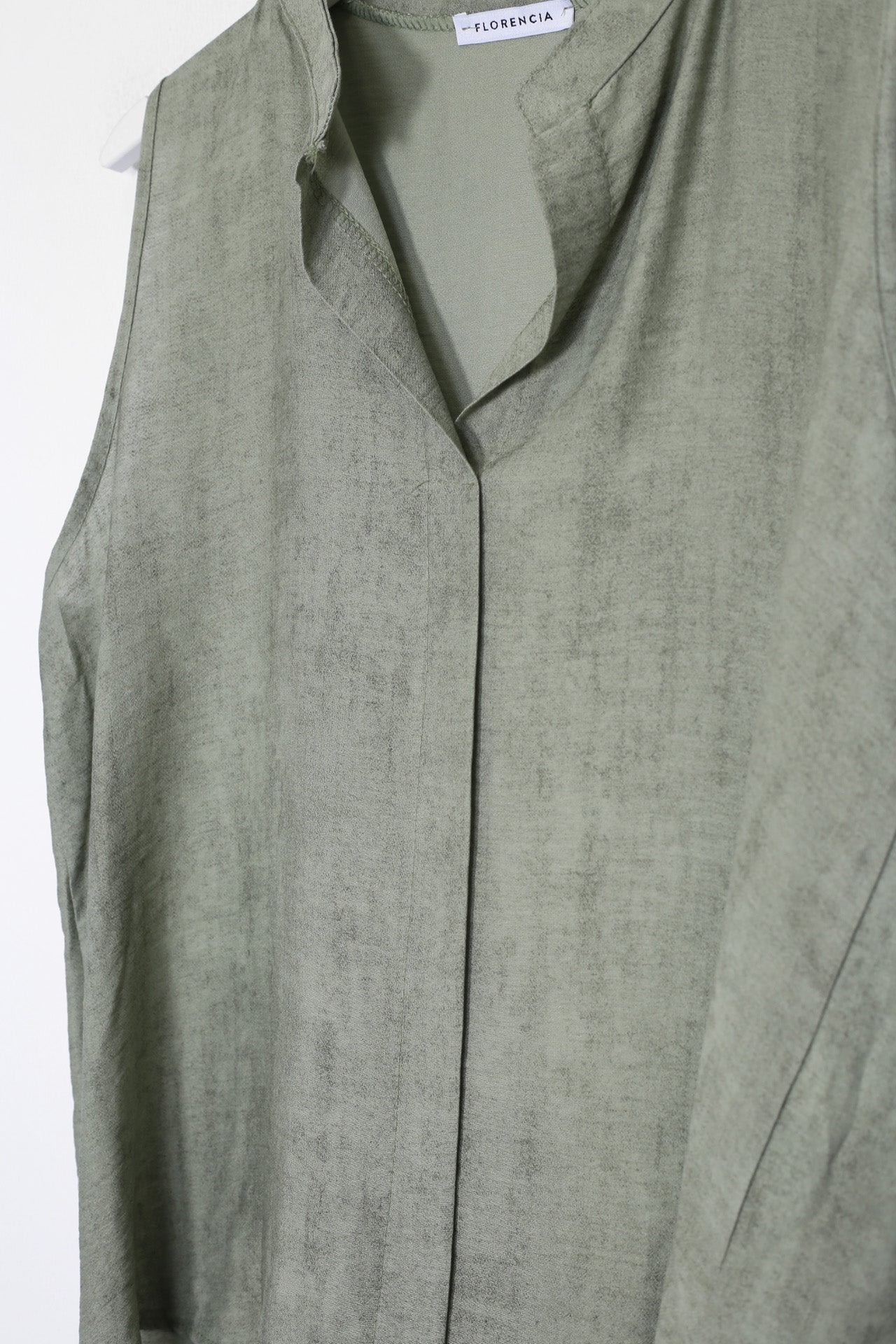 Top sin mangas con cuello mao y escote en punta. Cierre frontal con botones ocultos. Bajo asimétrico.