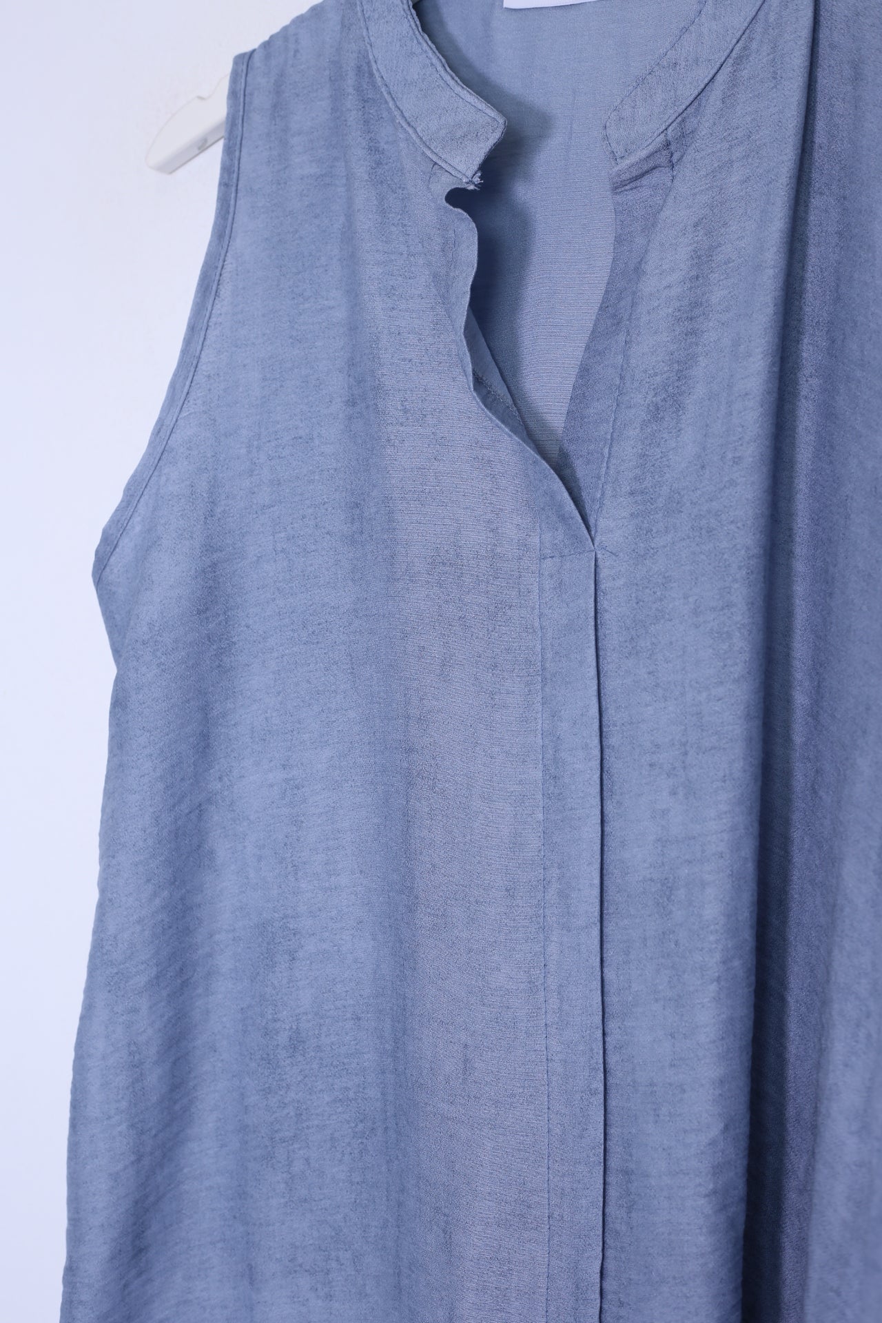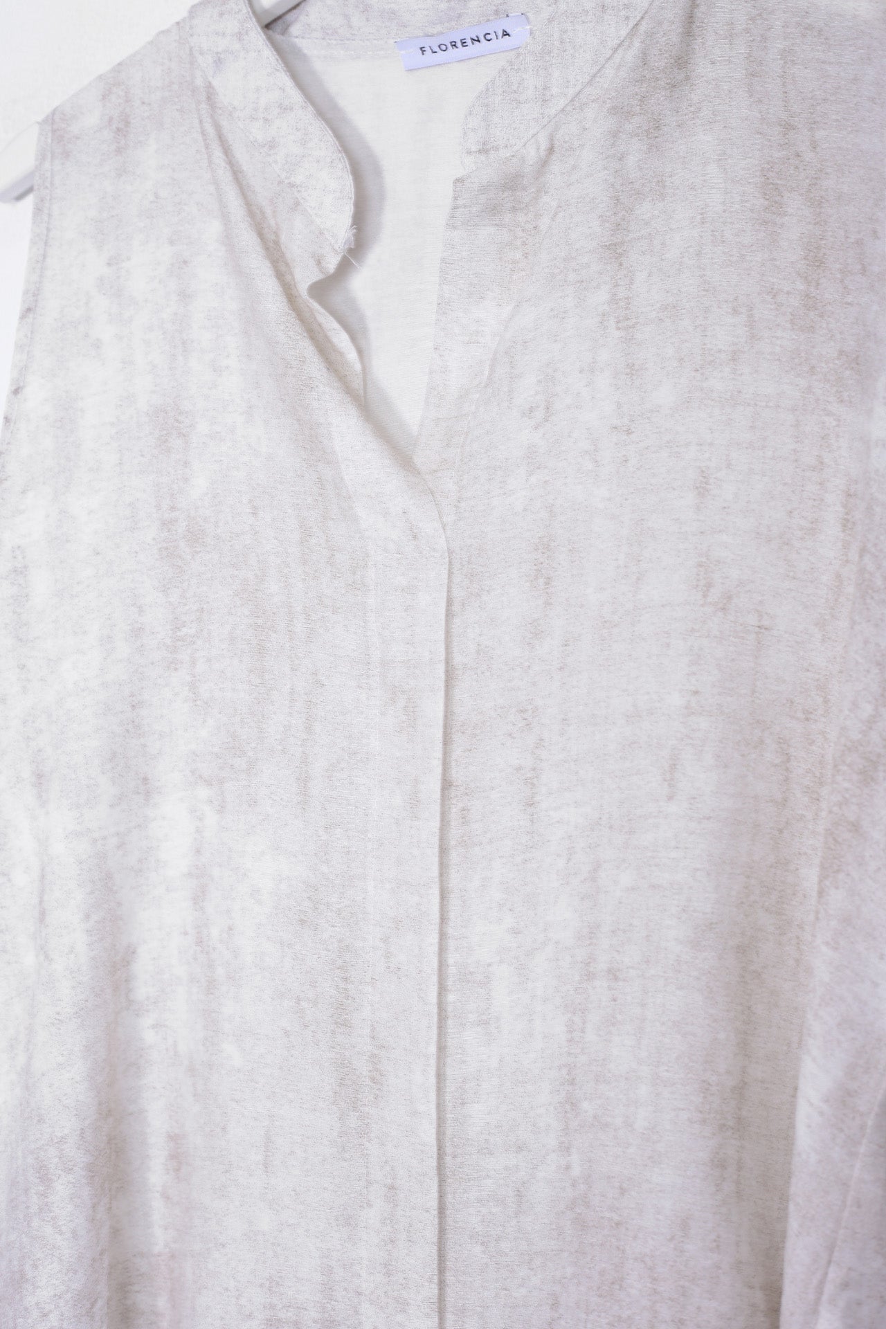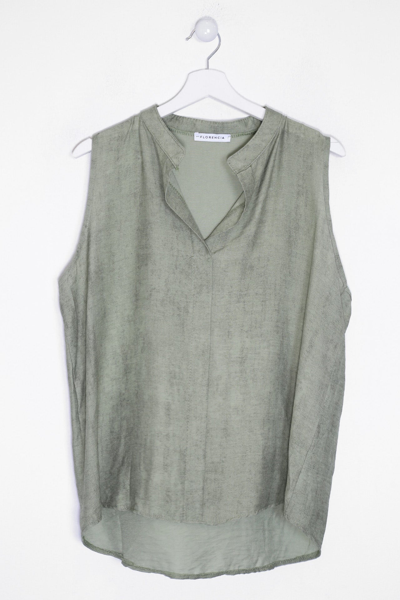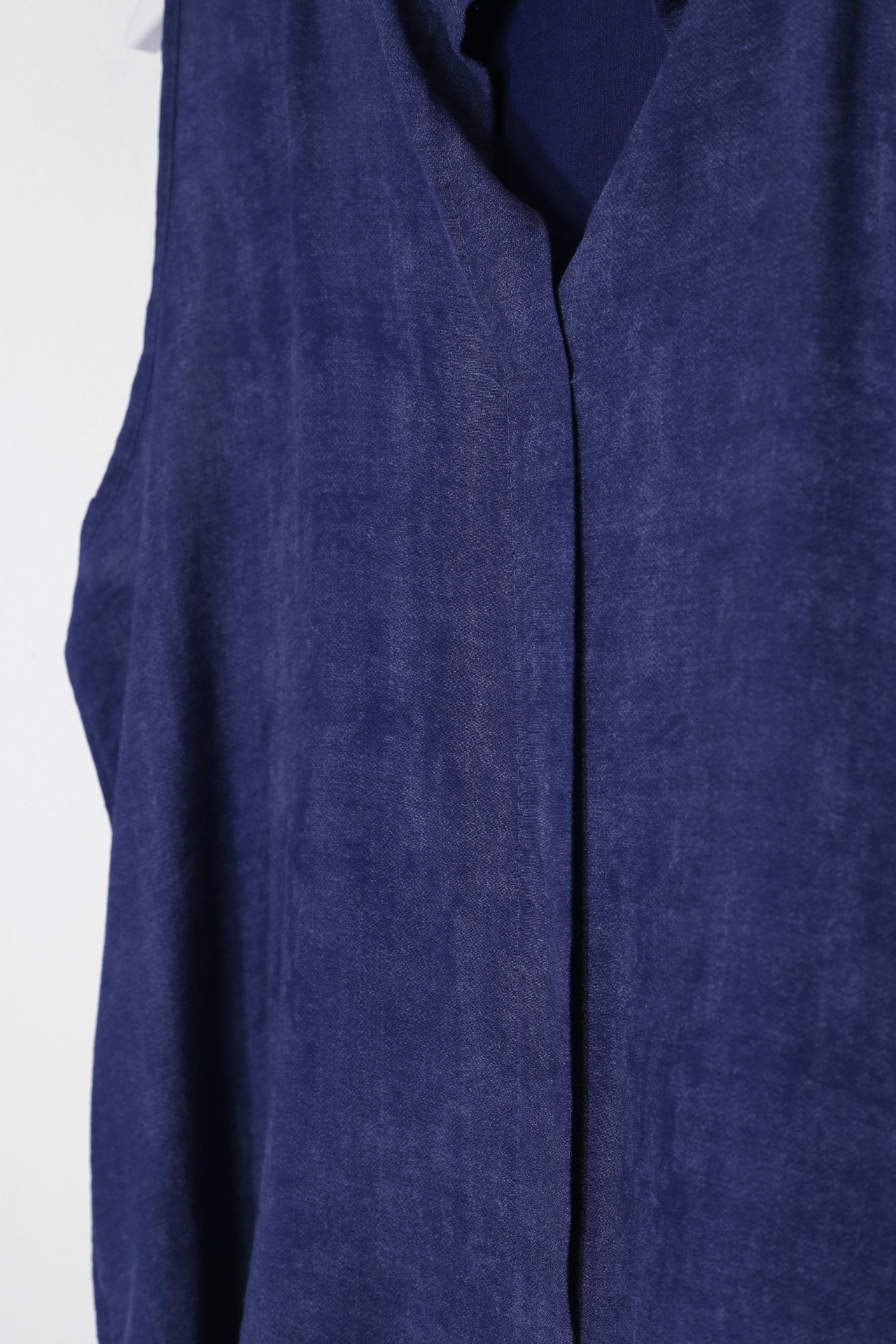 Top sin mangas con cuello mao y escote en punta. Cierre frontal con botones ocultos. Bajo asimétrico.