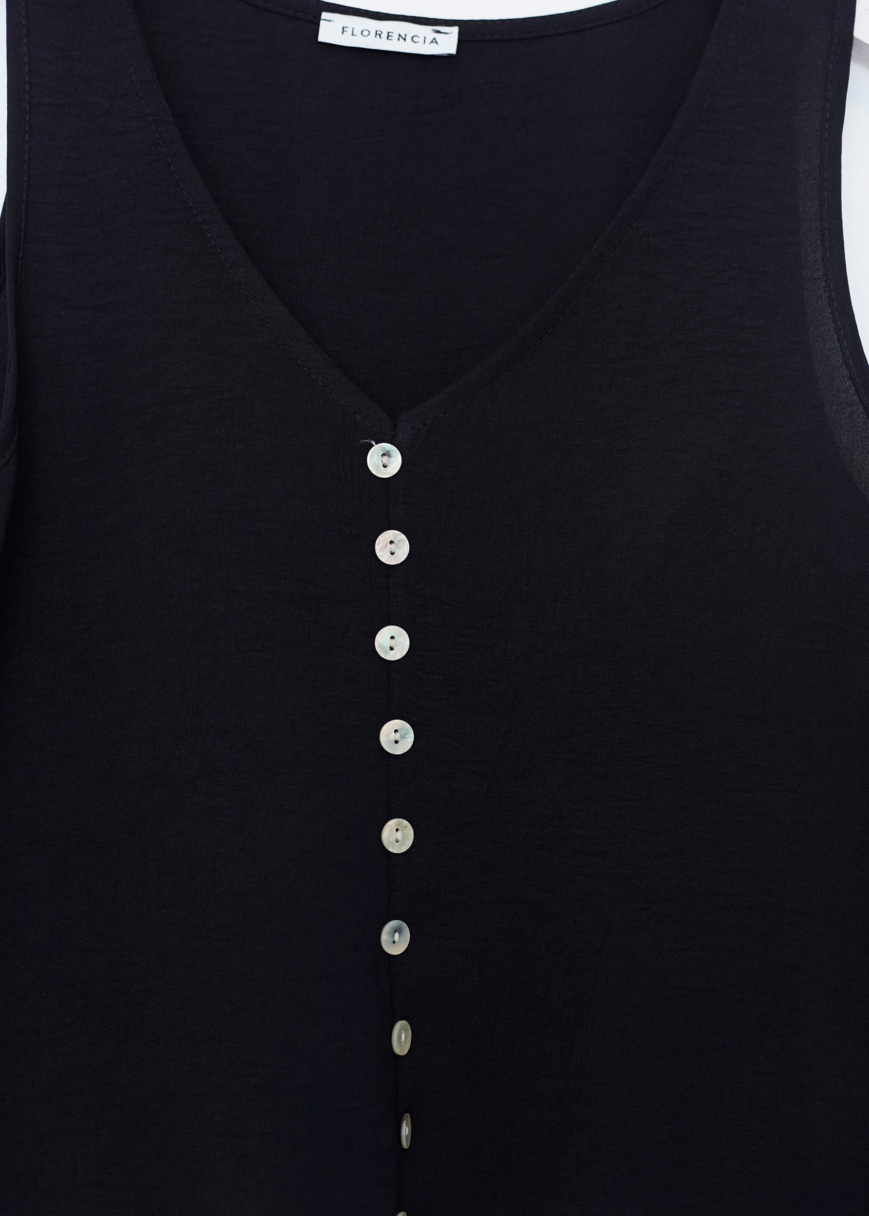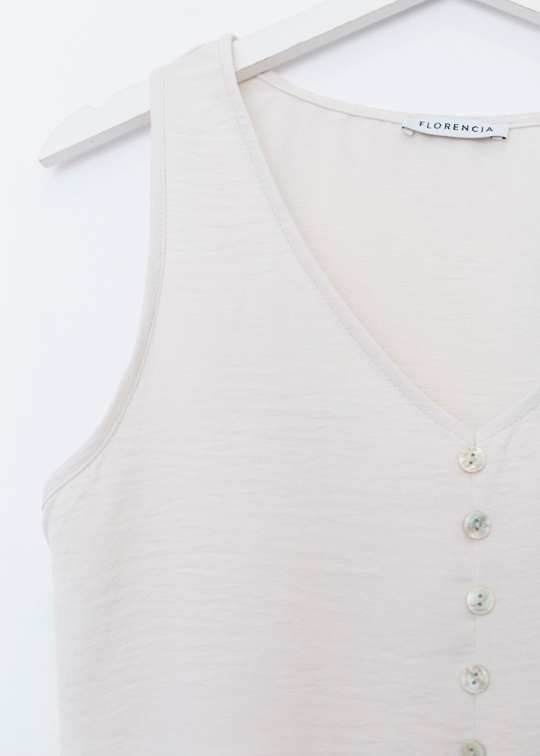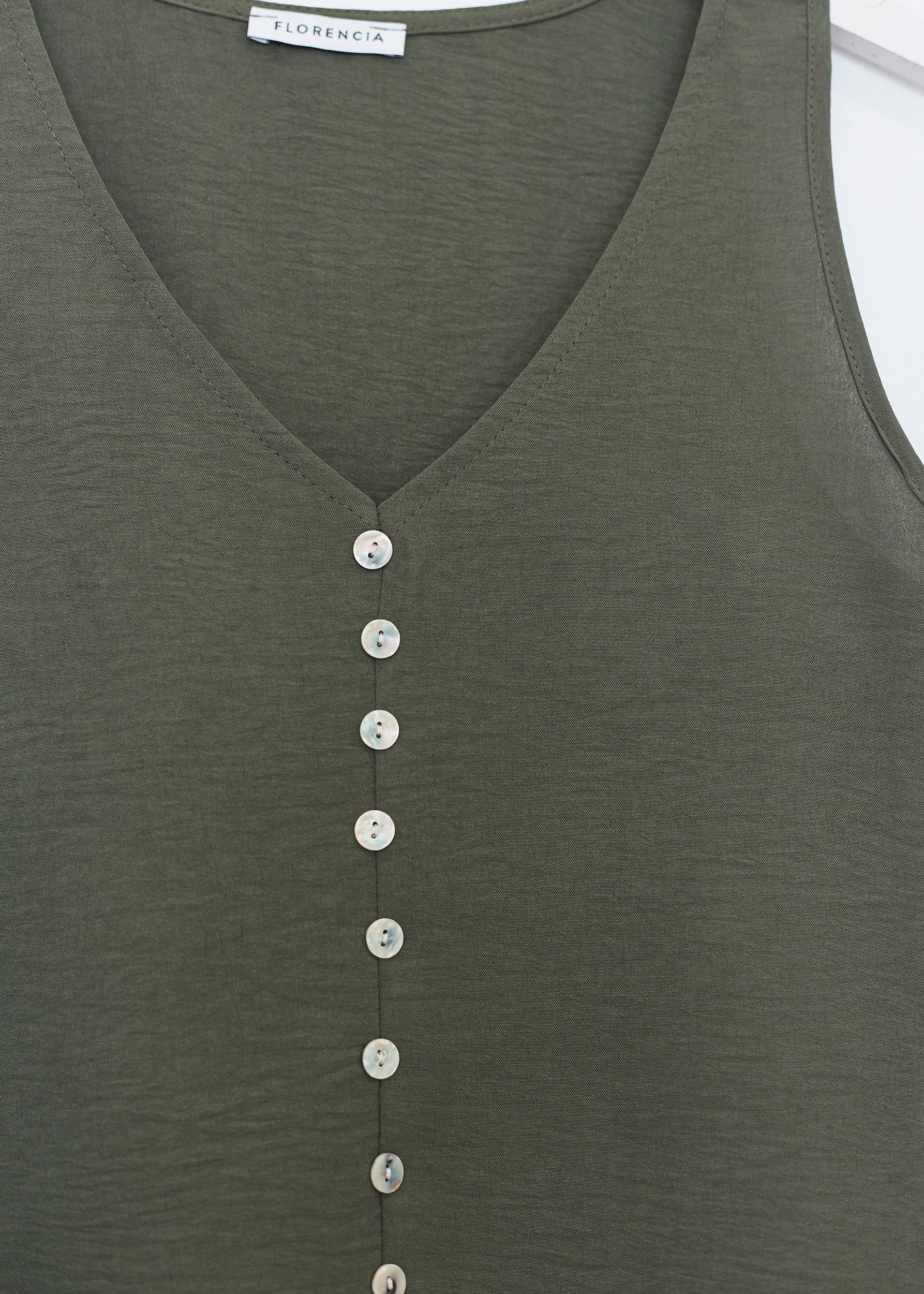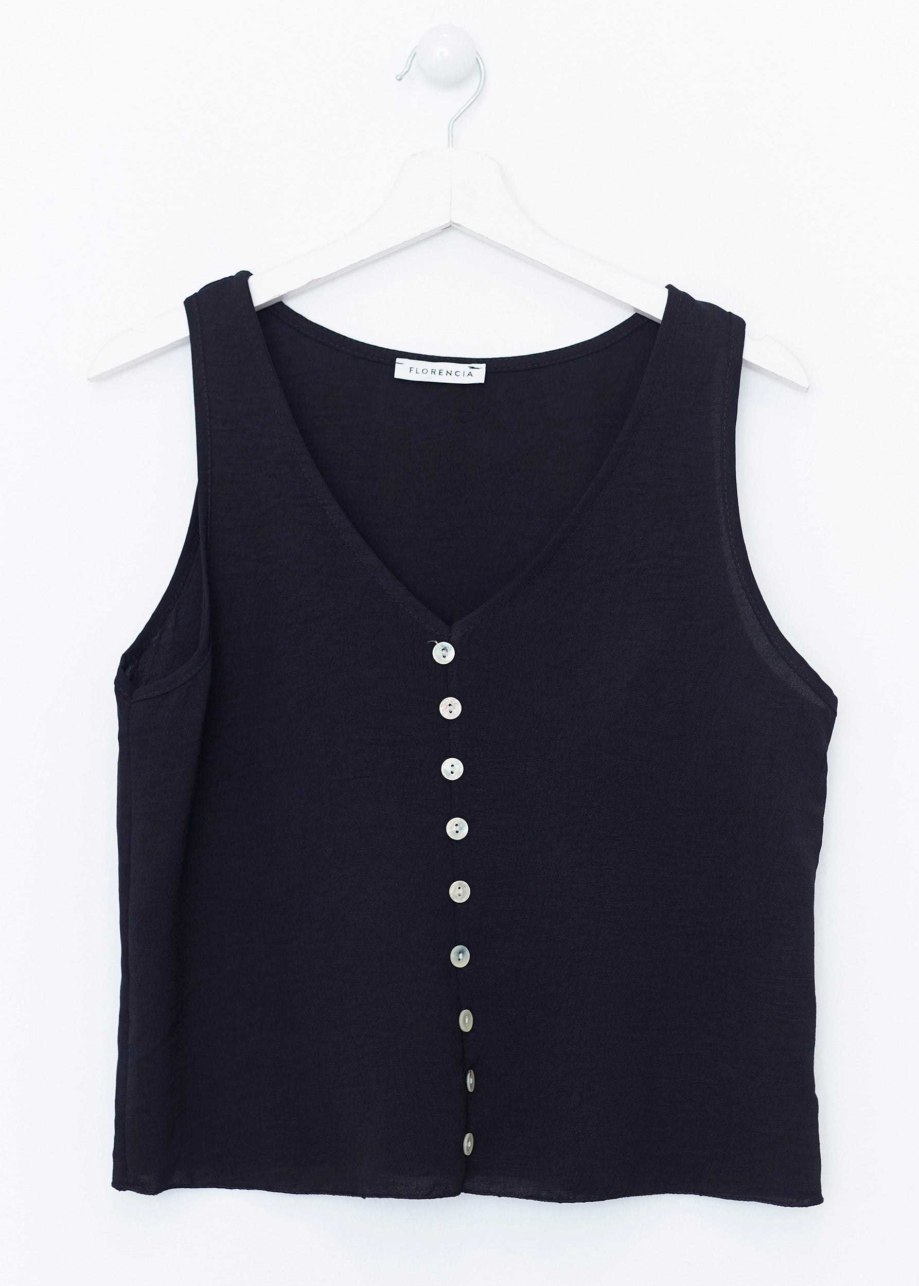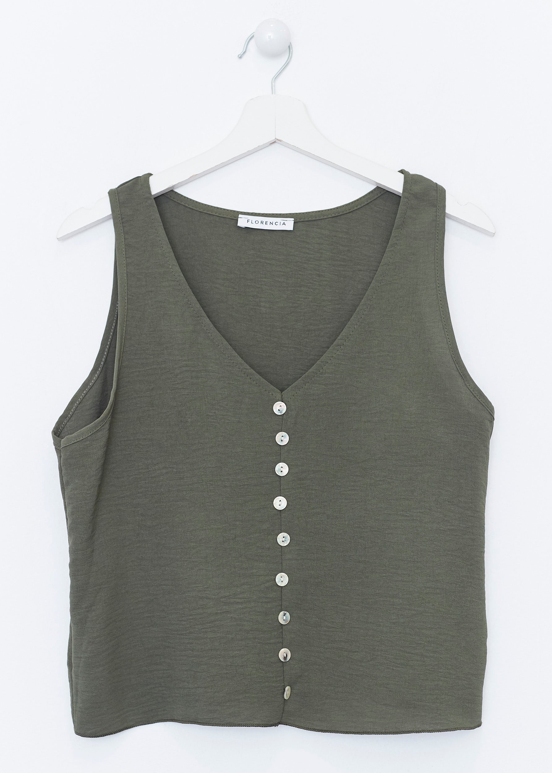 Top con escote en punta y tirantes anchos. Detalle de falsos botones en la parte delantera.