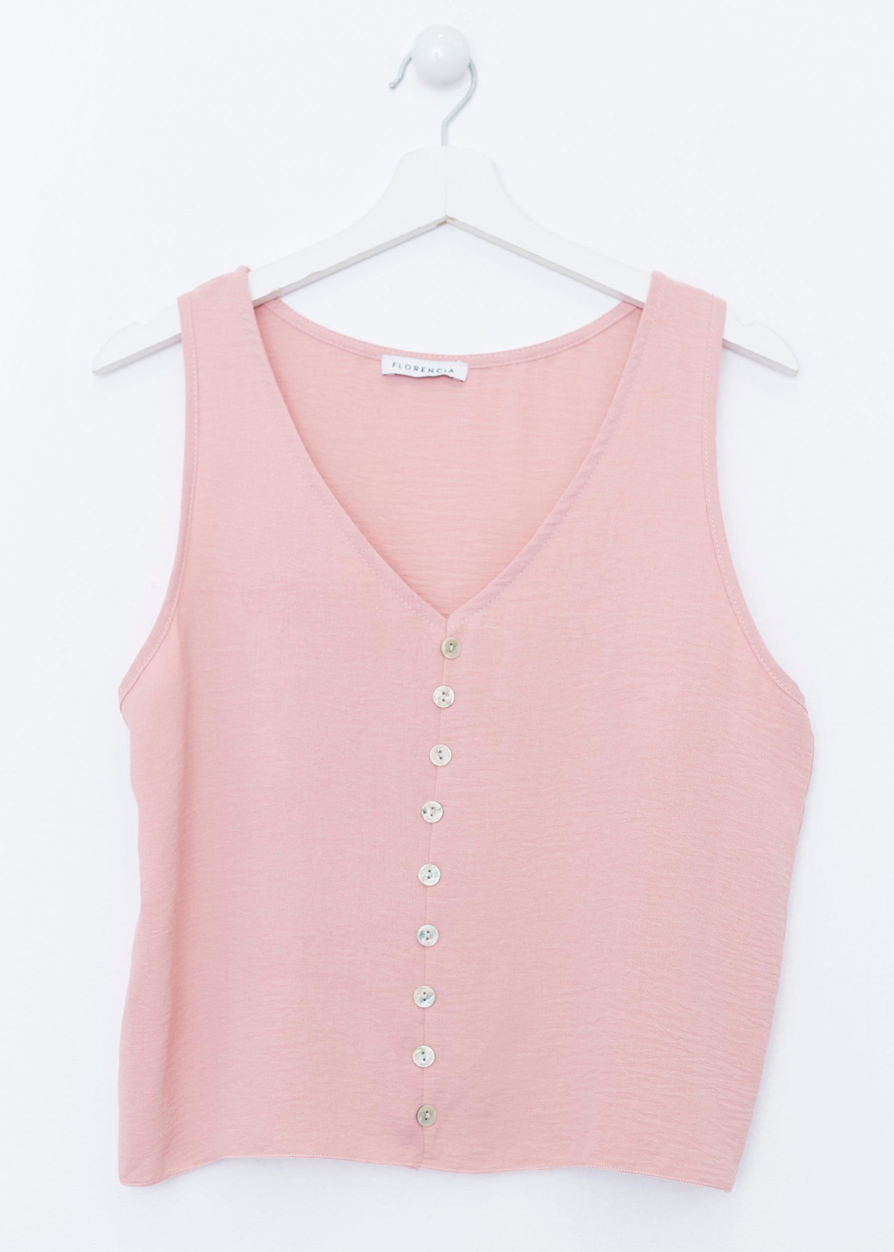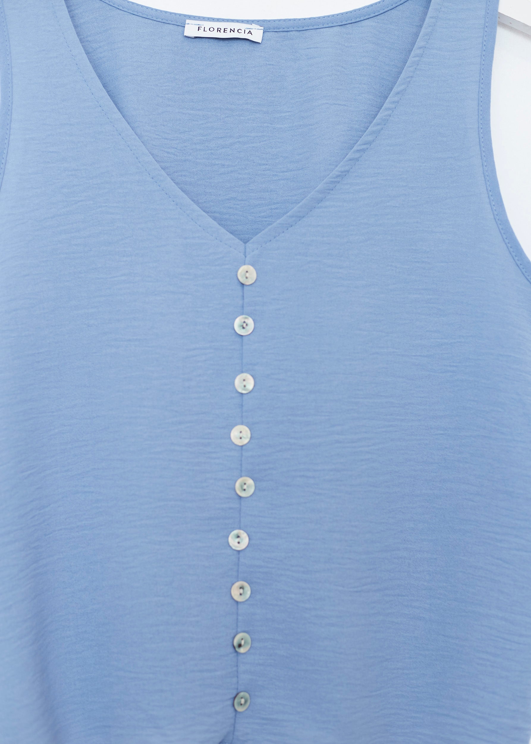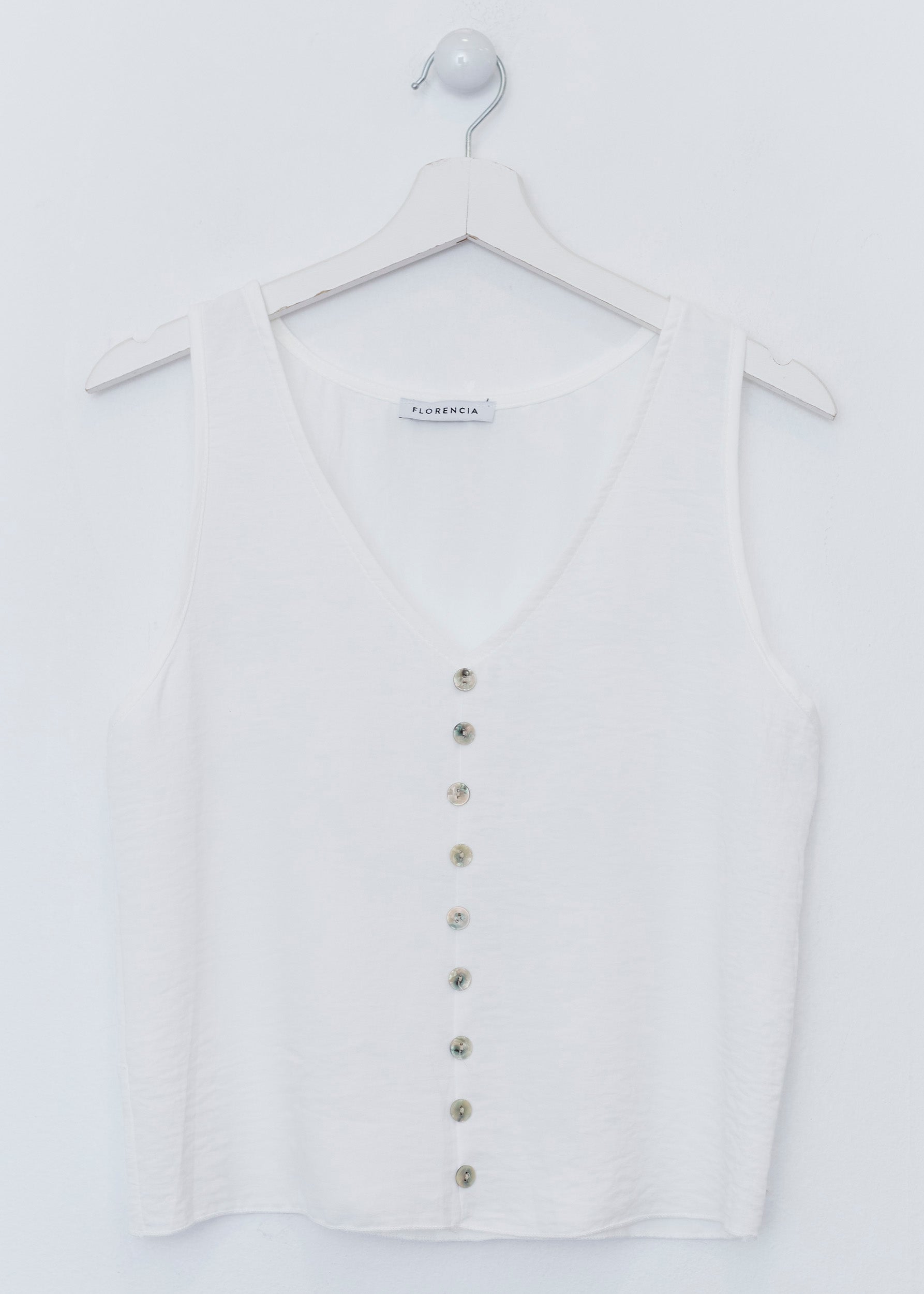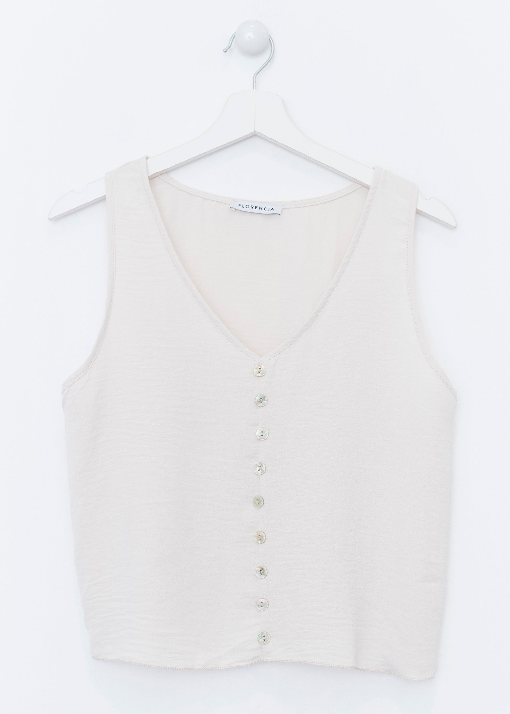 Top con escote en punta y tirantes anchos. Detalle de falsos botones en la parte delantera.