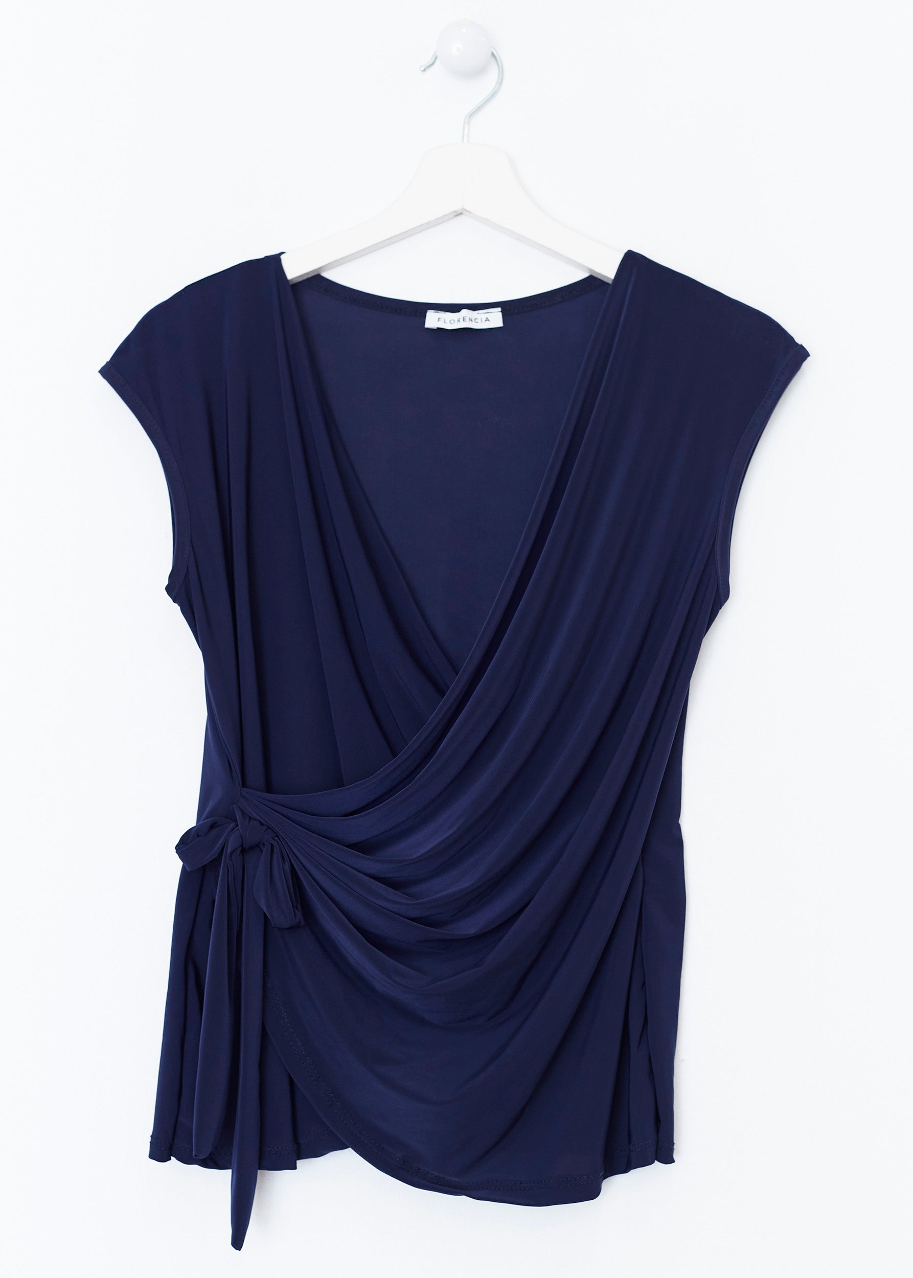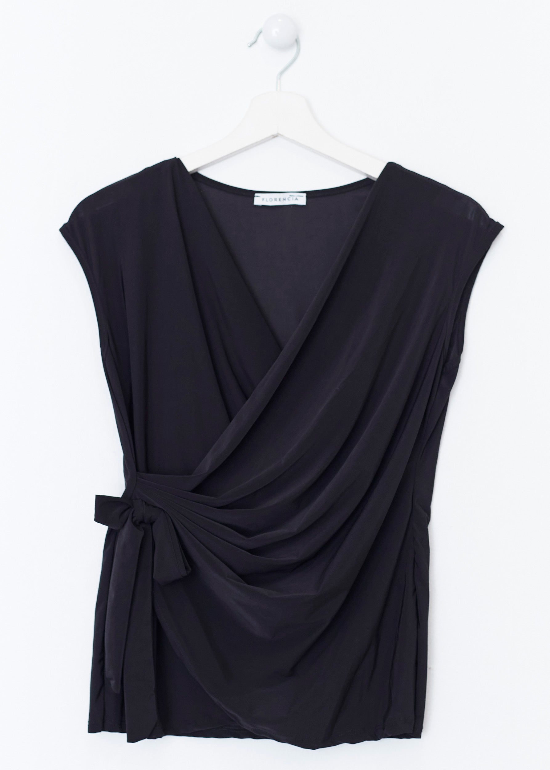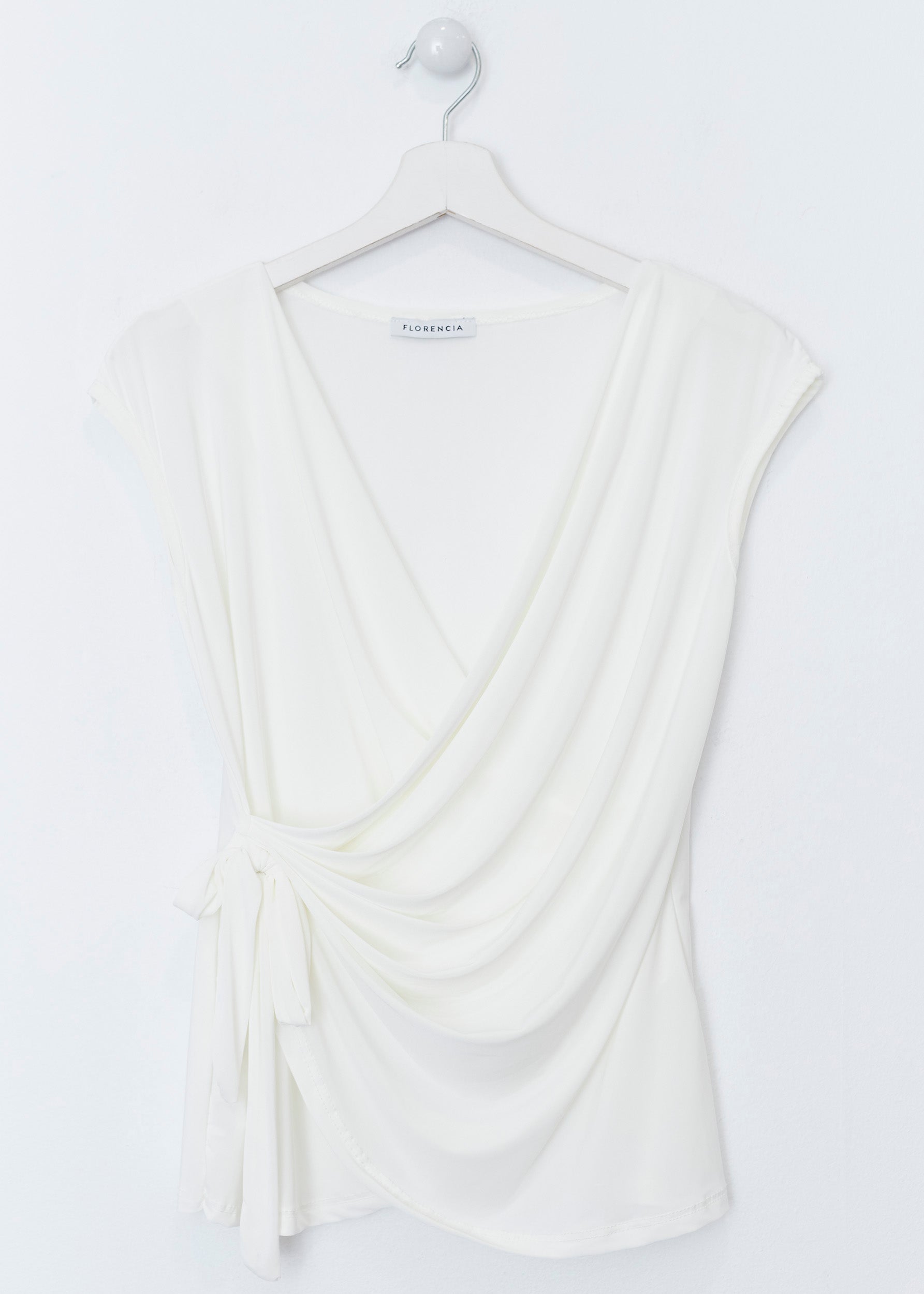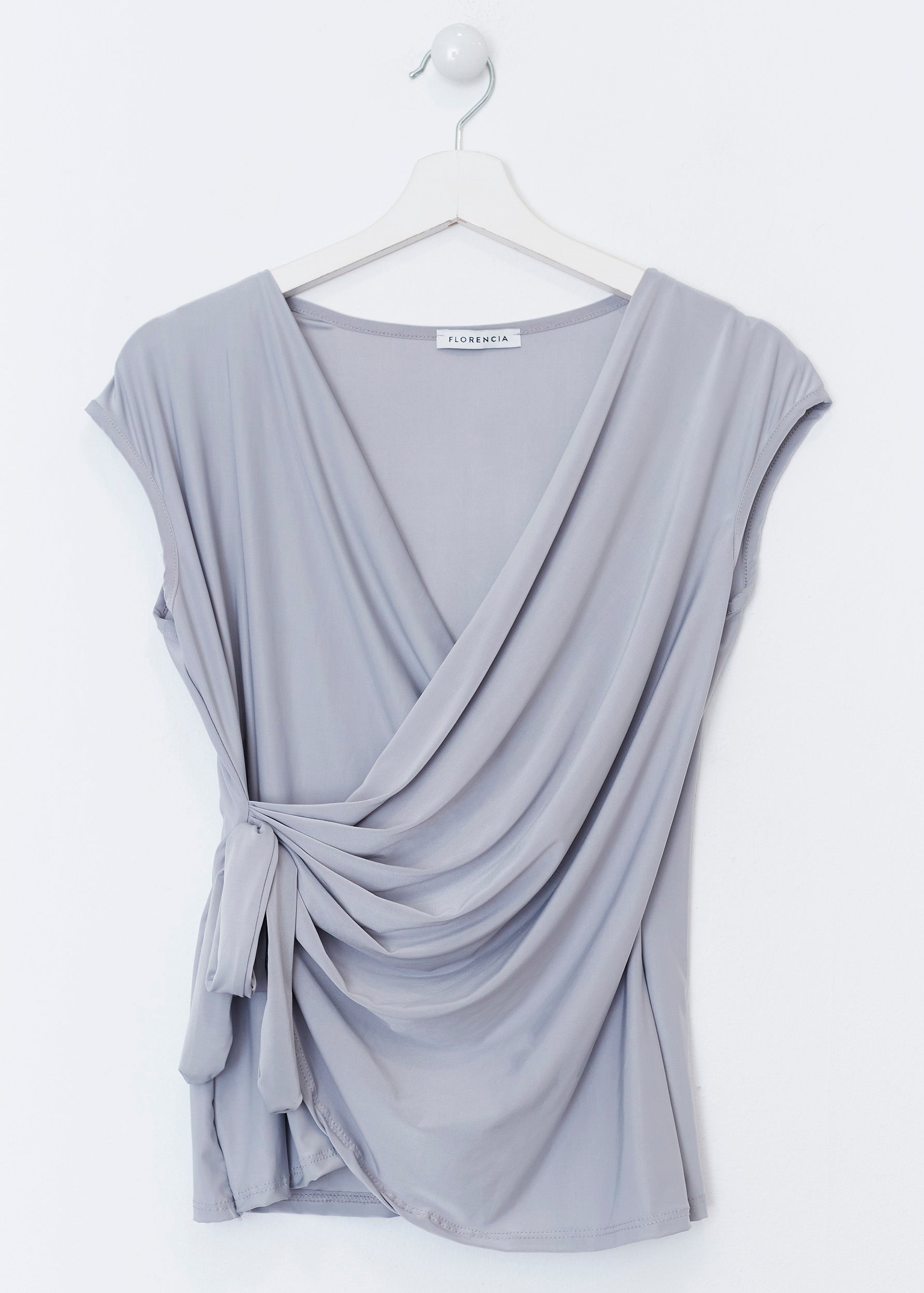 Top de manga sisa y escote en punta cruzado con detalle de lazo en lateral. Textura fluida.