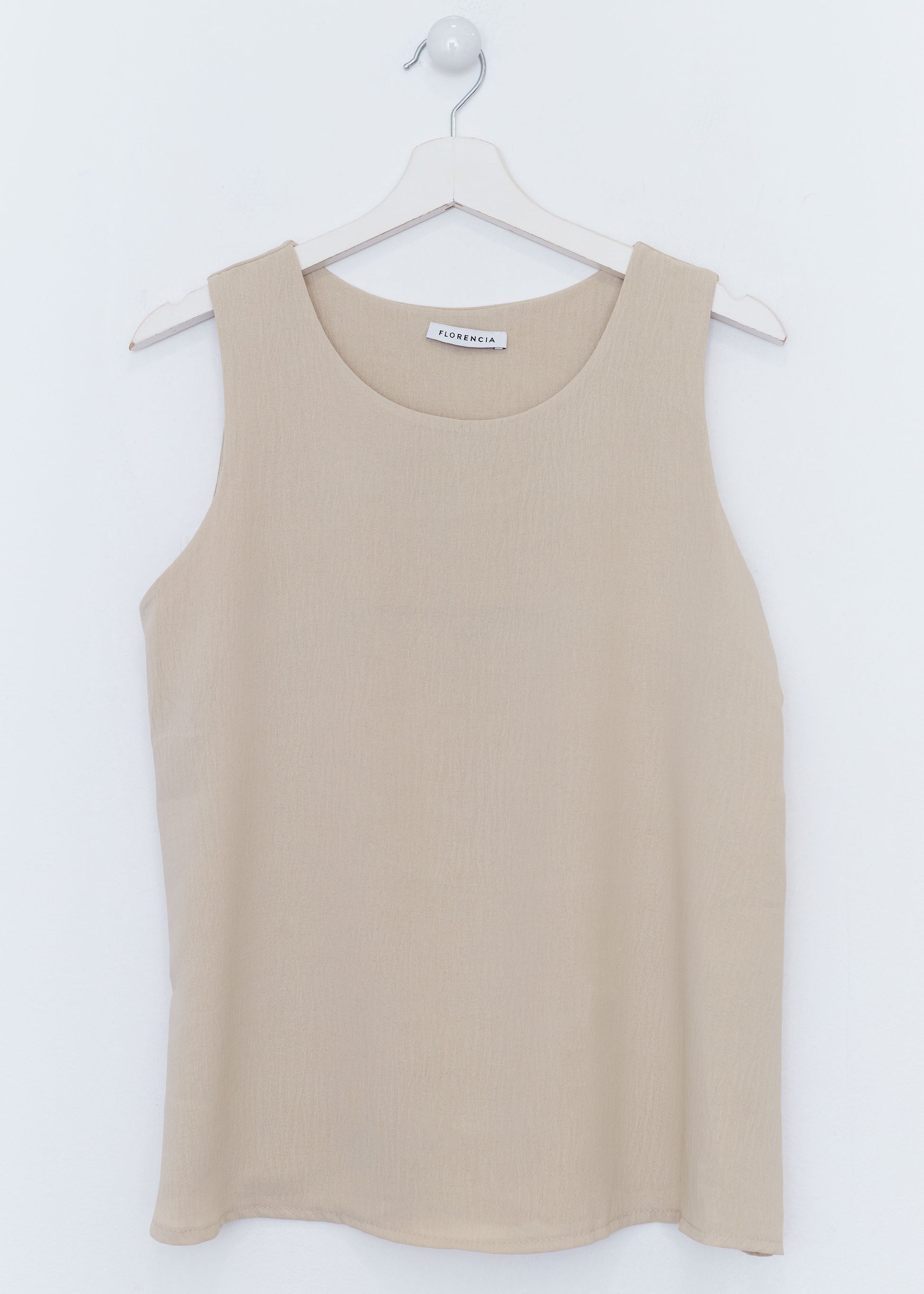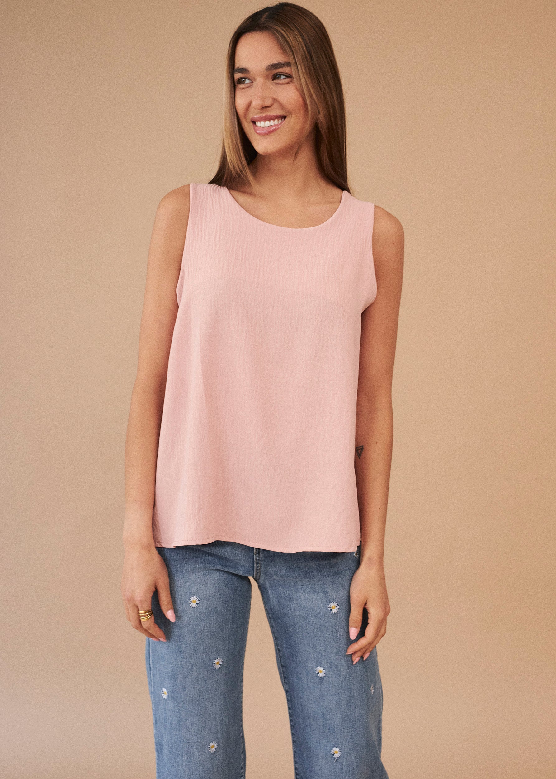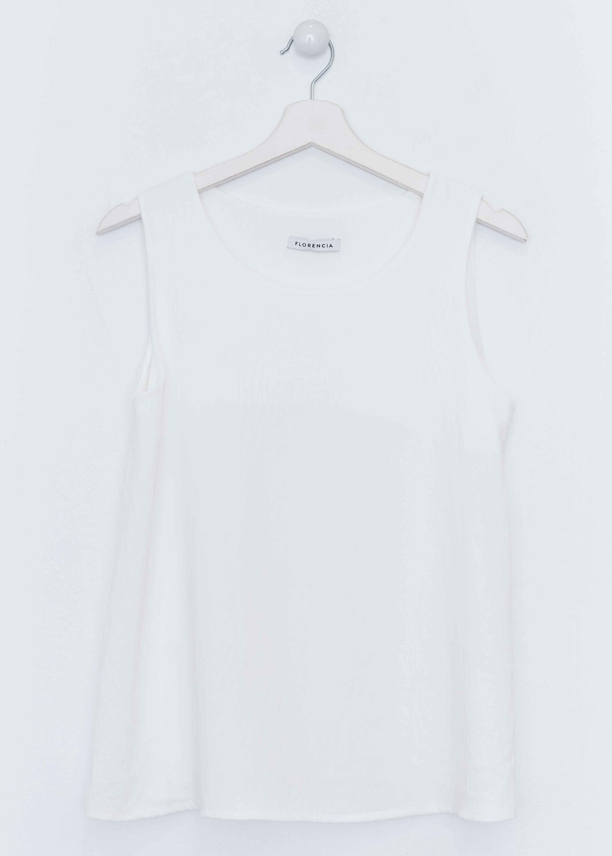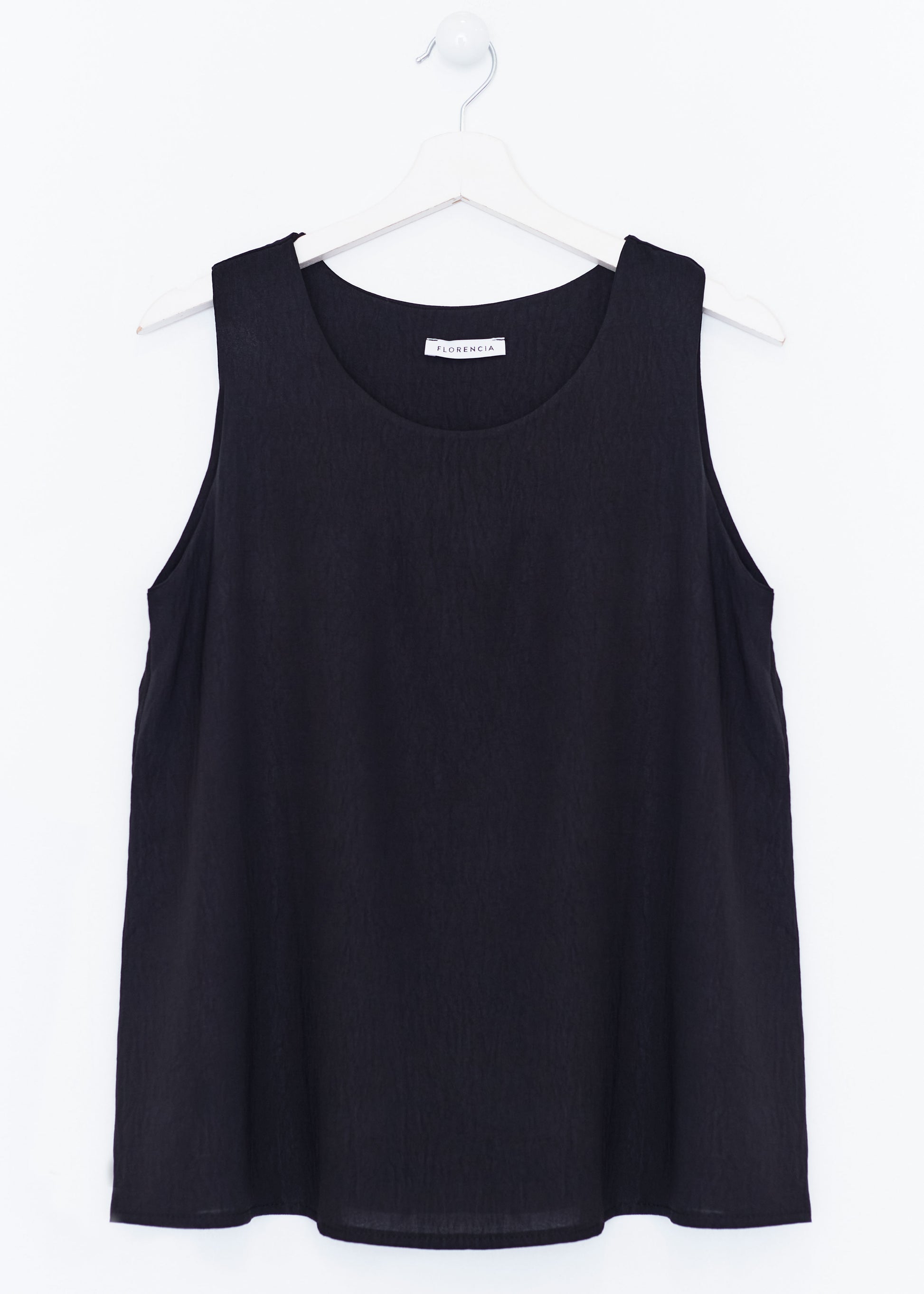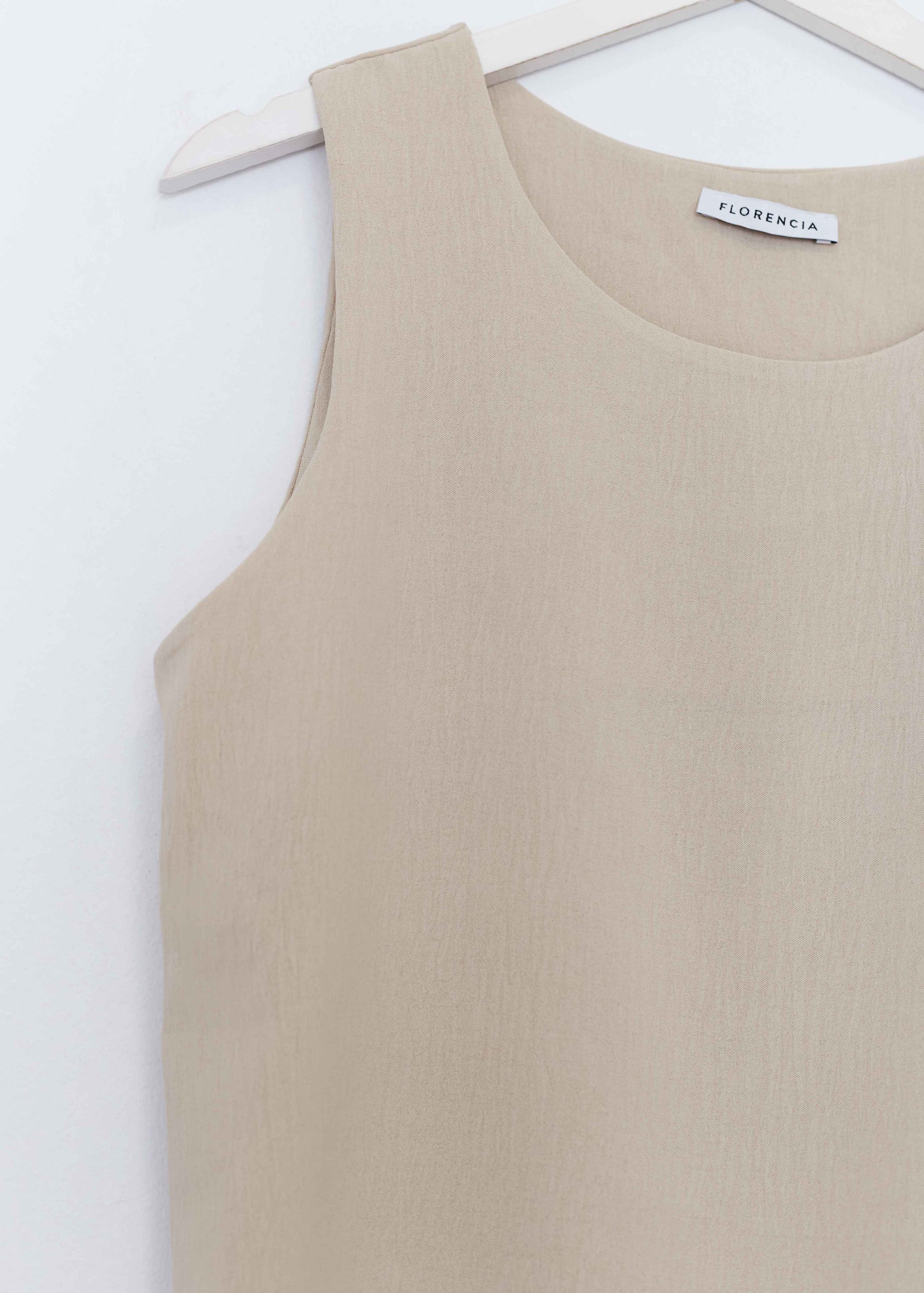 Top con cuello redondo y tirantes anchos. Corte amplio y fluido.
