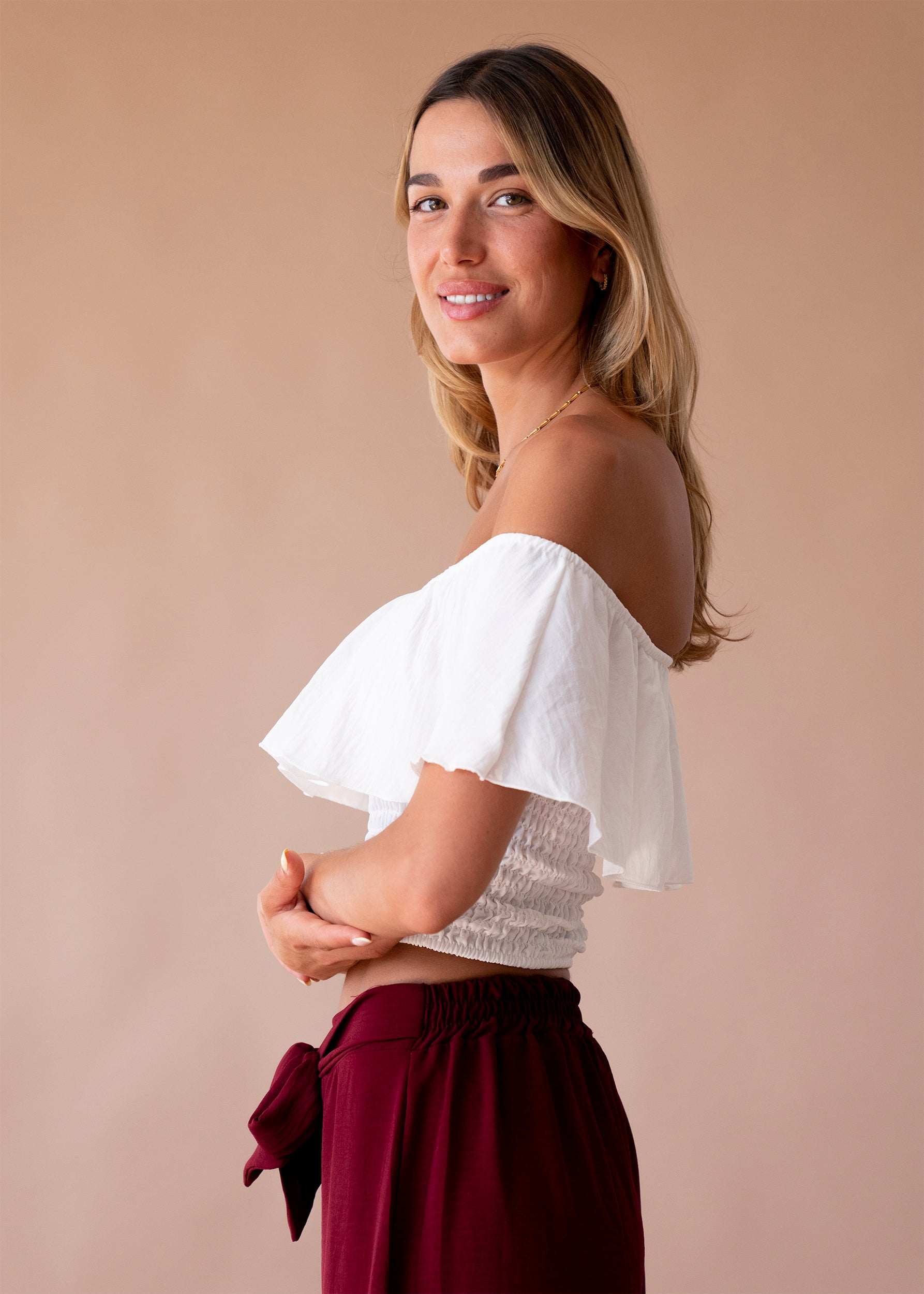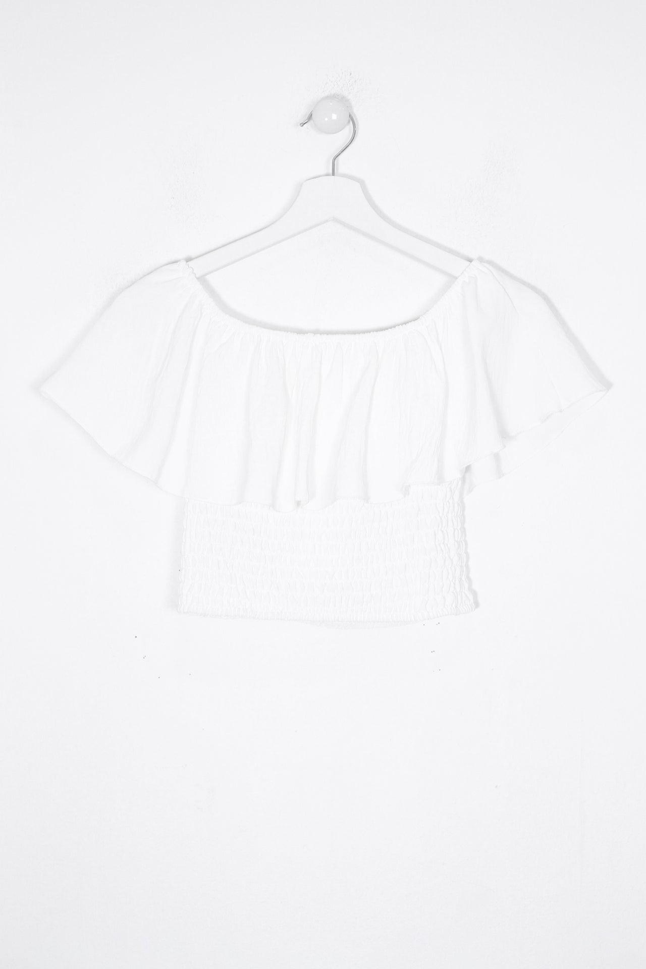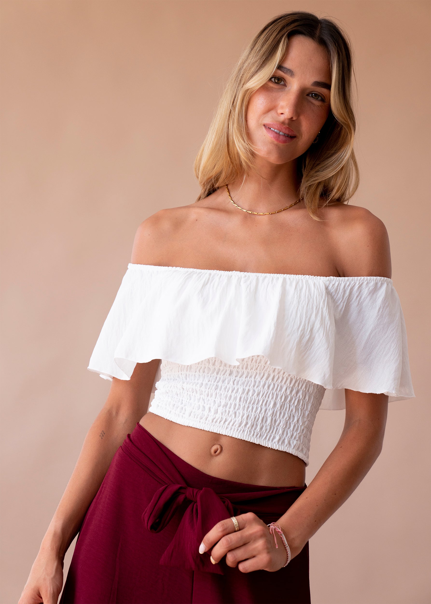 Top de escote recto y elástico con hombros descubiertos. Cuerpo elástico tipo nido de abeja.