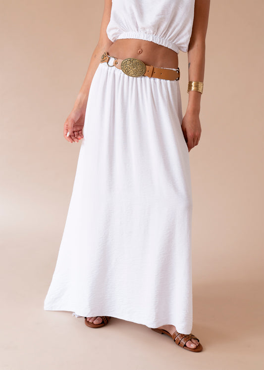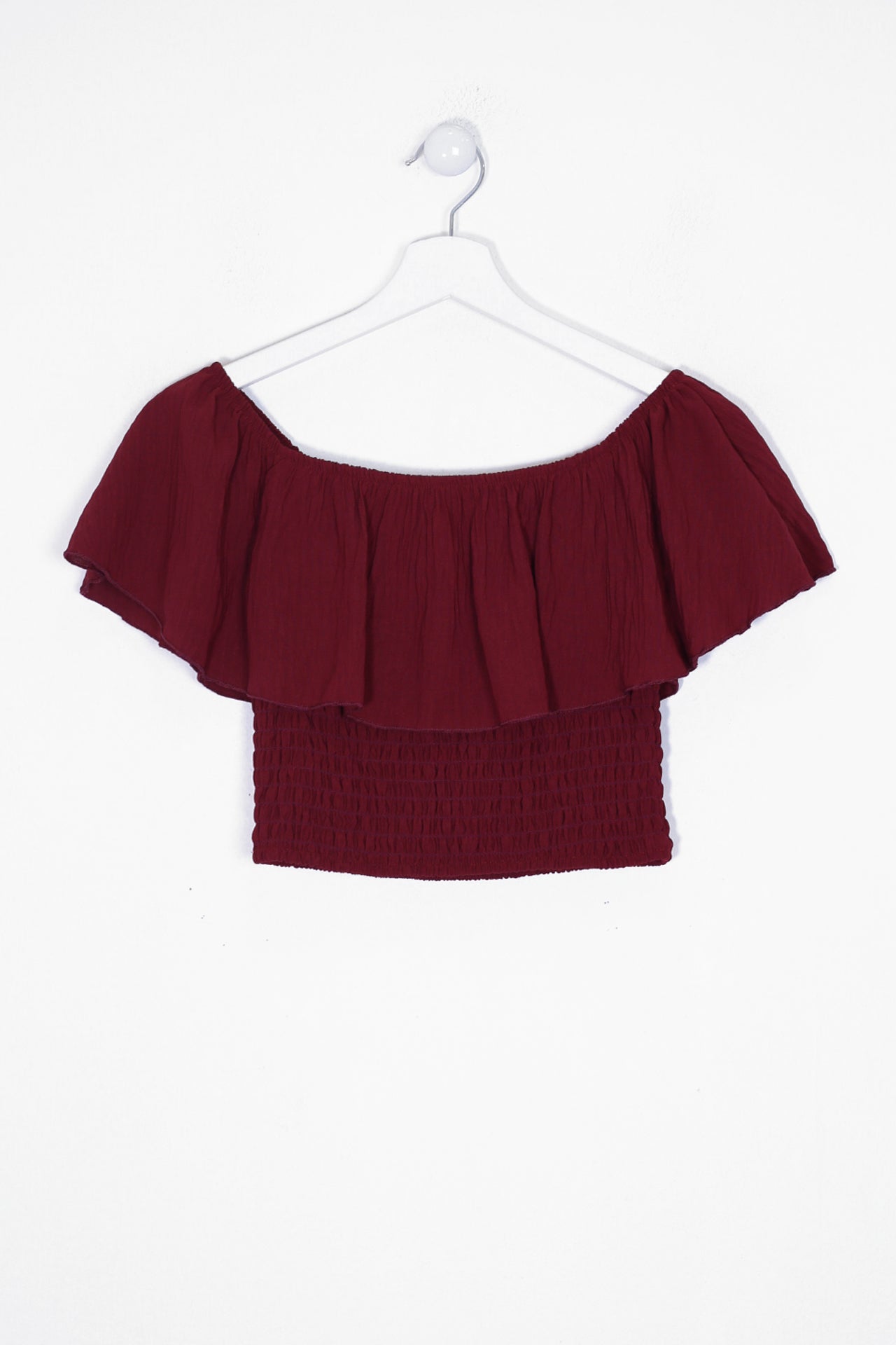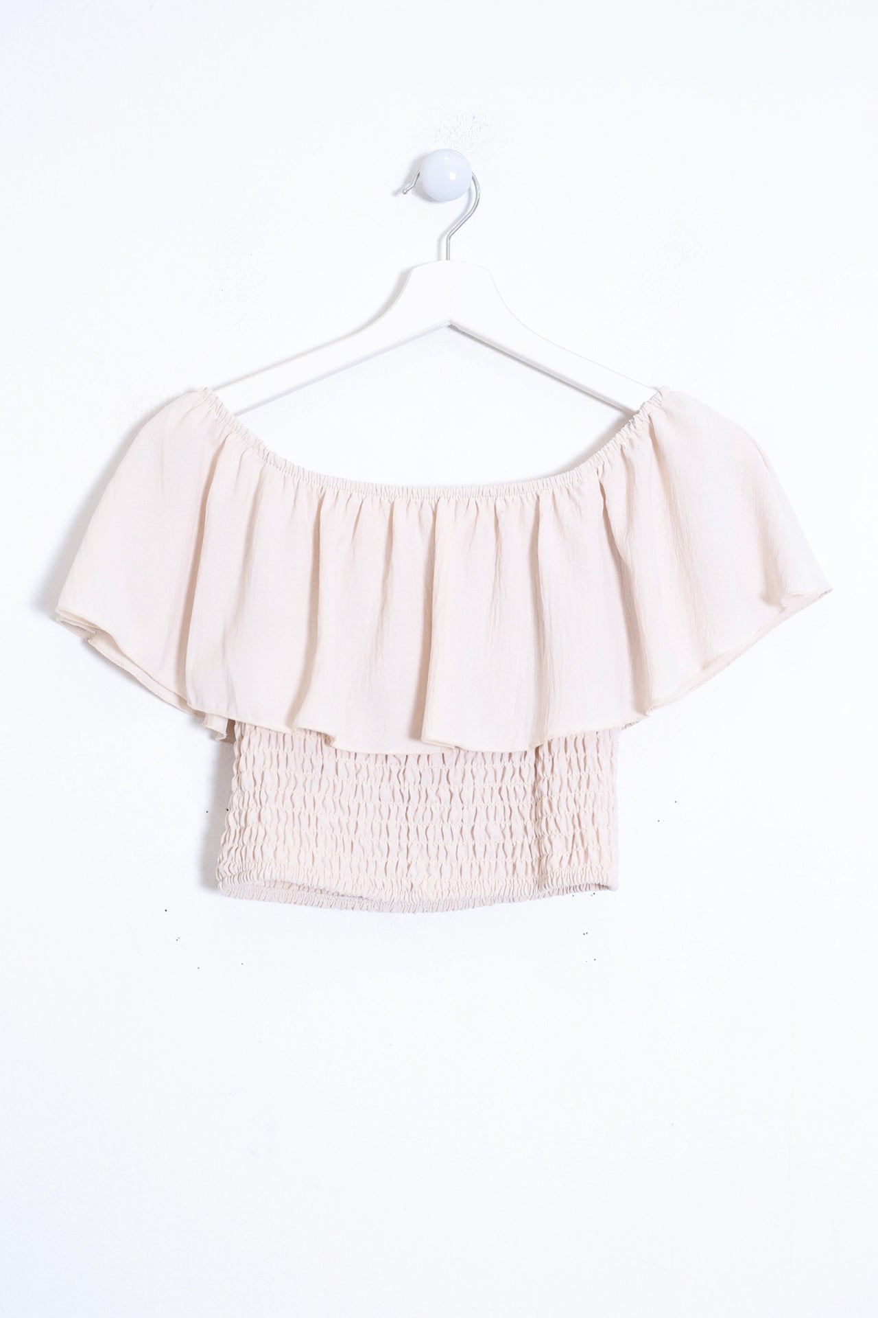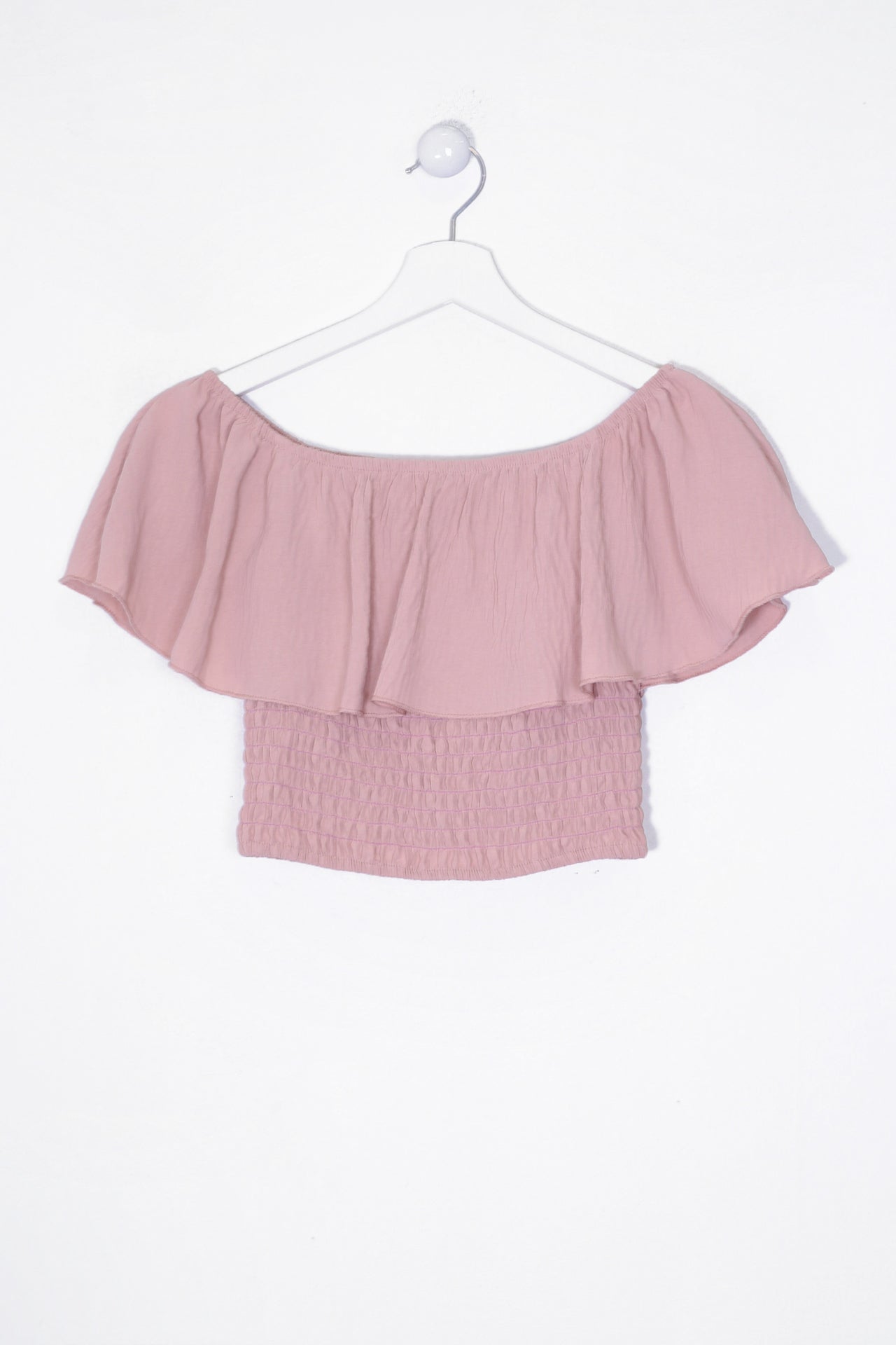 Top de escote recto y elástico con hombros descubiertos. Cuerpo elástico tipo nido de abeja.