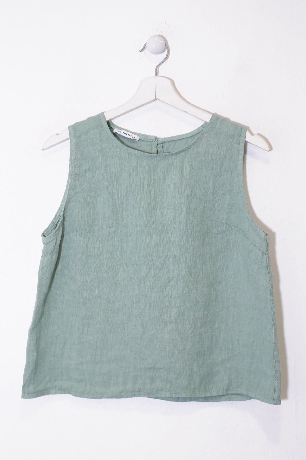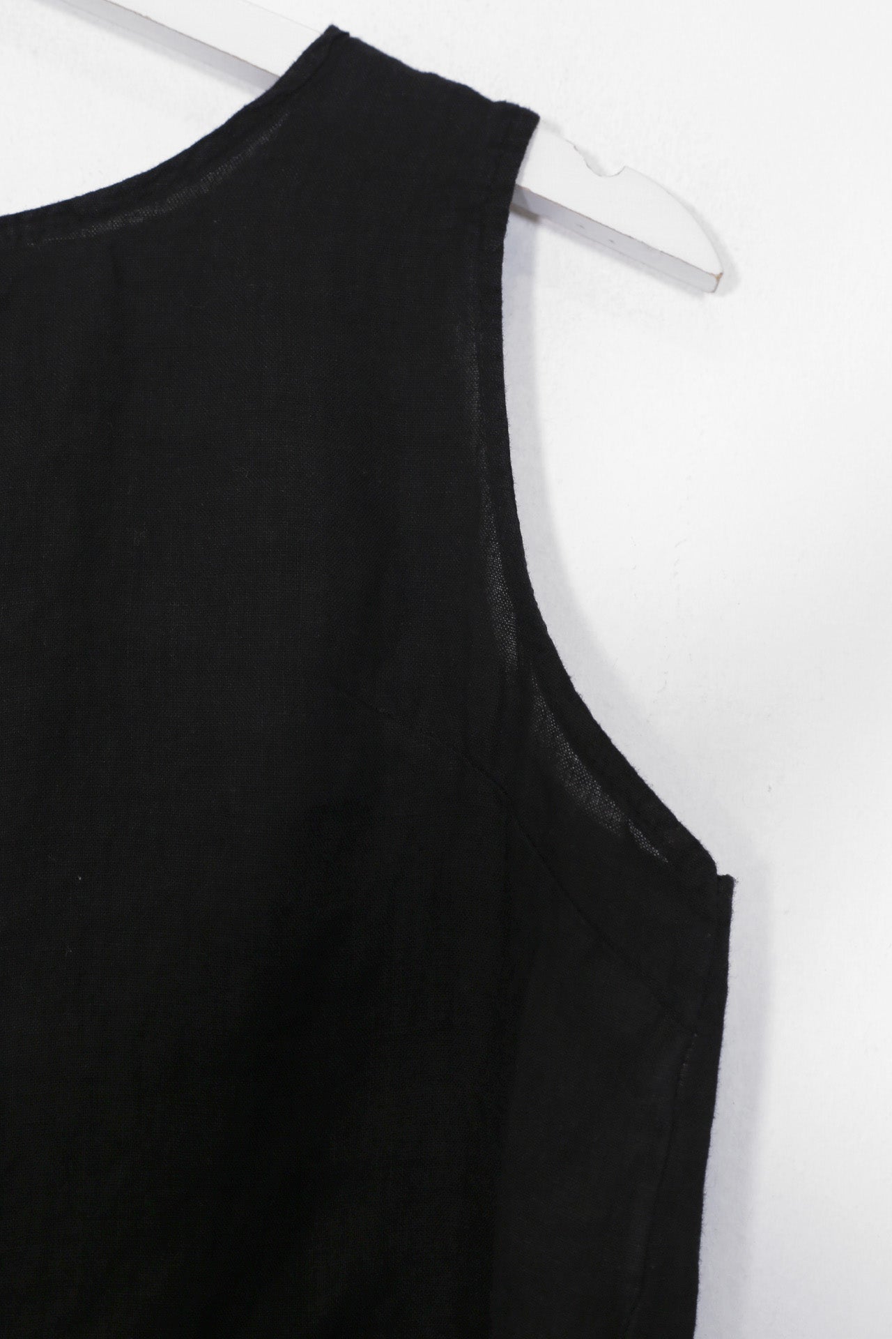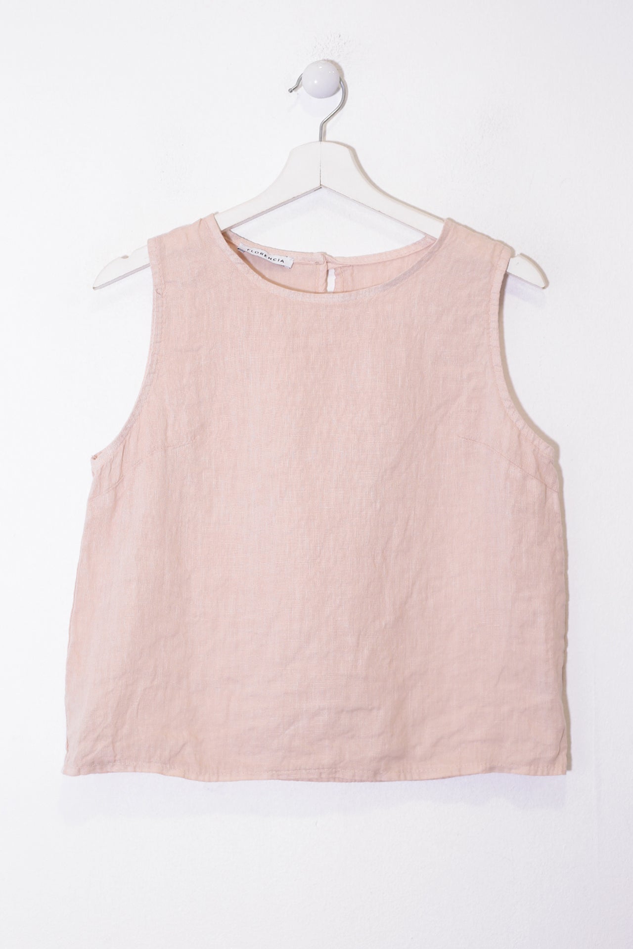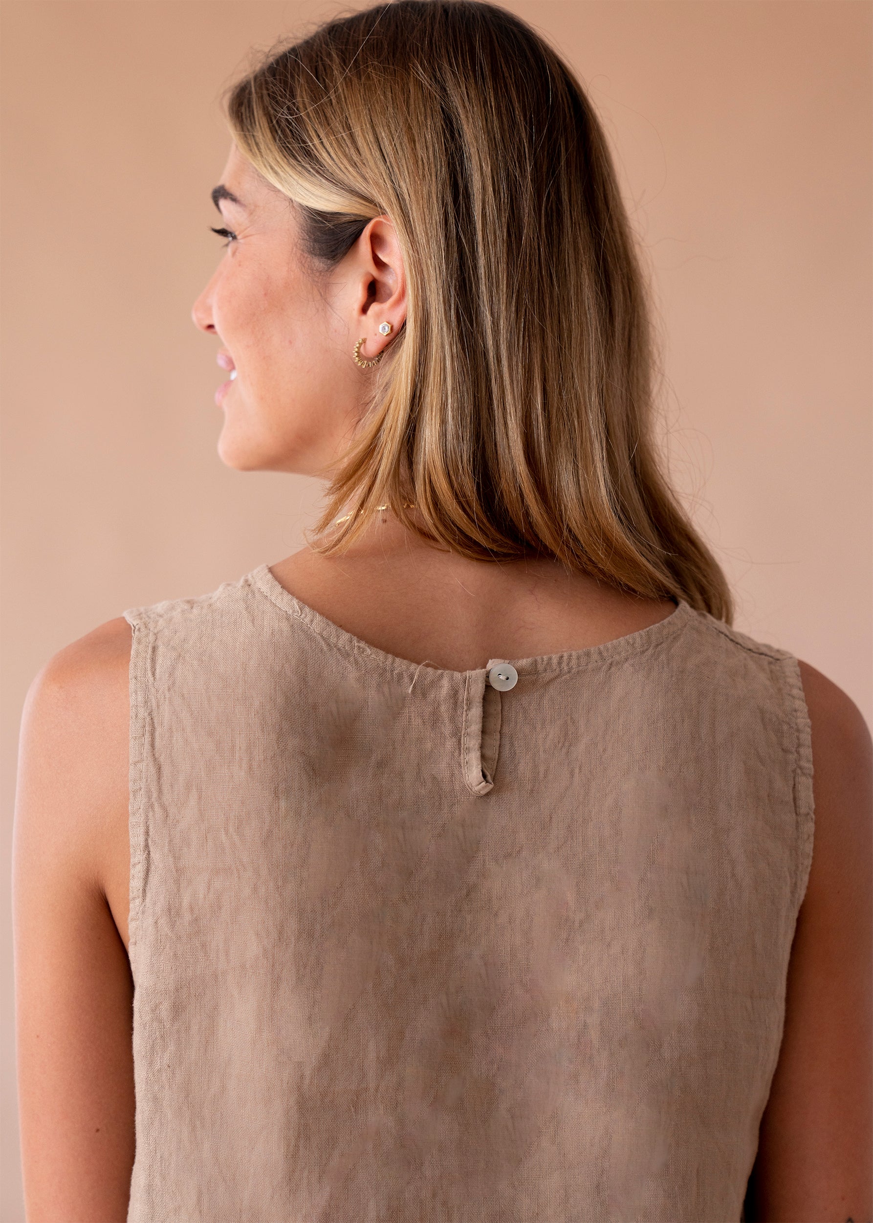 Top sin mangas con escote redondo. Detalle de abertura con botón en espalda.