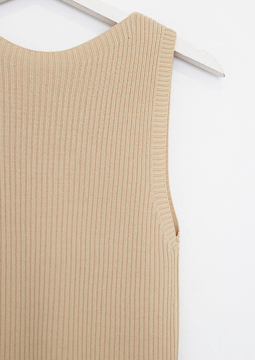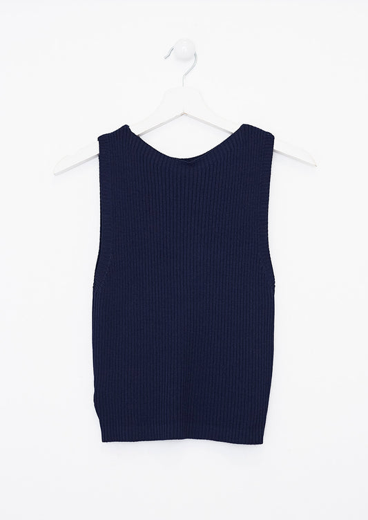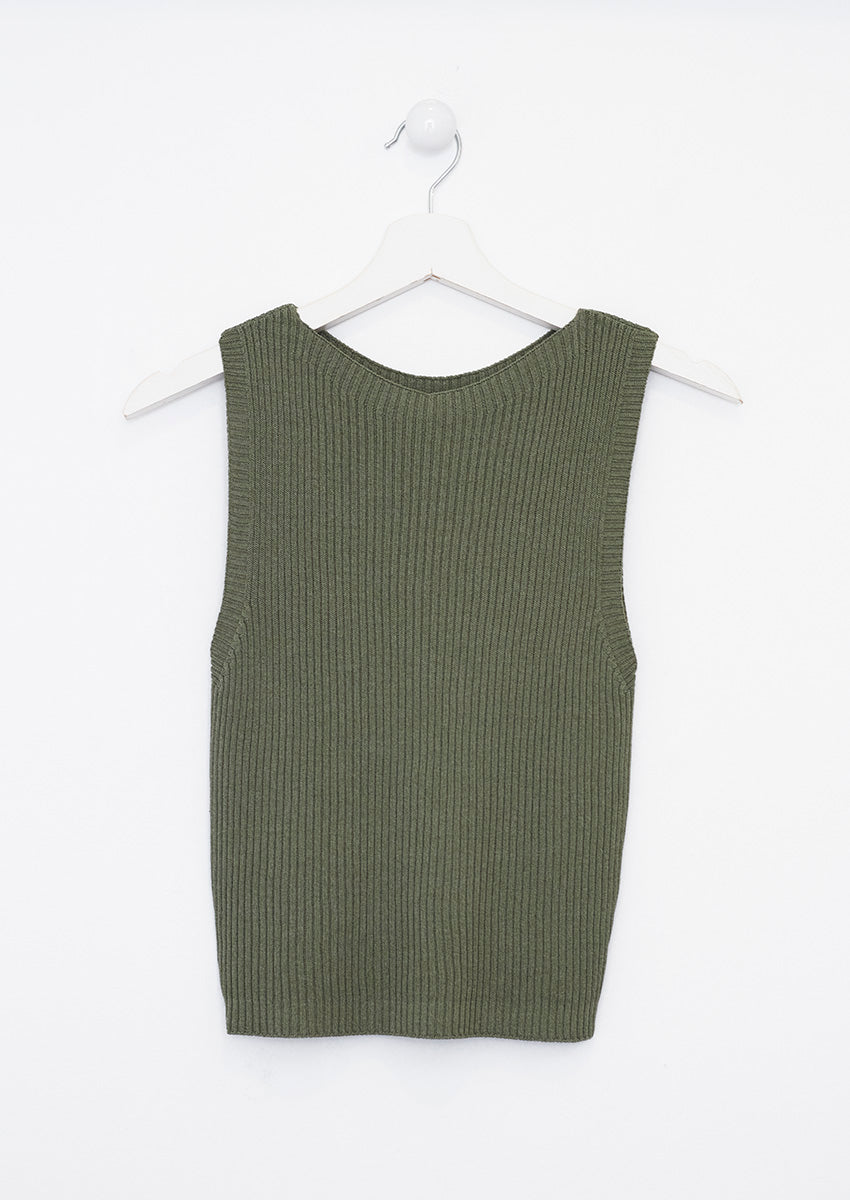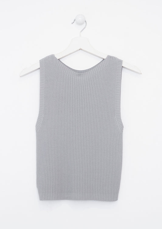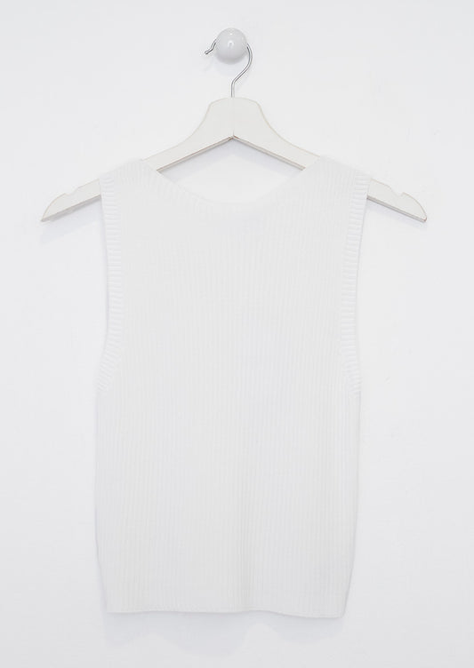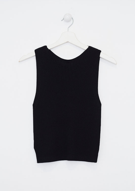 Top tricot amb coll rodó i sense mànigues. Acabats amb rib.