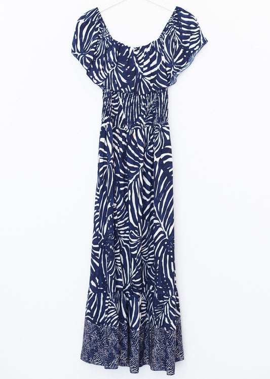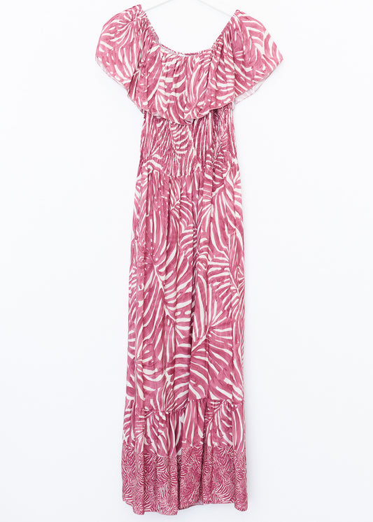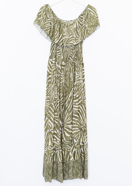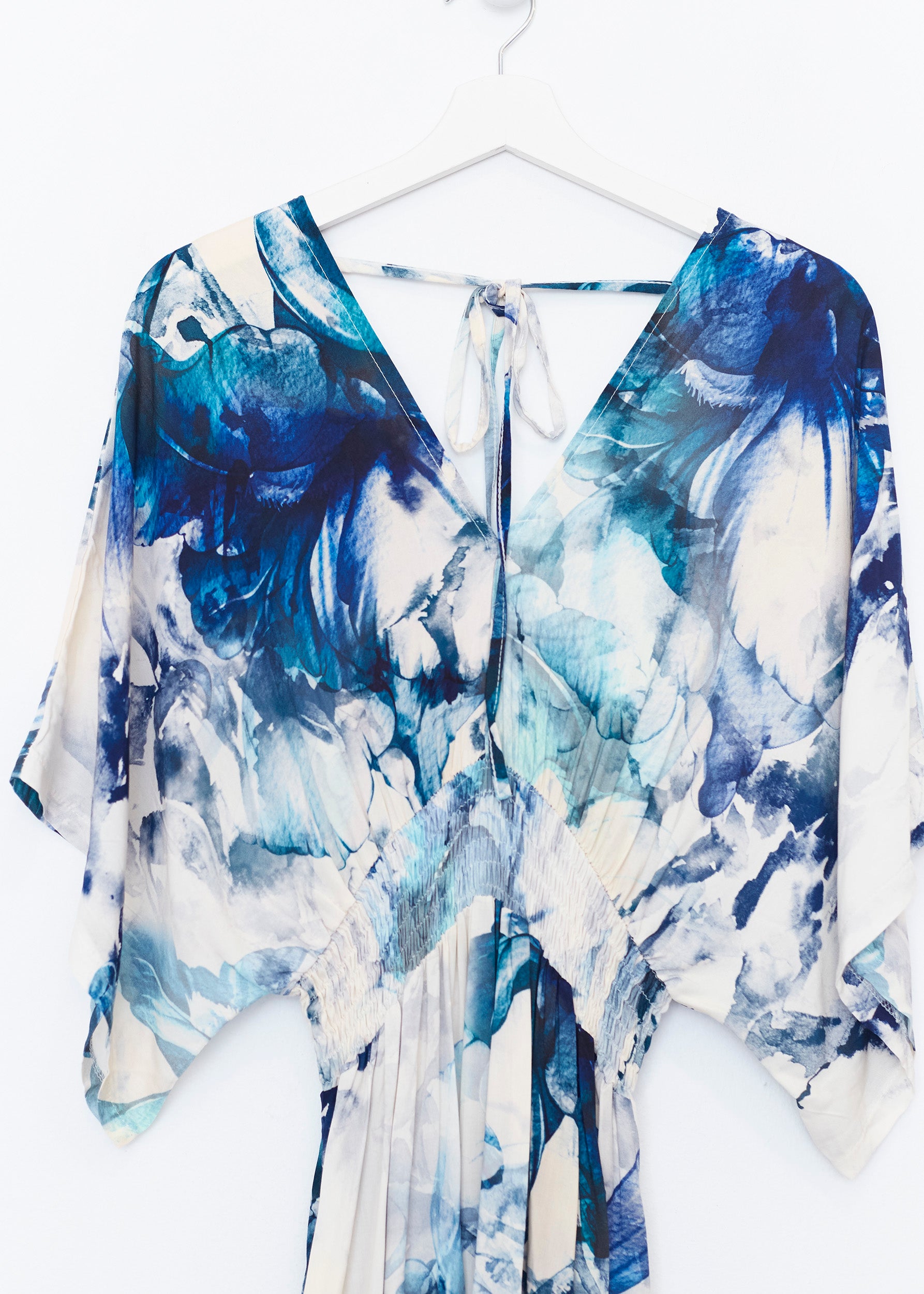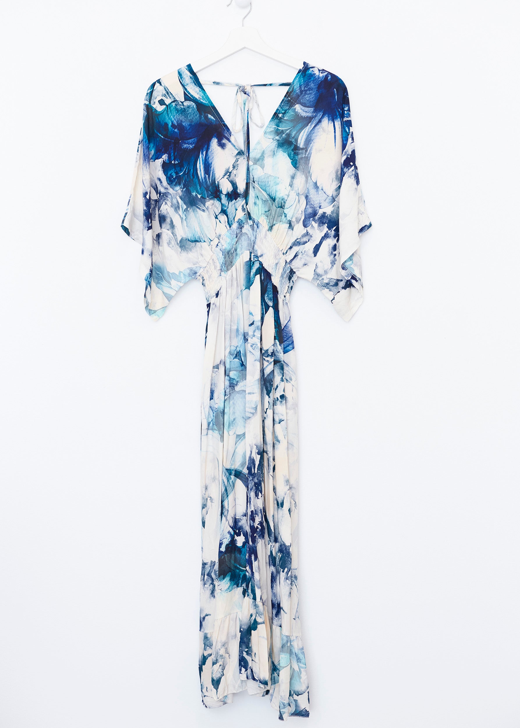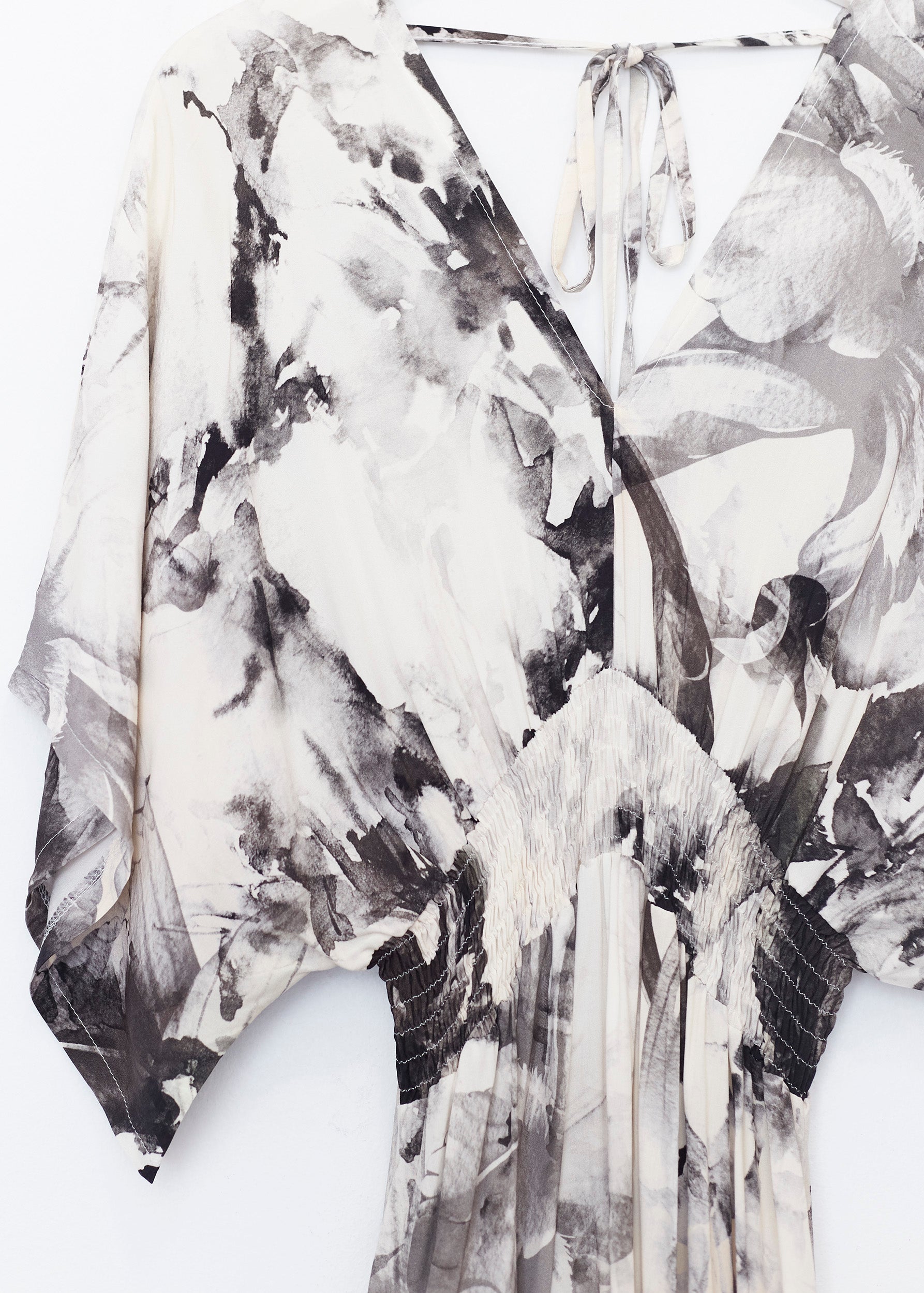 Vestido con manga mariposa y escote en punta. Escote pronunciado en espalda con cierre de cordón anudado. Cintura elástica. Bolsillos laterales. Detalle de volante en bajo. Estampado floral.