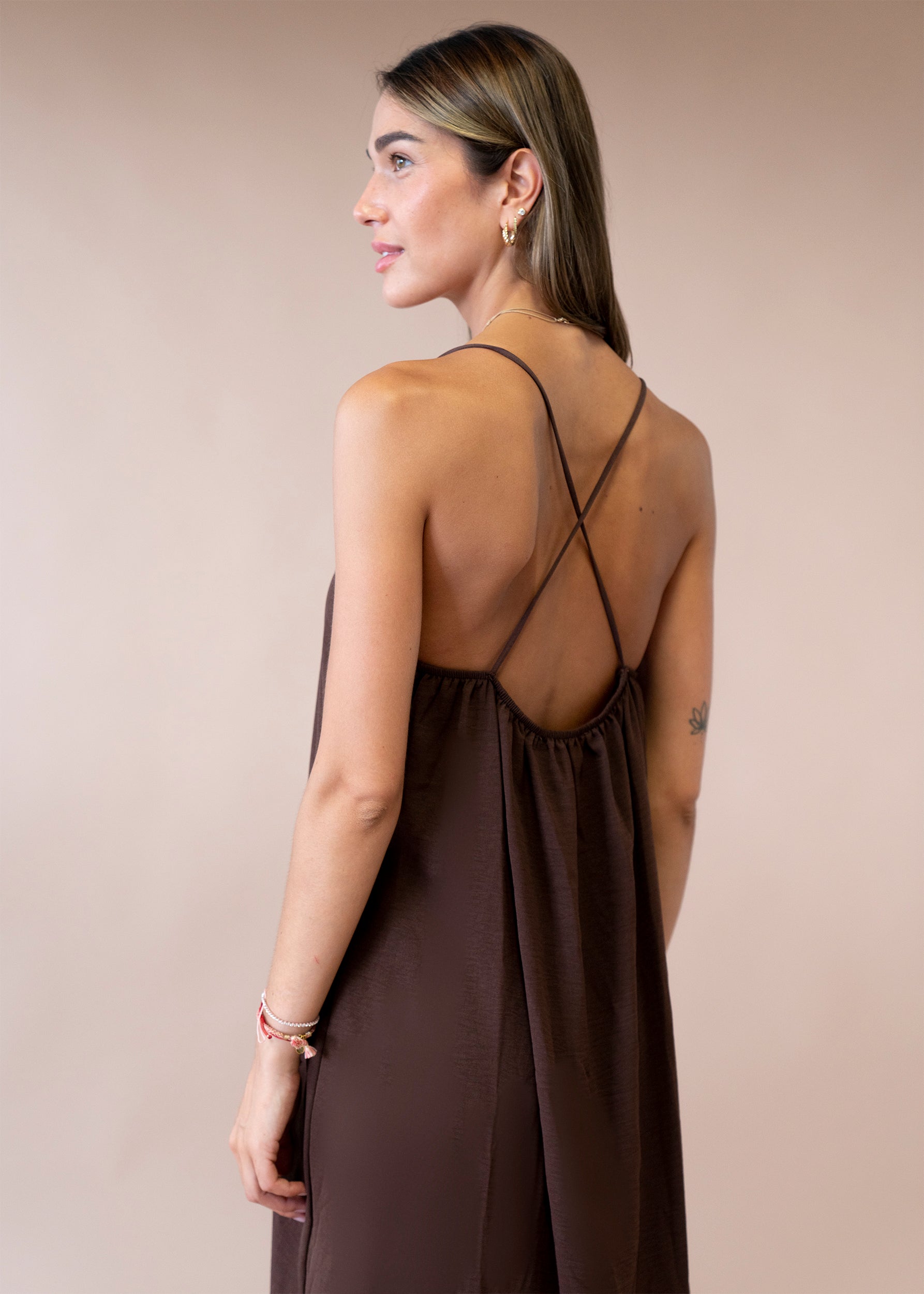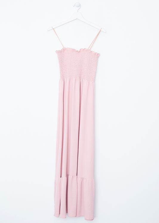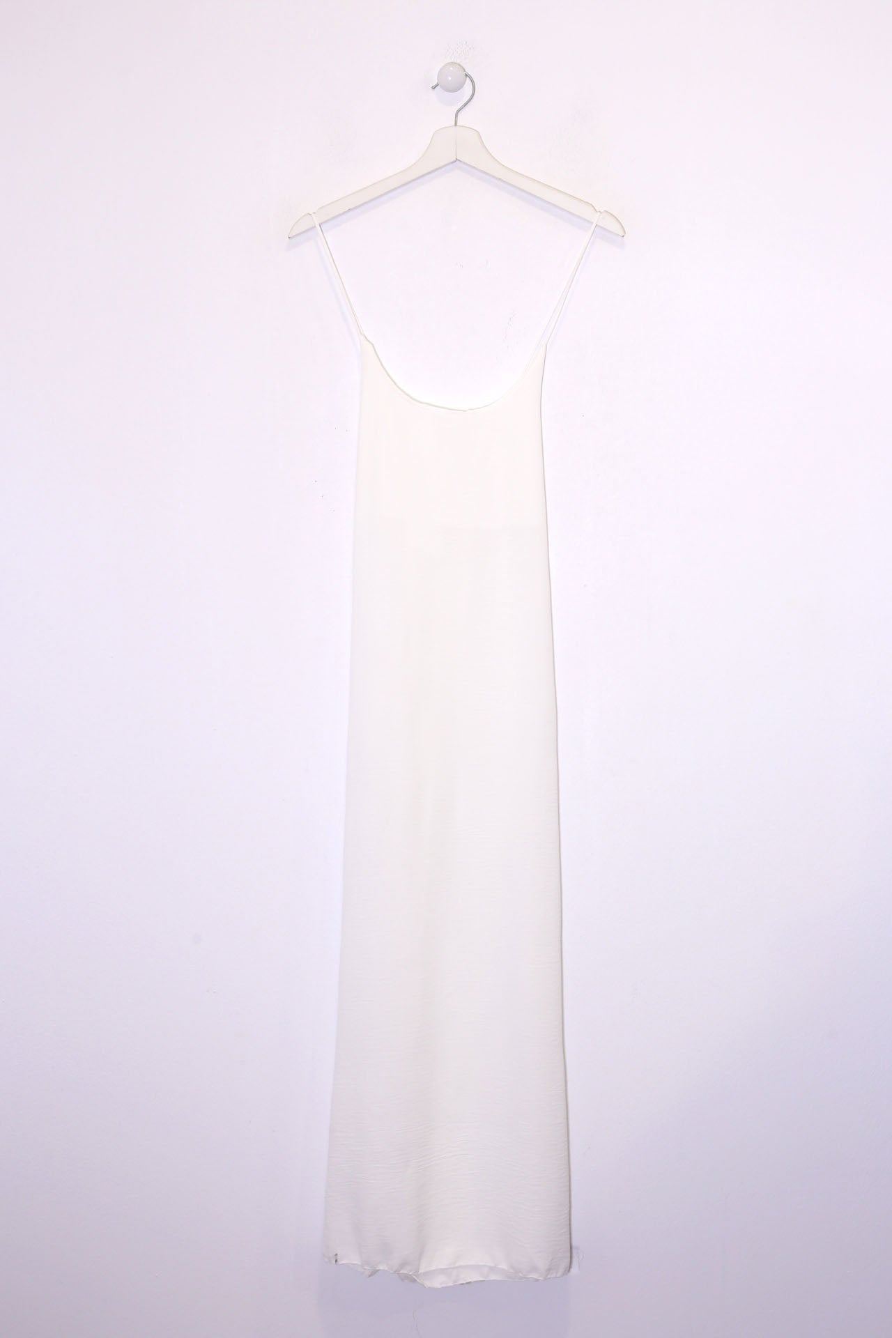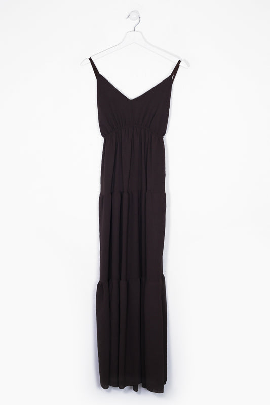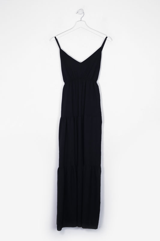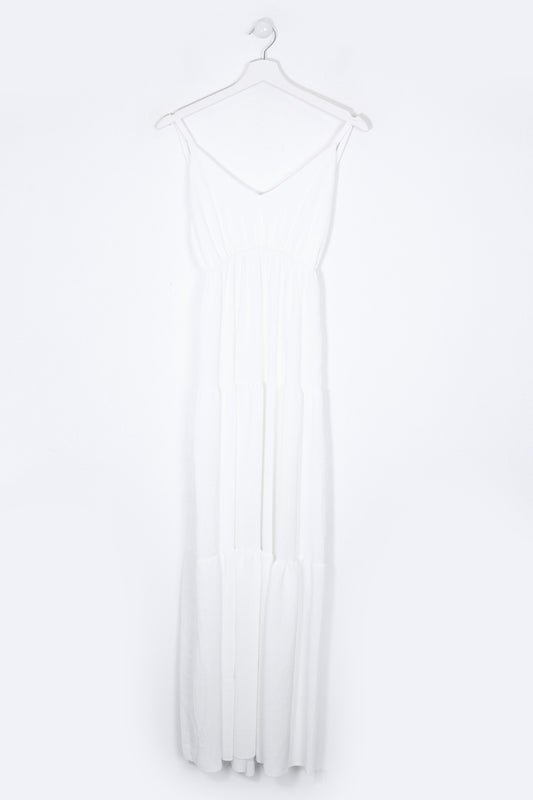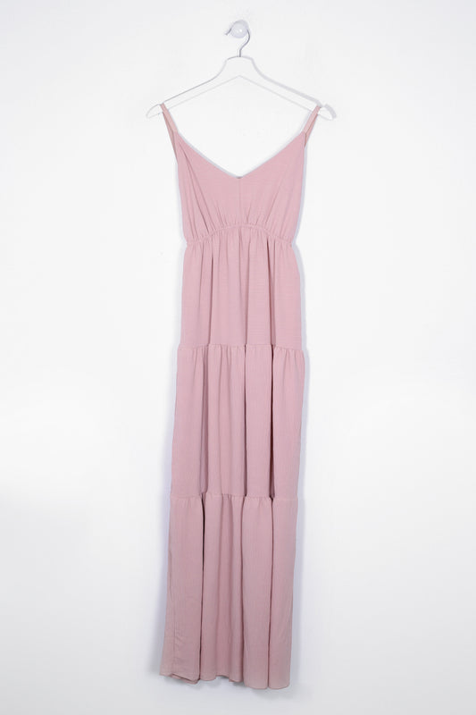 Vestido largo de tirantes finos cruzados en la espalda, escote redondo, tejido fluido con textura y aberturas laterales en el bajo.