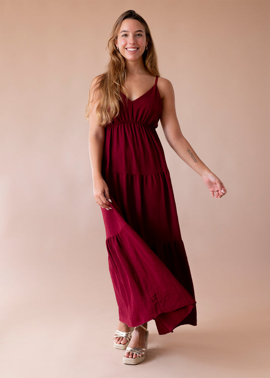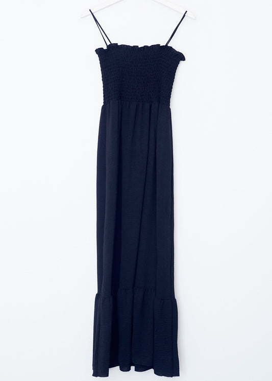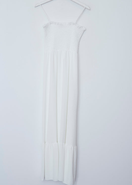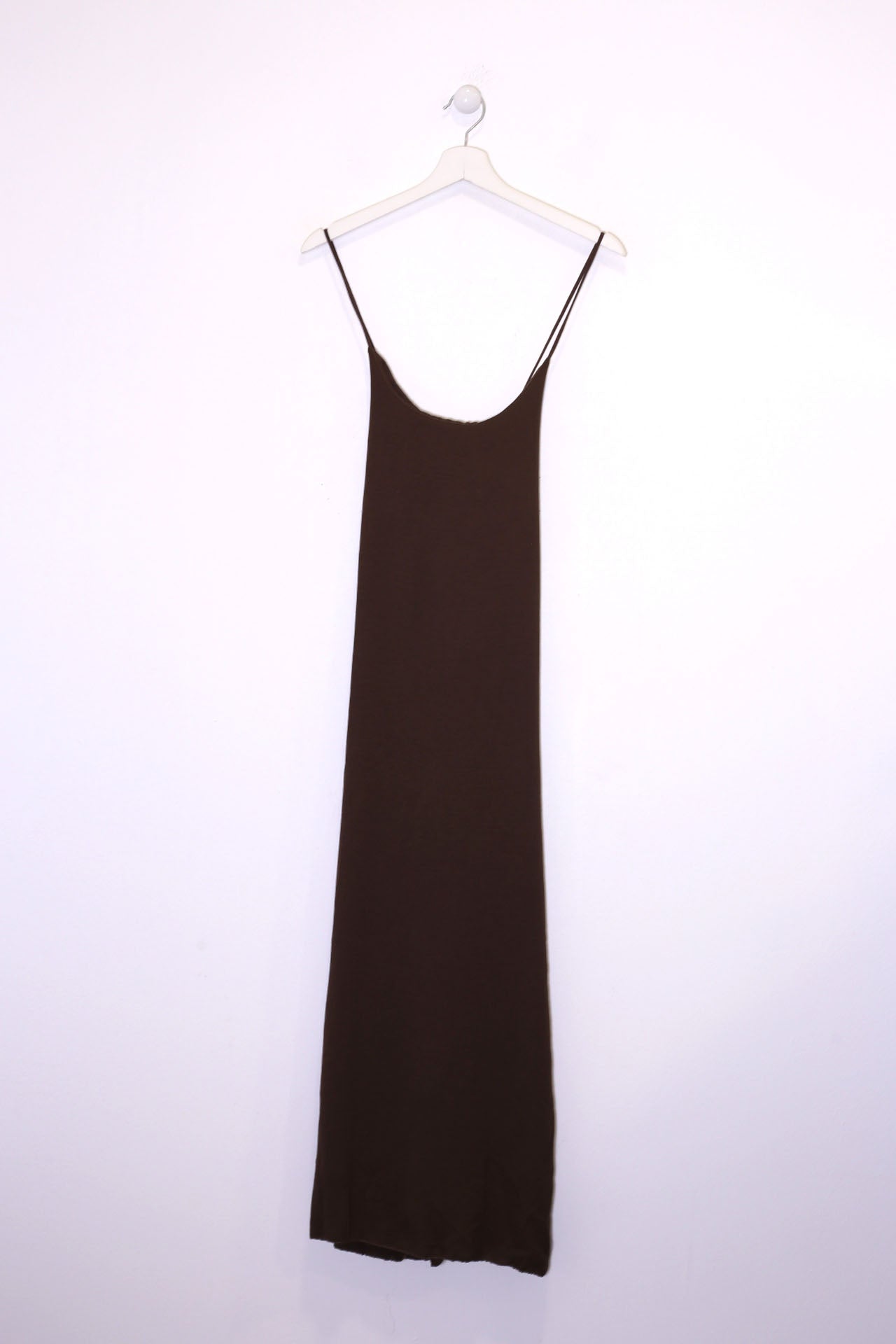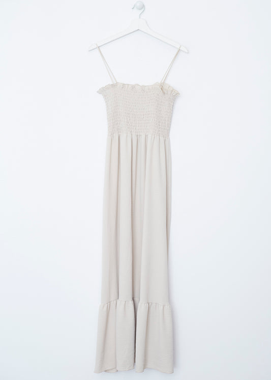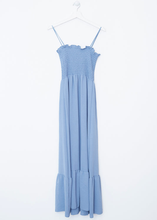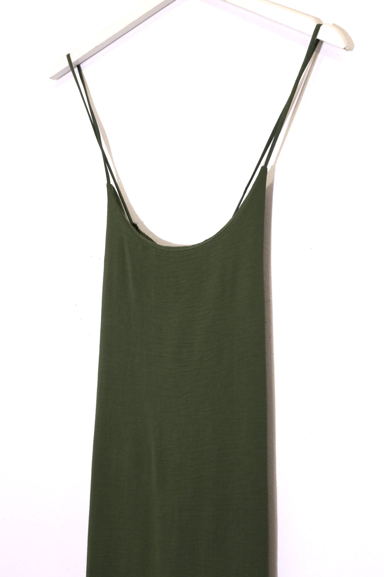 Vestido largo de tirantes finos cruzados en la espalda, escote redondo, tejido fluido con textura y aberturas laterales en el bajo.