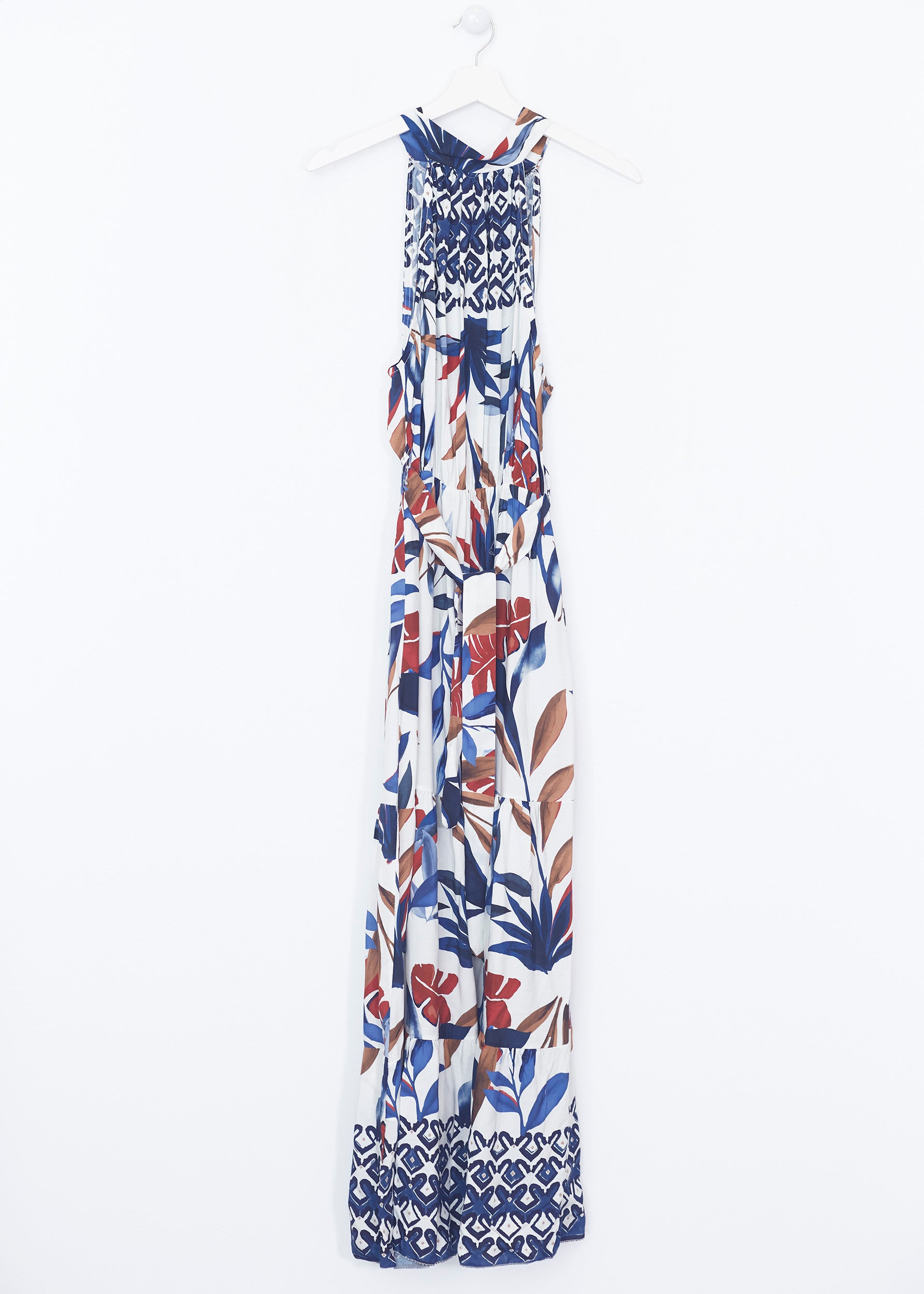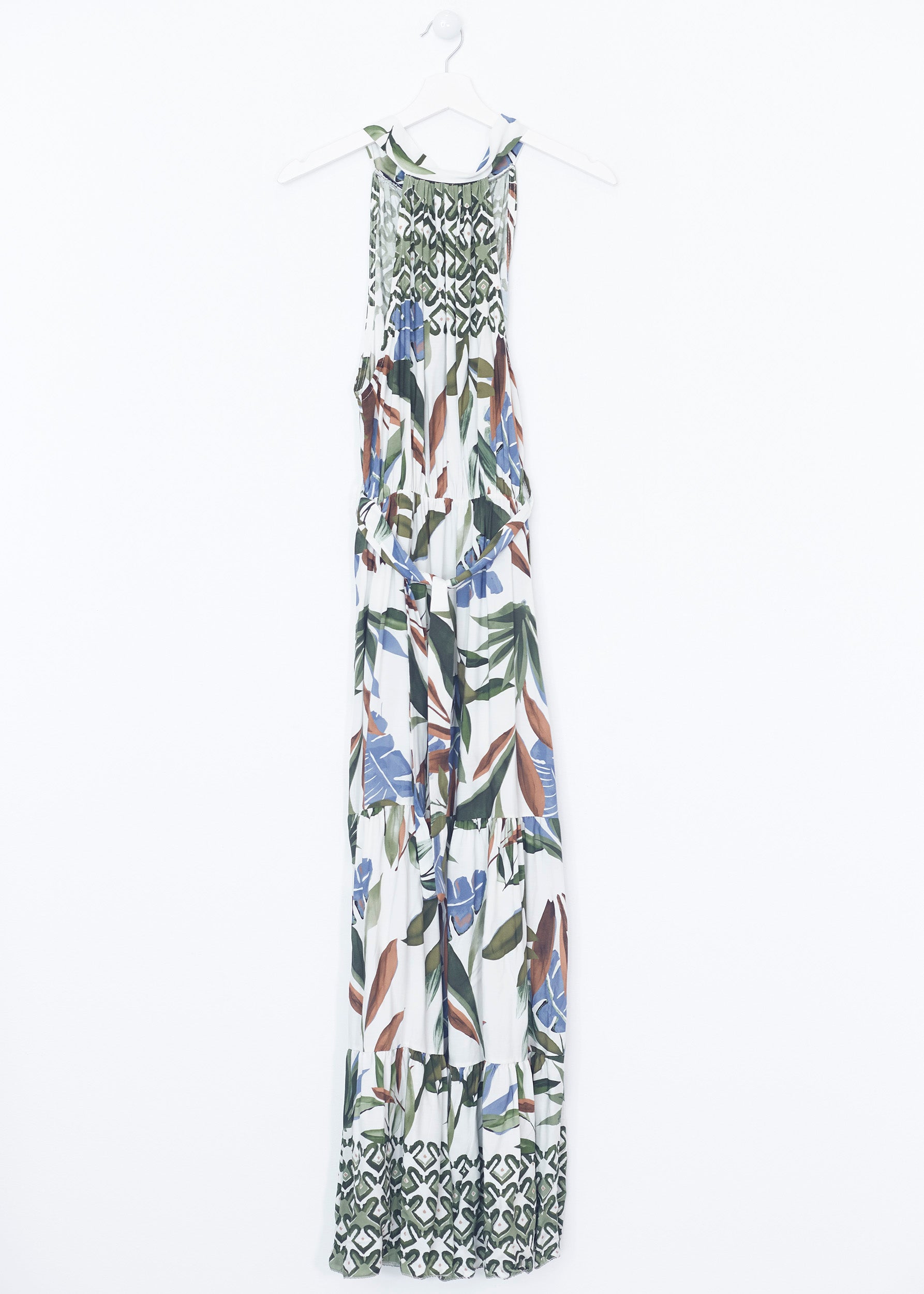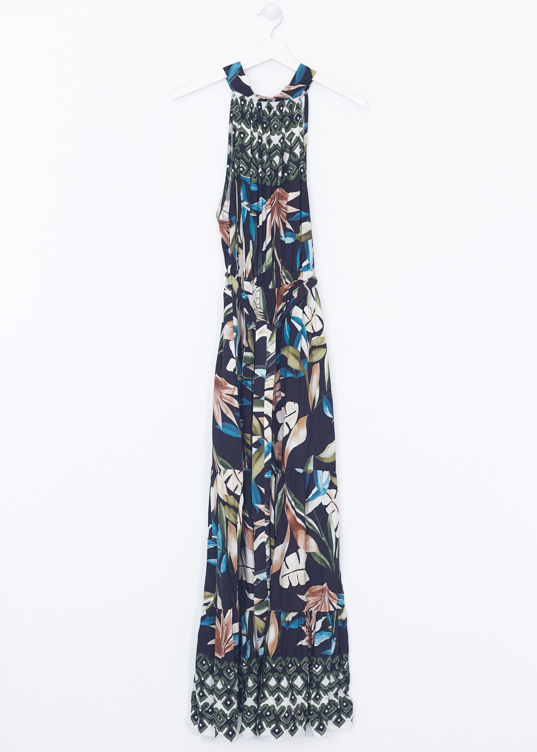 Vestido largo sin mangas, con escote halter anudado en espalda. Cintura elástica con detalle de trabillas y cinturón combinado. Detalla de volantes en bajo.