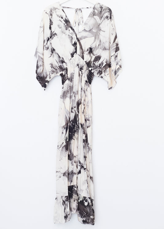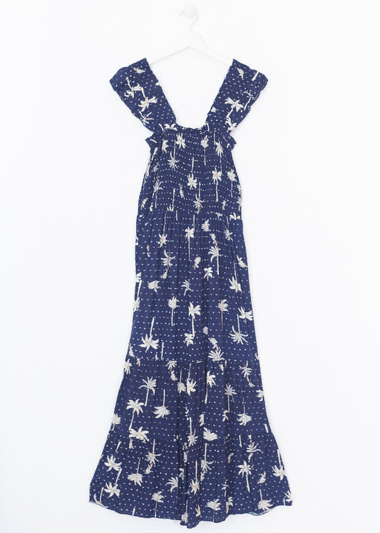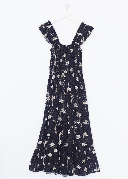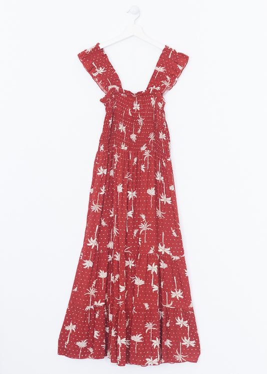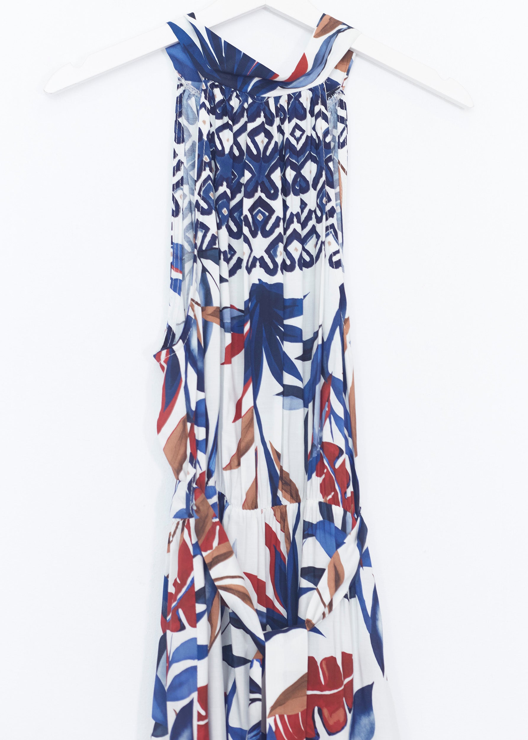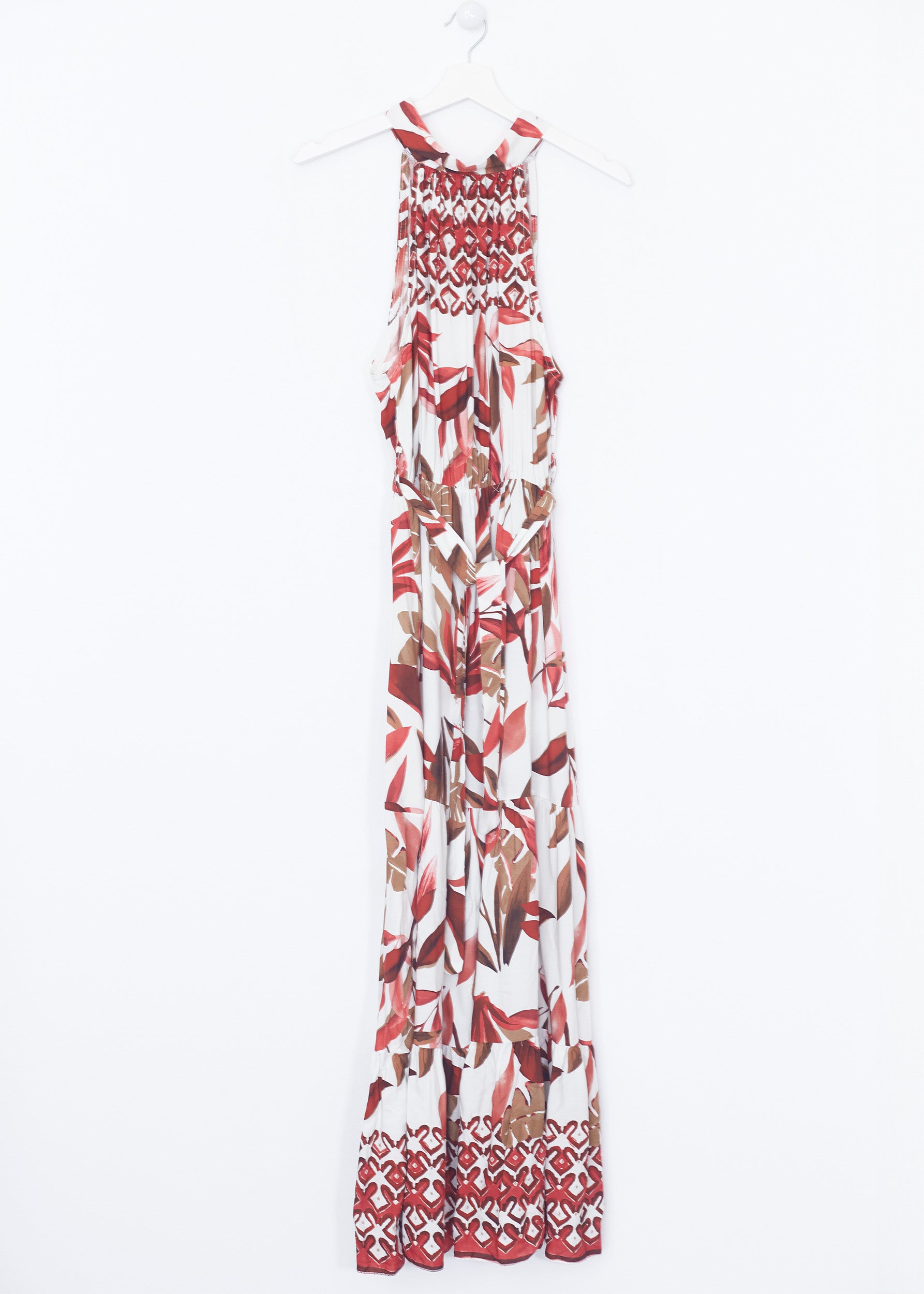 Vestido largo sin mangas, con escote halter anudado en espalda. Cintura elástica con detalle de trabillas y cinturón combinado. Detalla de volantes en bajo.