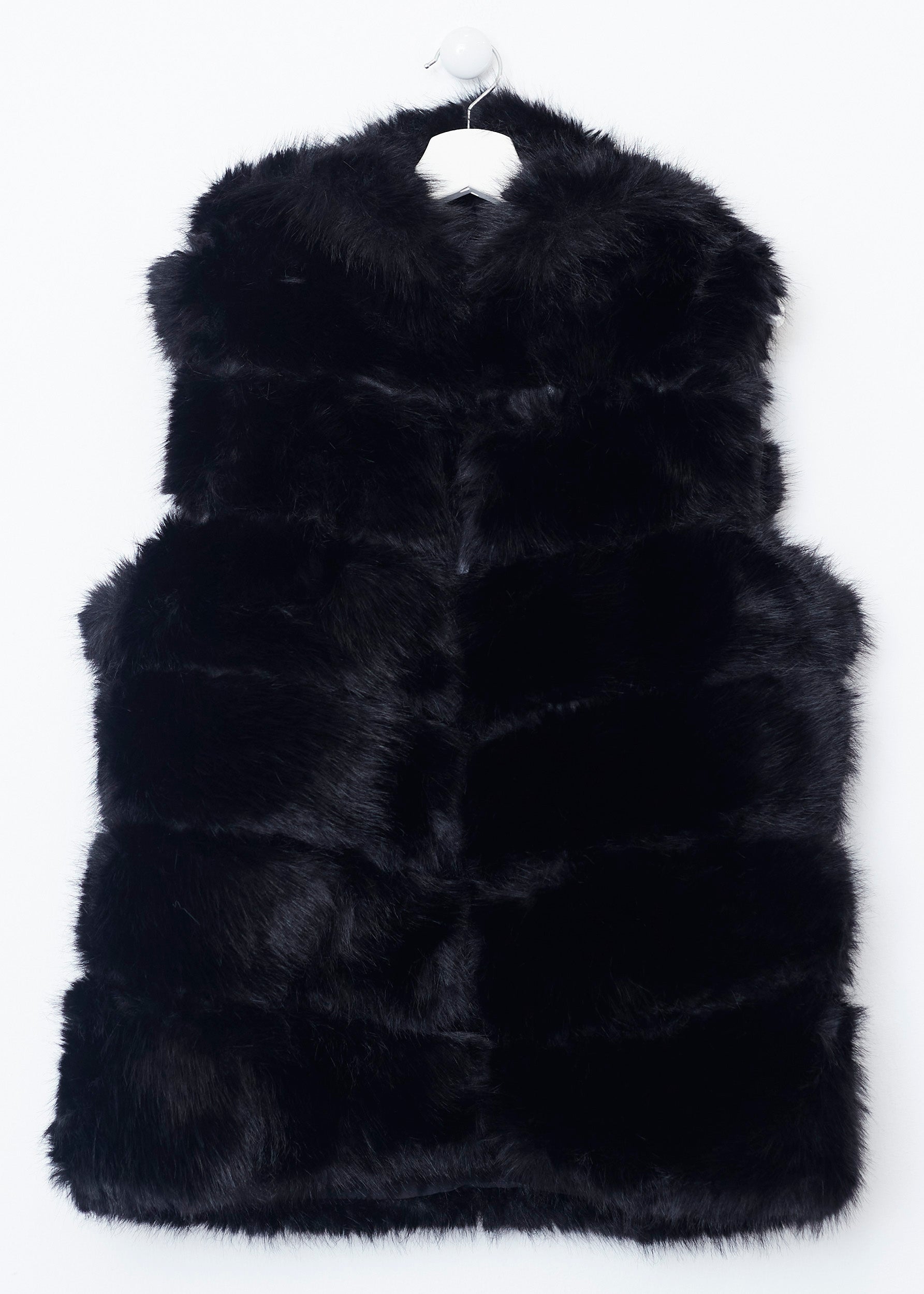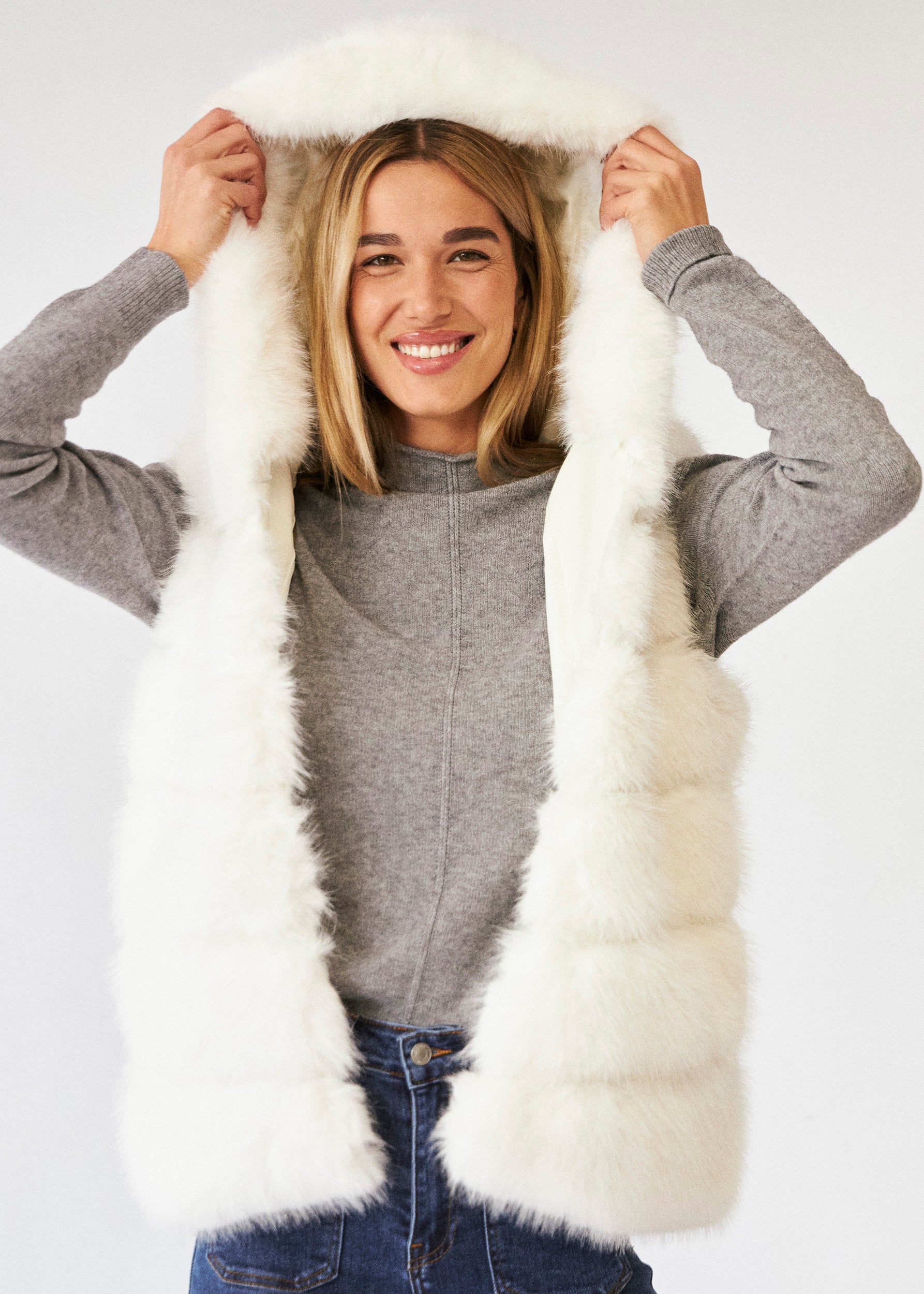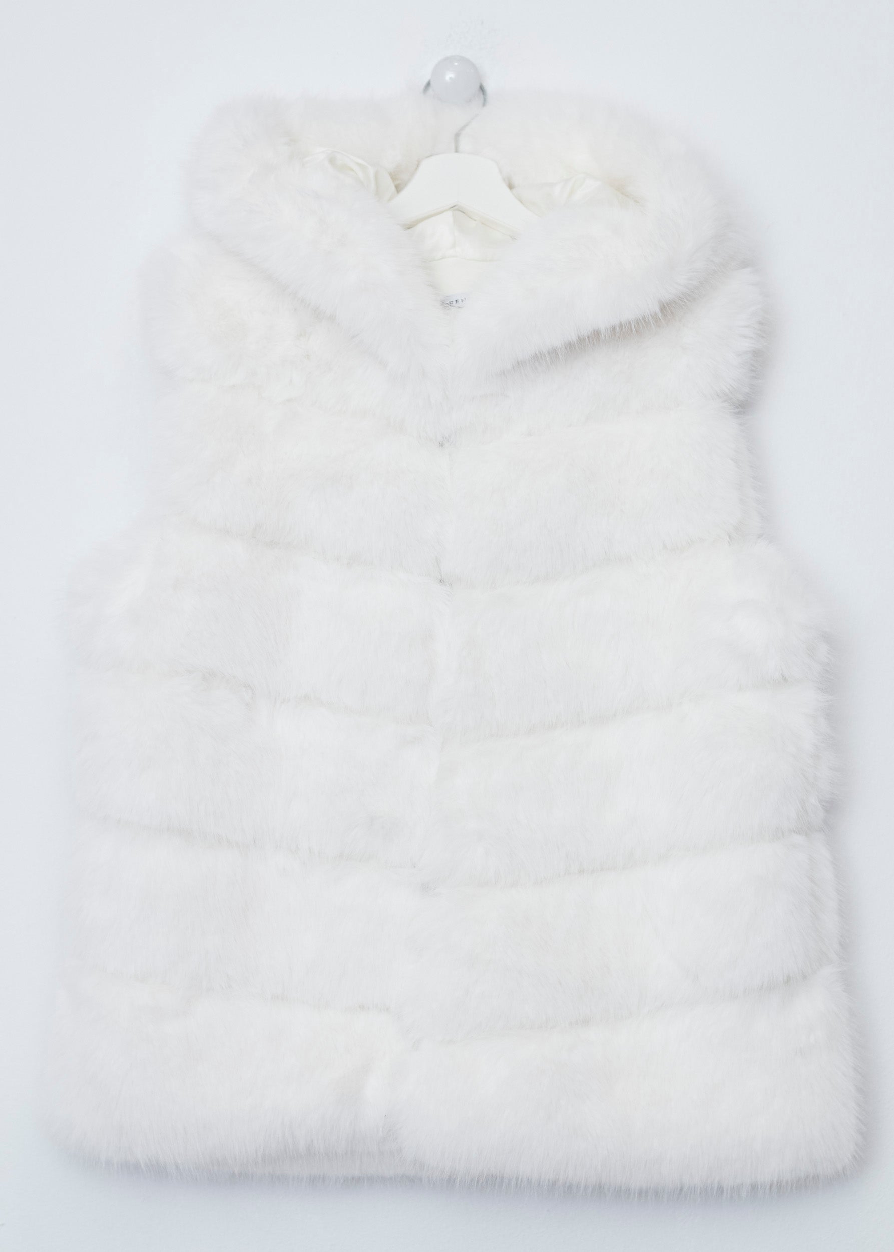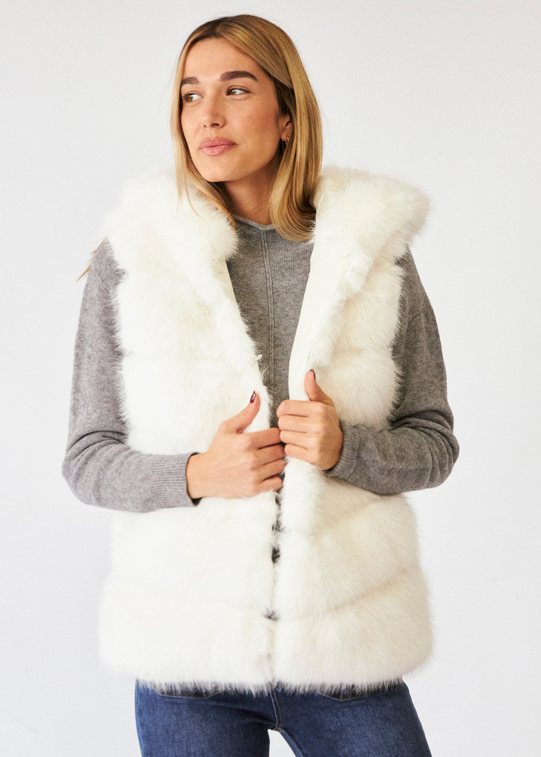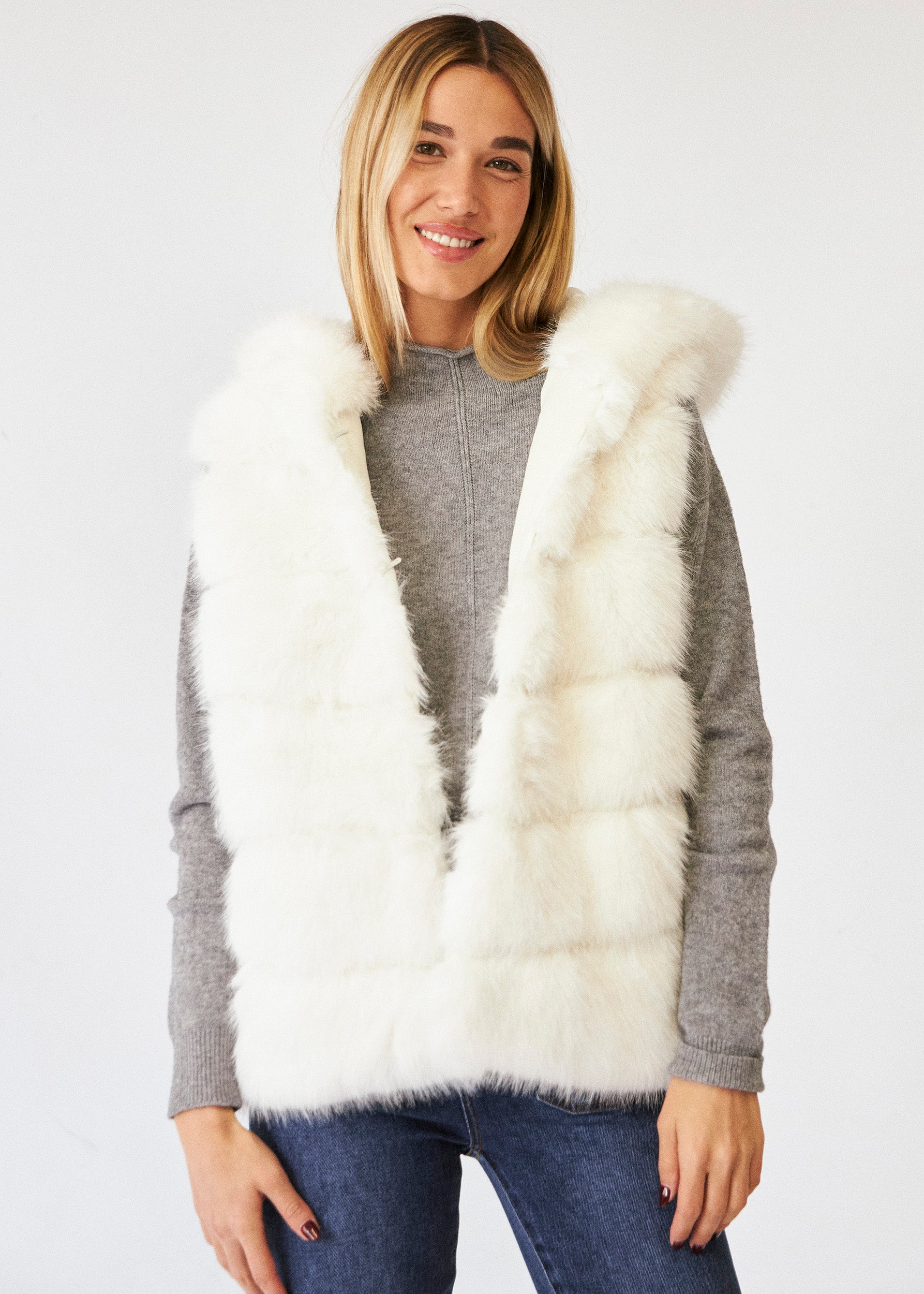 Chaleco efecto pelo con manga sisa y capucha. Cierre frontal con trabillas. Forro interior.